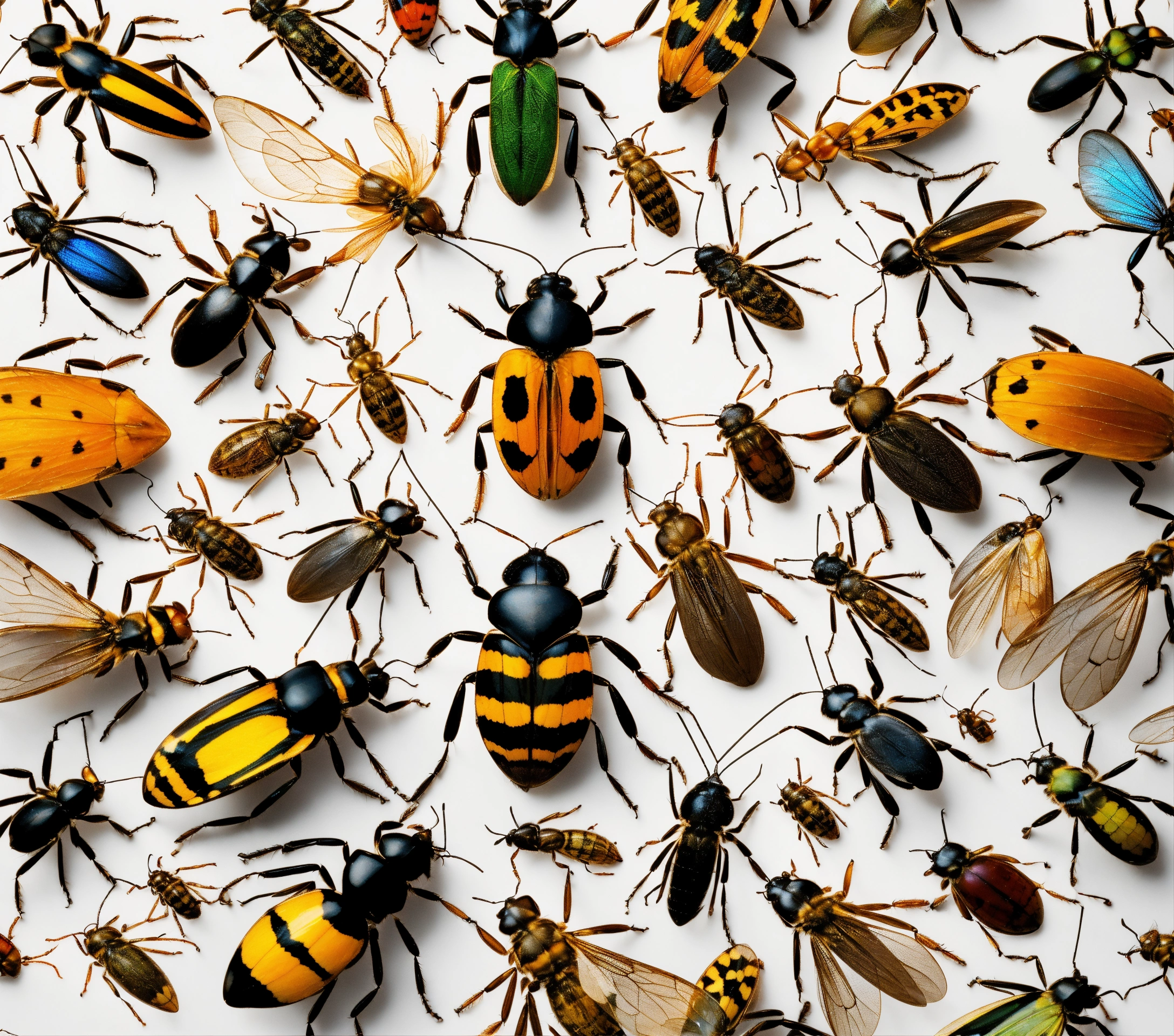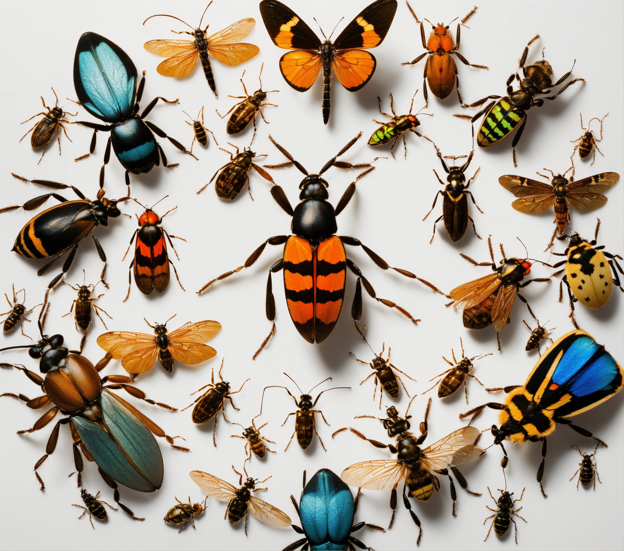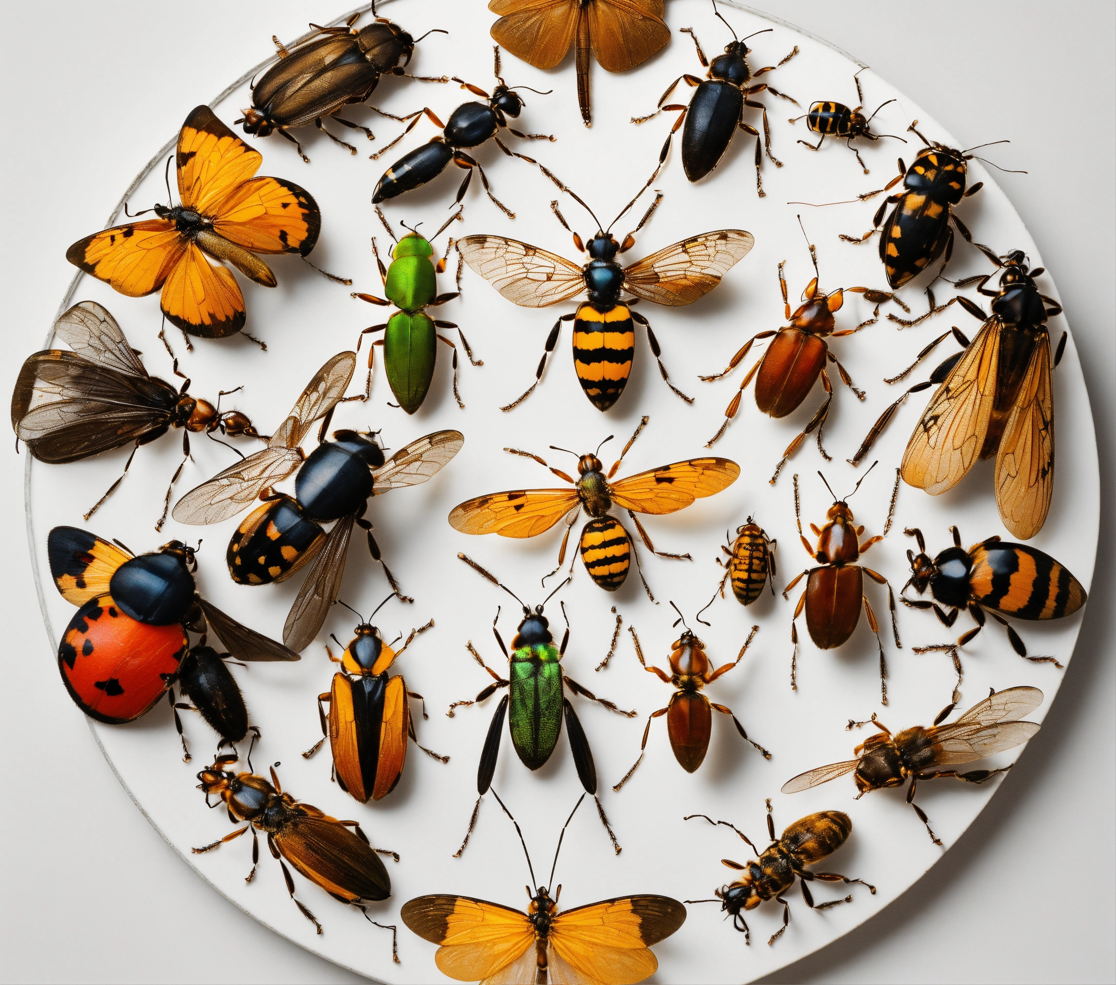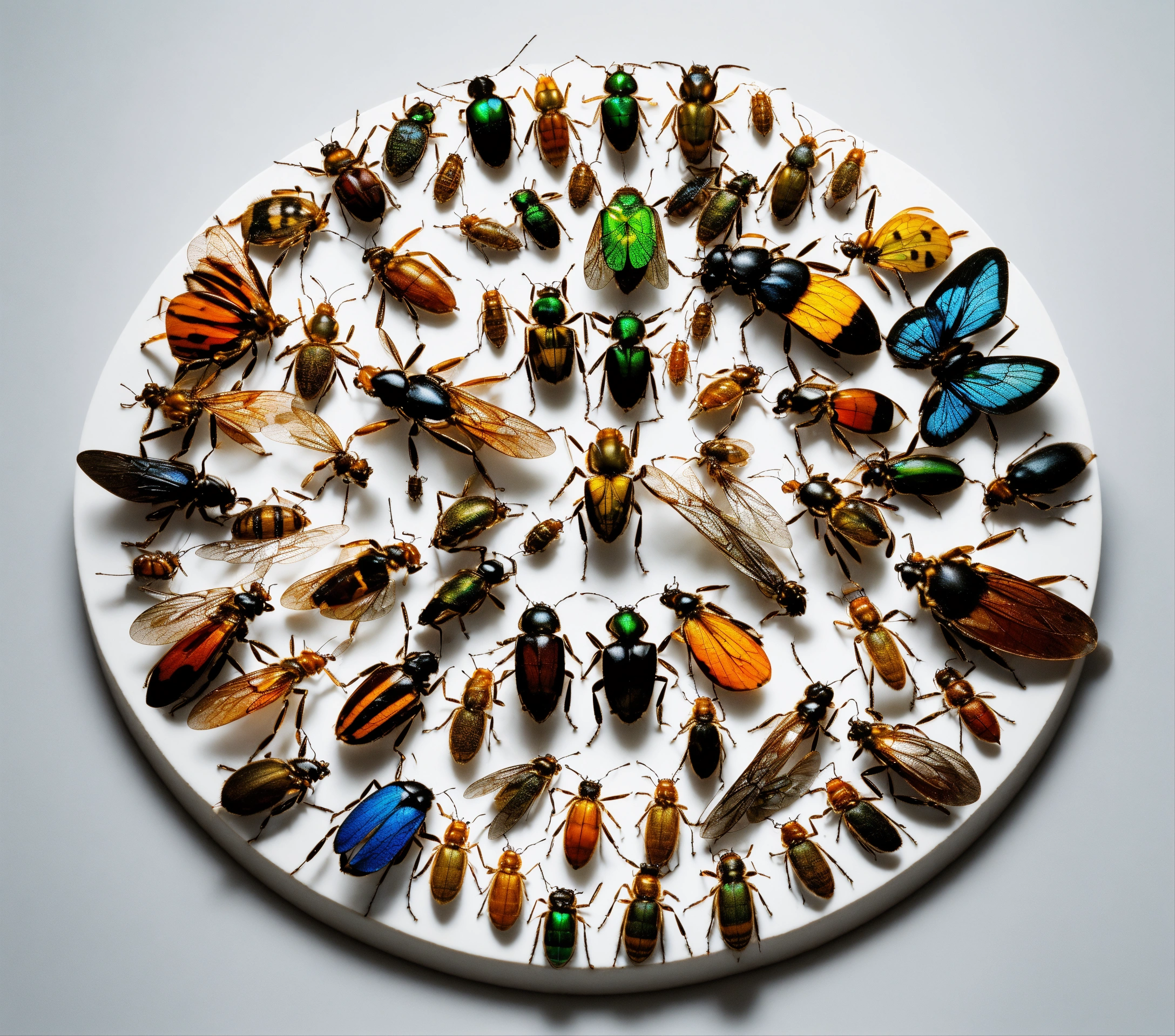 A realistic image of a big group of insects on a white circular background from top view