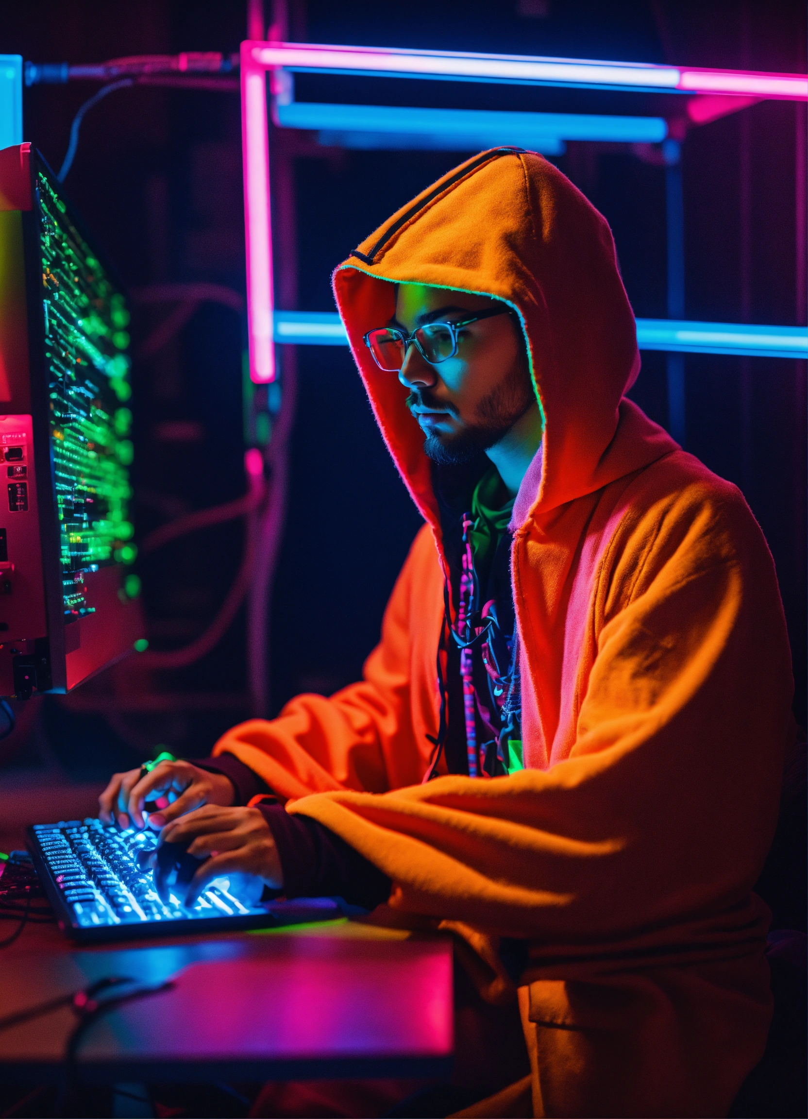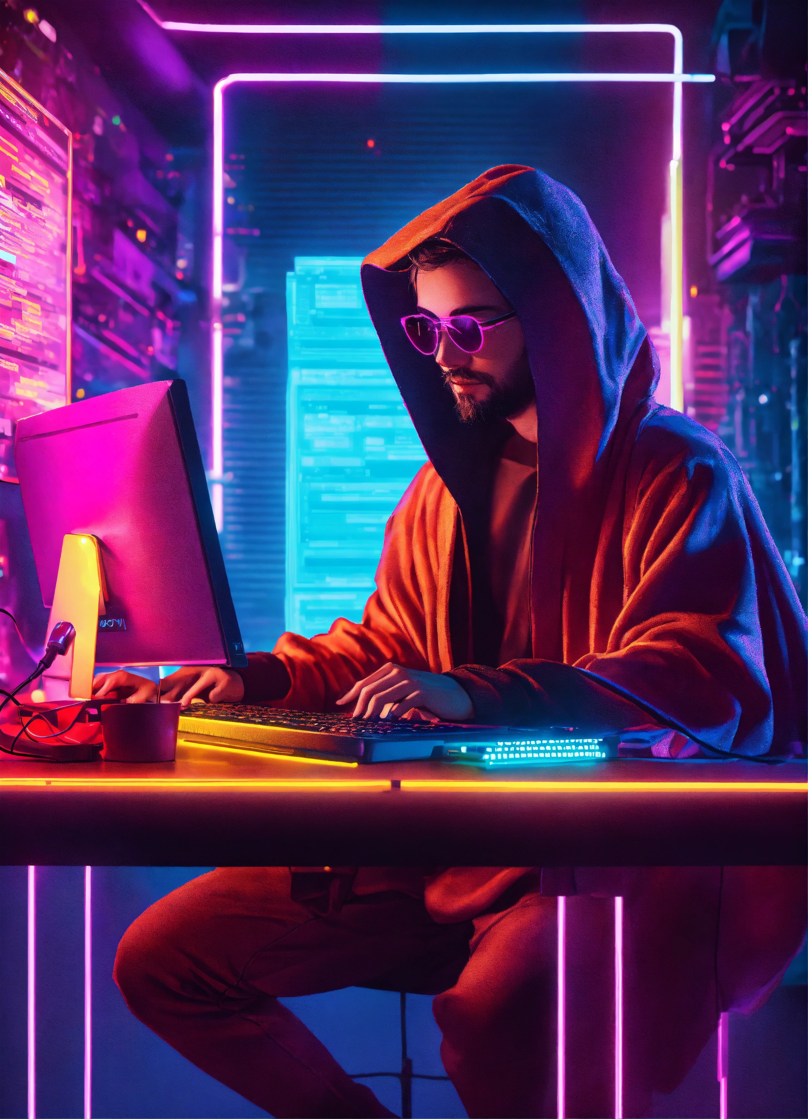 A programmer wearing a jedi costume and programming with a computer in a neon vibes