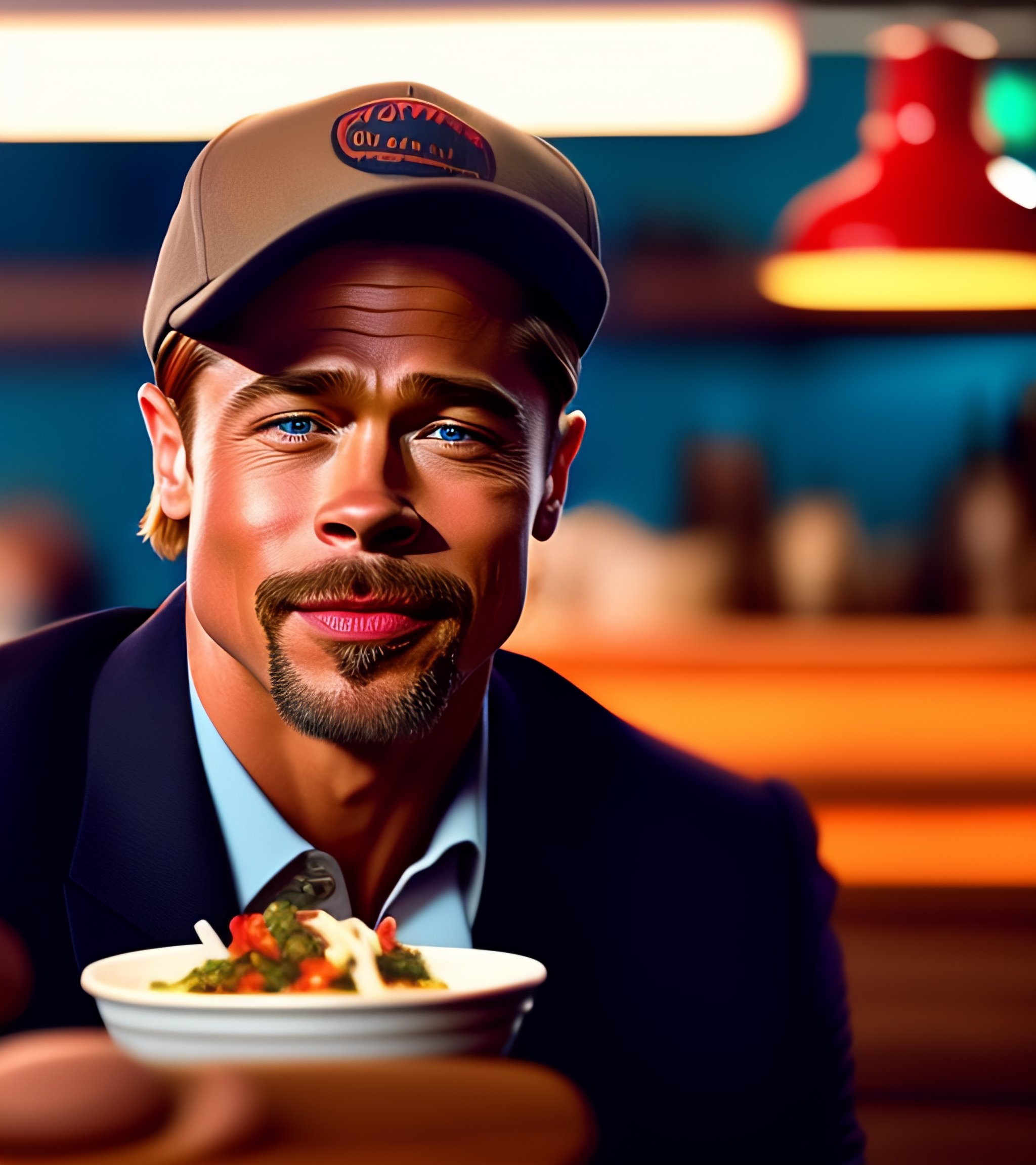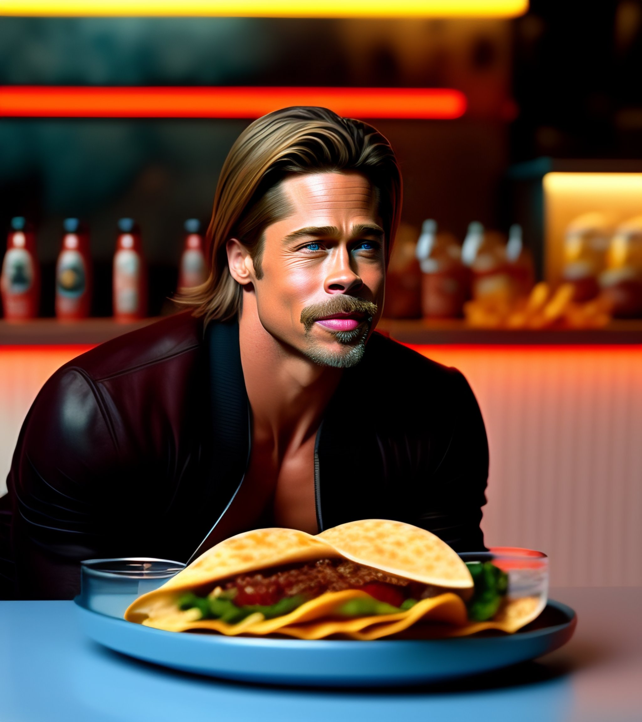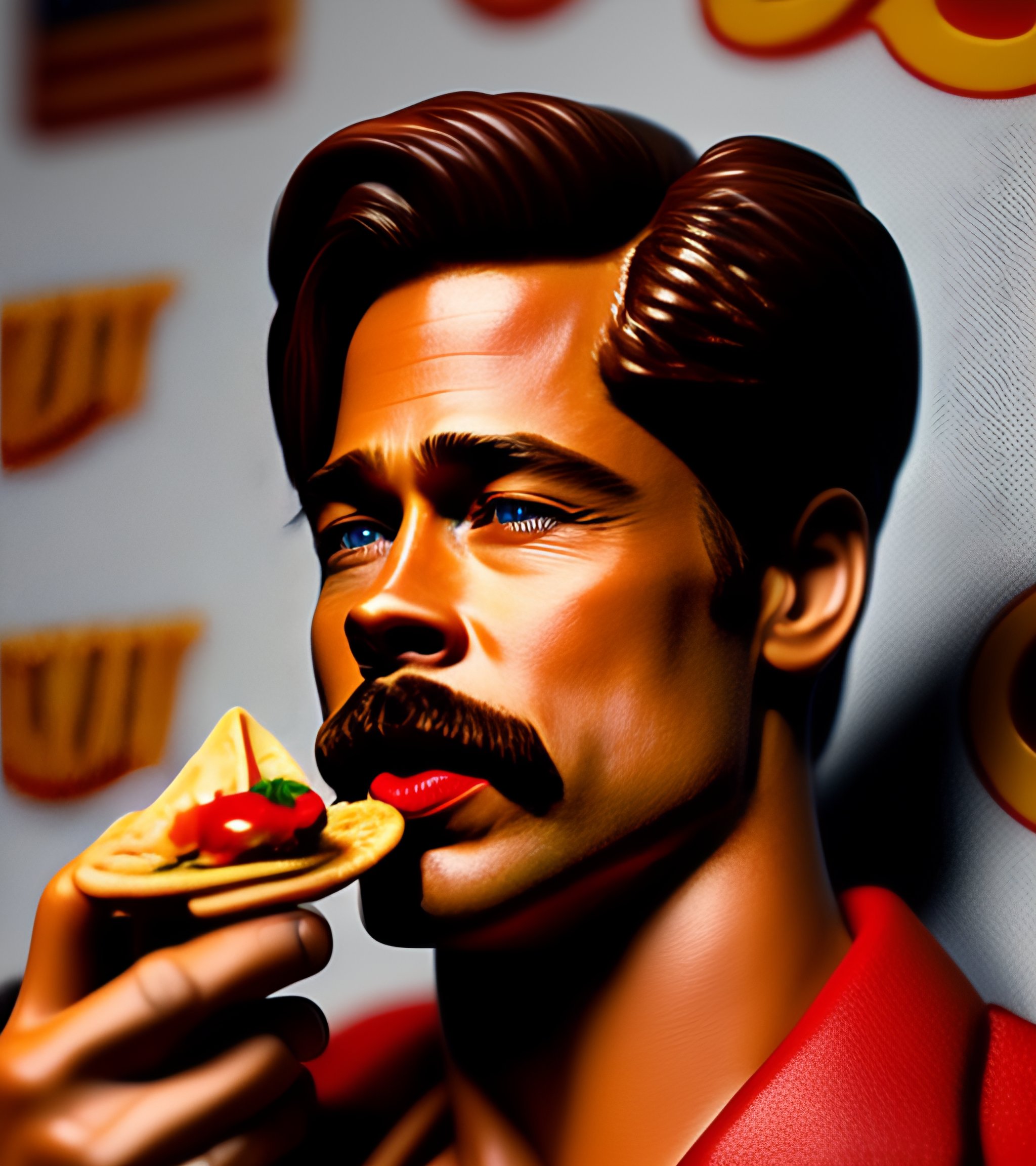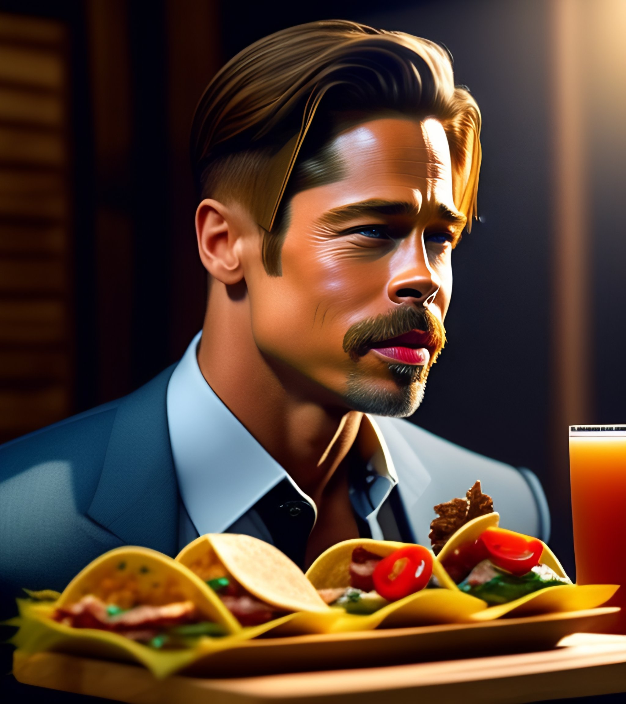 Claymation brad pitt eating tacos in a wooden food hall, he has a lit marijuana joint hanging out of the side of his mouth and his eyes are slightly bloodshot