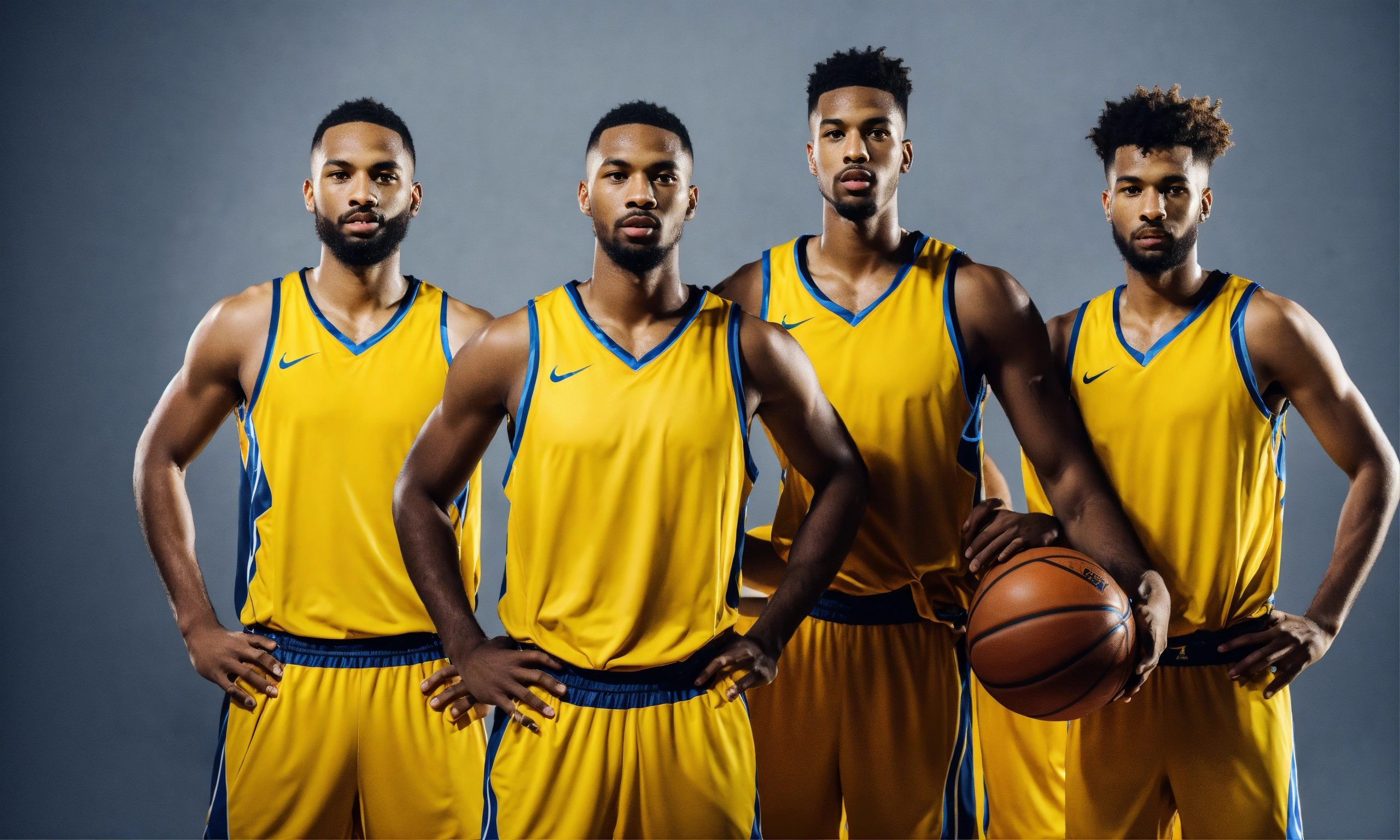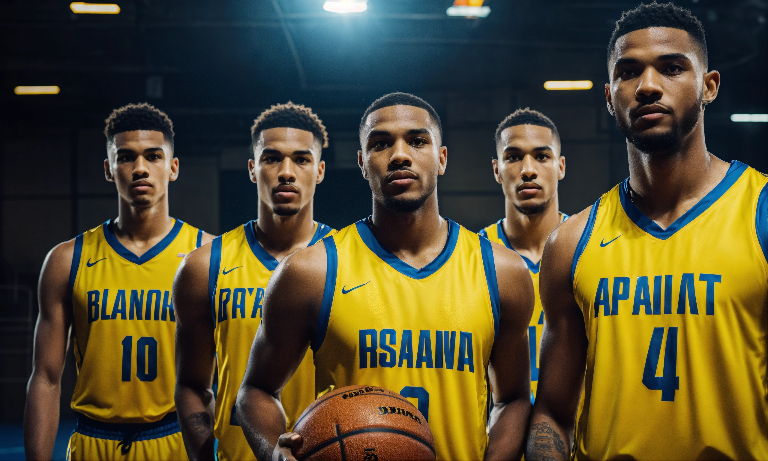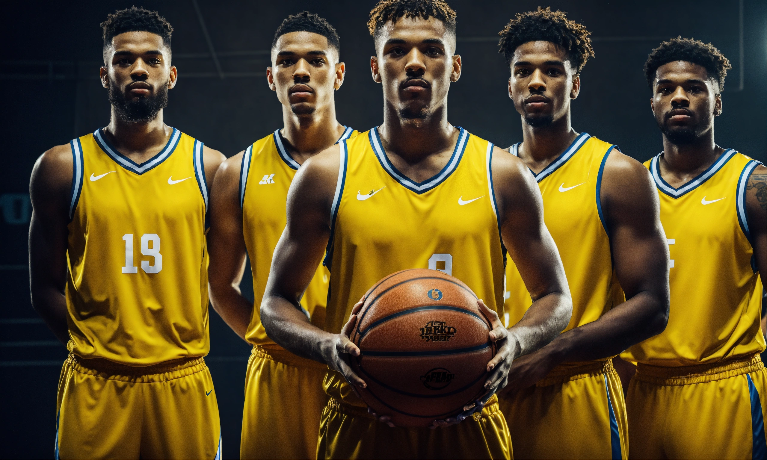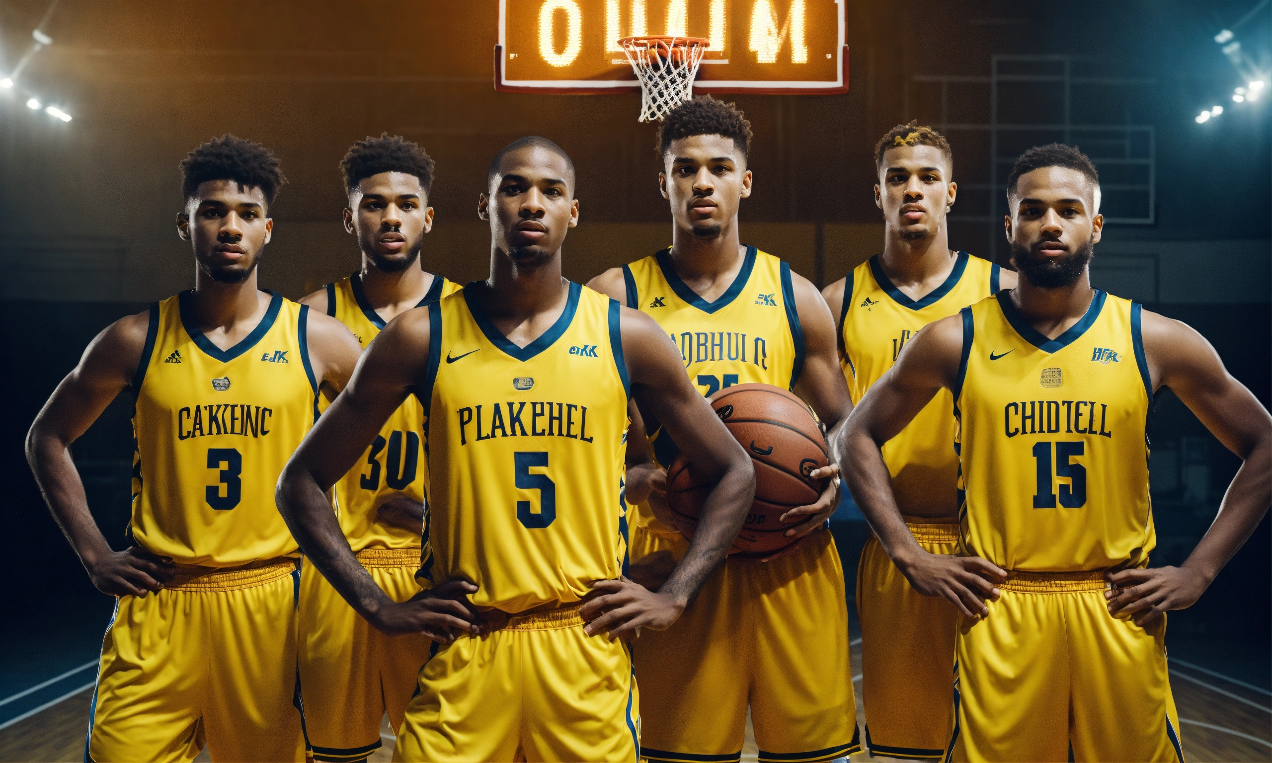 Five players basketball team in yellow jersey 4k facing camera