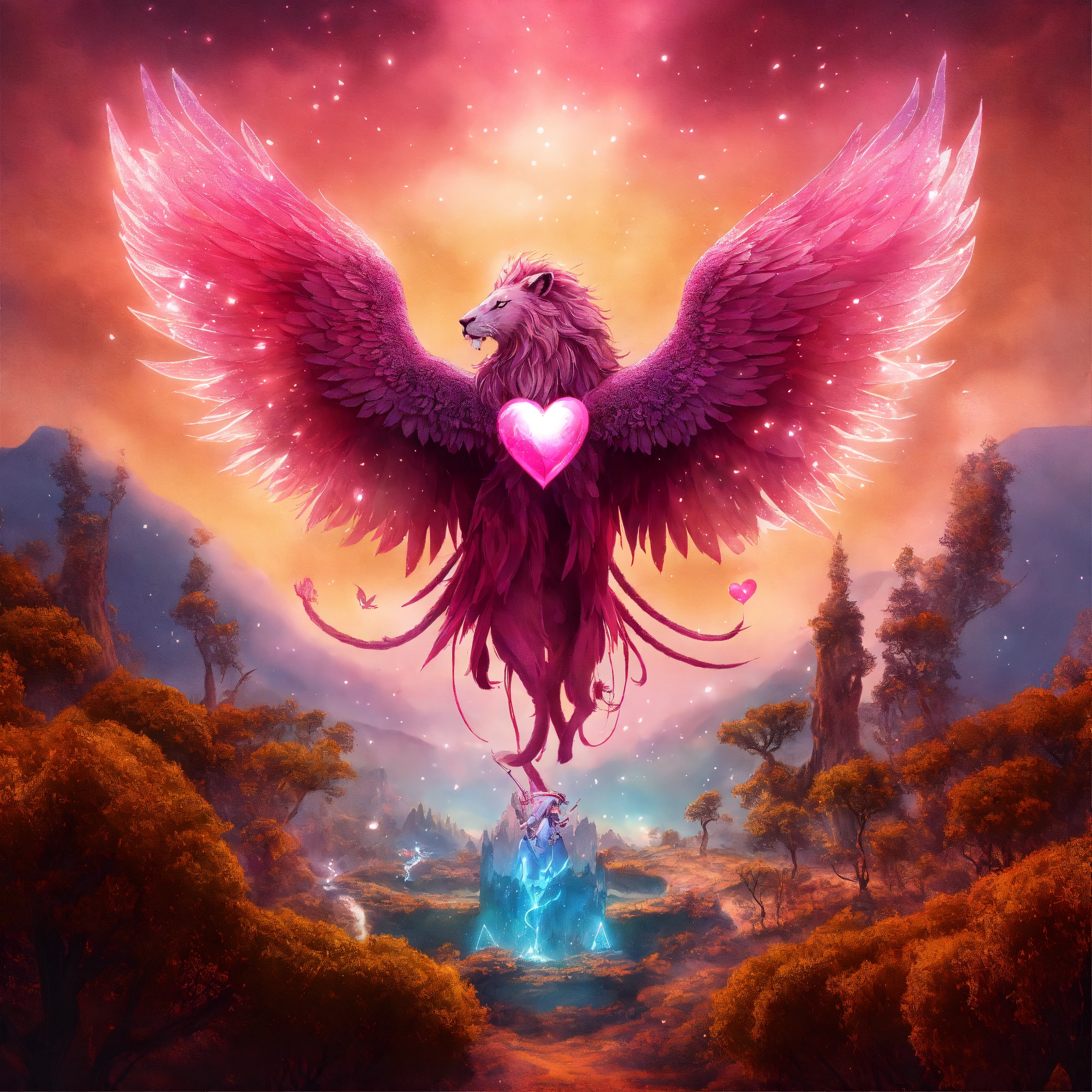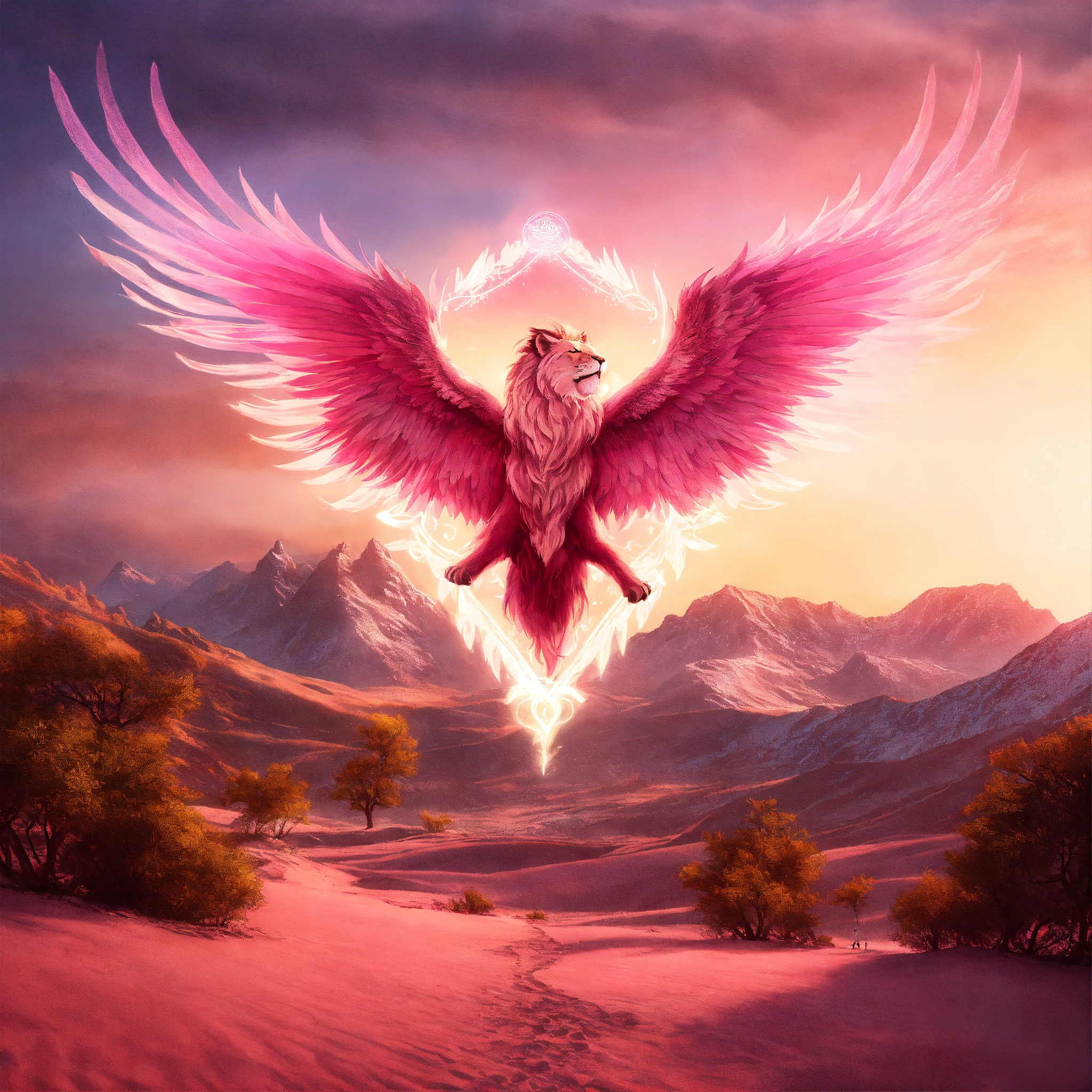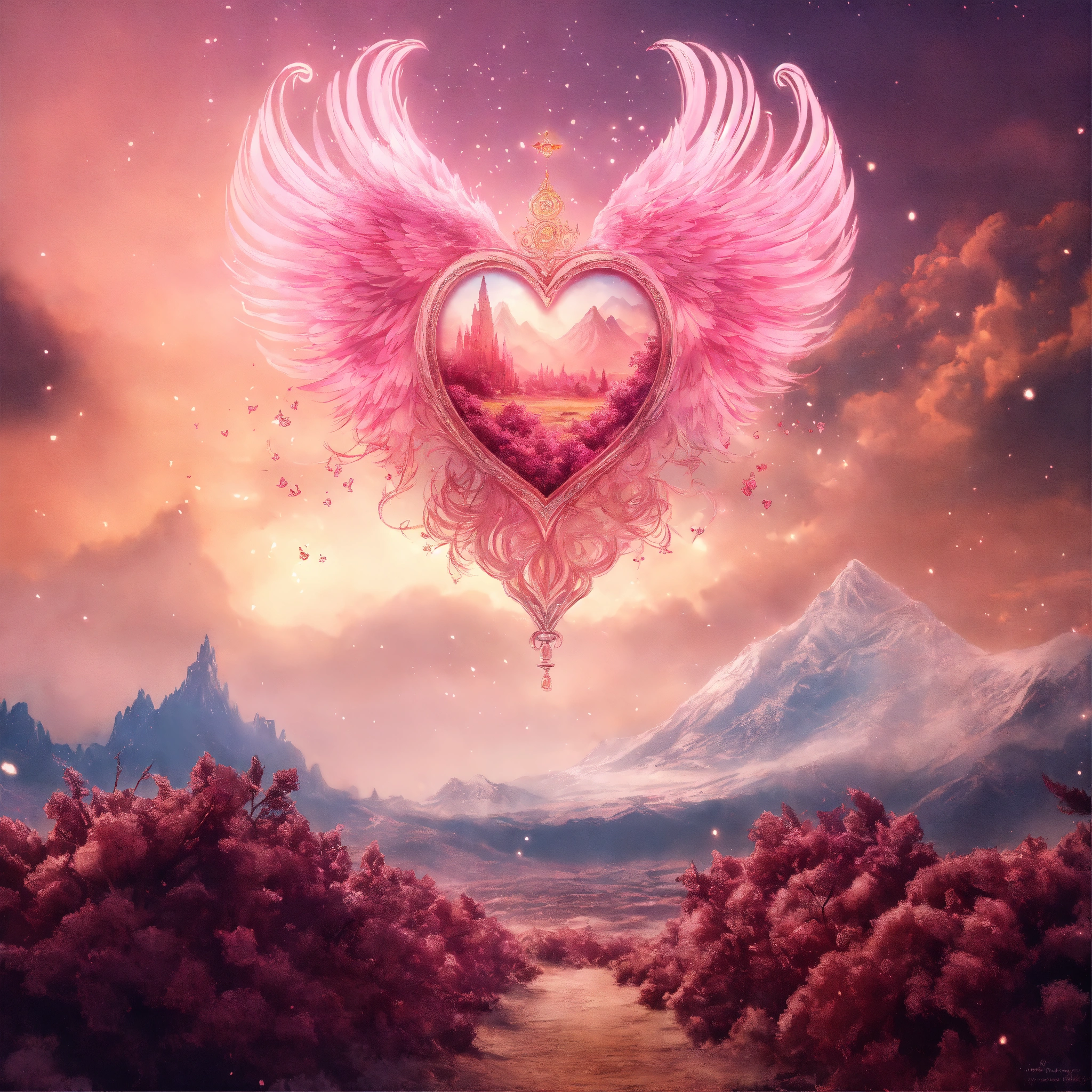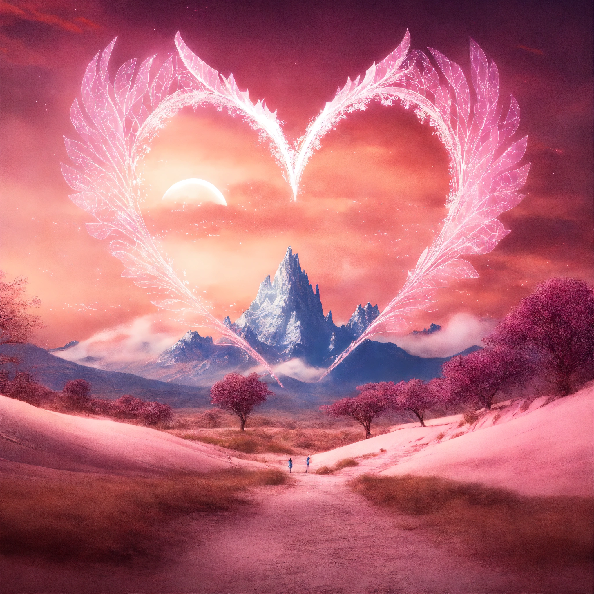 Image. illustrate a pink smoky heart with wings in a white desert. long exposure photography style, cartoon style, x-ray style, in the style of tim burton, lion king, the chronicles of narnia, beauty and the beast, and peter pan. with native american and sacred geometric patterns on the body. enchanting aura. the chronicles of narnia, wizard of oz, and alice in wonderland background with snow mountains, and fruit trees with white leaves.