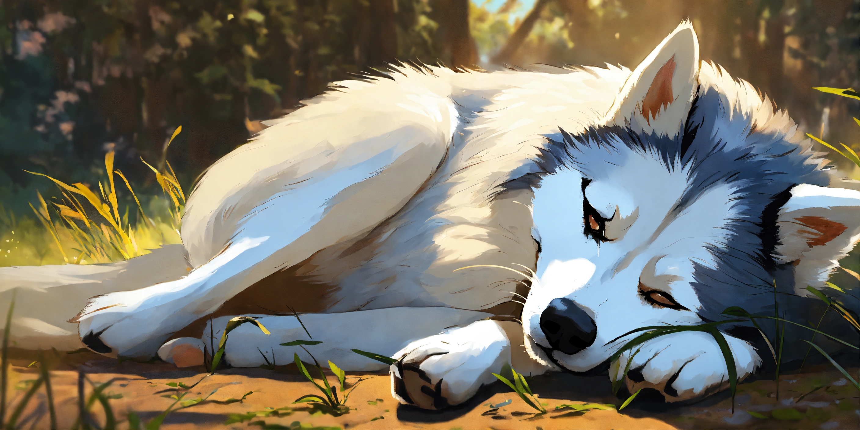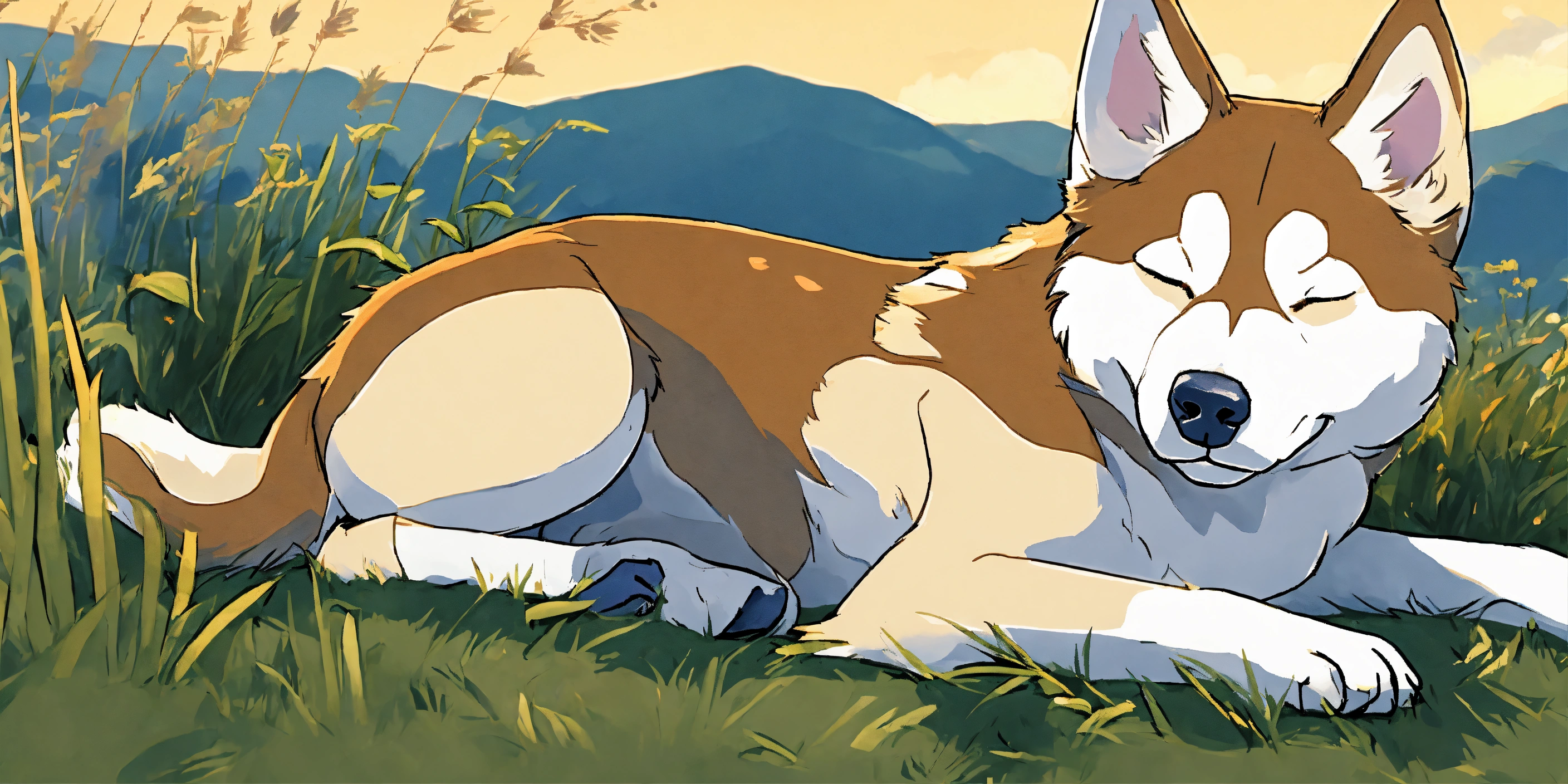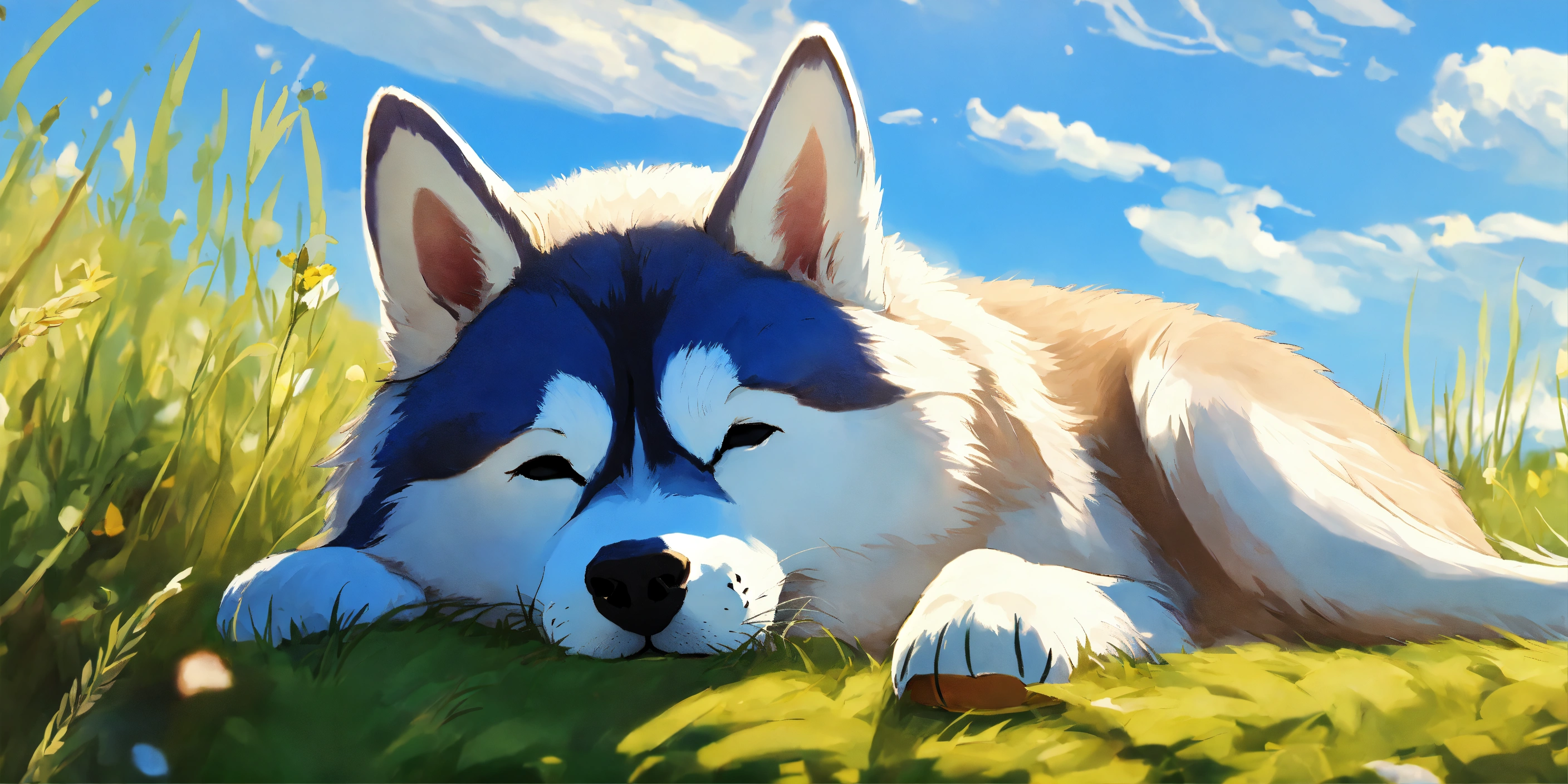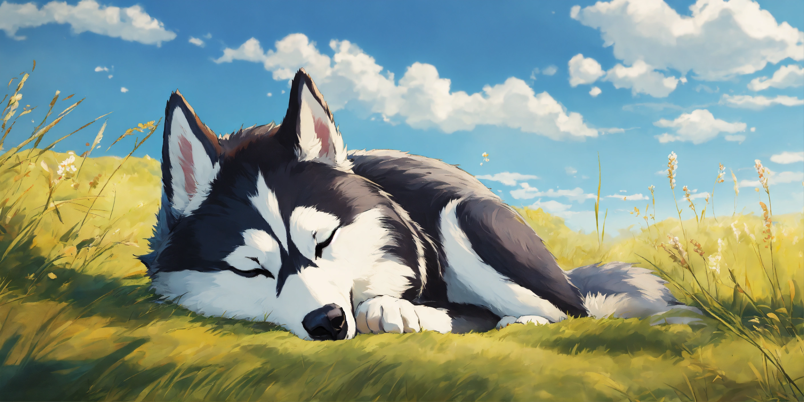 Husky dog style art of a dog sleeping peacefully, the sky is blue with a few white clouds, a few grasses on a short step, 8k studio ghibli art