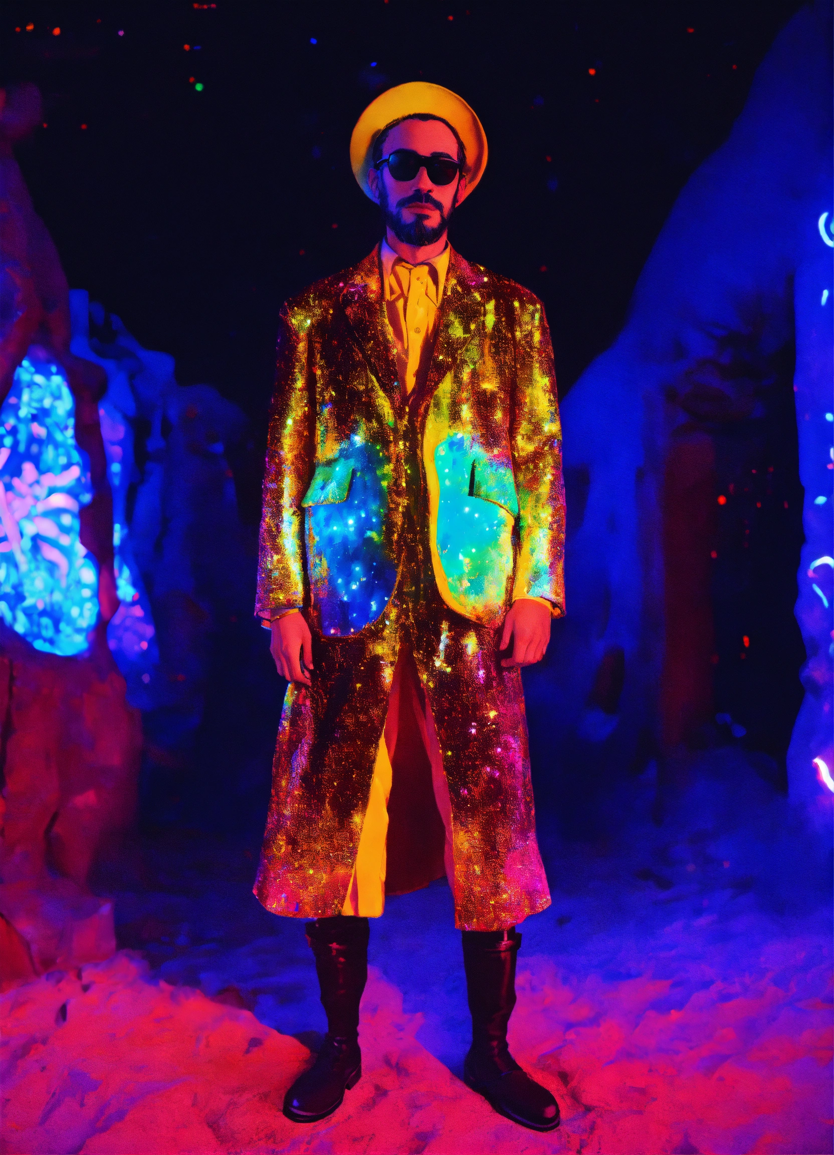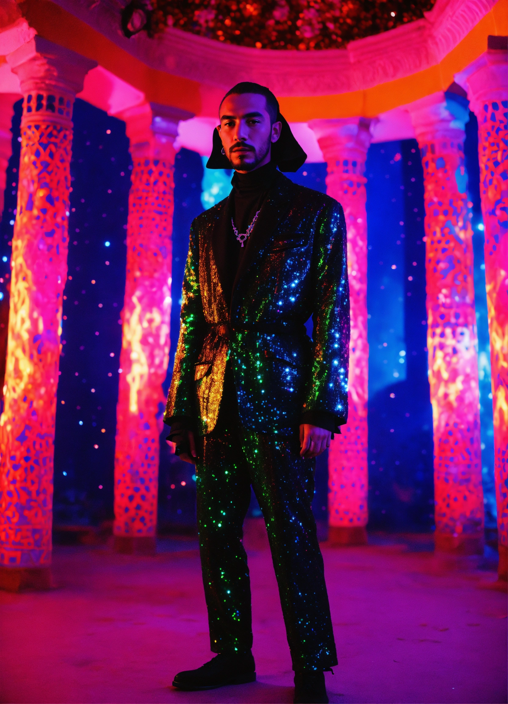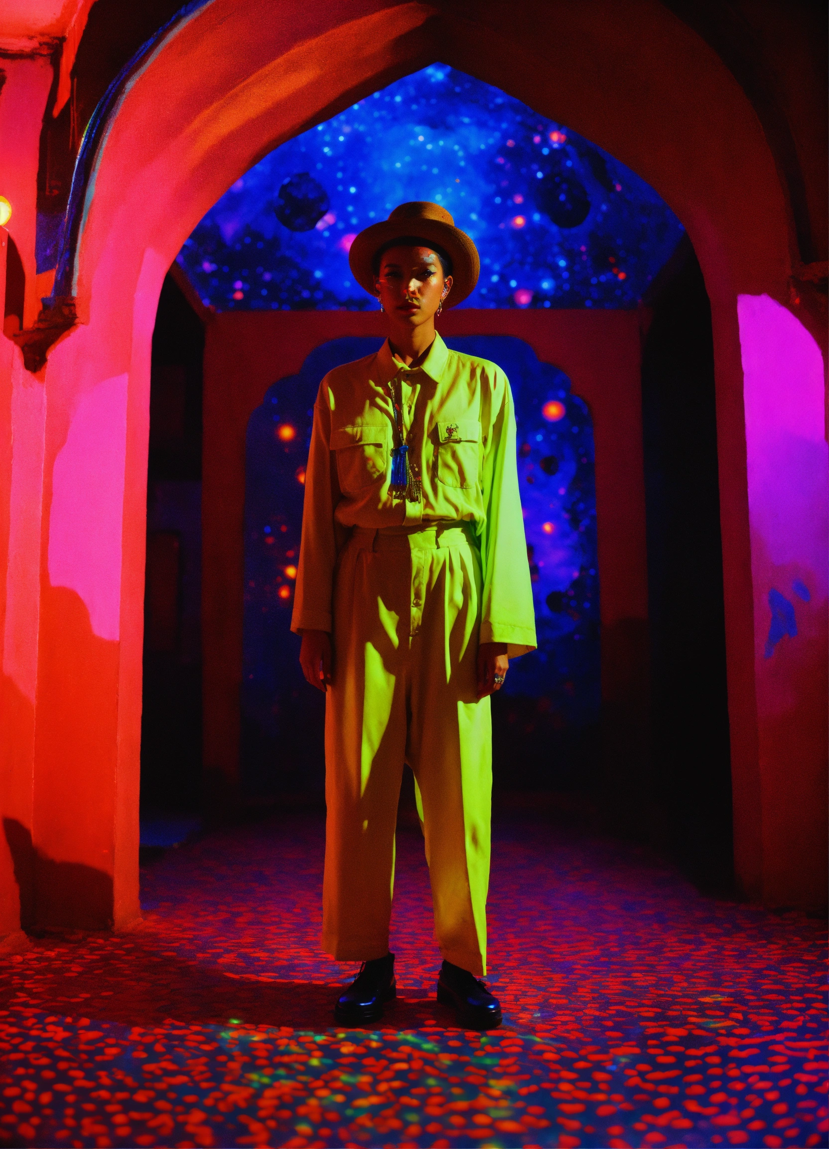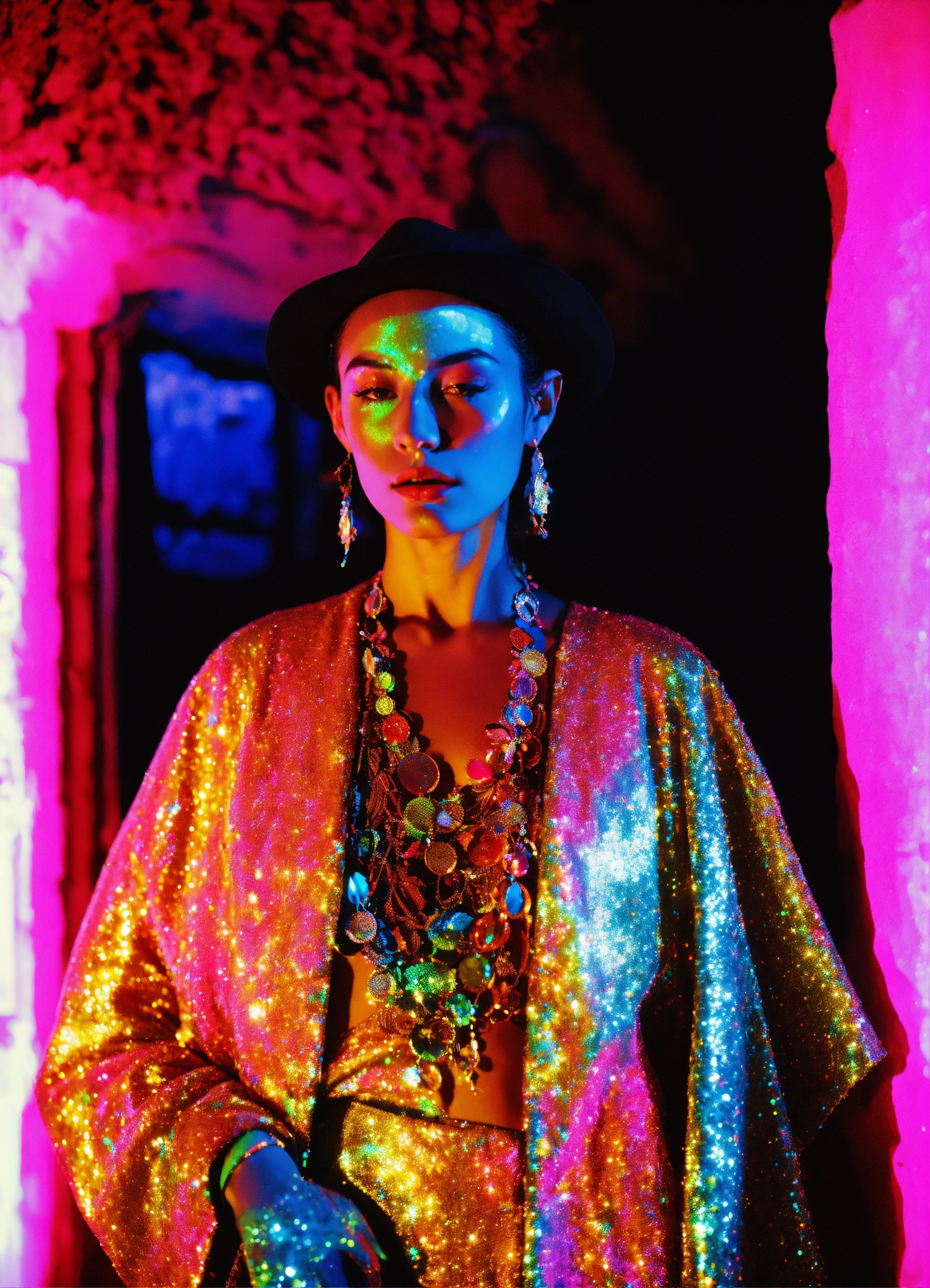 Full body portrait fashion, of cosmic bahpomet dmt black light glitter neon dubstep marrakech, 35mm film, art by salvador dali and holy mountain