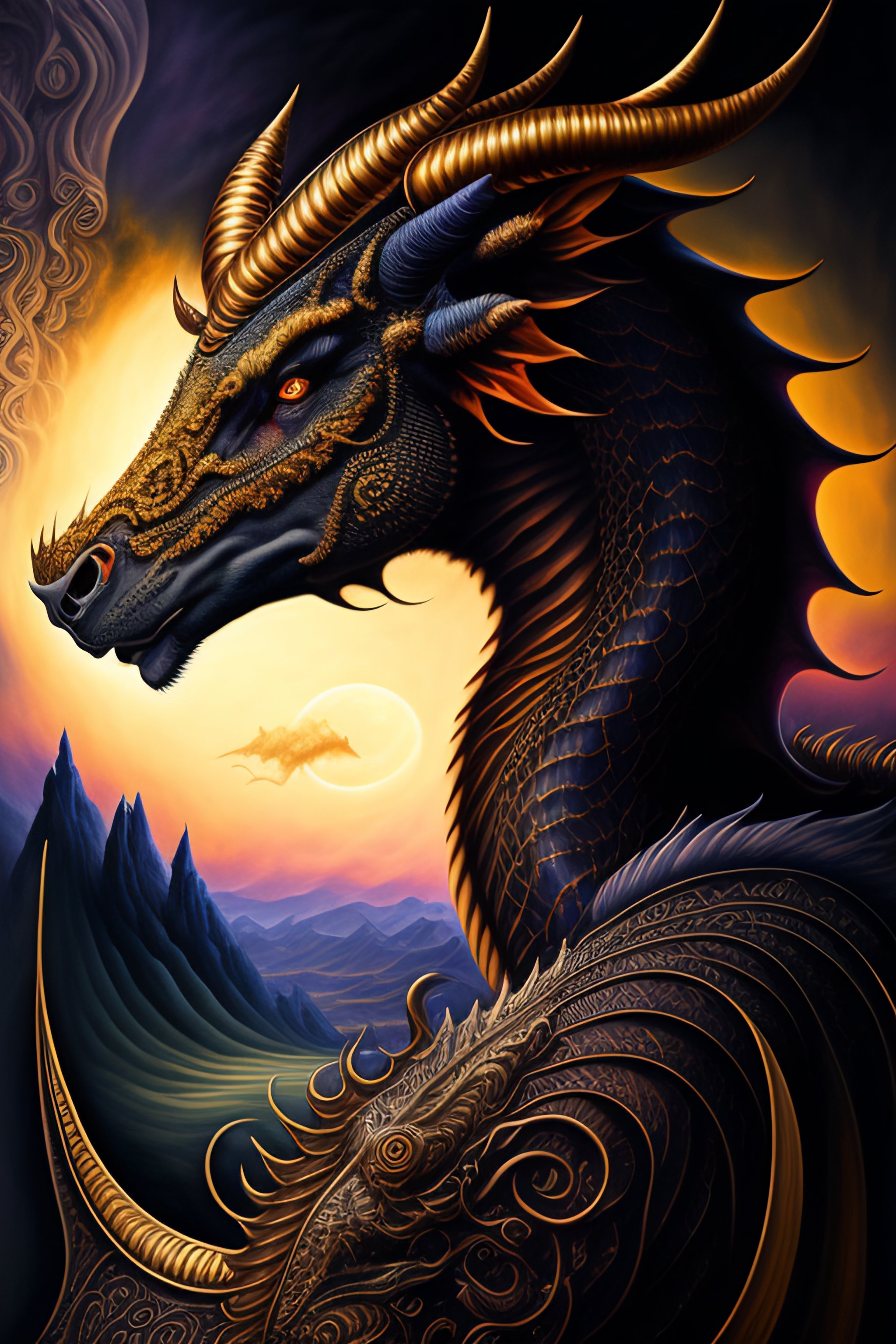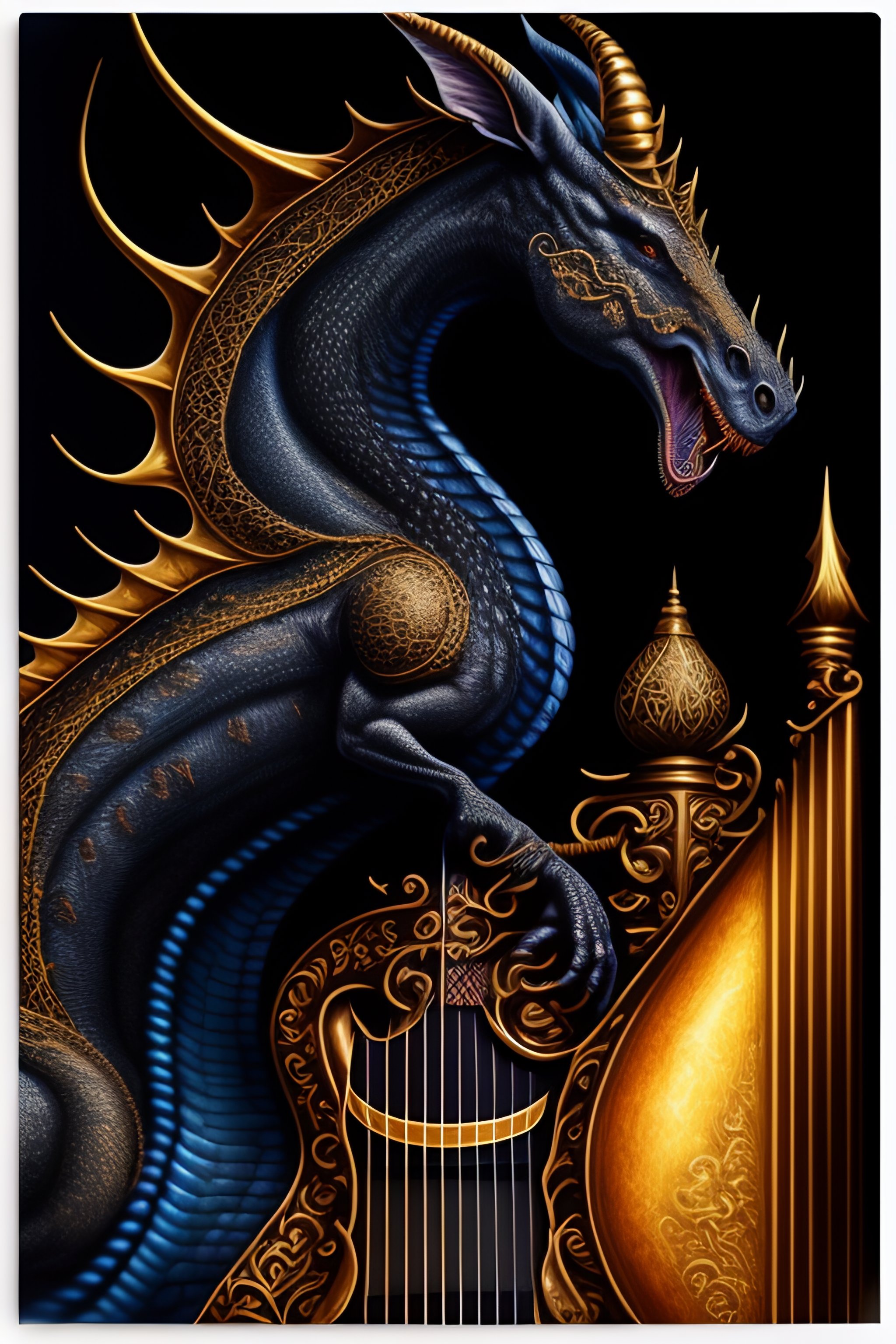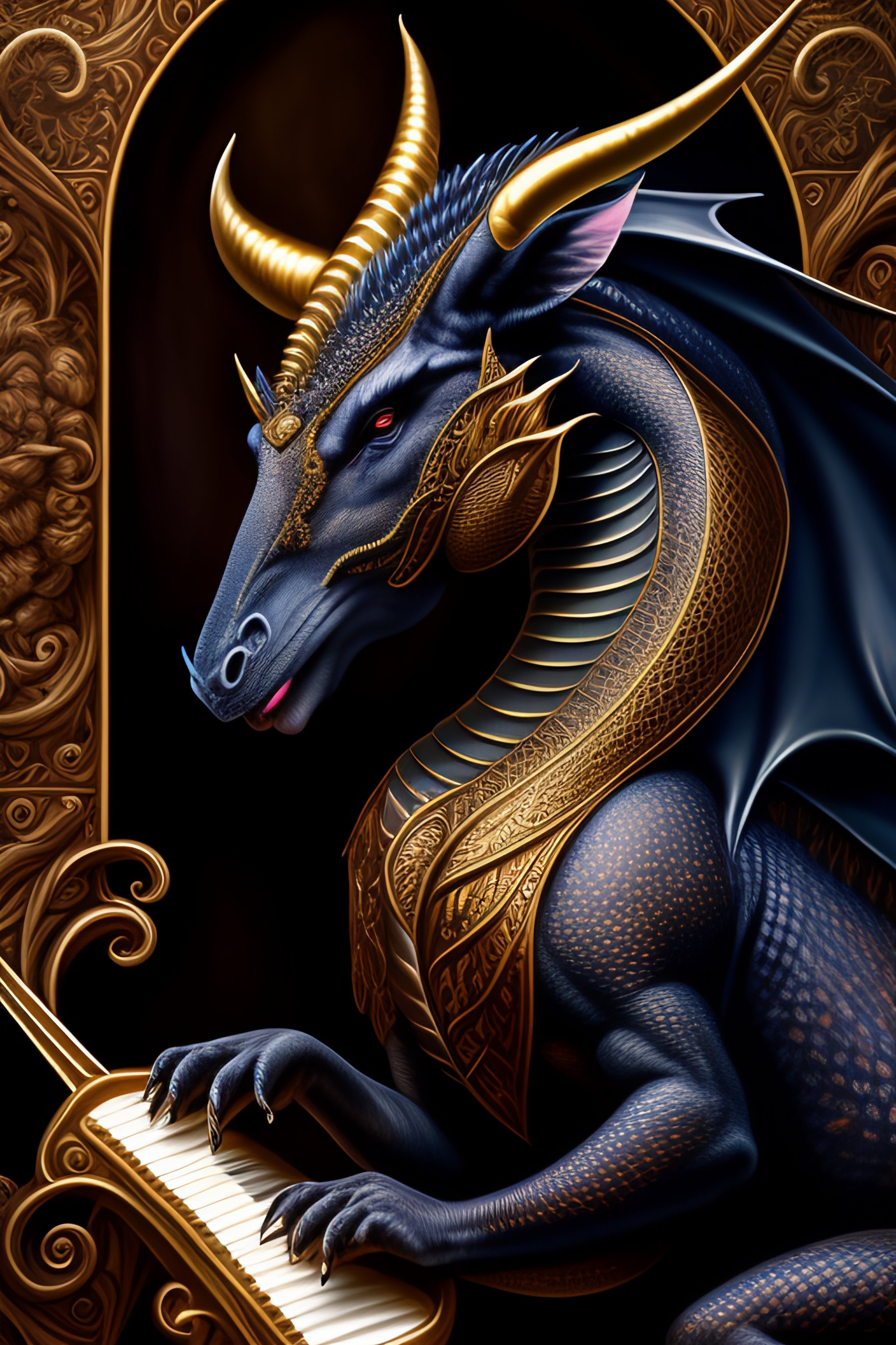 A portrait of a dark music dragon, detailed, fantasy, scary, realistic, frightening, ornate, horns, spikes, incredible, masterpiece, amazing, wow!, sense of awe, award winning, greg rutowski, bosch, mc escher, dali