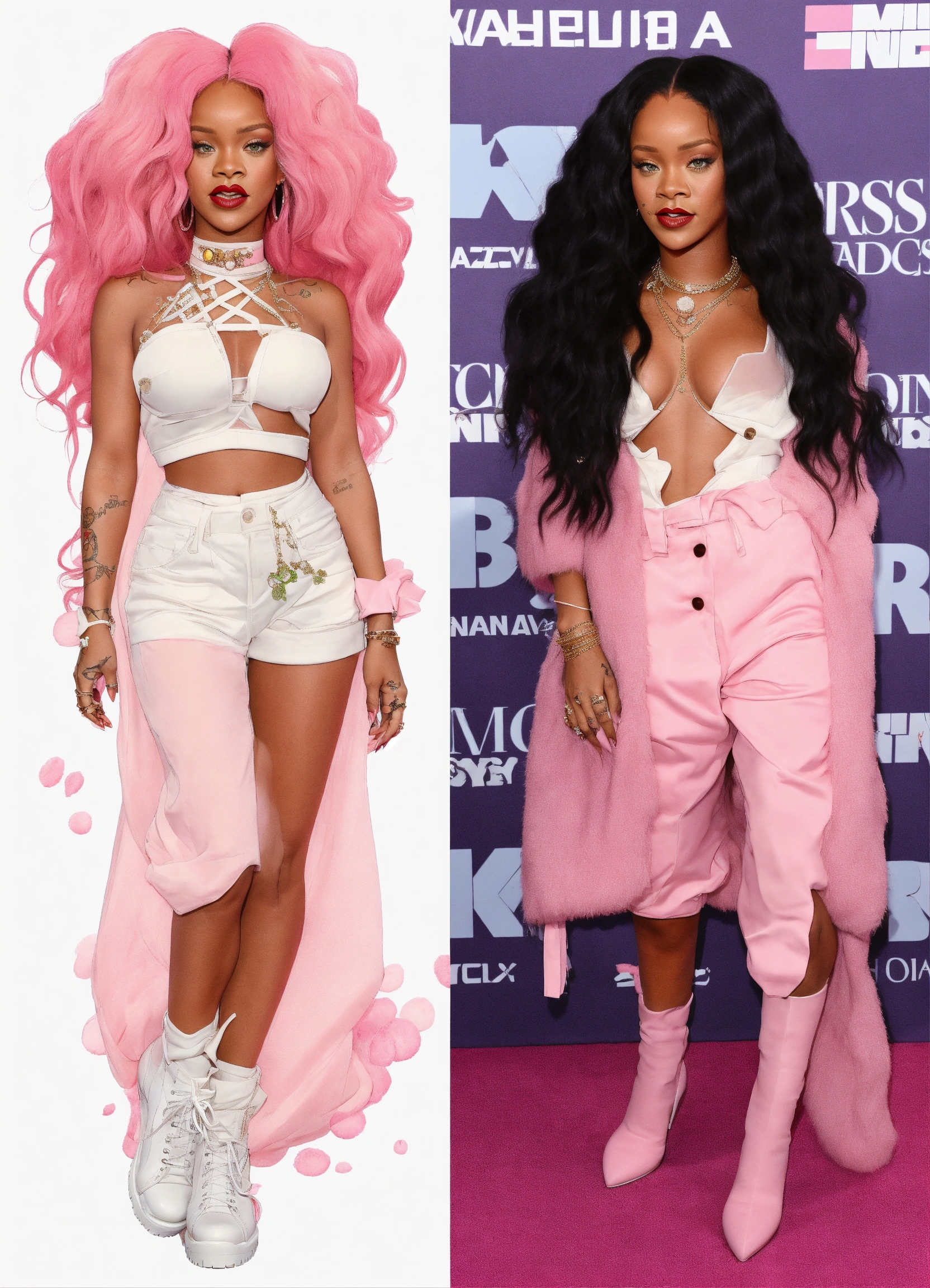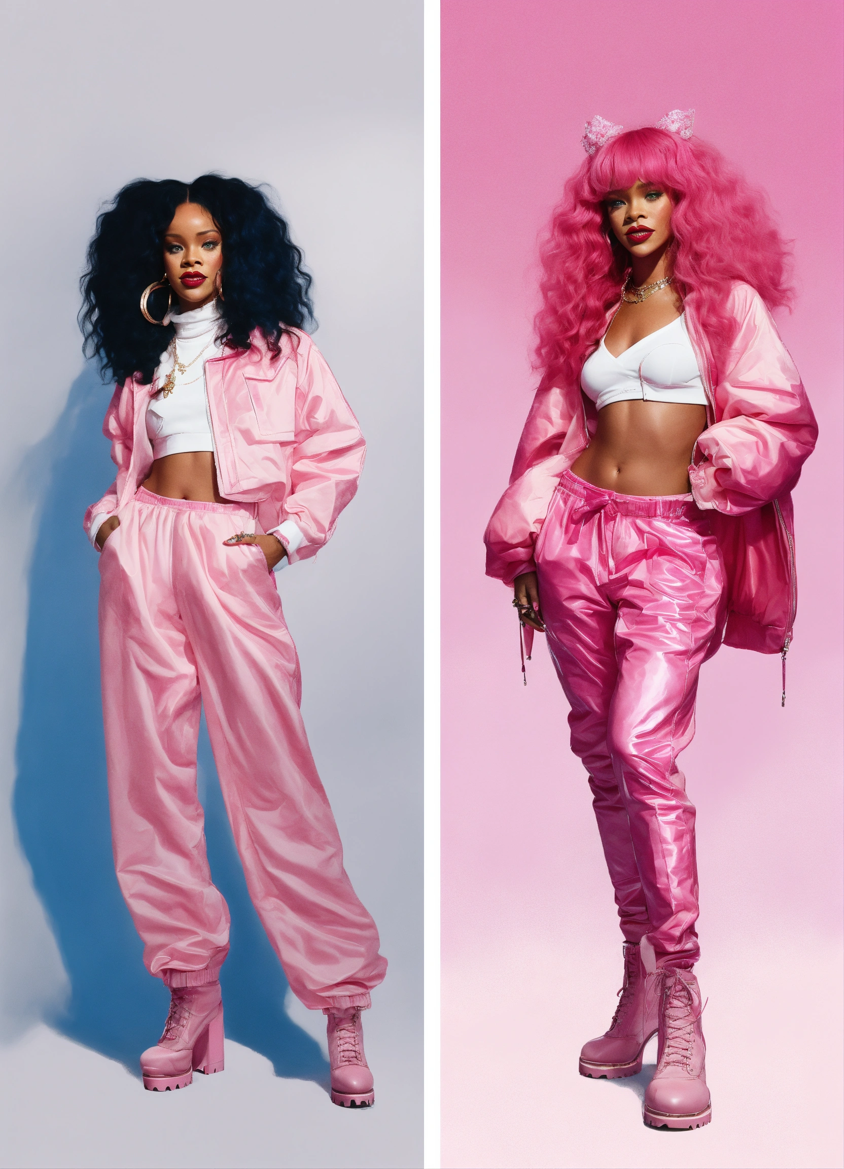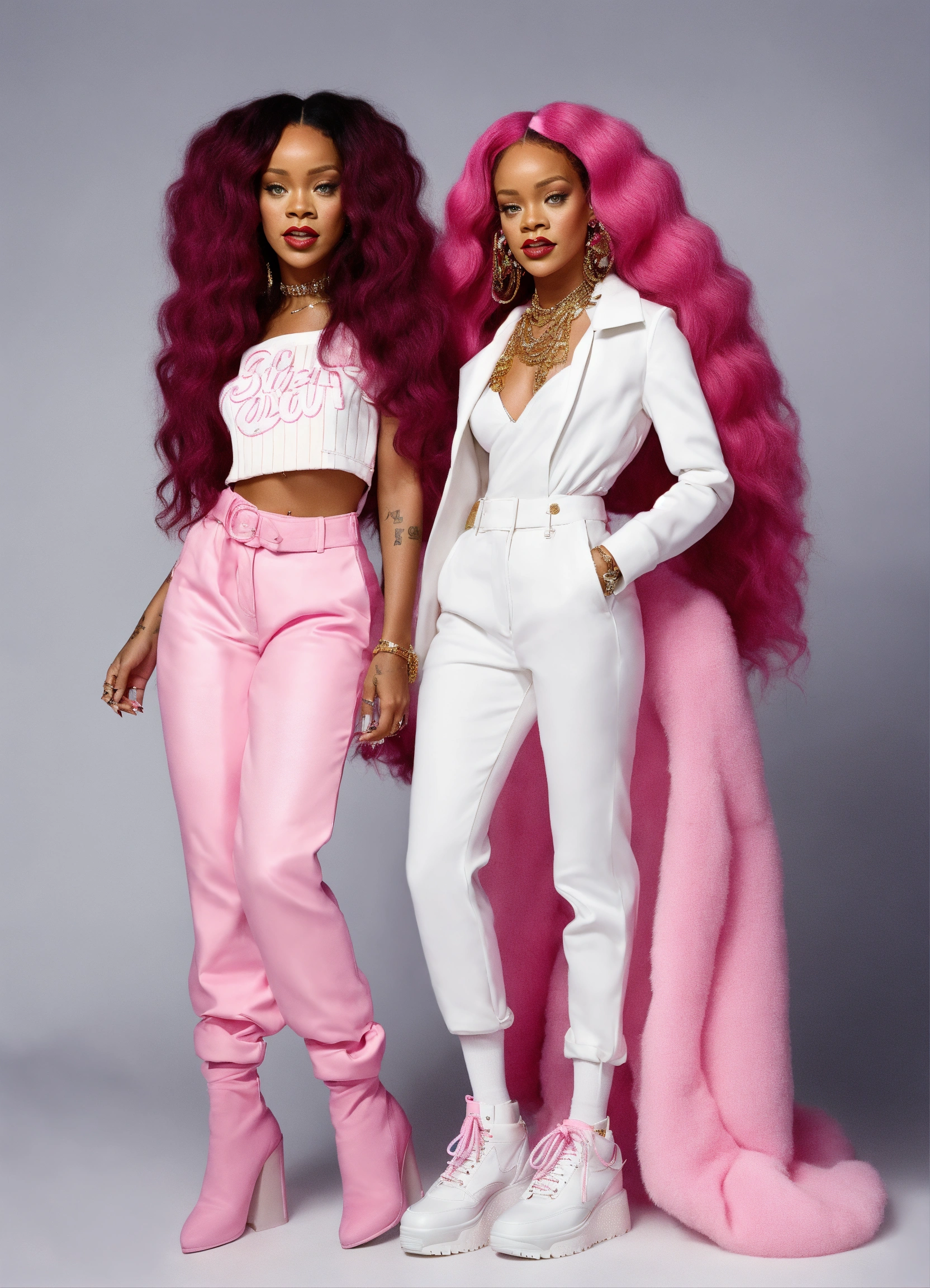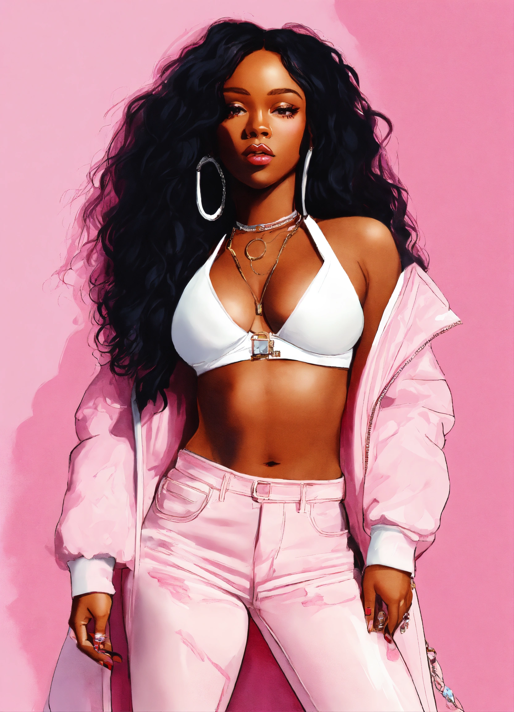 Full body image of caricature of sza dressed in white and pink; full body image of caricature of rihanna dressed in white and pink on a white background