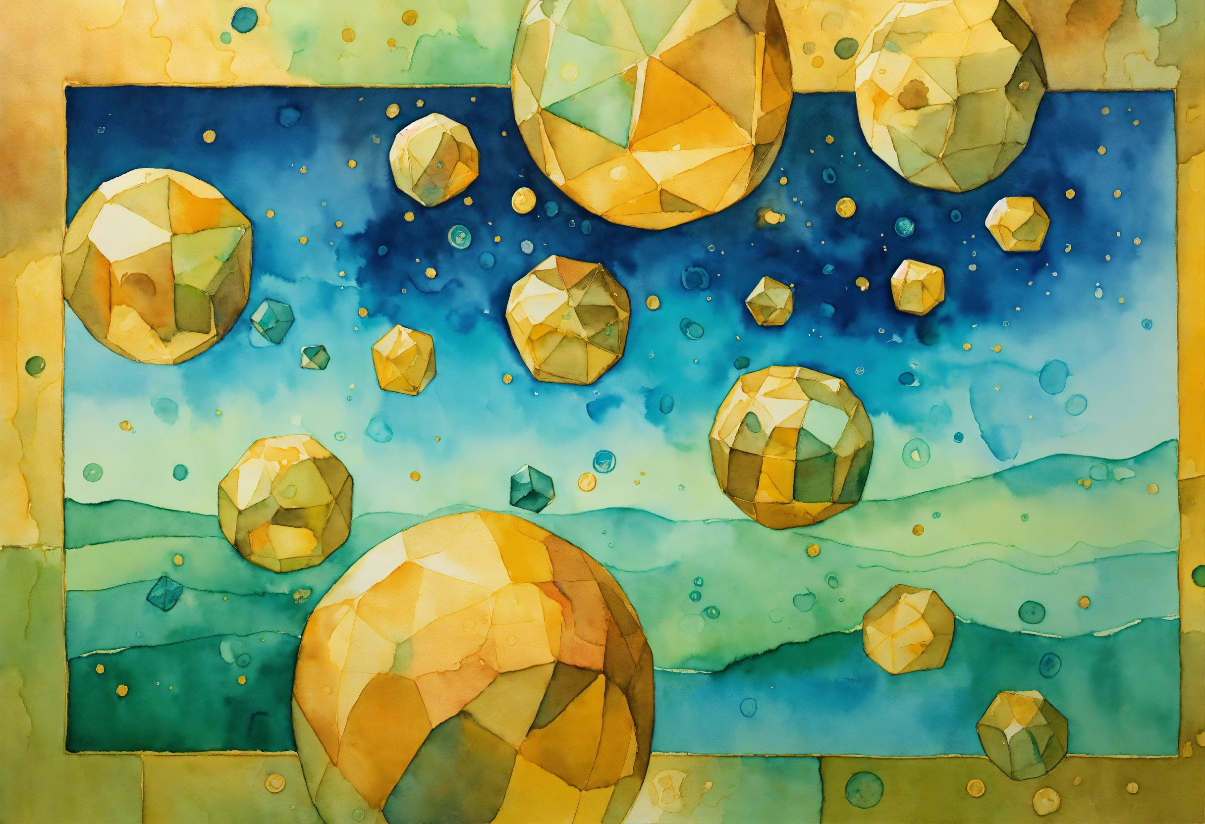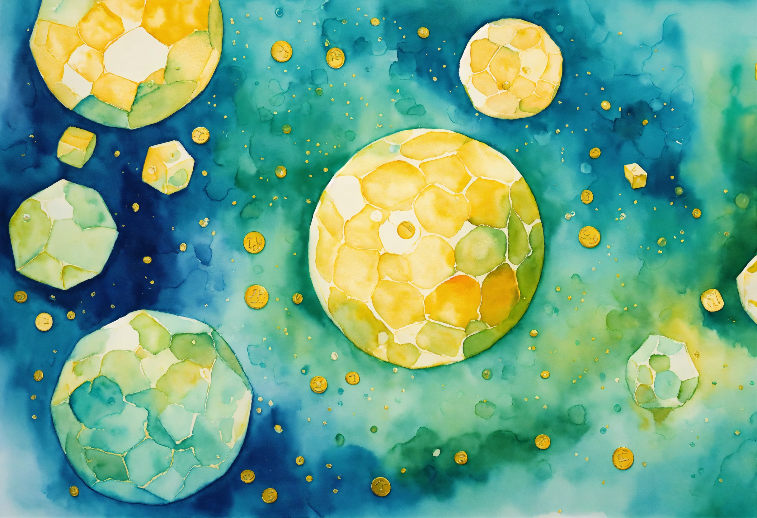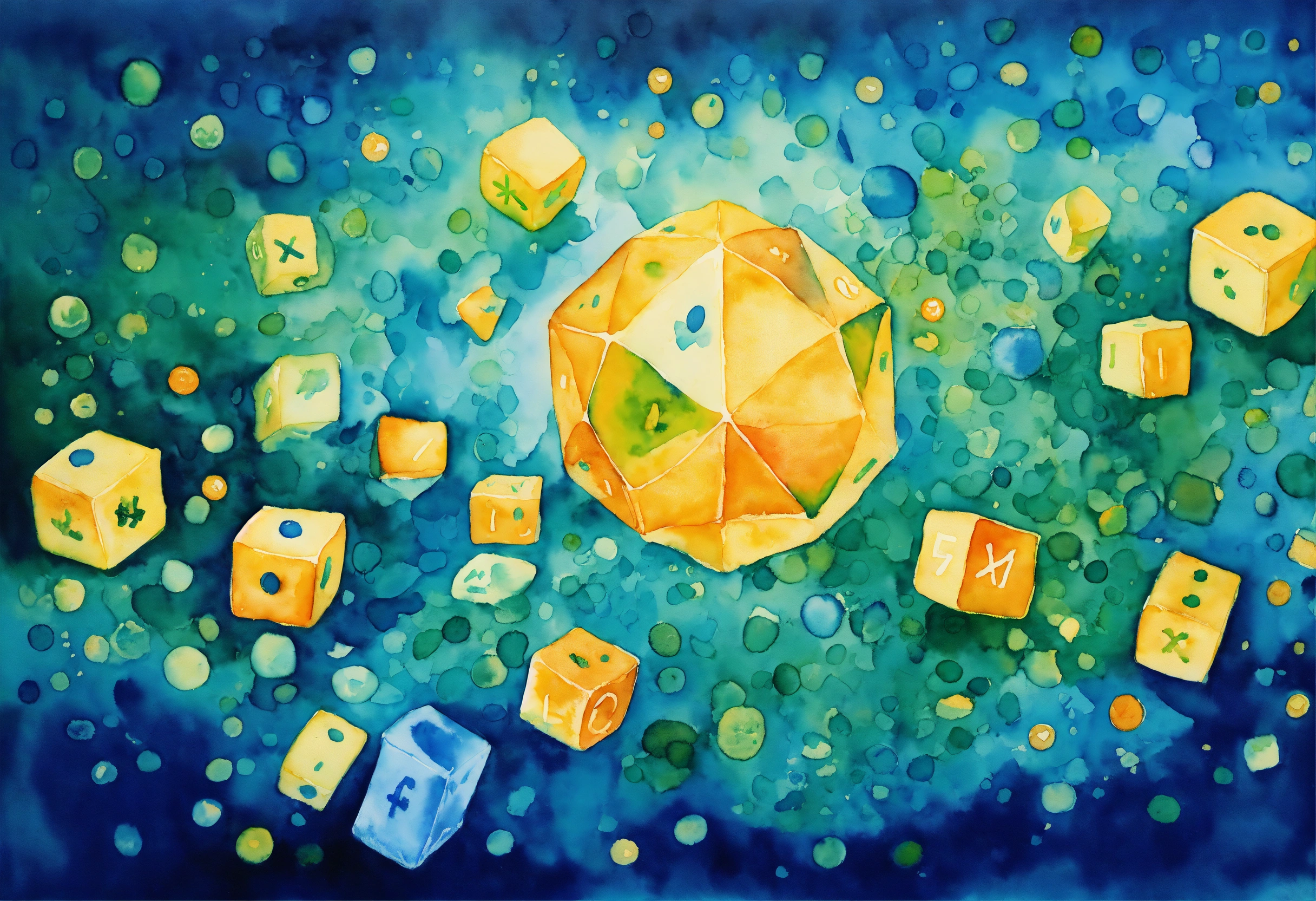 Watercolor painting representing abstract probabilistic mathematics with an optimistic touch. soft gradients of blues and greens merge, reminiscent of a probability density function. floating within this sea of color are golden dice, coins, and mathematical symbols, all casting a warm, hopeful glow. the gentle interplay of colors and symbols suggests a positive outcome in the realm of chance.