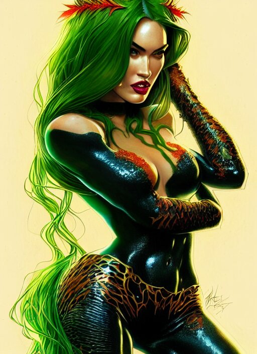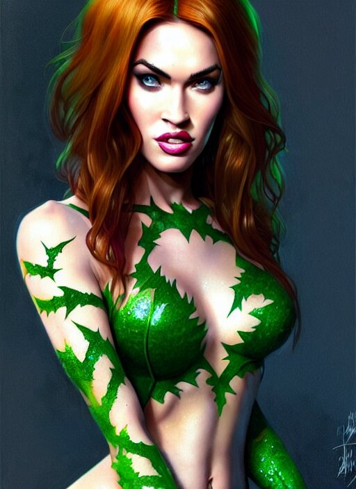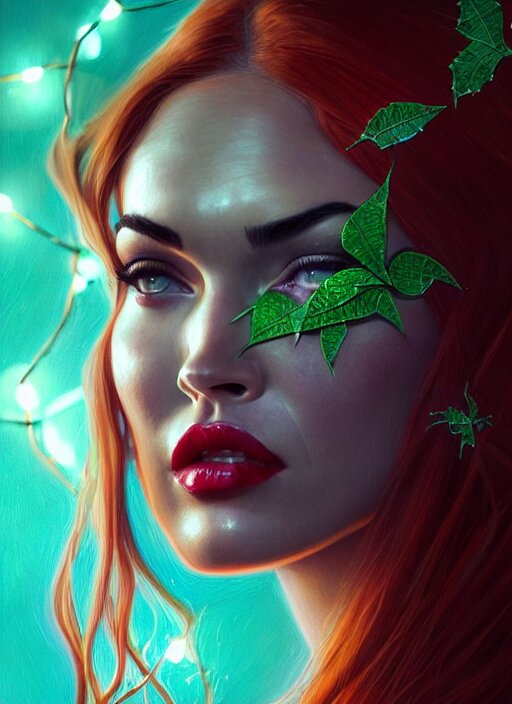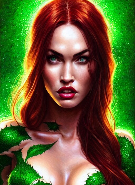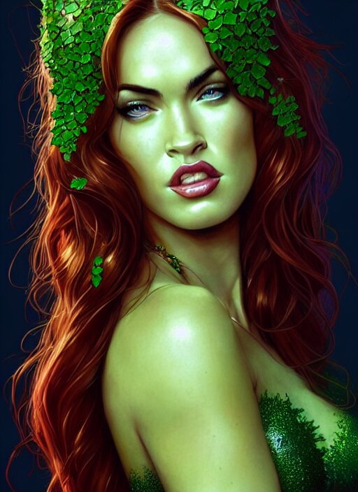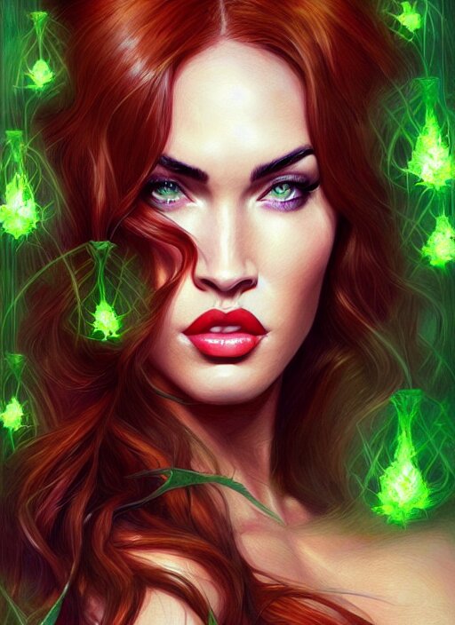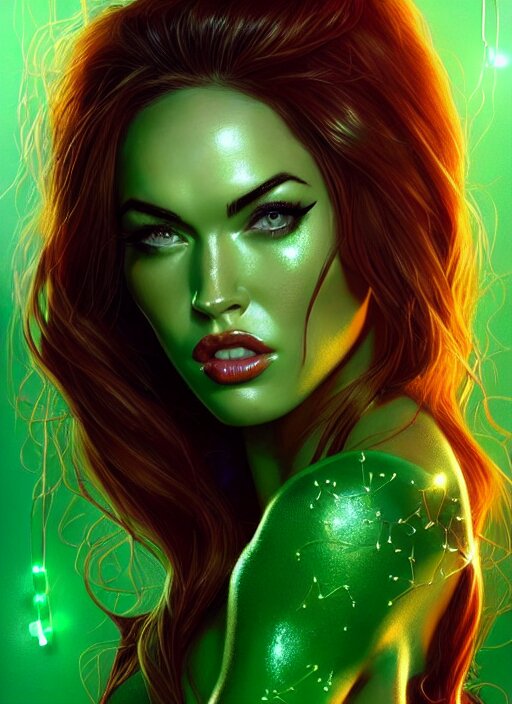 Portrait of megan fox as poison ivy, intricate, elegant, glowing lights, highly detailed, digital painting, artstation, glamor pose, concept art, smooth, sharp focus, illustration, art by artgerm and greg rutkowski, artey freytag