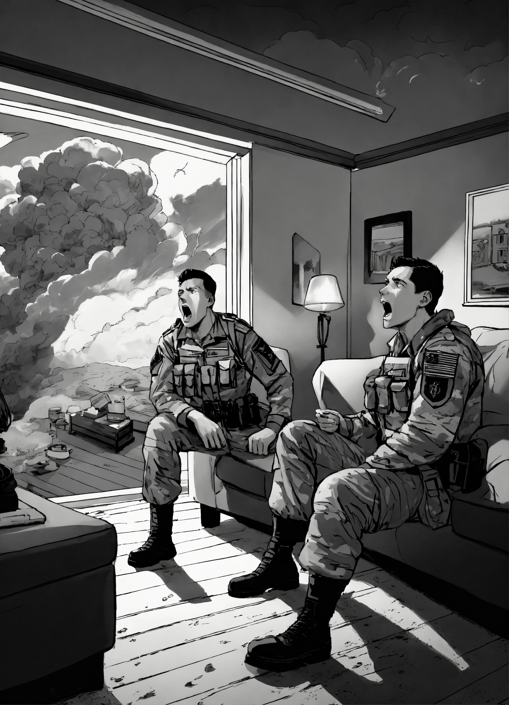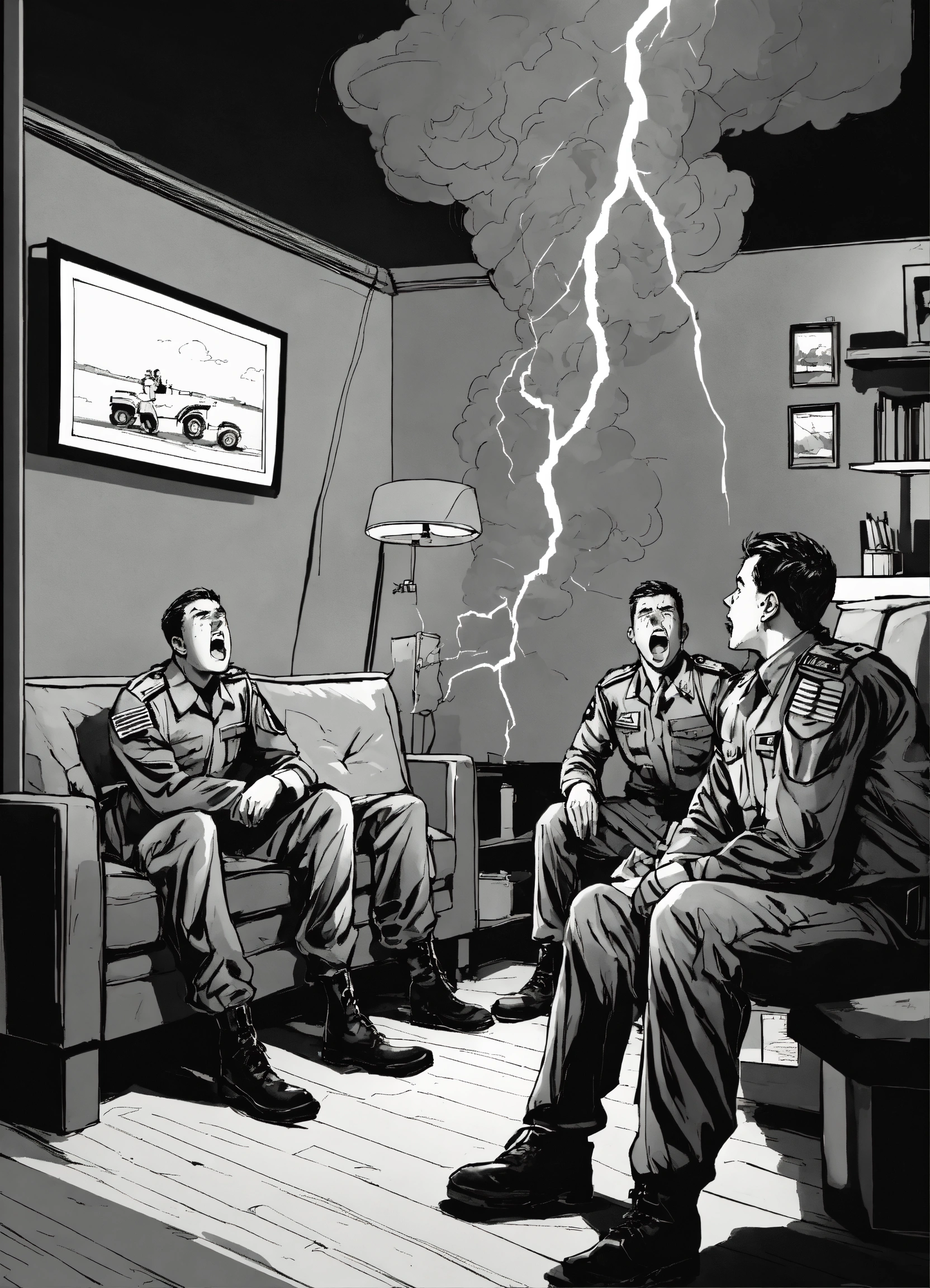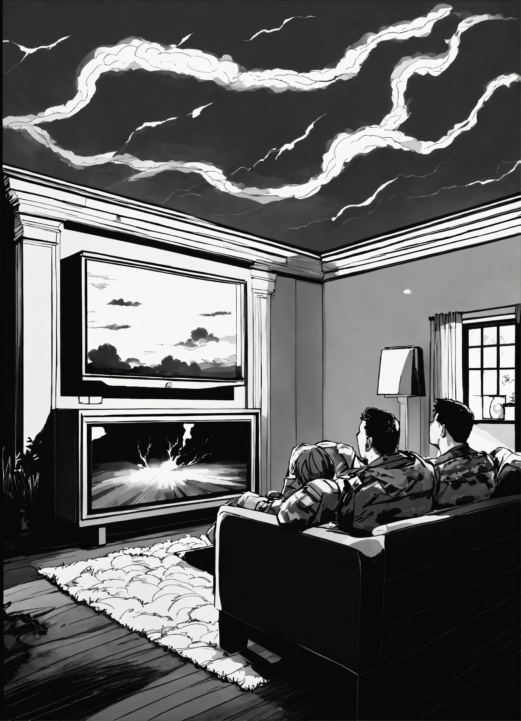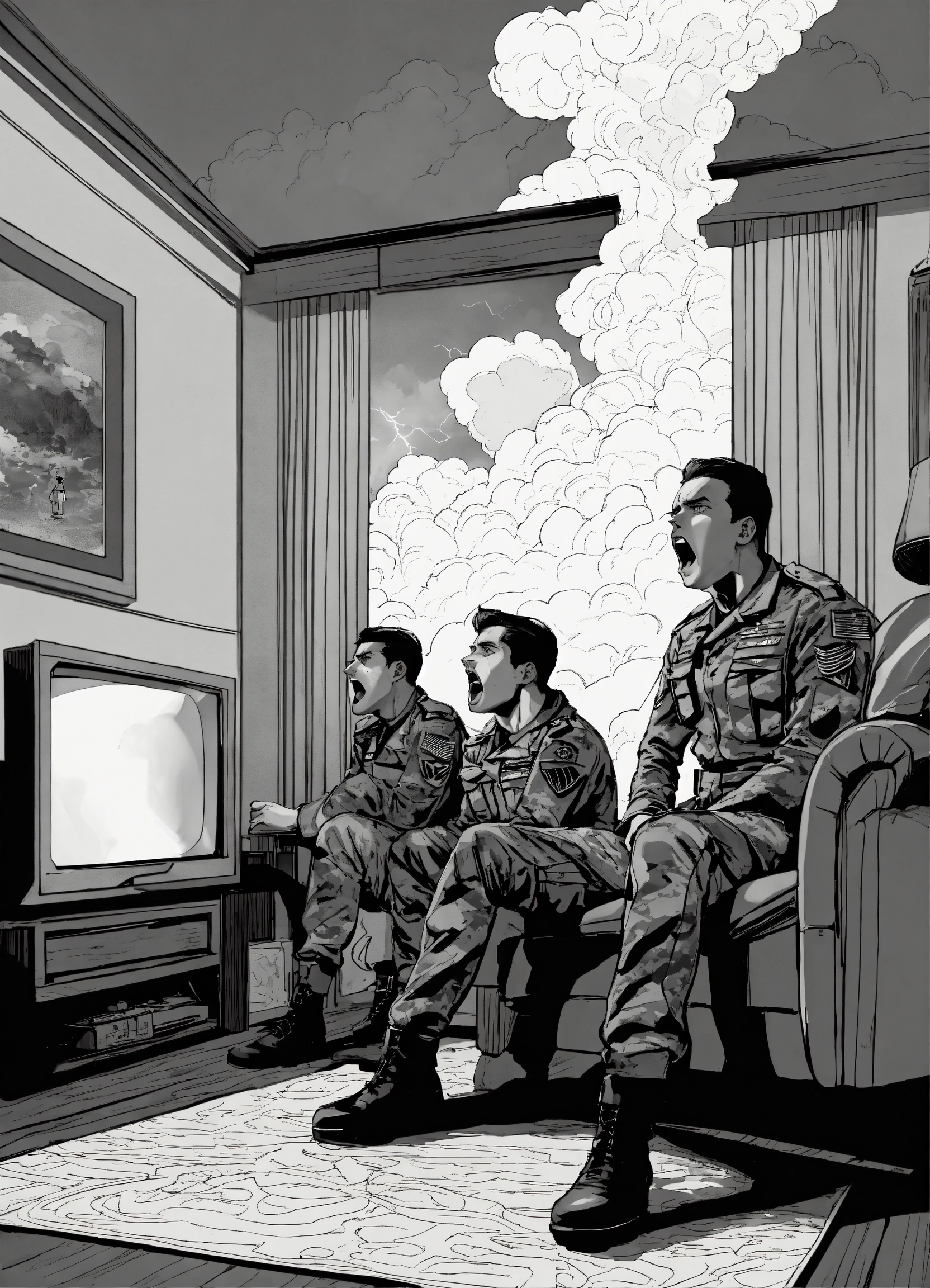 Black and white illustration of male soldiers watching tv, sitting in living room, shocked, screaming, sitting and standing, enraged, emotional, dark with lightening and clouds swirling around them