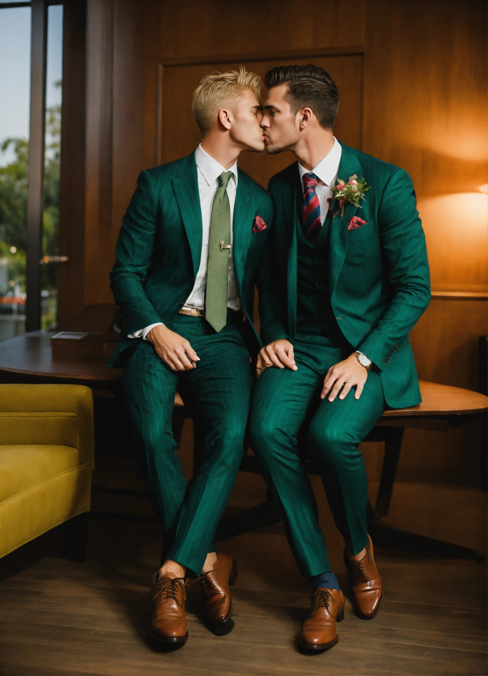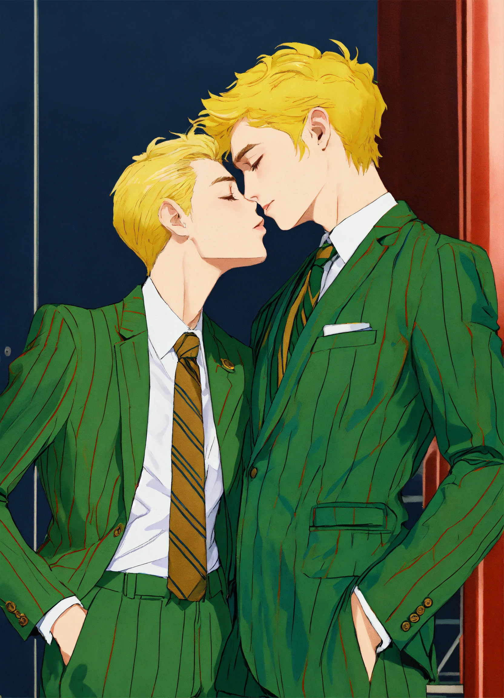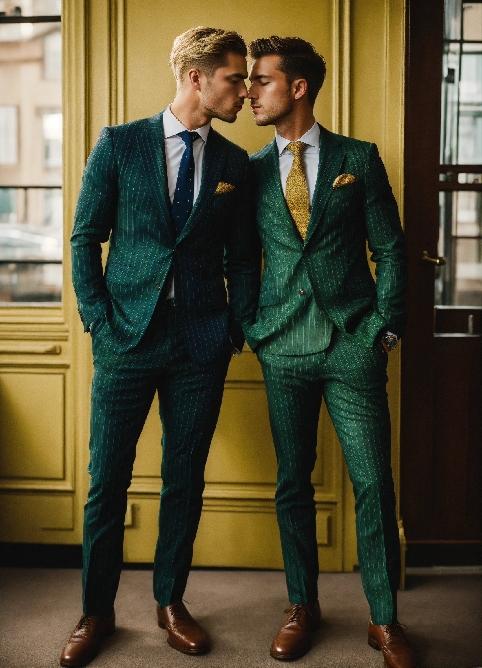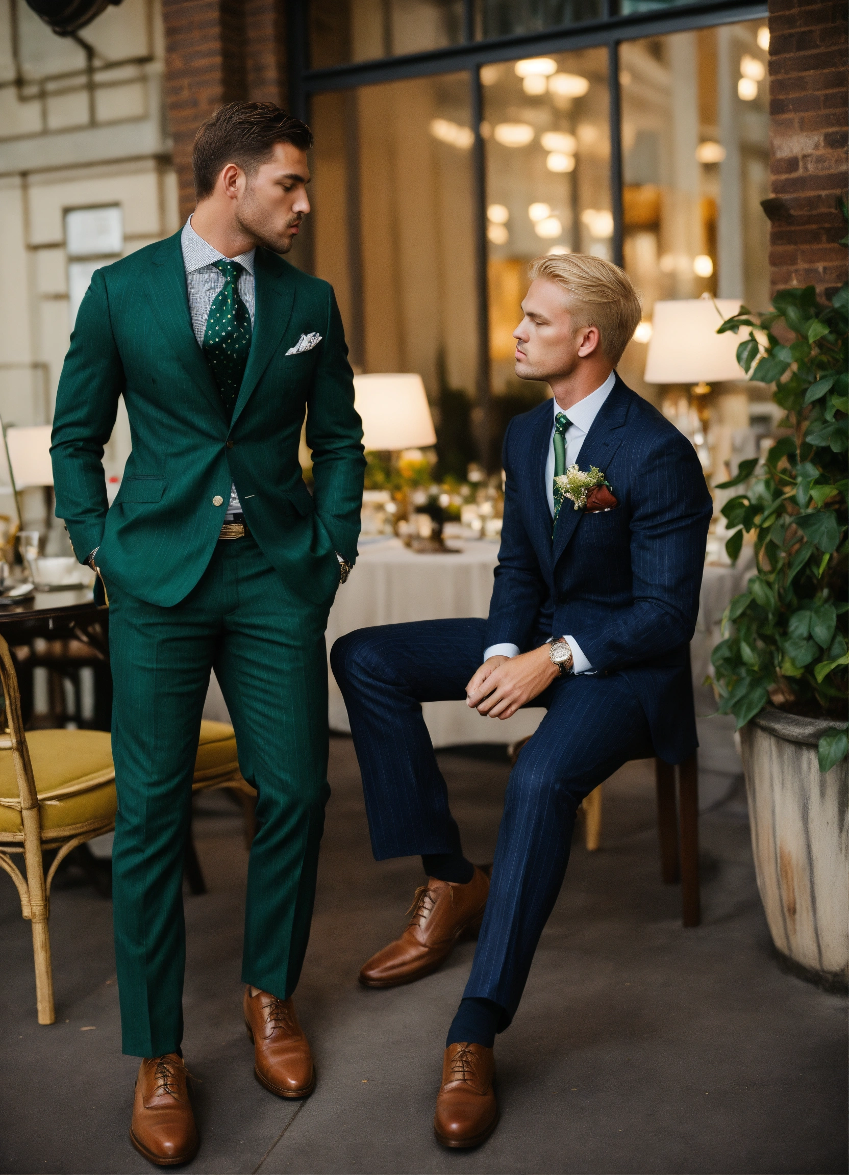 Two rough blonde businessmen in navy-green pinstripe blazer