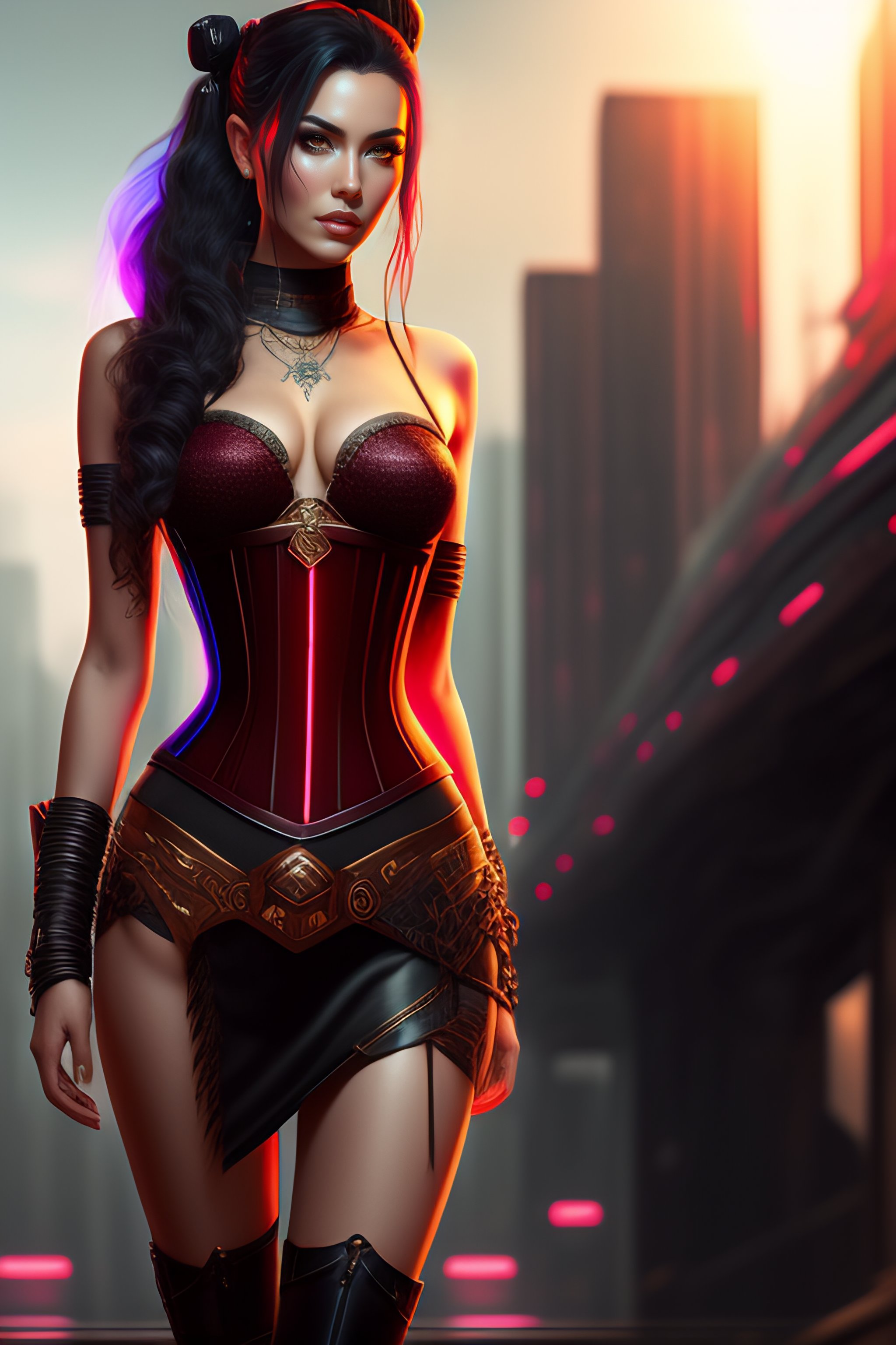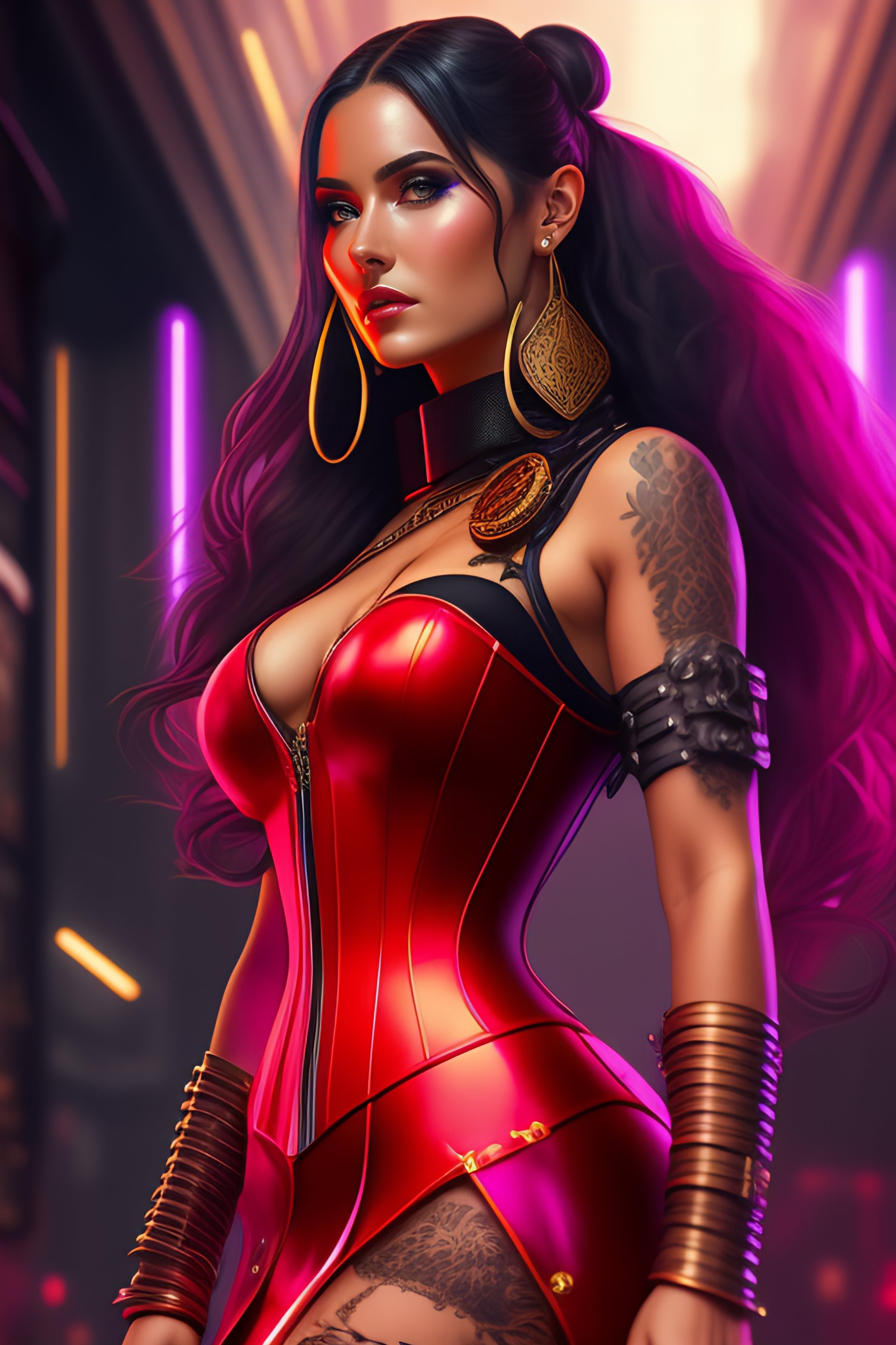 Full body girl, near a cyberpunk girl with corset, concept art, character design, trending on artstation, rey tracing, epic fantasy, 8 k, 4 k, beautiful lighting, painting, rule of thirds, red transparent dress