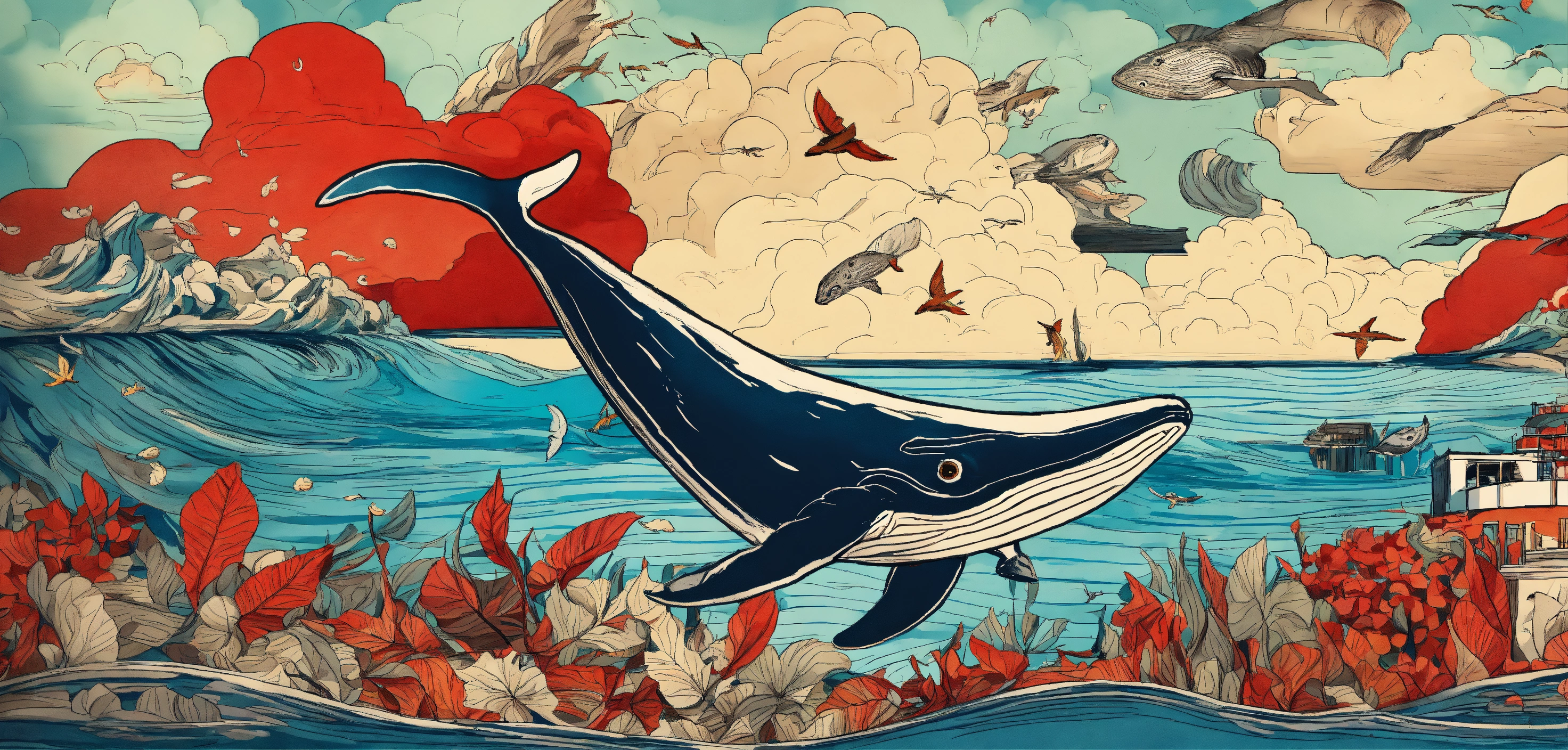 Bits of color, bet casino chips, hand drawn, red, gritty, realistic sketch, rough sketch, mix of bold dark lines and loose lines, bold lines, on paper, waves and clouds, whale, flying fishes with bird wings, leafs