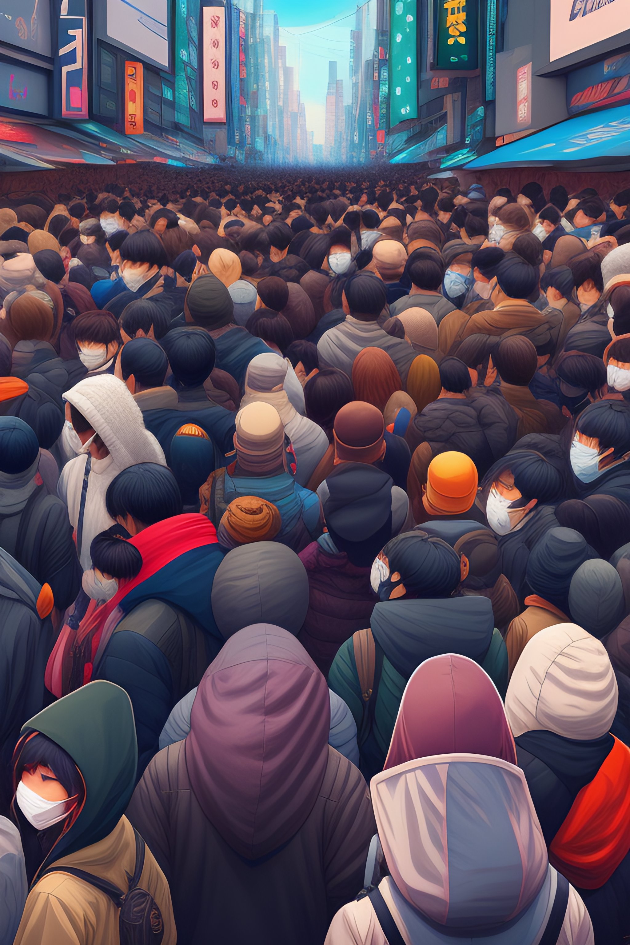 Anime guy in hoodie hiding behind a crowd of people in tokyo, wlop, concept art, digital painting, trending on artstation, highly detailed, epic composition, 8 k uhd