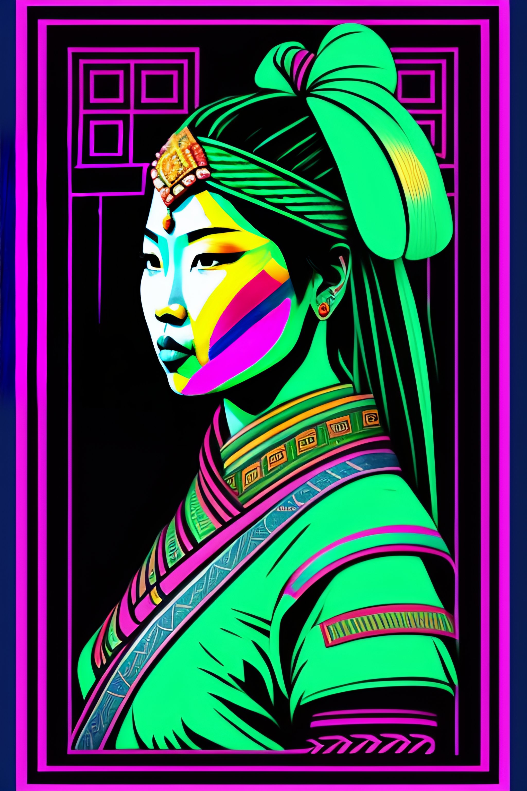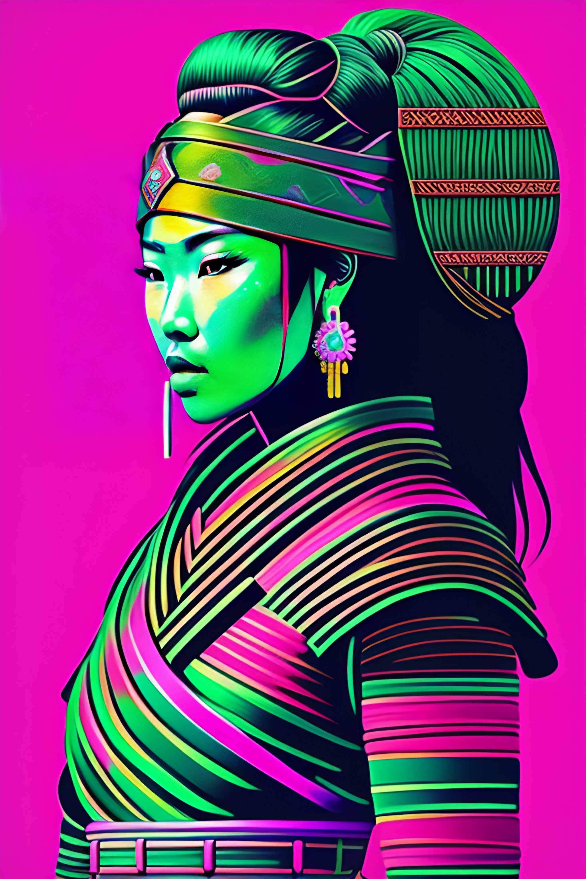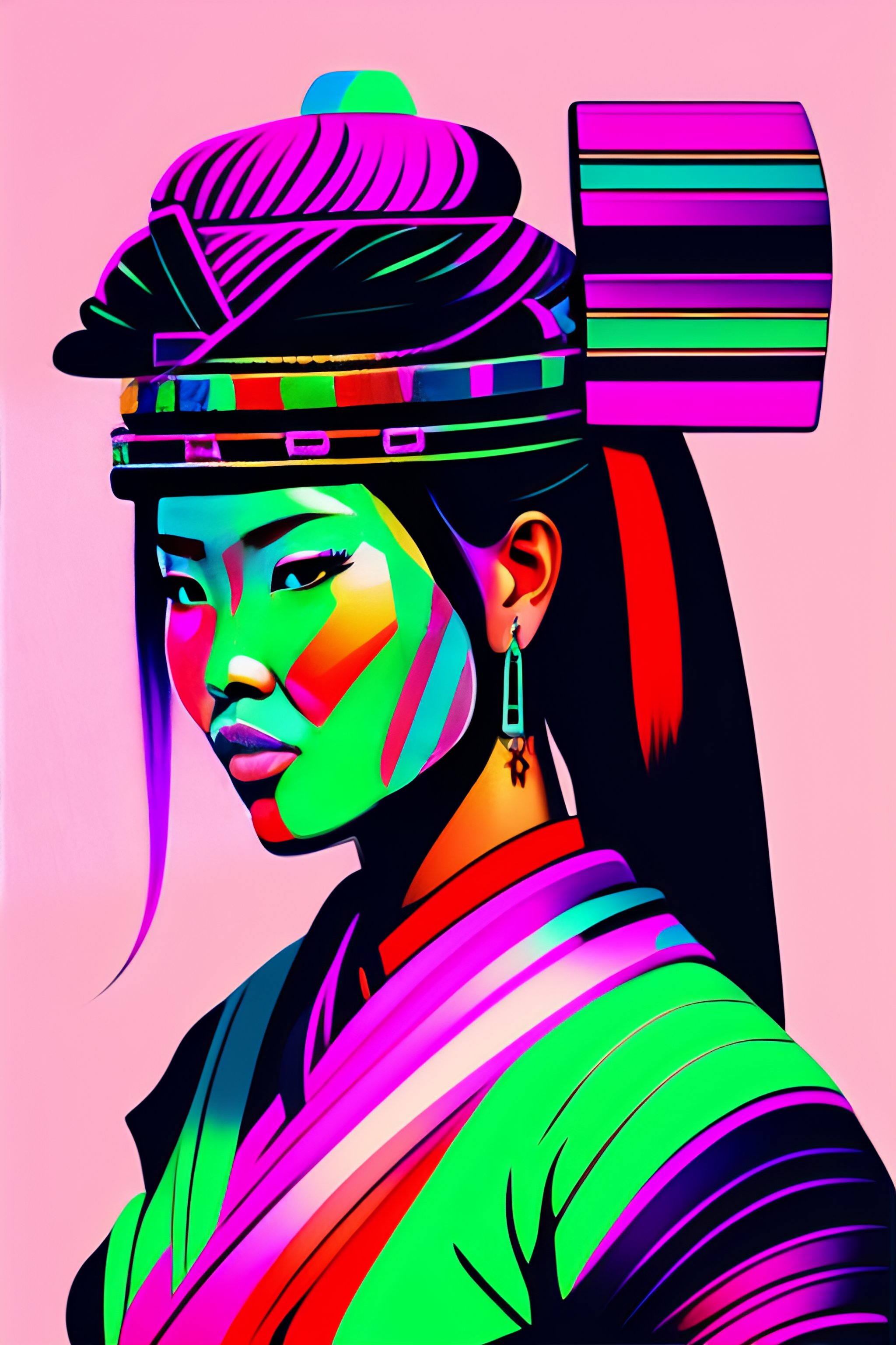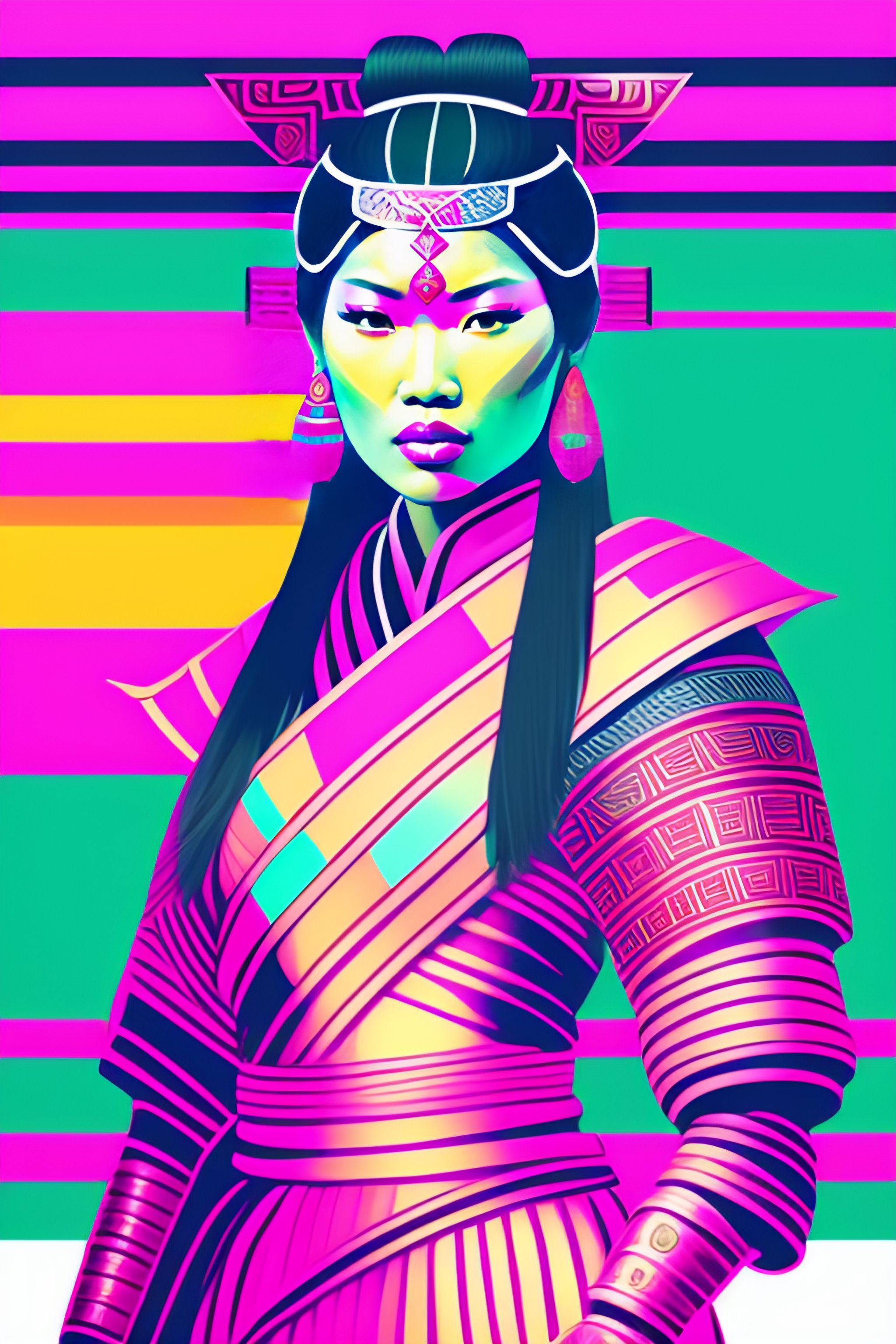 Outline drawing of samurai woman warrior portrait in simple aztec style colored in pink, green, blue and red