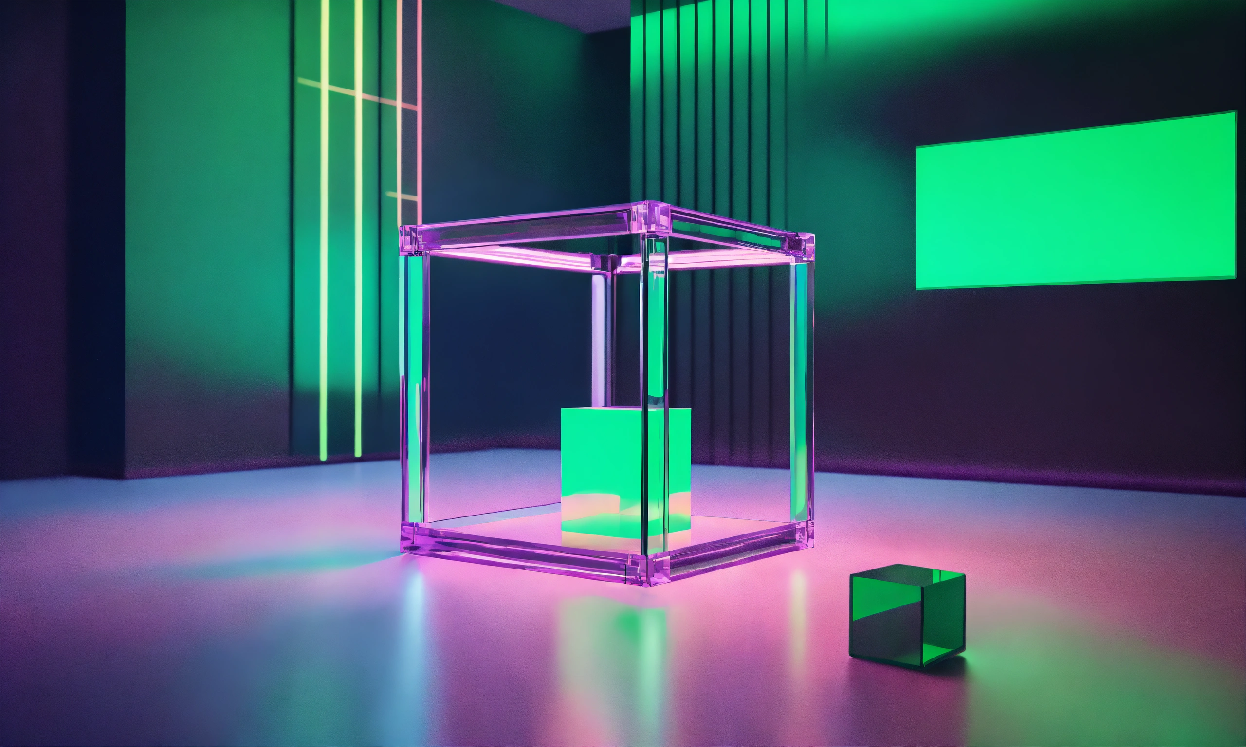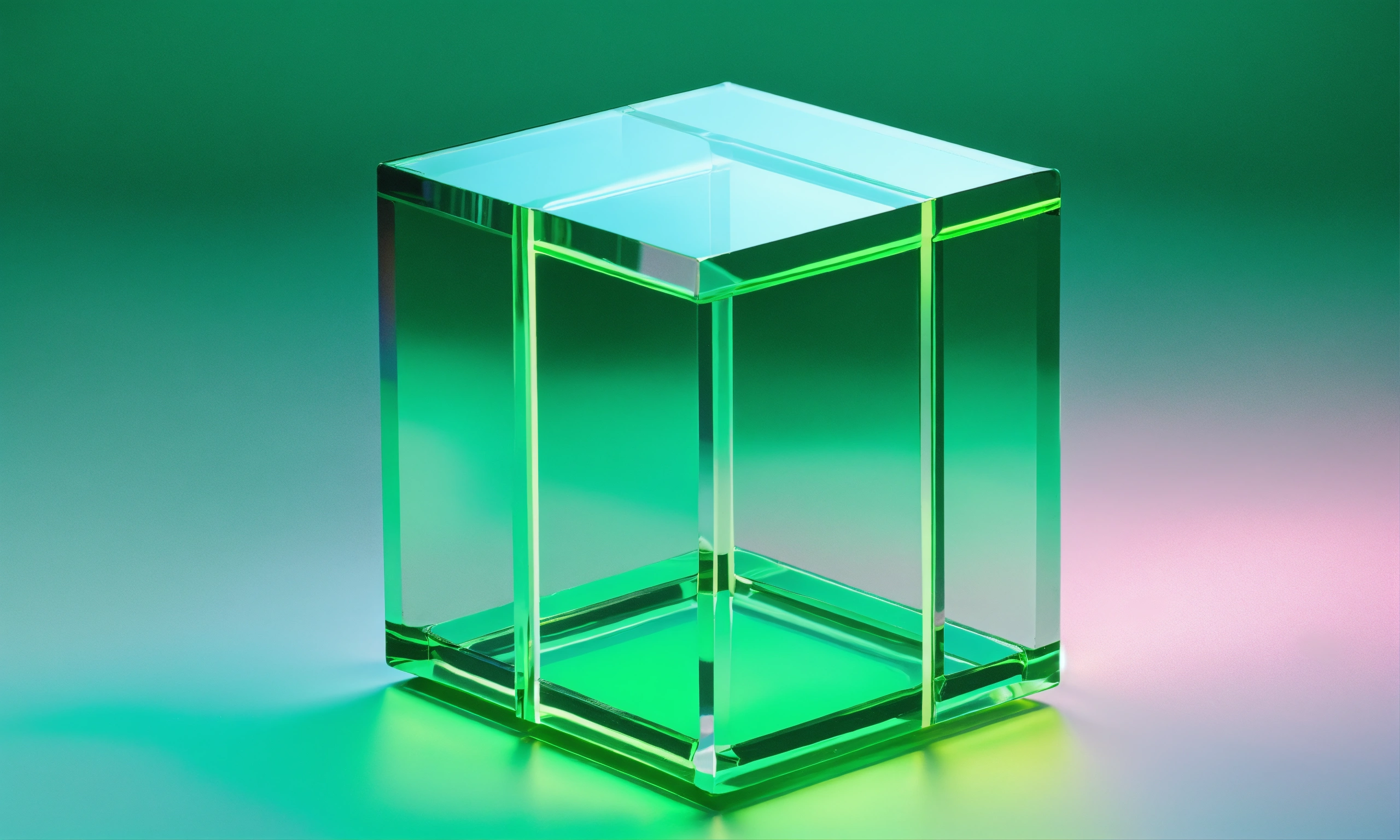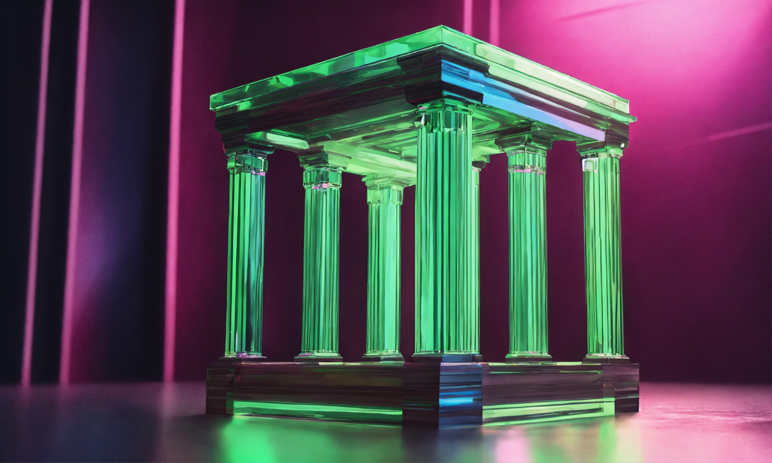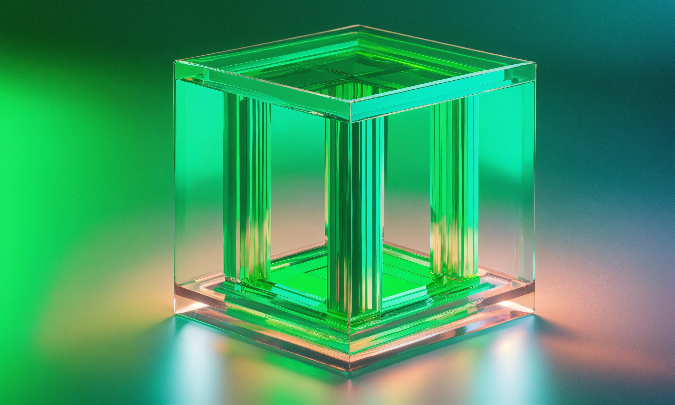 Isometric clear glass cube, sophisticated green roman columns, studio photography, some neon green accent color, 4k, iridescent! muted color background! realistic!