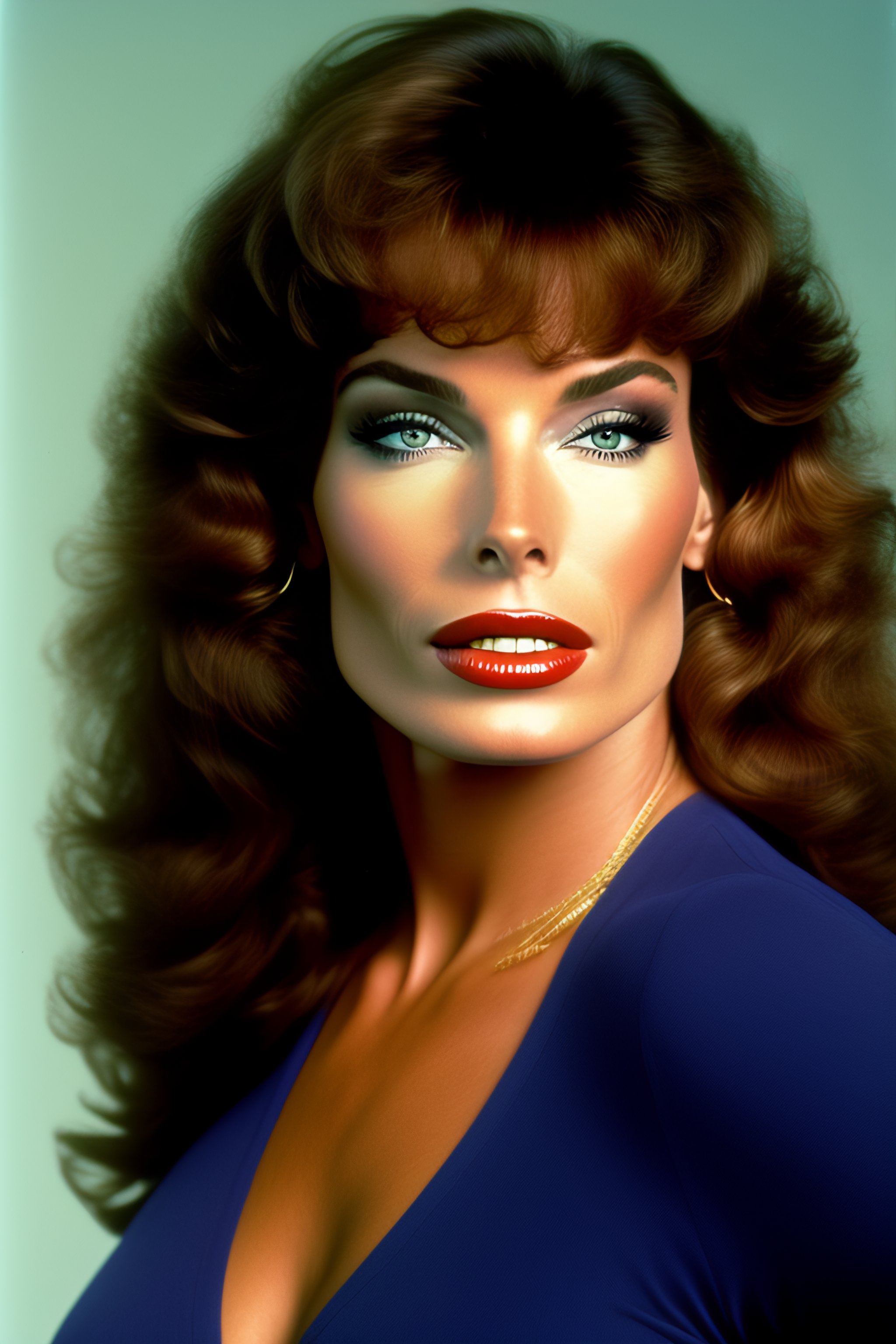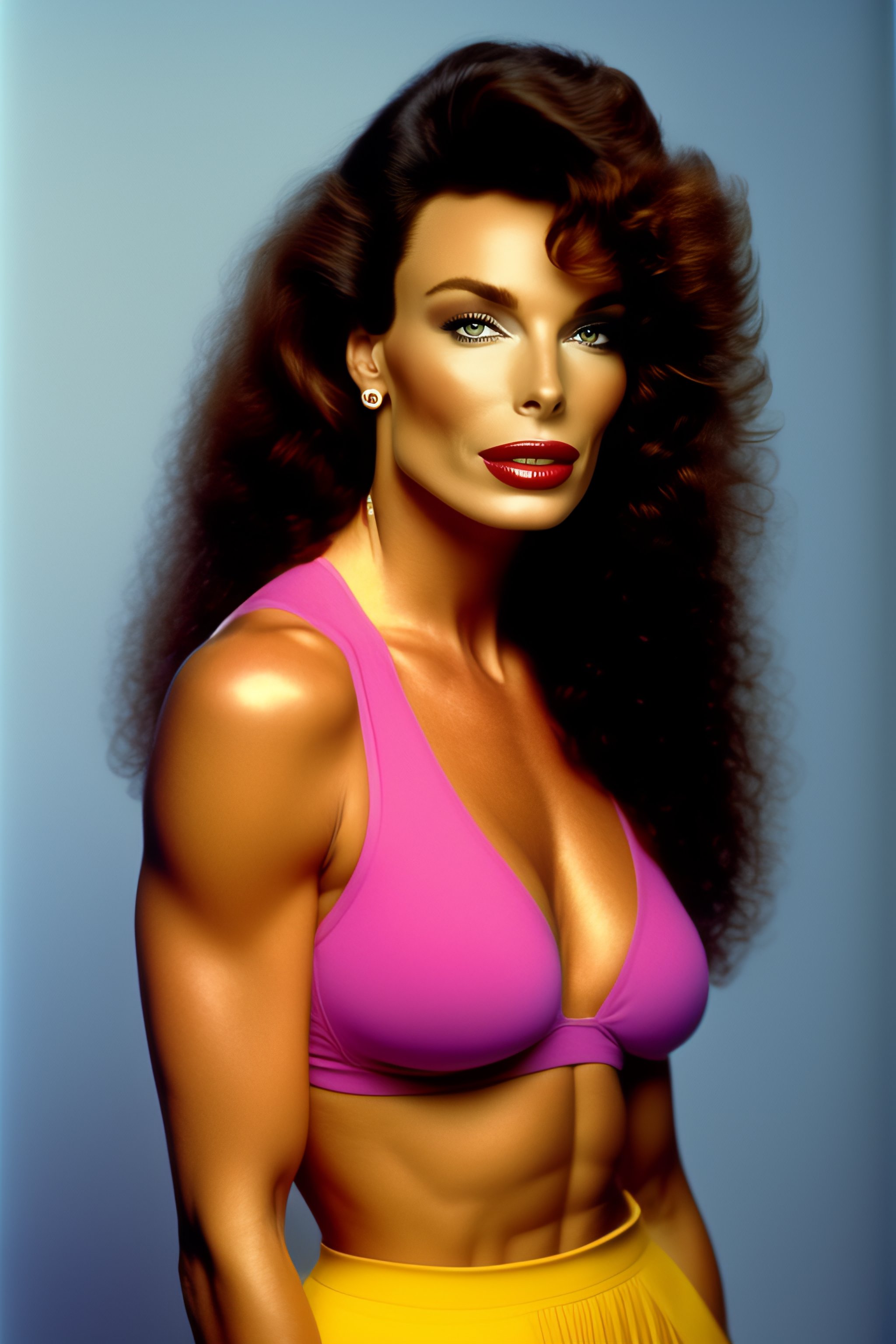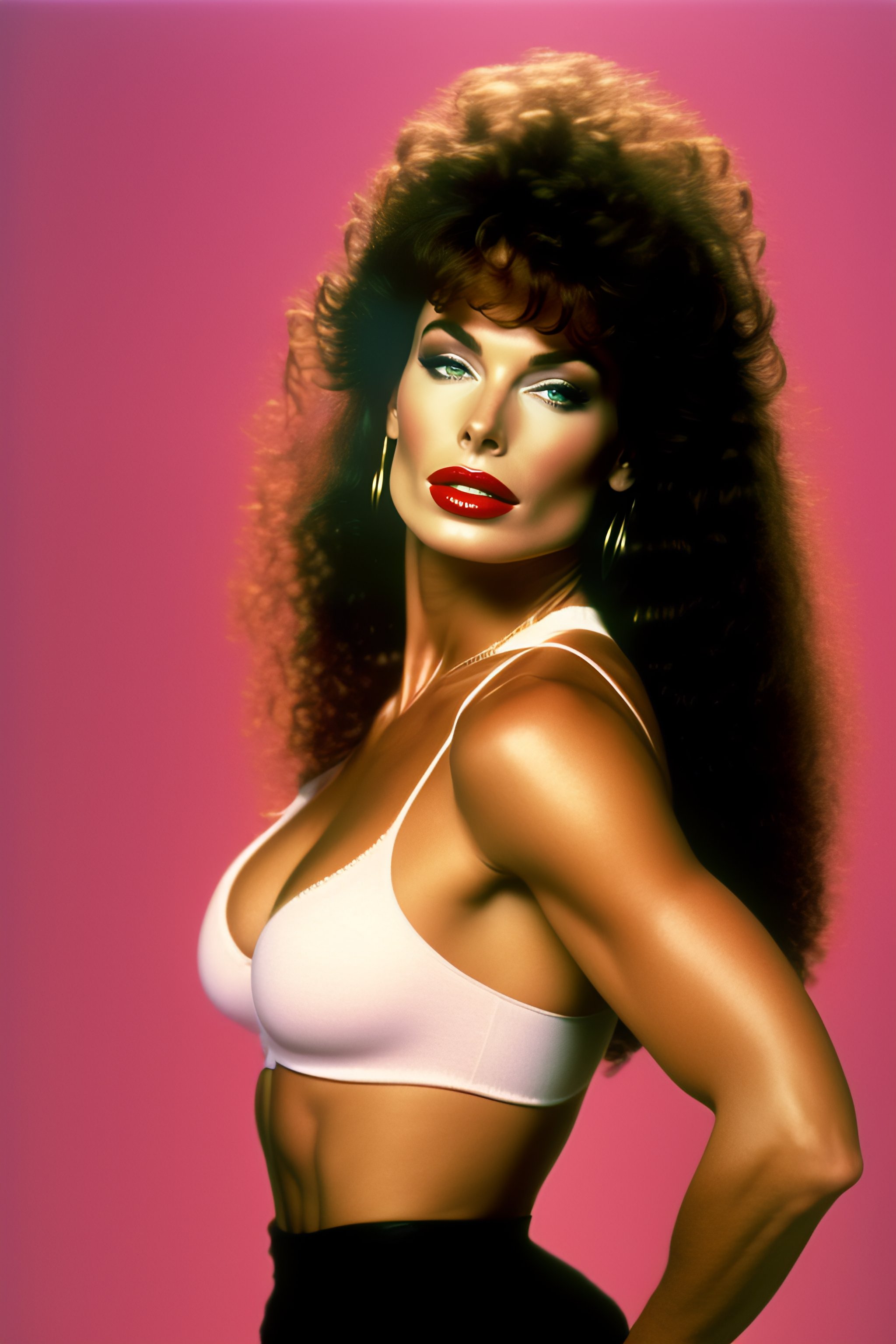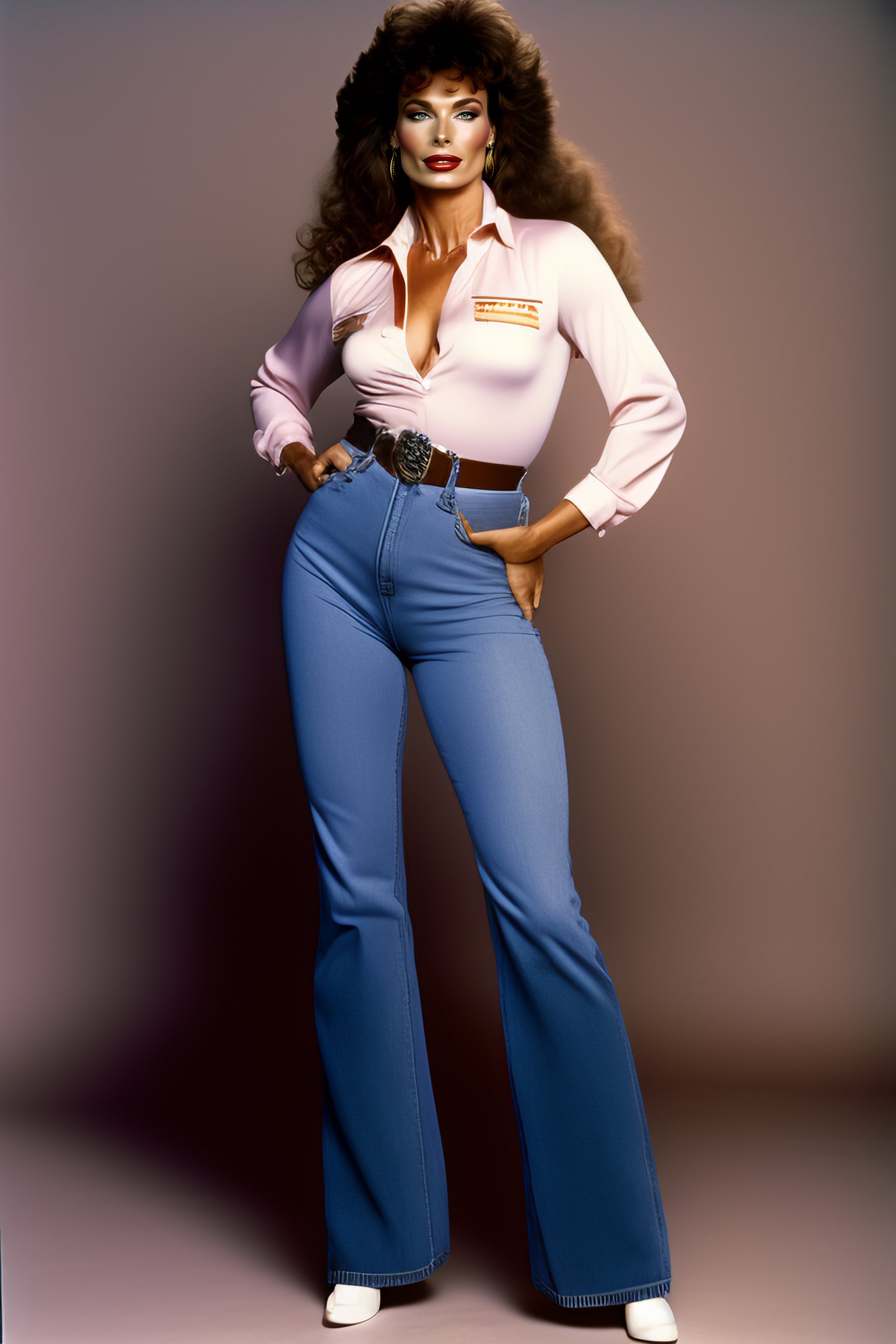 Kelly lebrock, 1980 catalog, athletic body, pretty face big lips, mom jeans, straight thick hair, studio shoot plain background