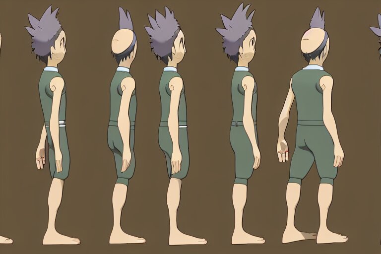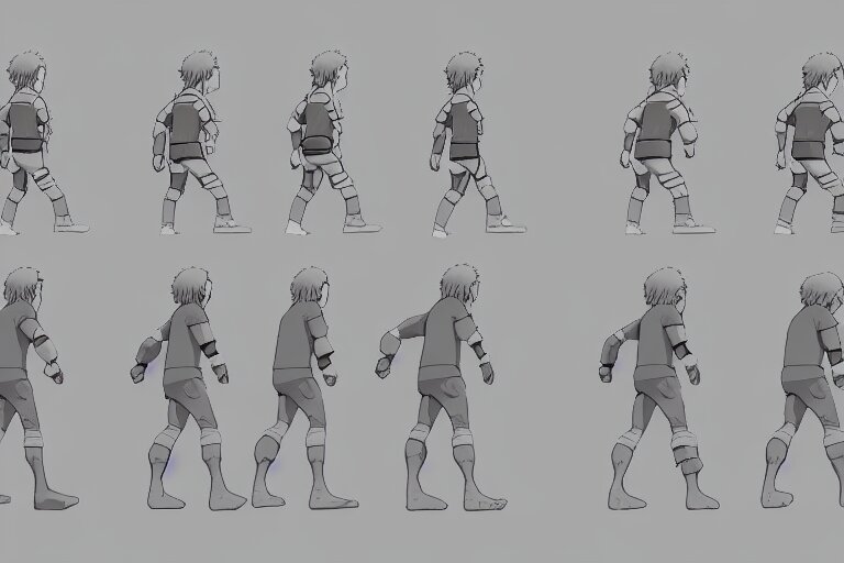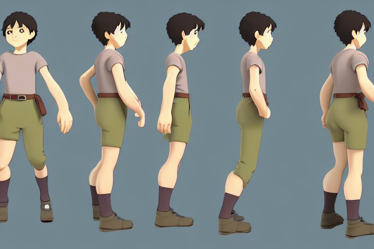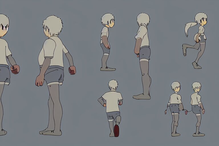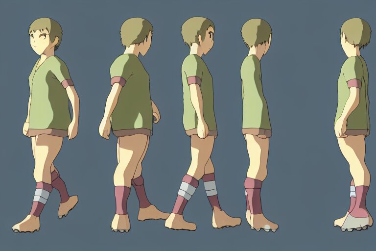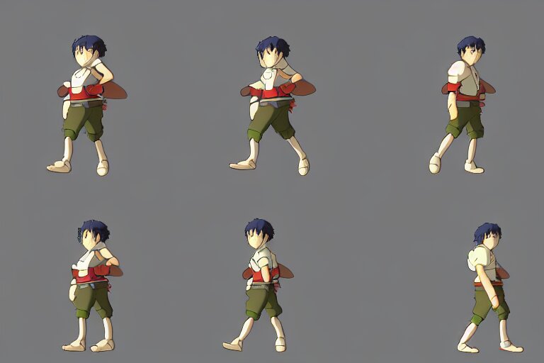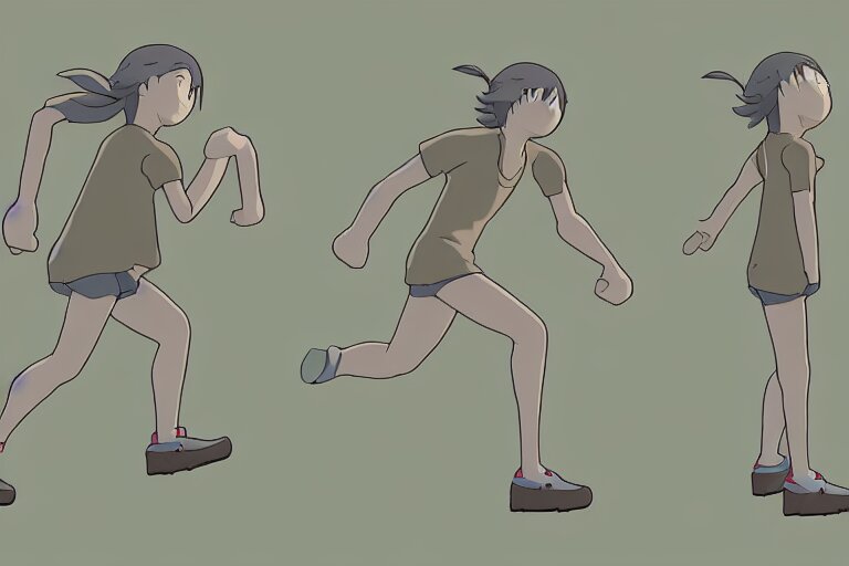 A reference sheet containing of a hero running by ghibli studio, front back view and side view, proportions, sprite sheet, running cycle, ready to model