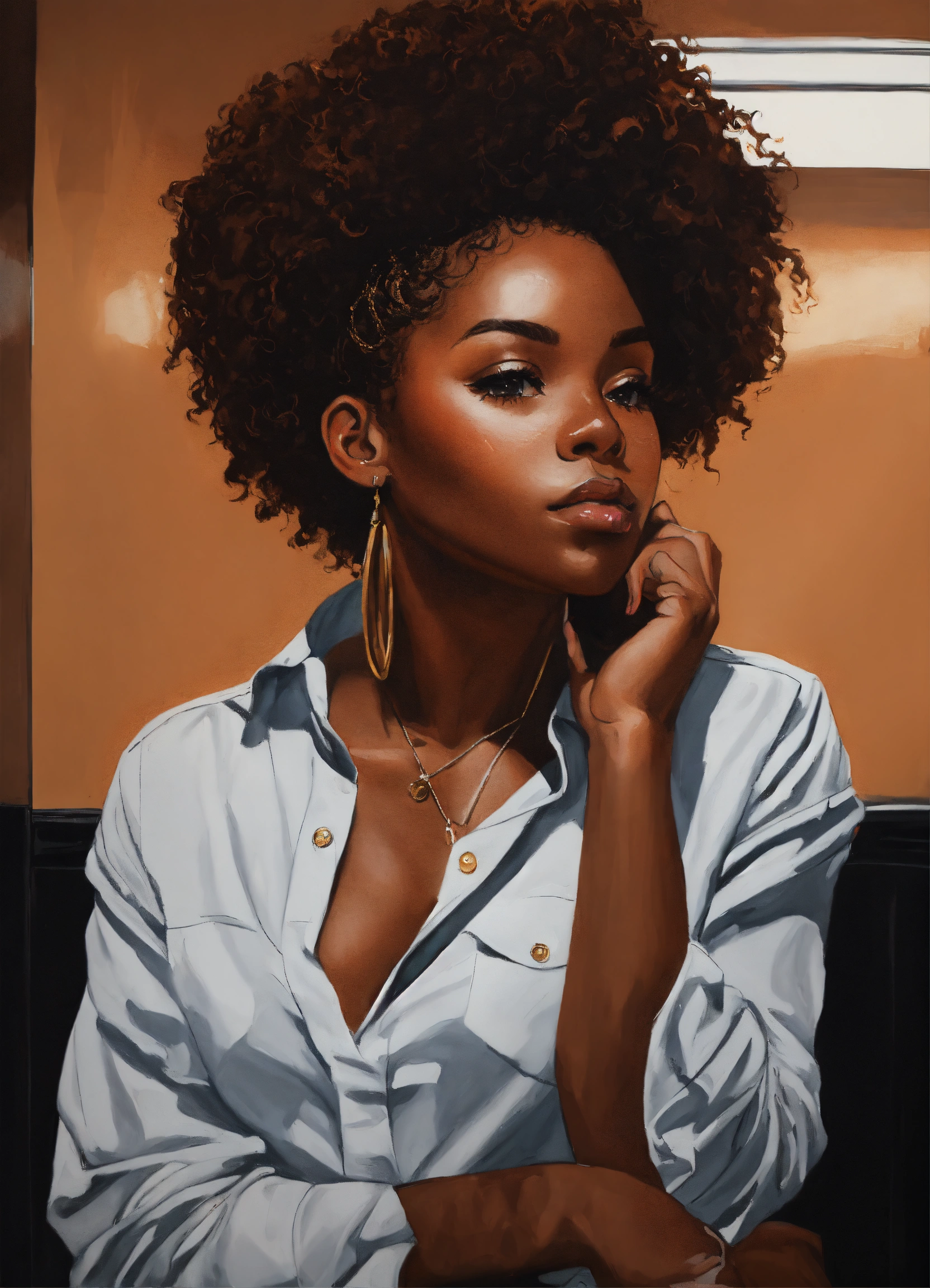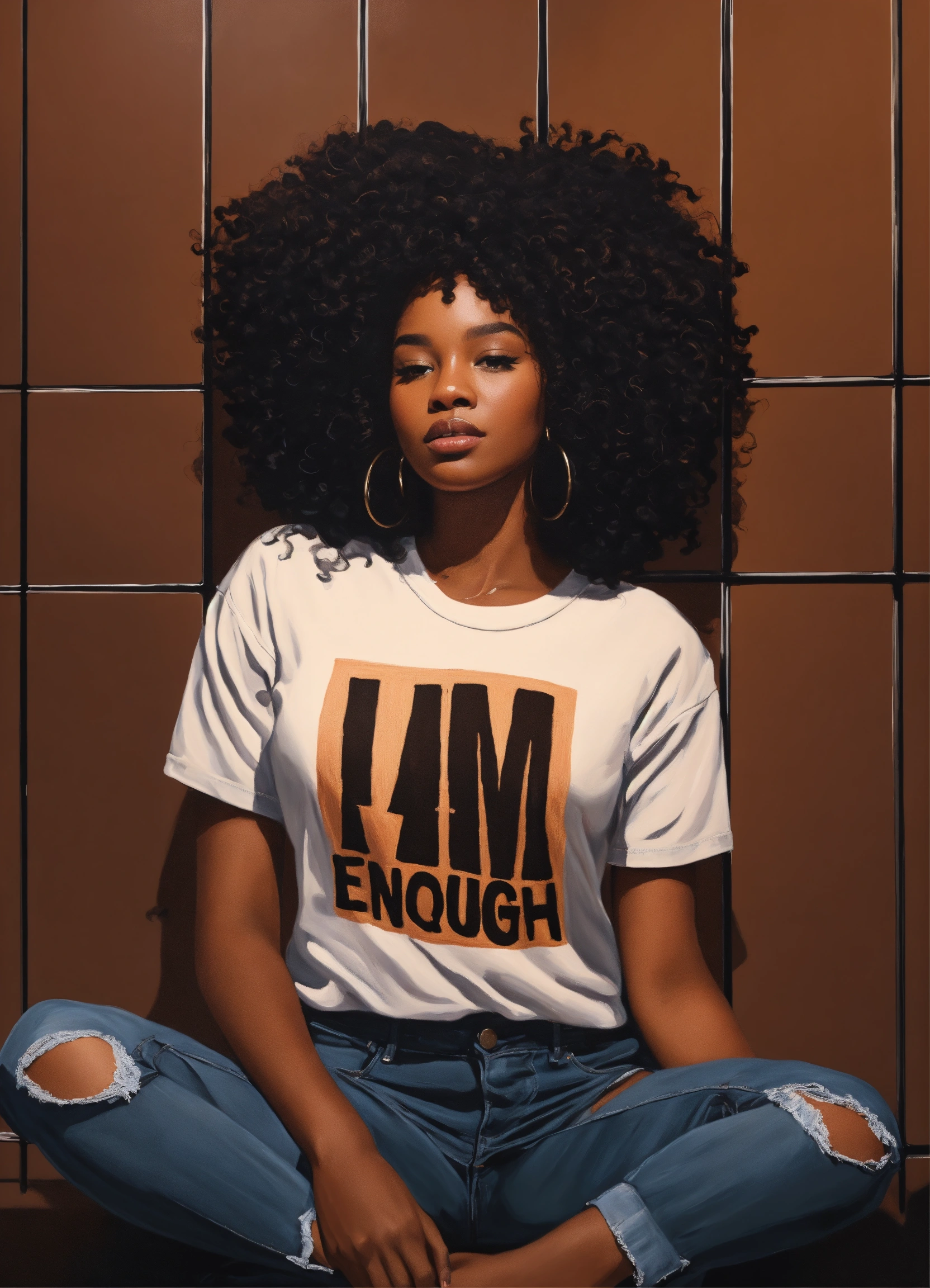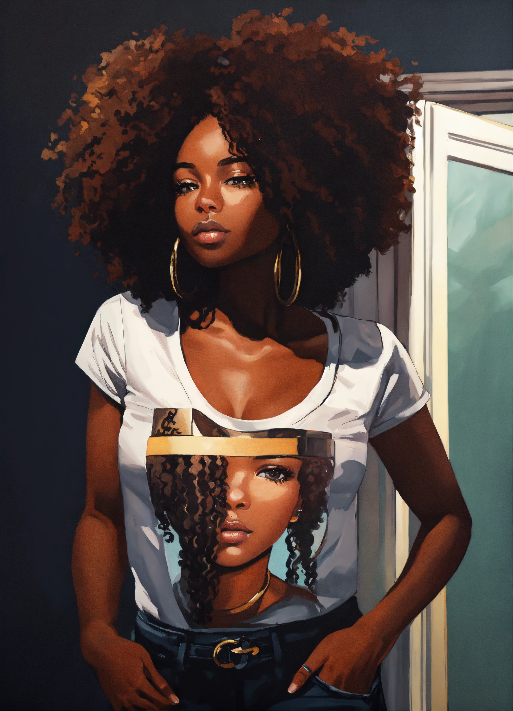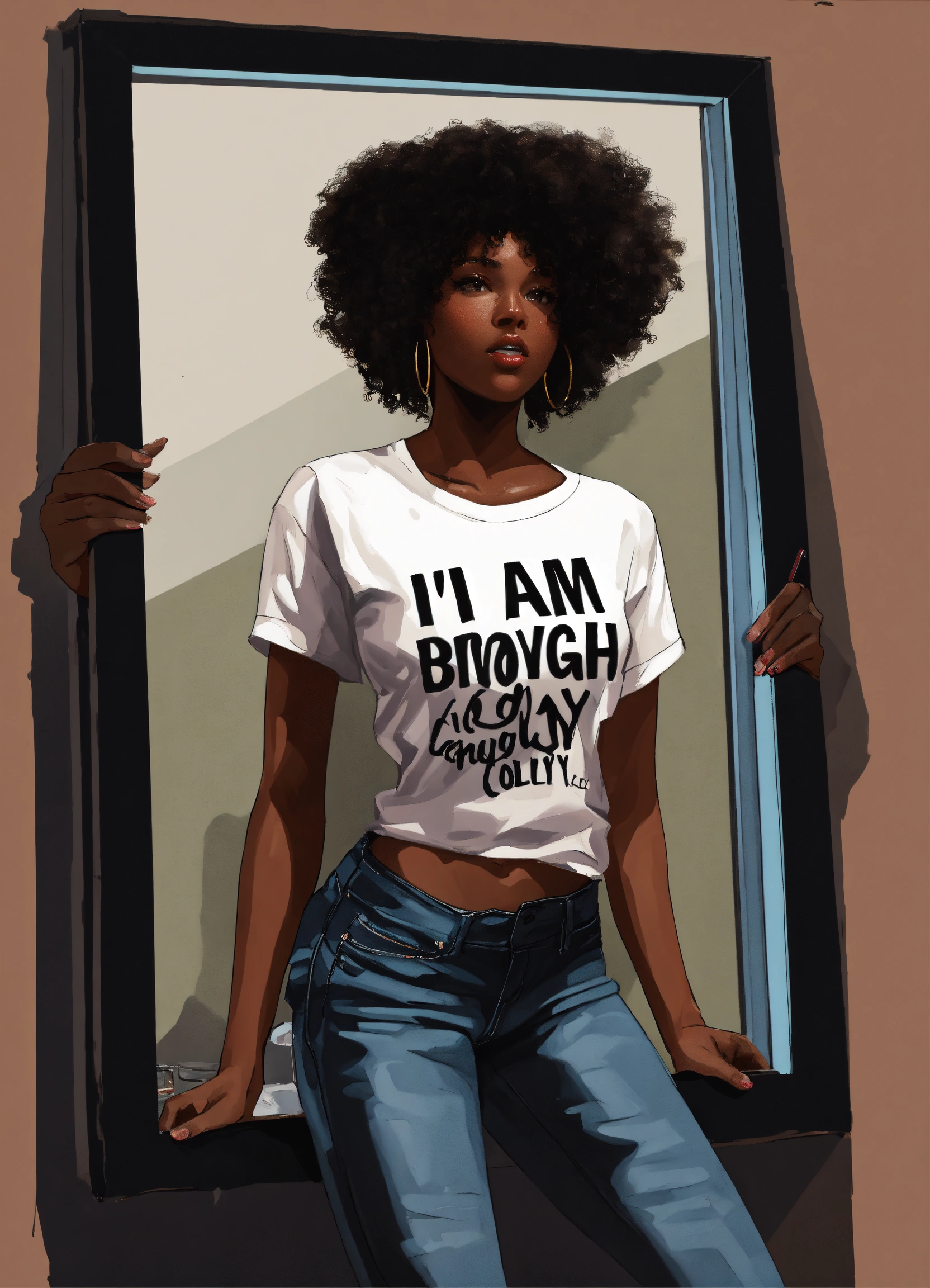 Laquirah greene prompt a realistic acrylic painting, 5d, flat vector faceless illustration, extreme close, urban brown skin woman, standing in the mirror adoring her kinky coily hair, flat black background, flat white background . her shirt say " i am enough"