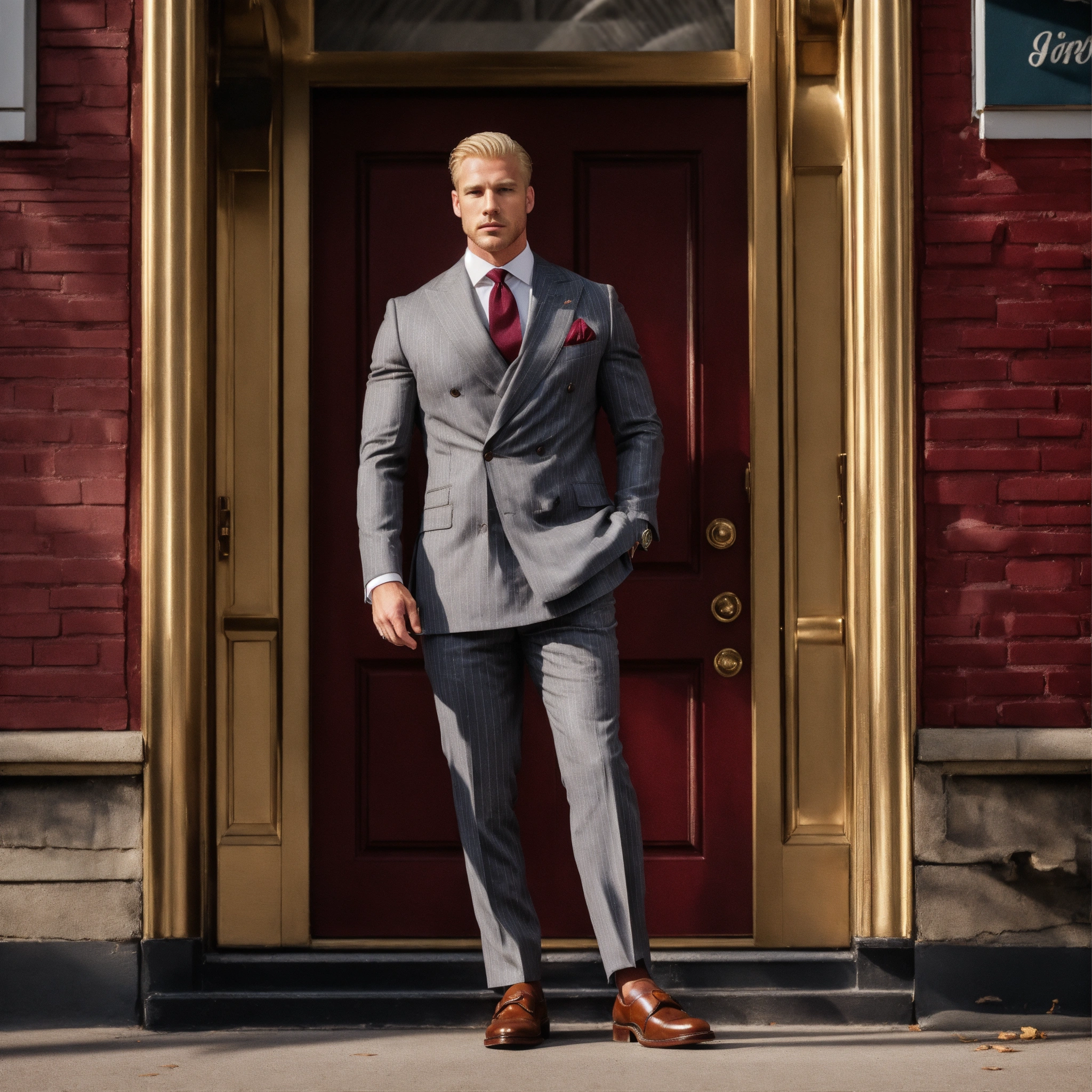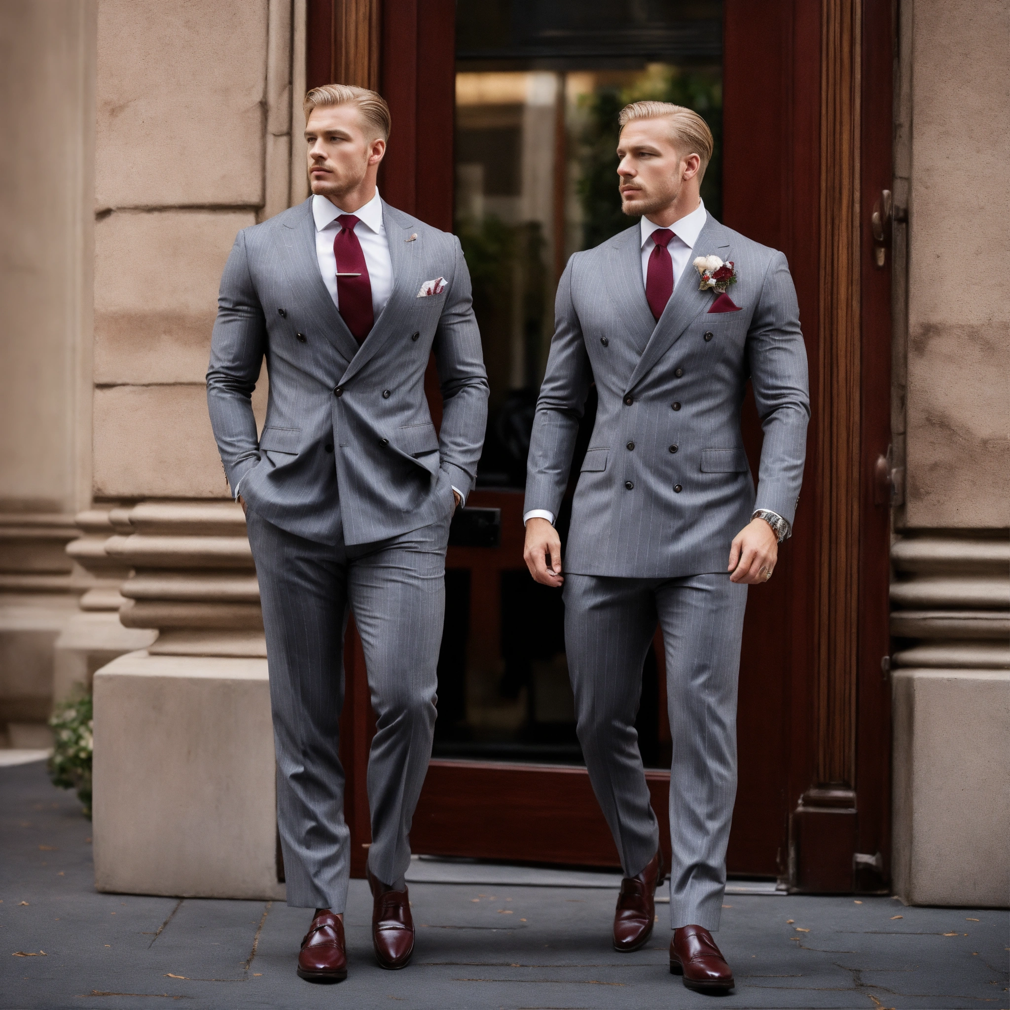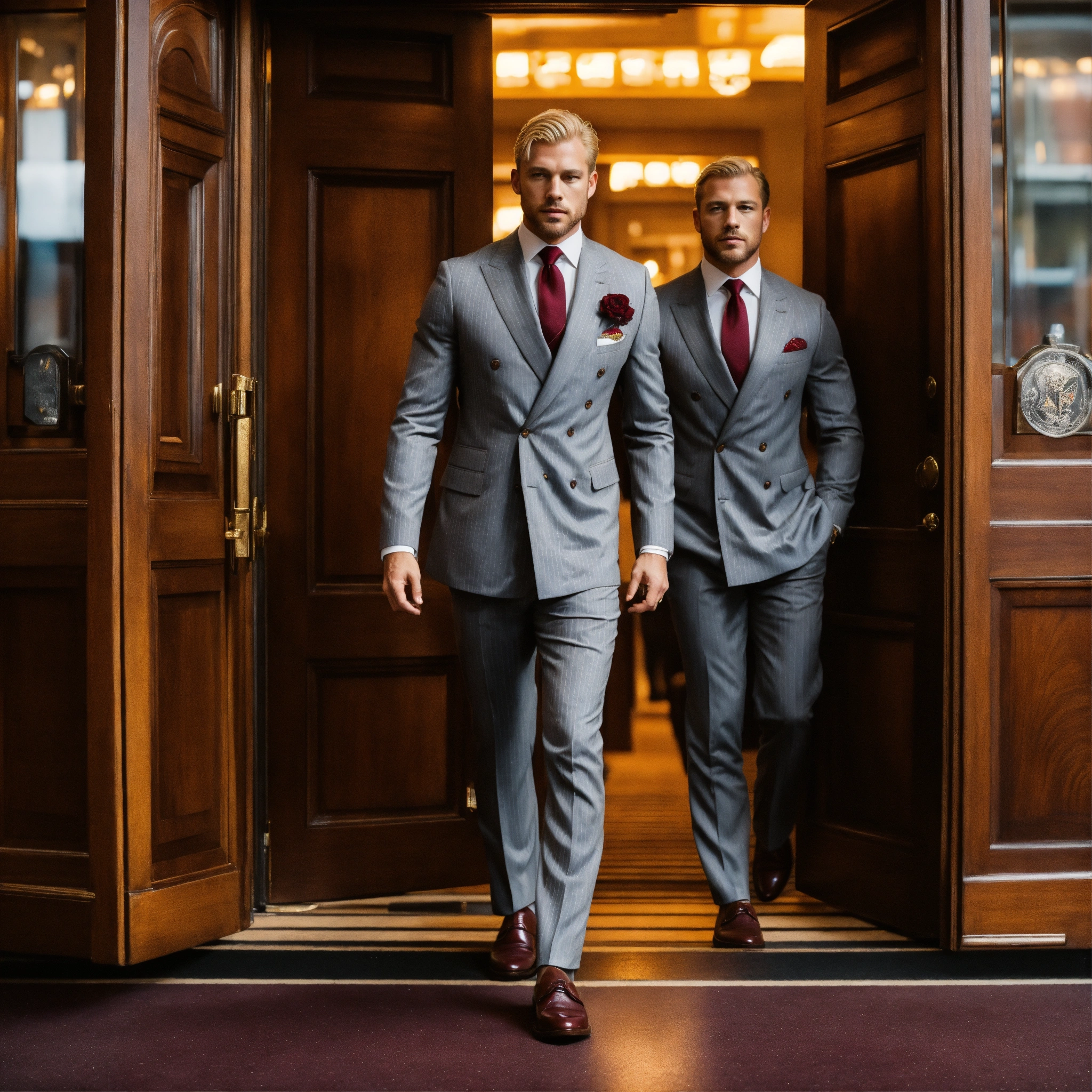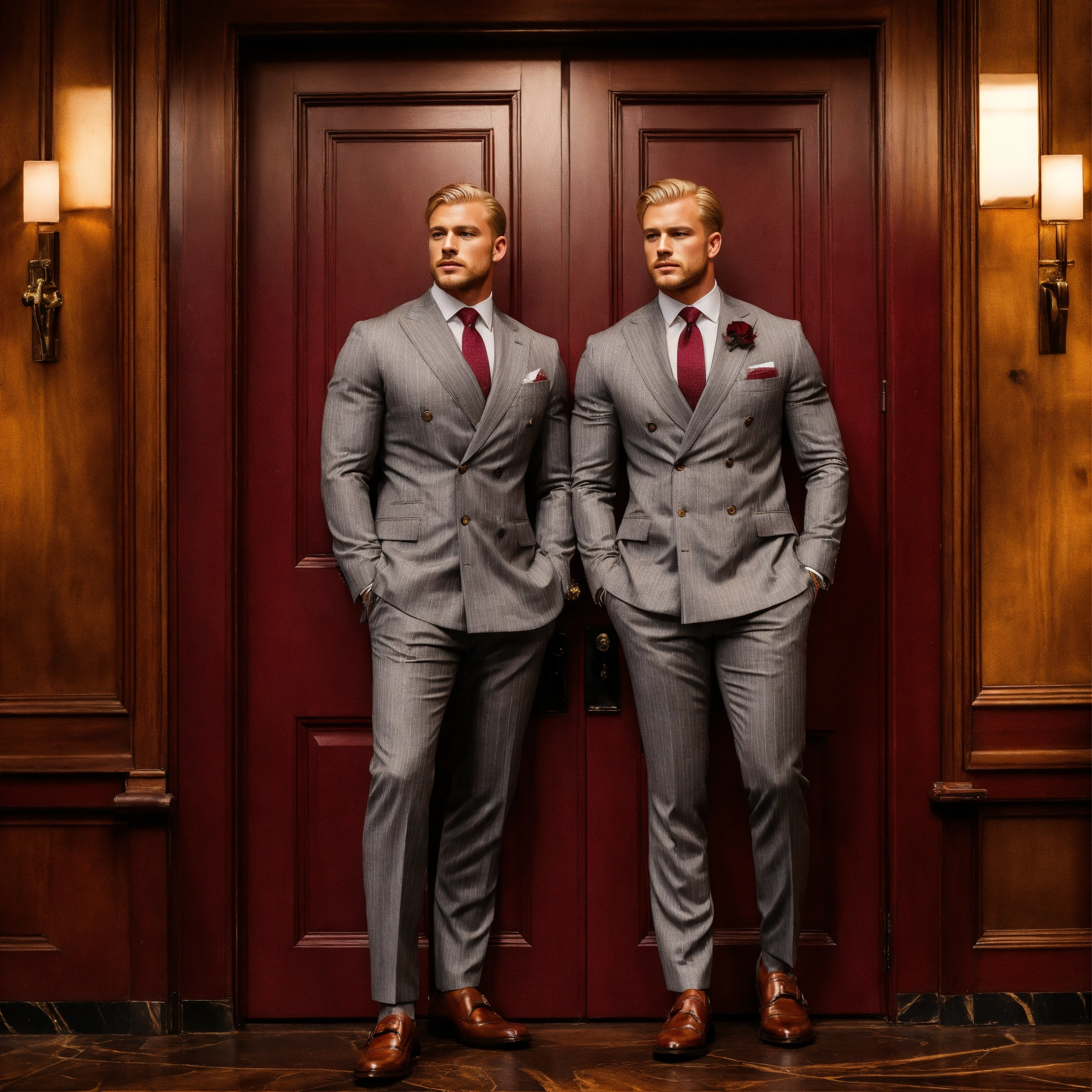 Two muscled blonde gentlemen, in grey pinstripe double breasted suit, burgundy club tie, brown monkstrap shoes, guarding the boss's door
