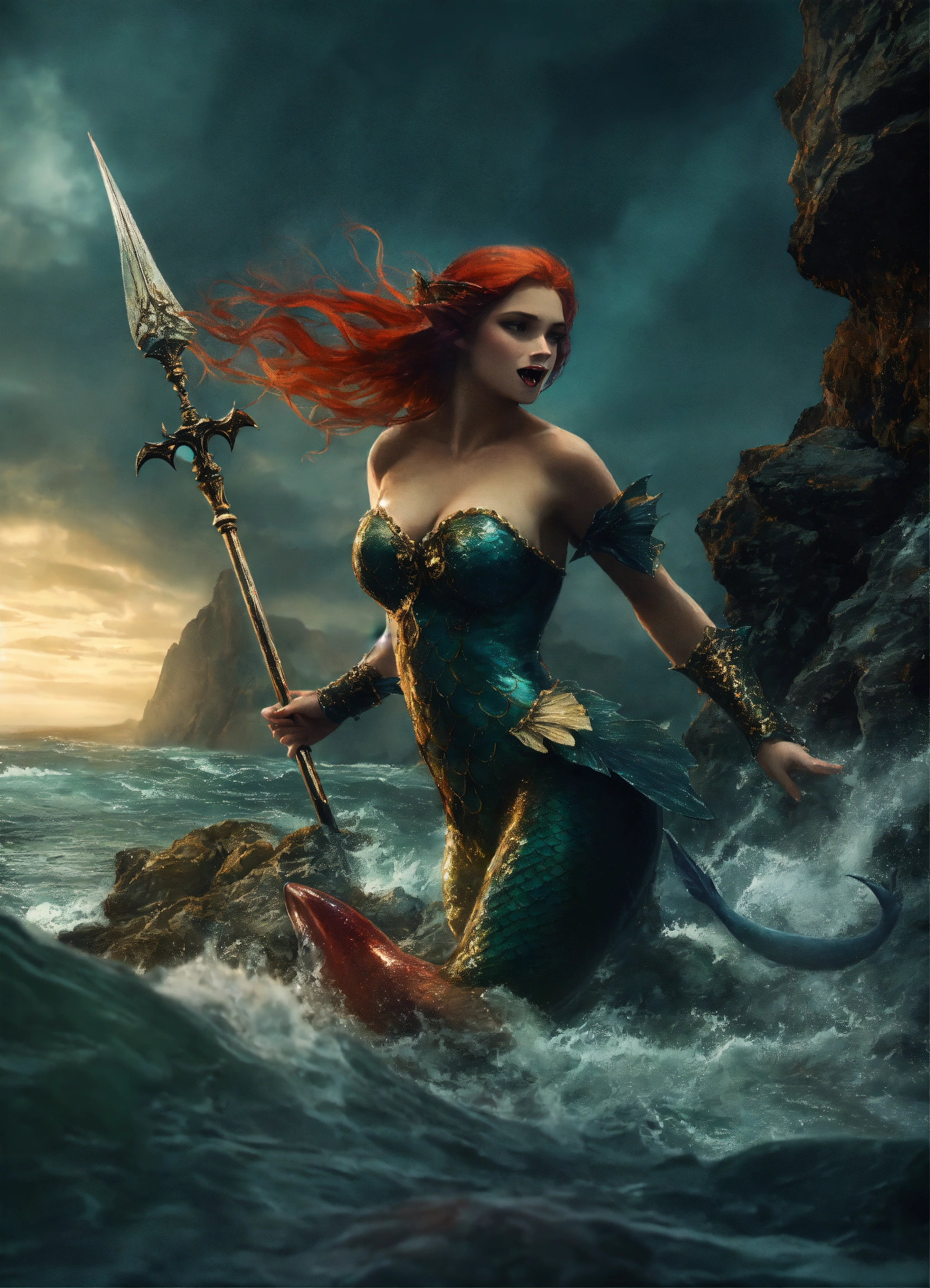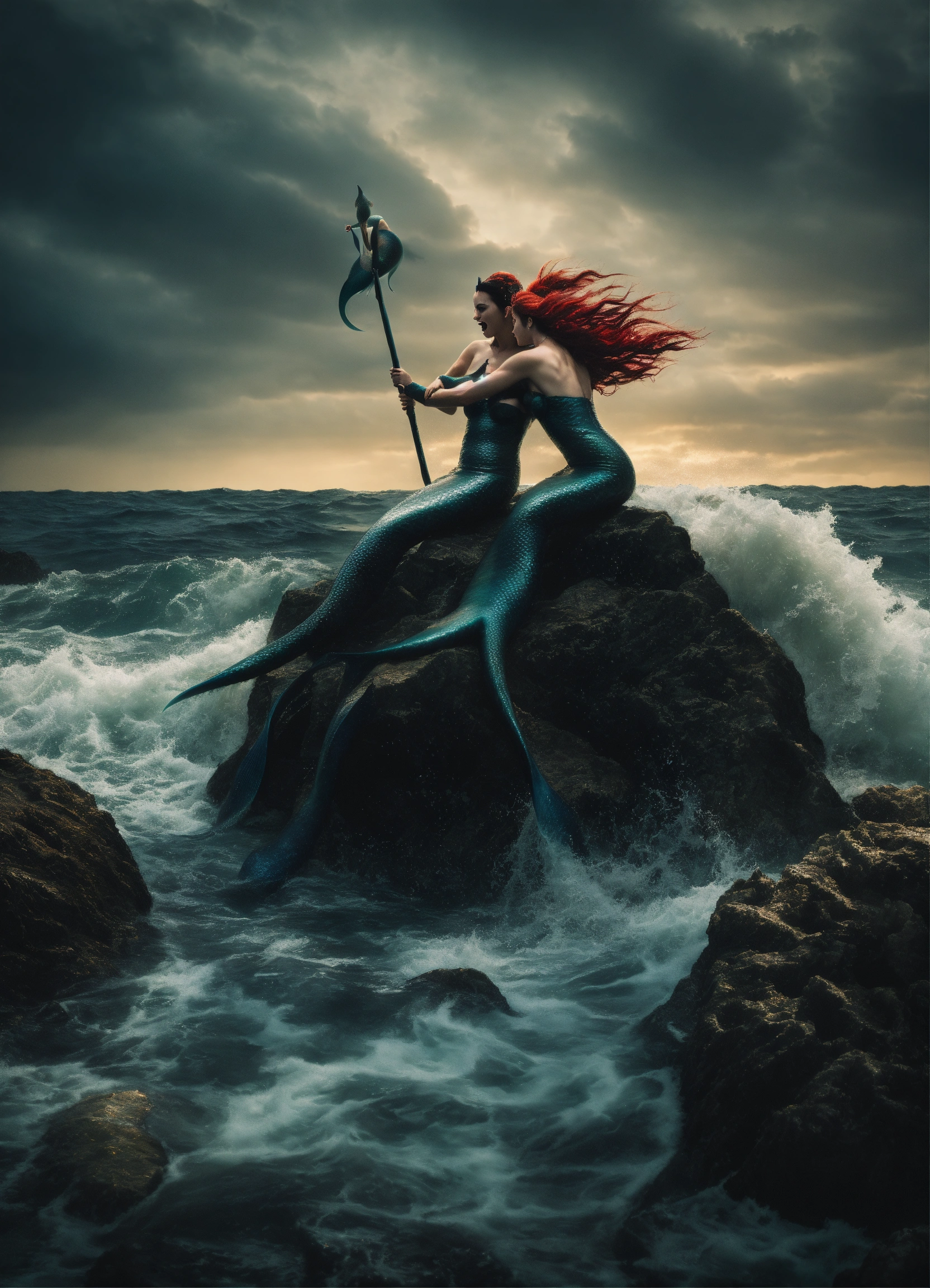 Create a 4k detailed photo of two evil (mermaids) fighting with each other, dramatic lighting, vampire fangs, in the sea by a rocky coast, style of nicolas de crecy