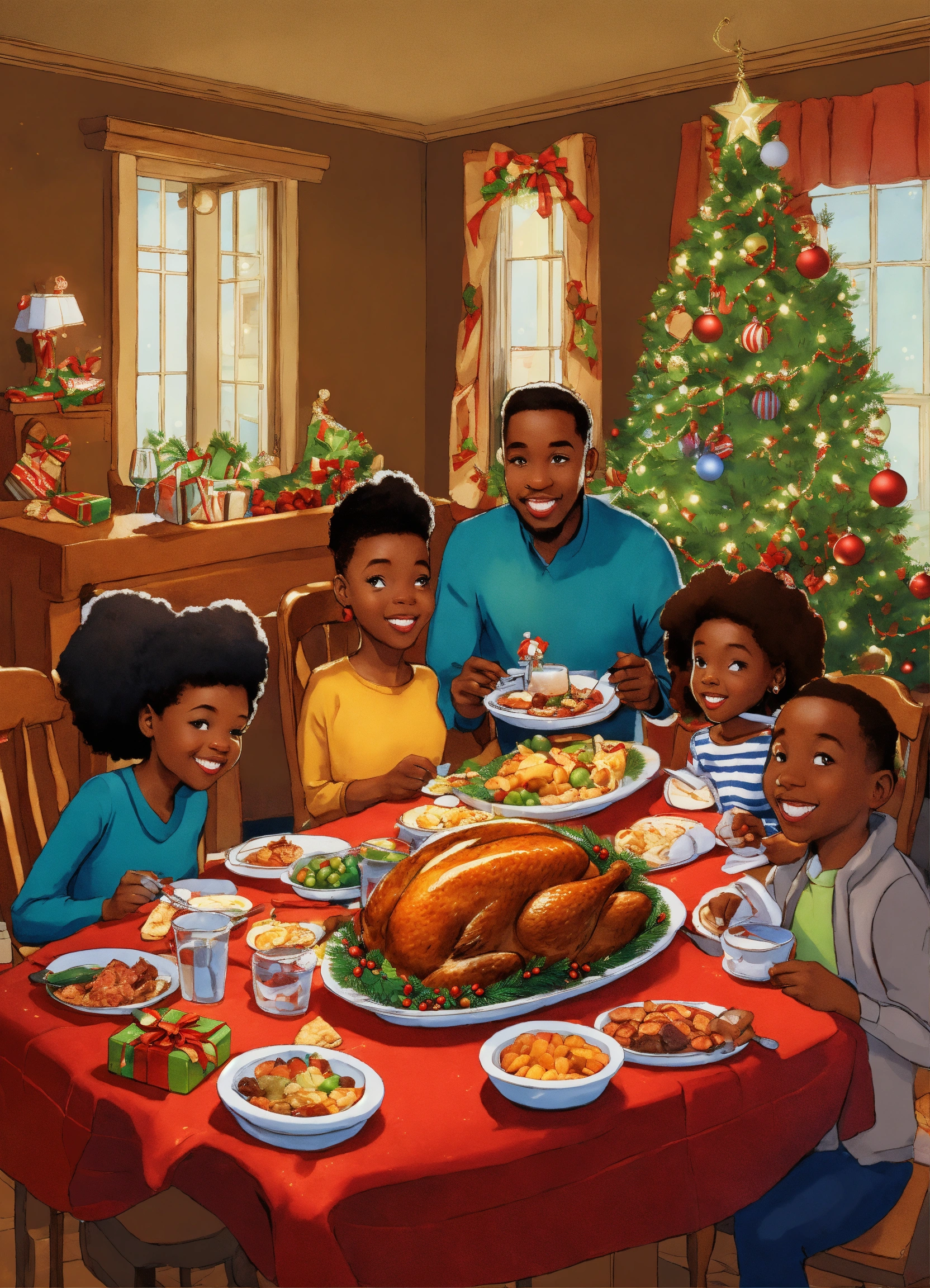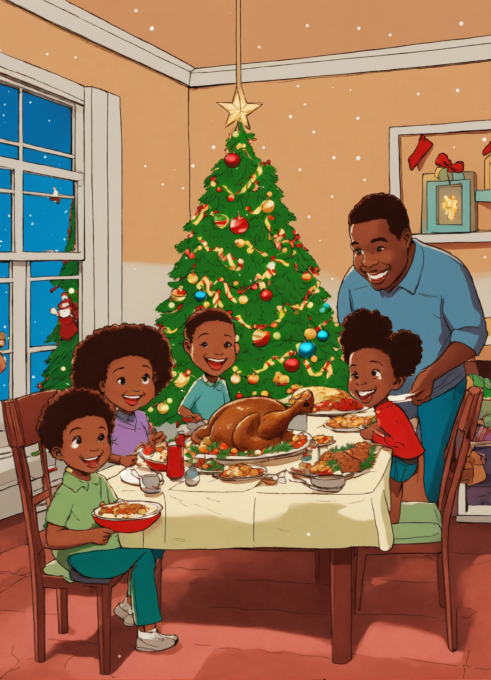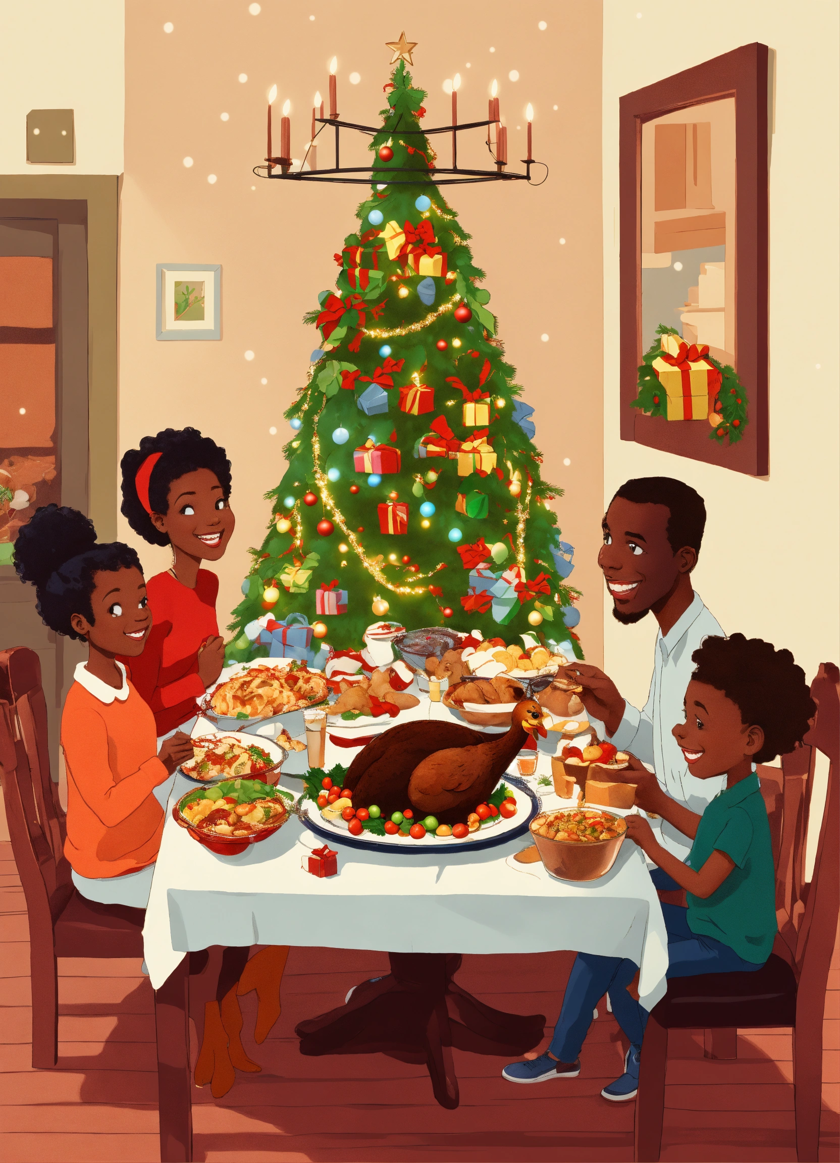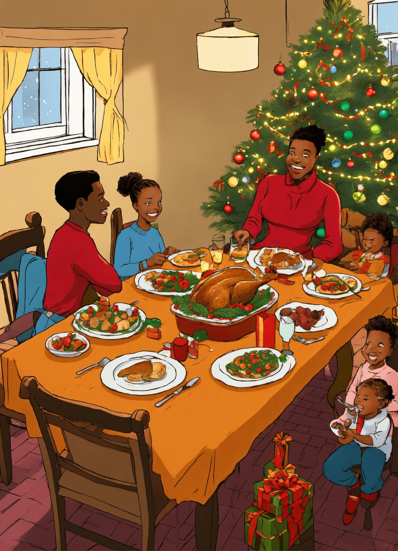 Cartoon of black family eating at christmas time, decorated with christmas tree and lots of presents and a turkey on the dinner table
