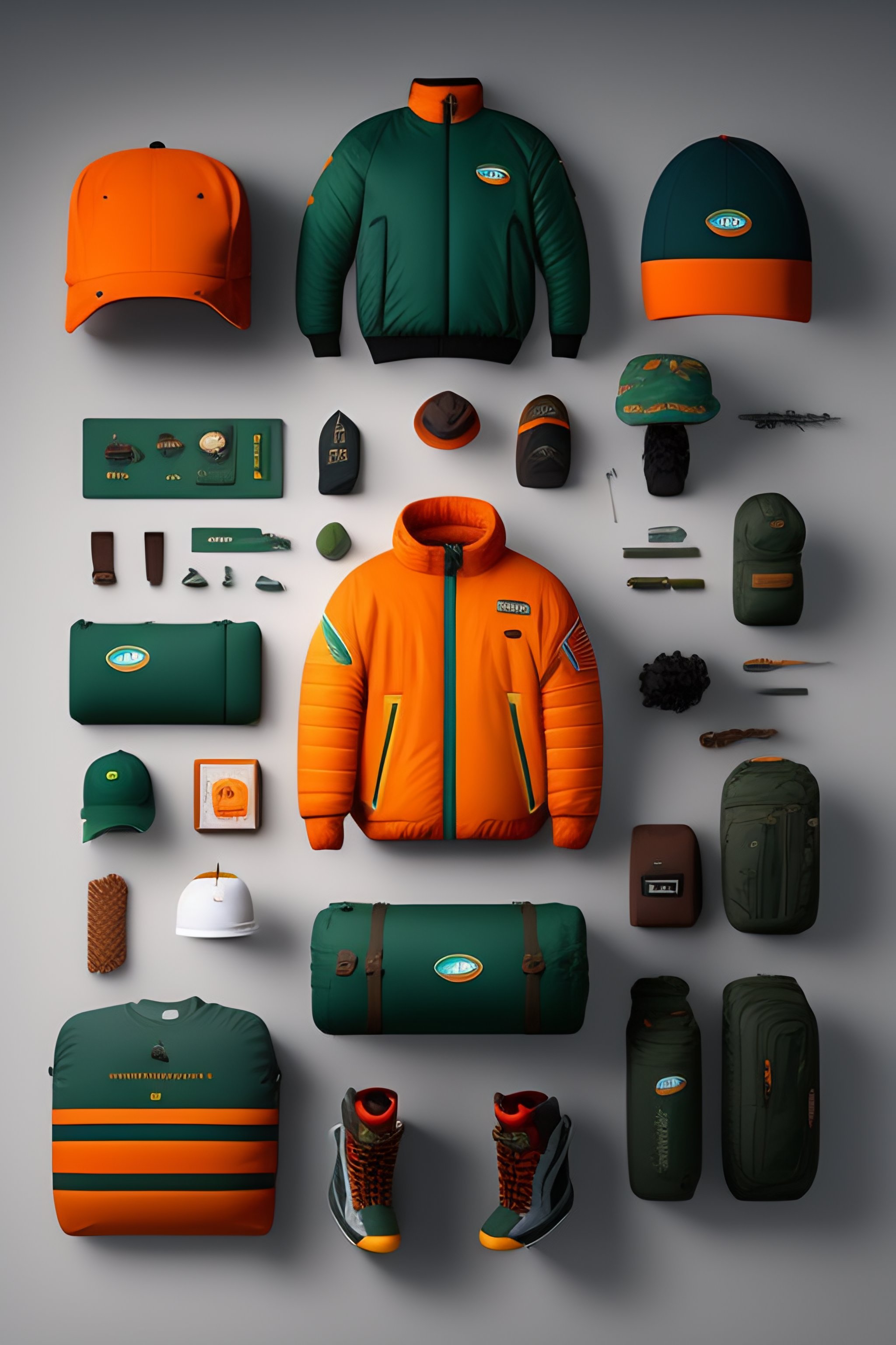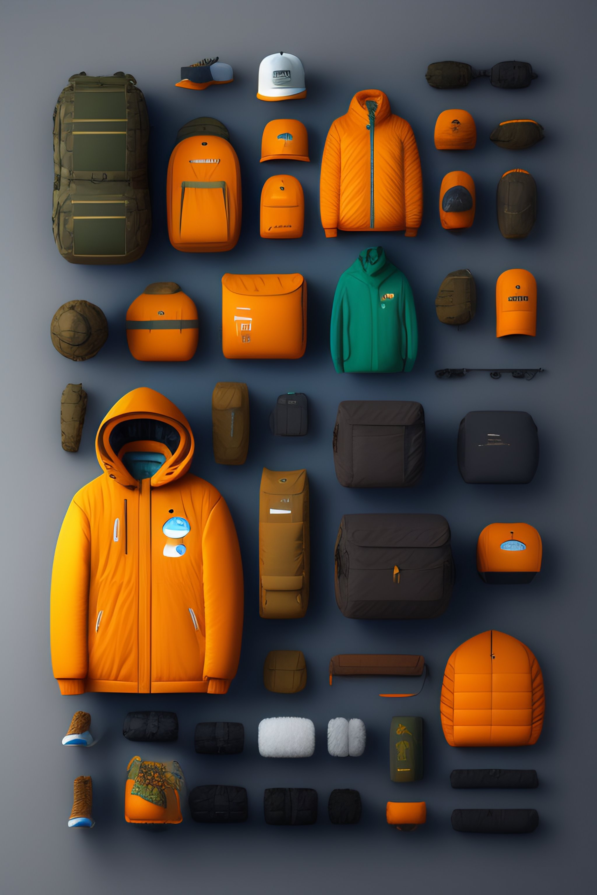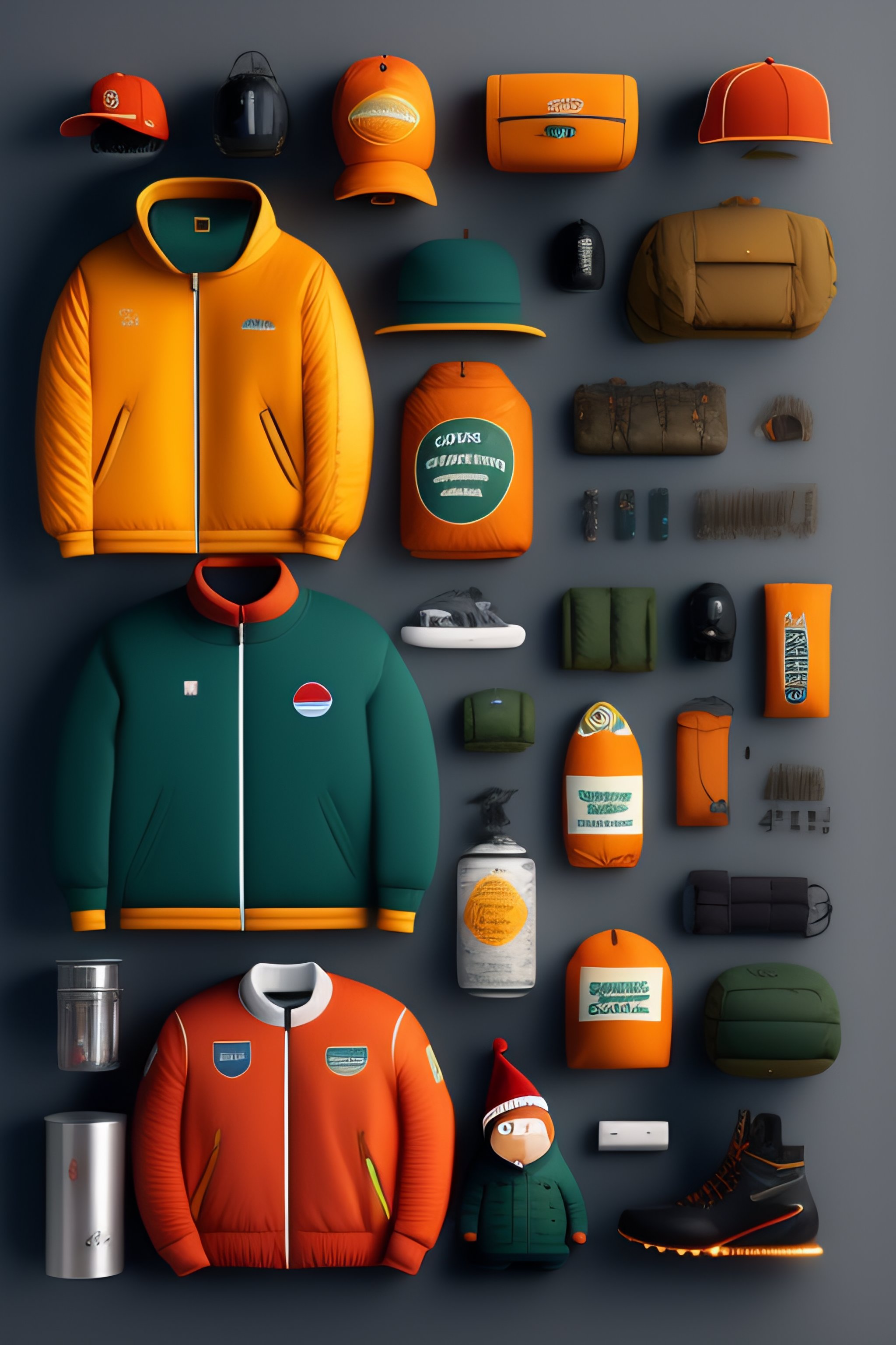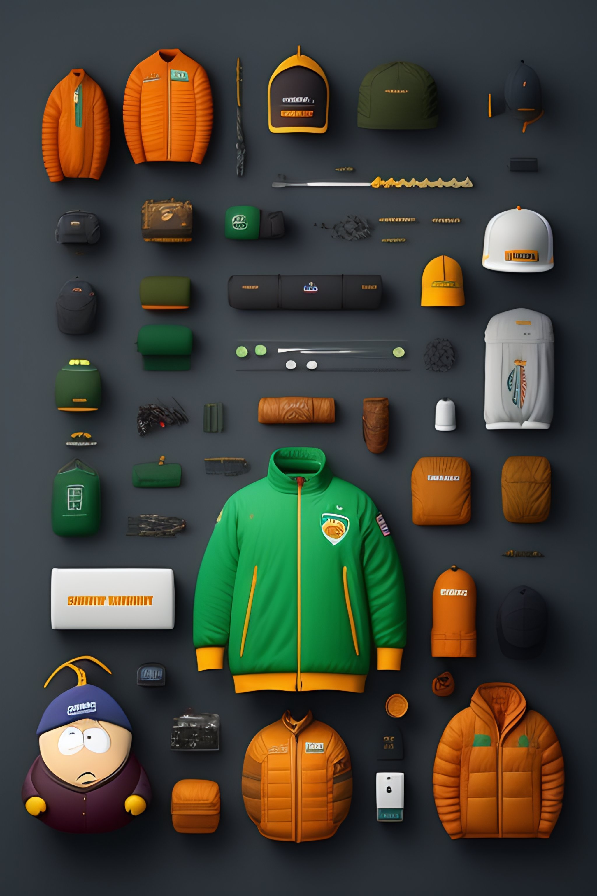 South park character gear, costumes and props, knolling, knolling layout, deconstruction, highly detailed, depth, many parts, lumen render, 8k