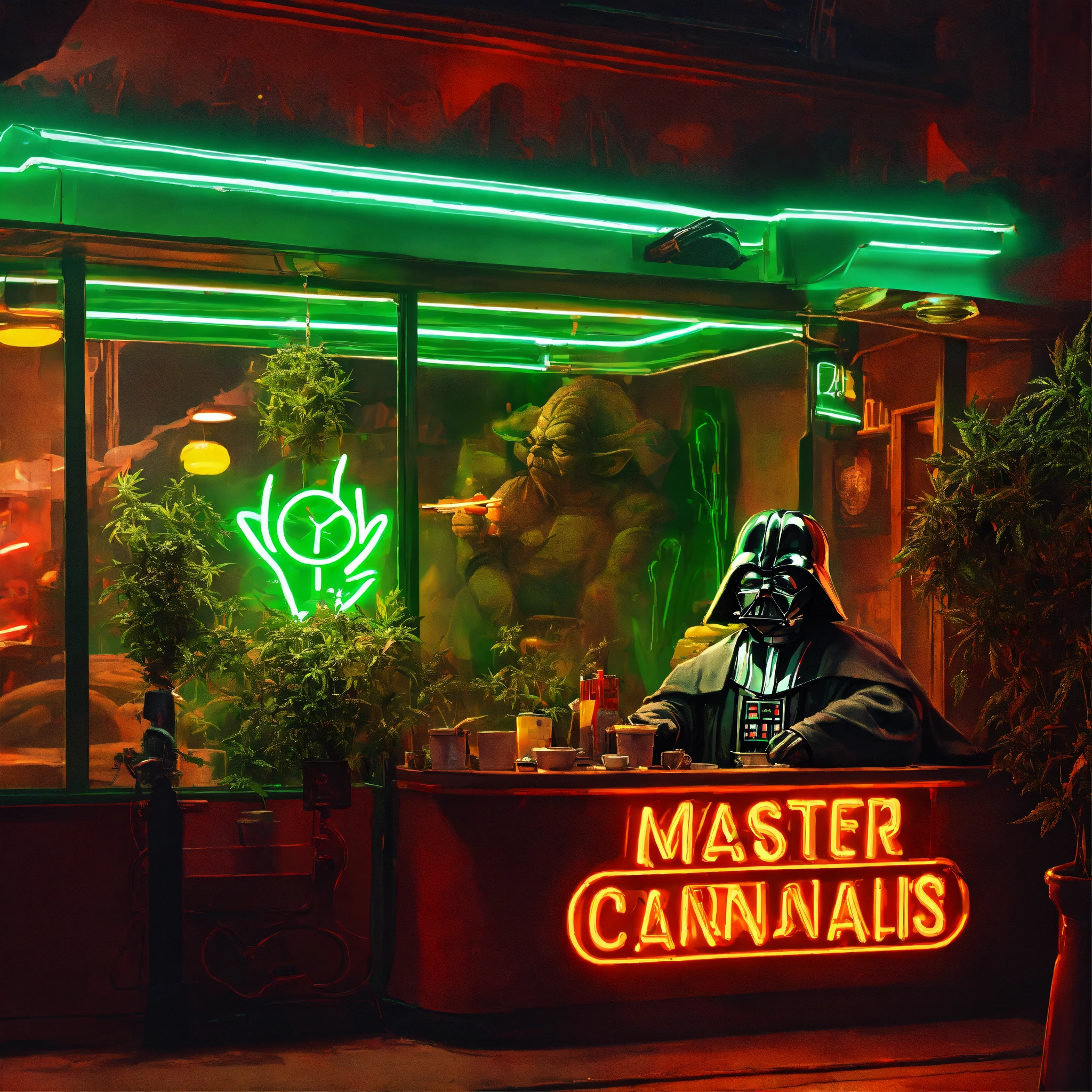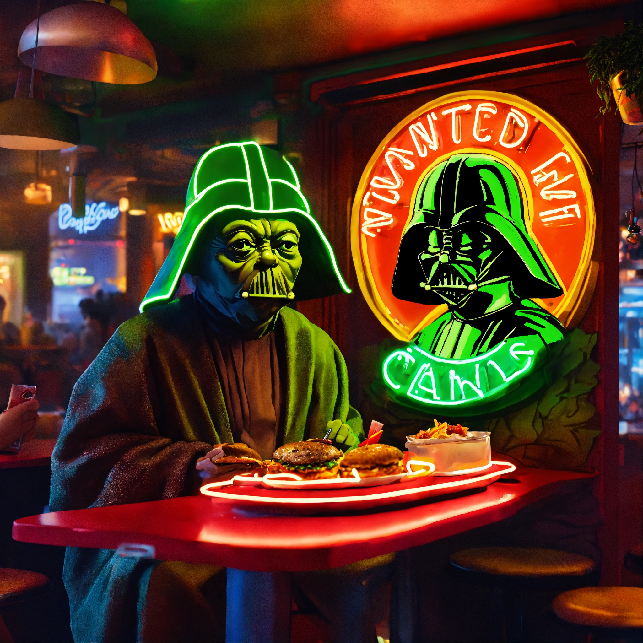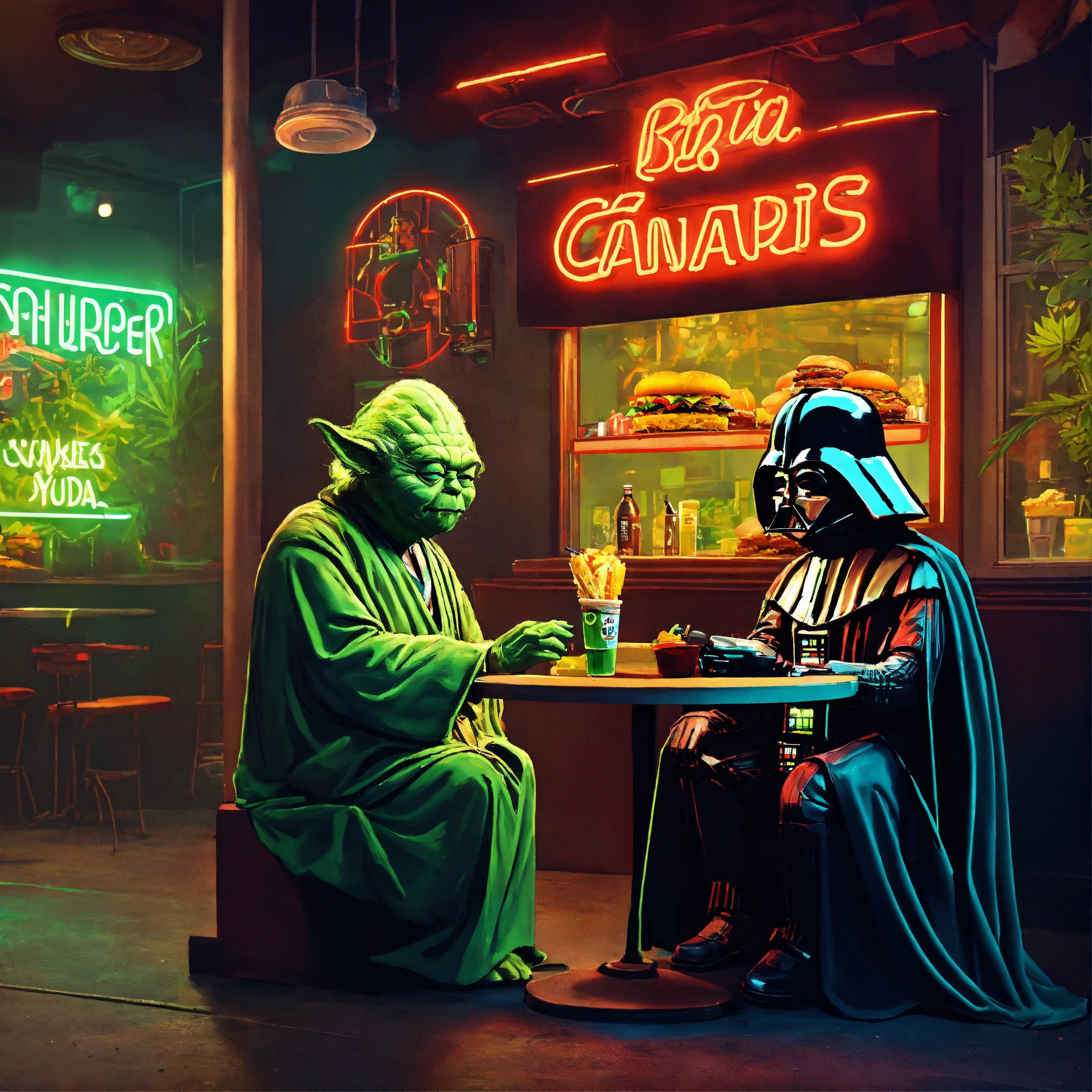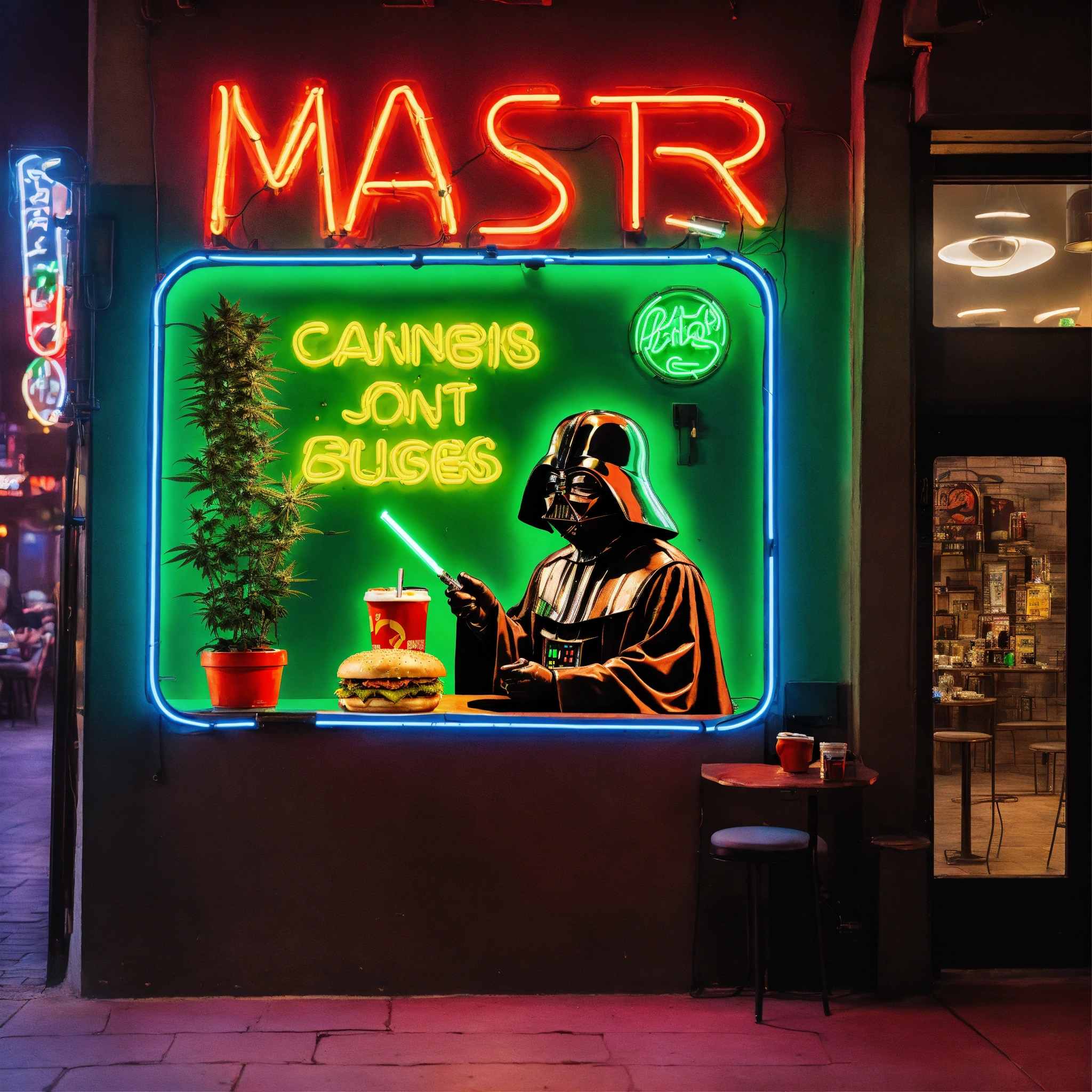A rounded neon sign with master yoda and darth vader smokes a big cannabis joint and eats a fine burger in a cafe on it