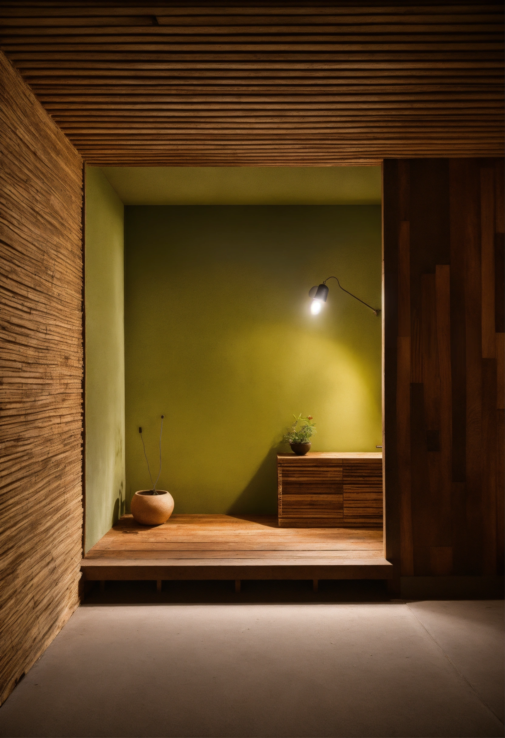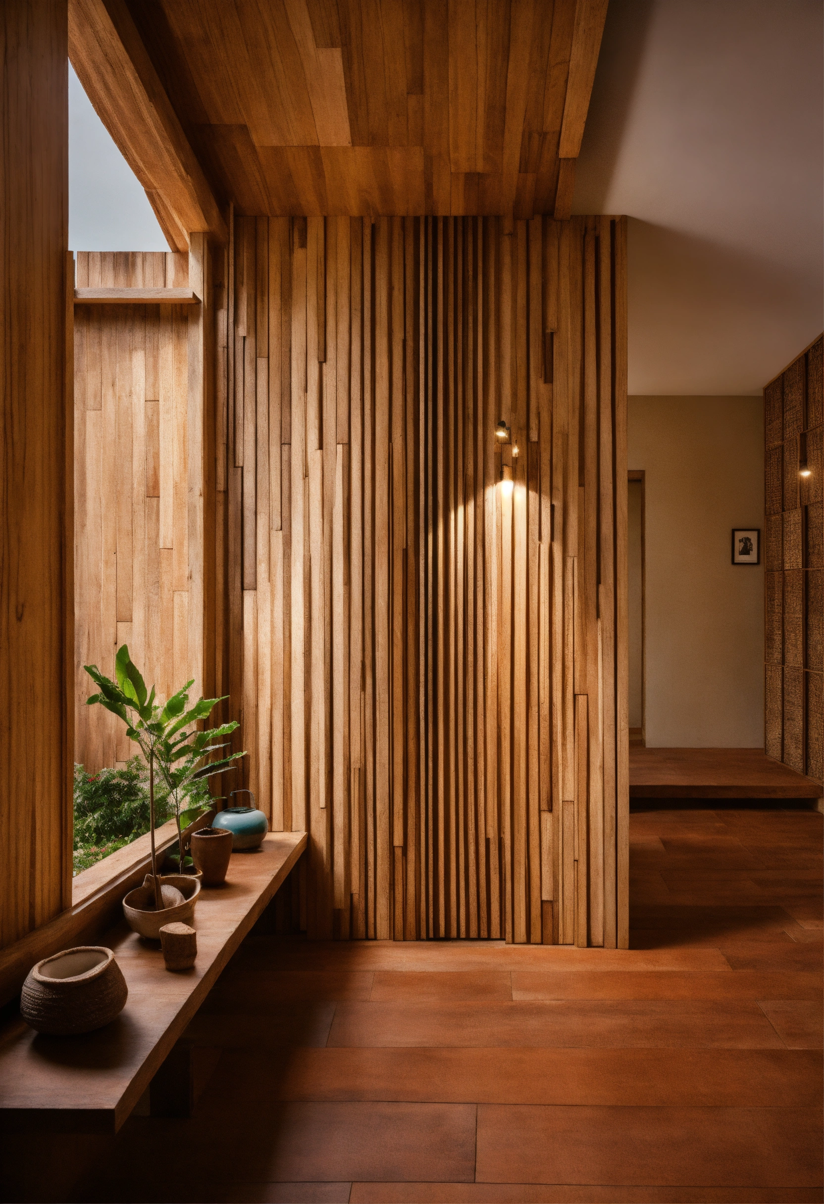 Imagen tipo fotográfica bien iluminada y realista de repisas de madera en la pared una casa con arquitectura yucateca combinada antigua con moderna, en estilo macro