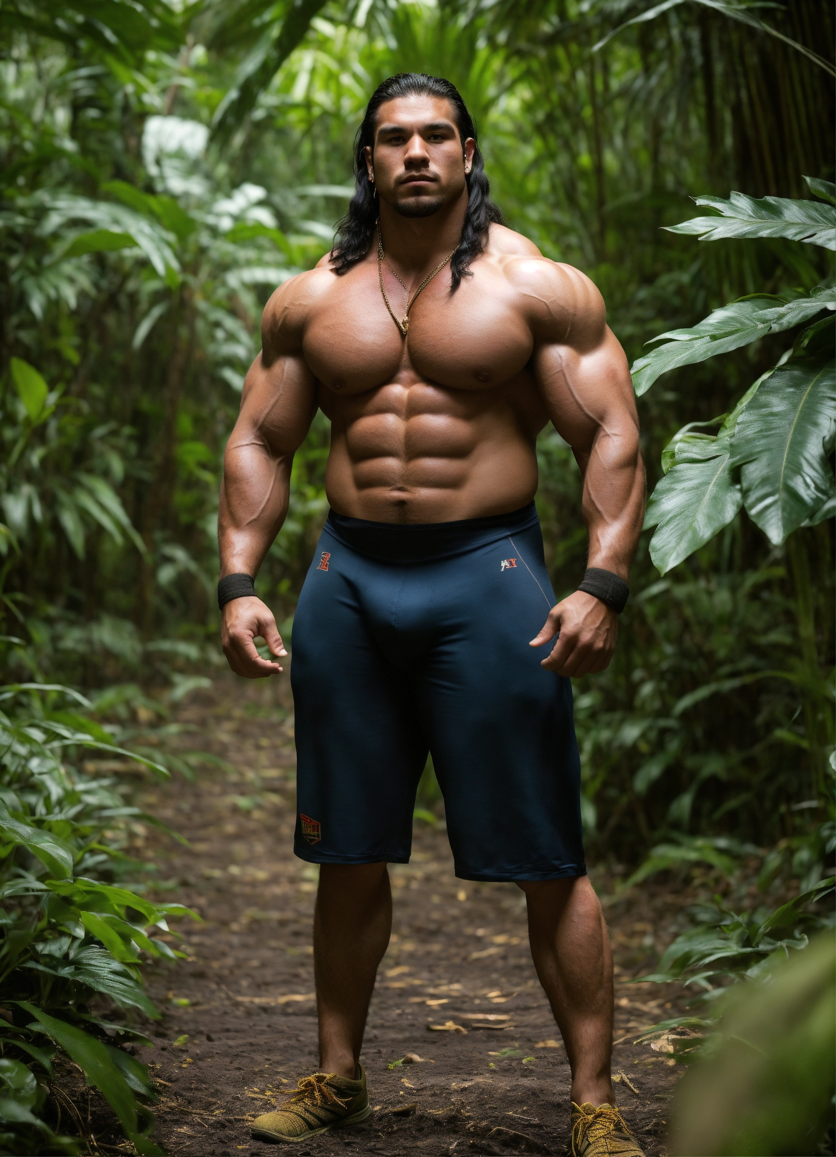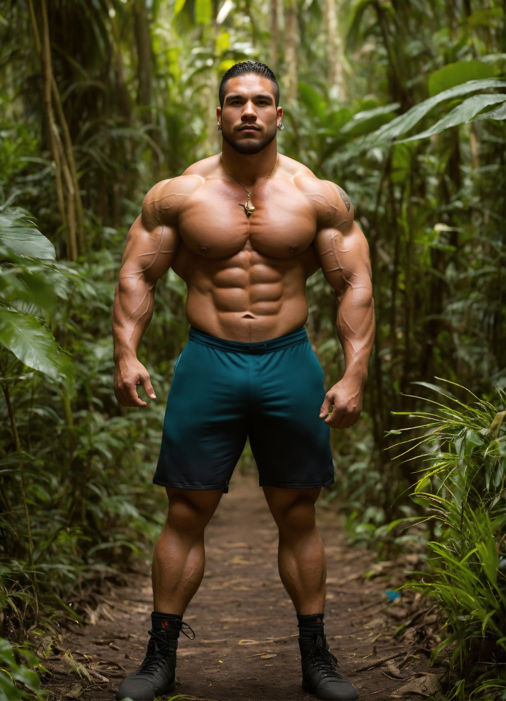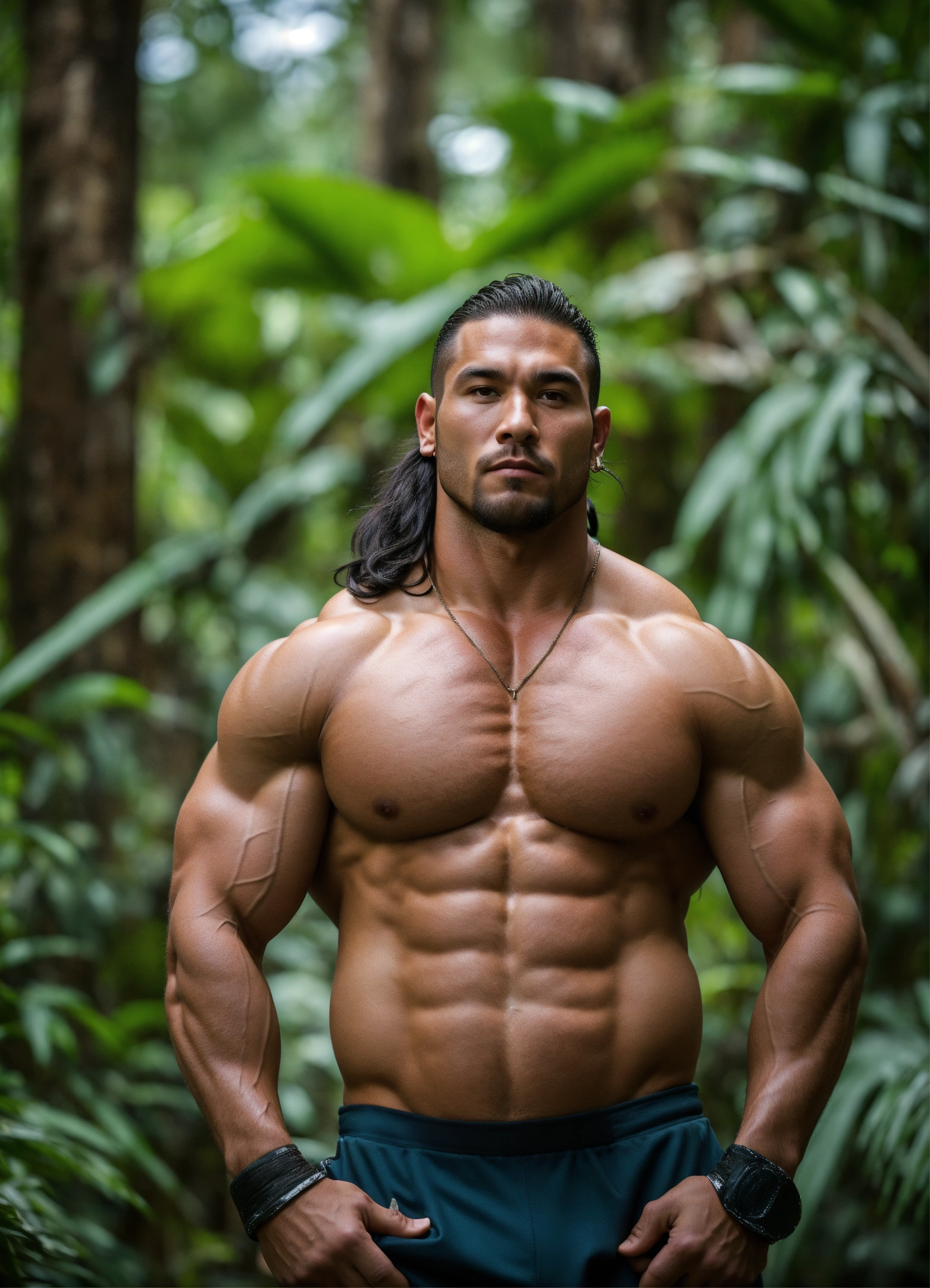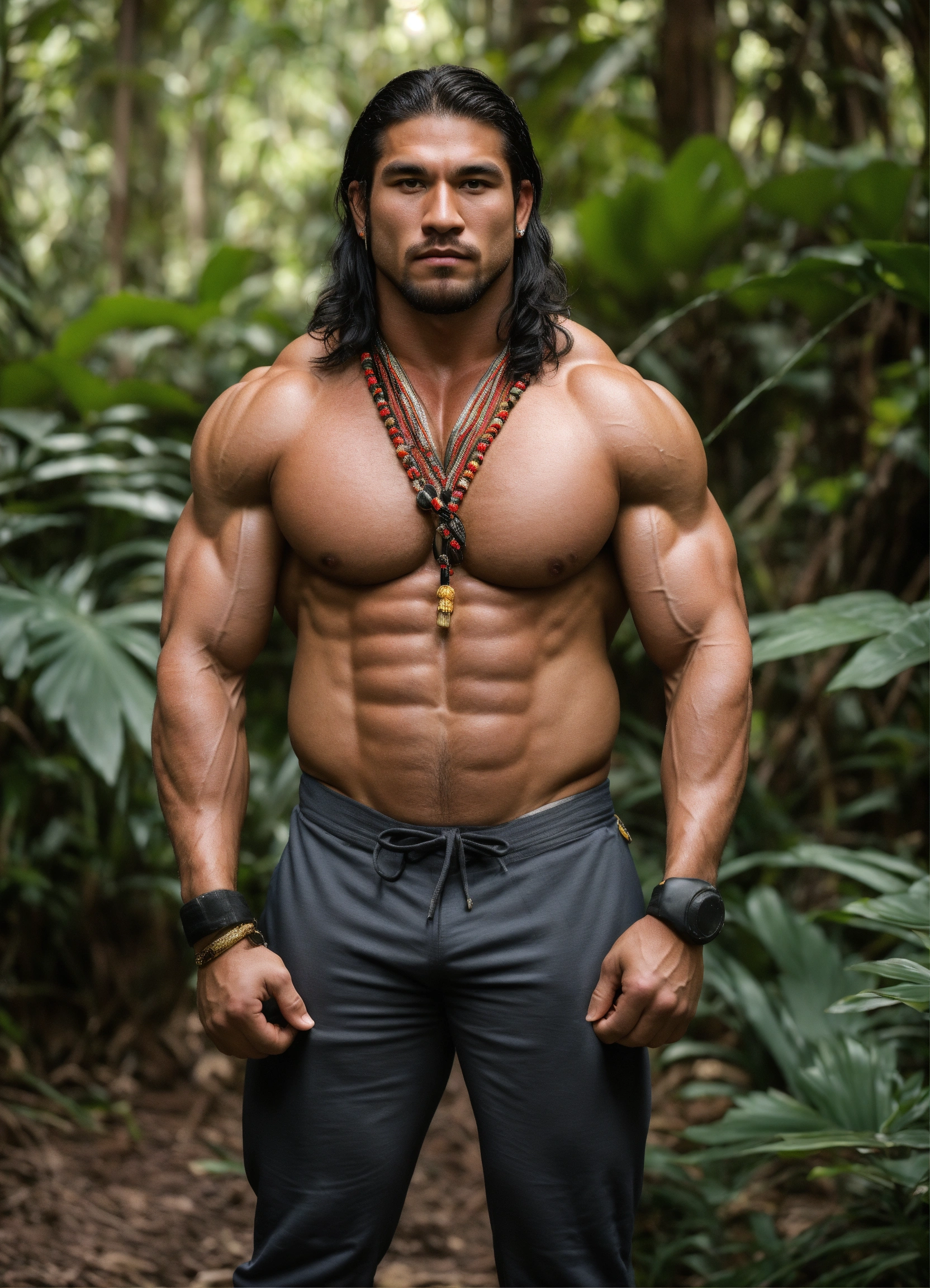 30-year-old man with big muscles, big bodybuilder, native american, body like a wrestler, in a jungle