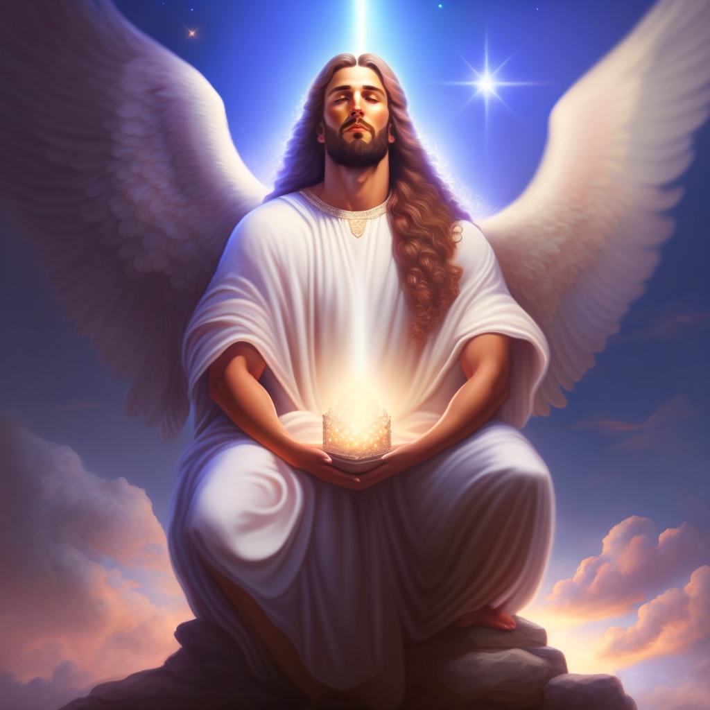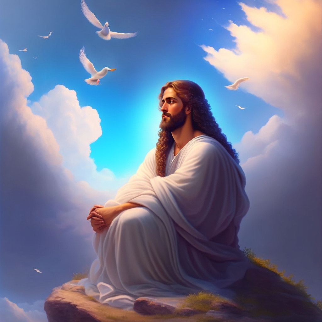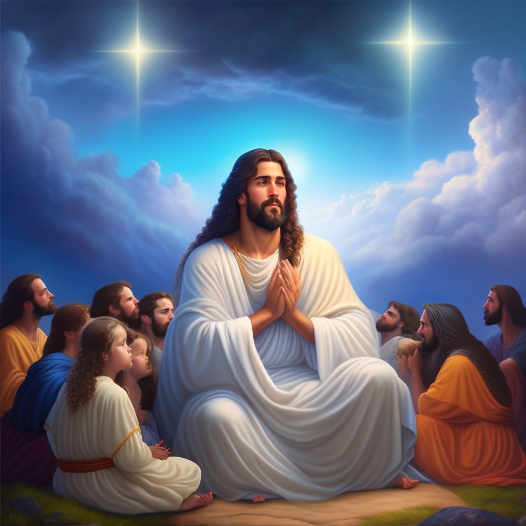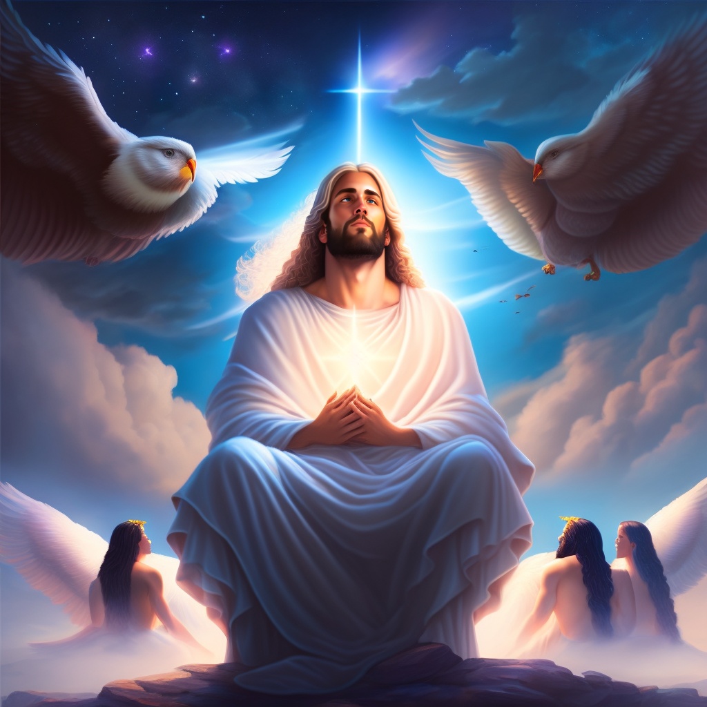 Jesus christ sitting in his kingdom, sky in the background, lots of angels adore him. ñots of light, people kneeling, realistic style