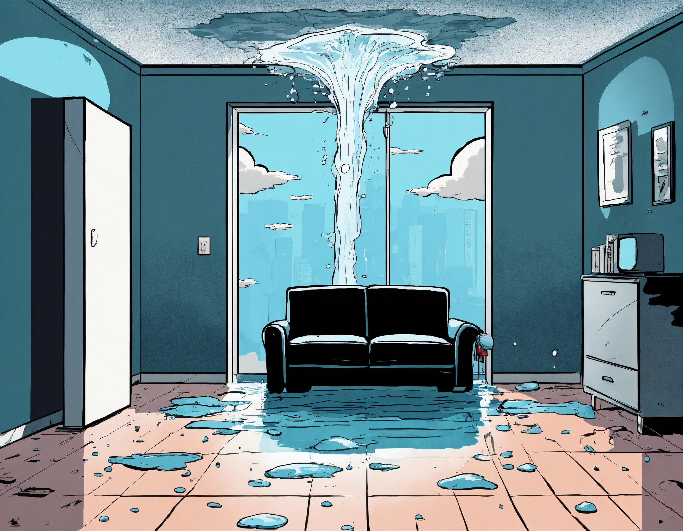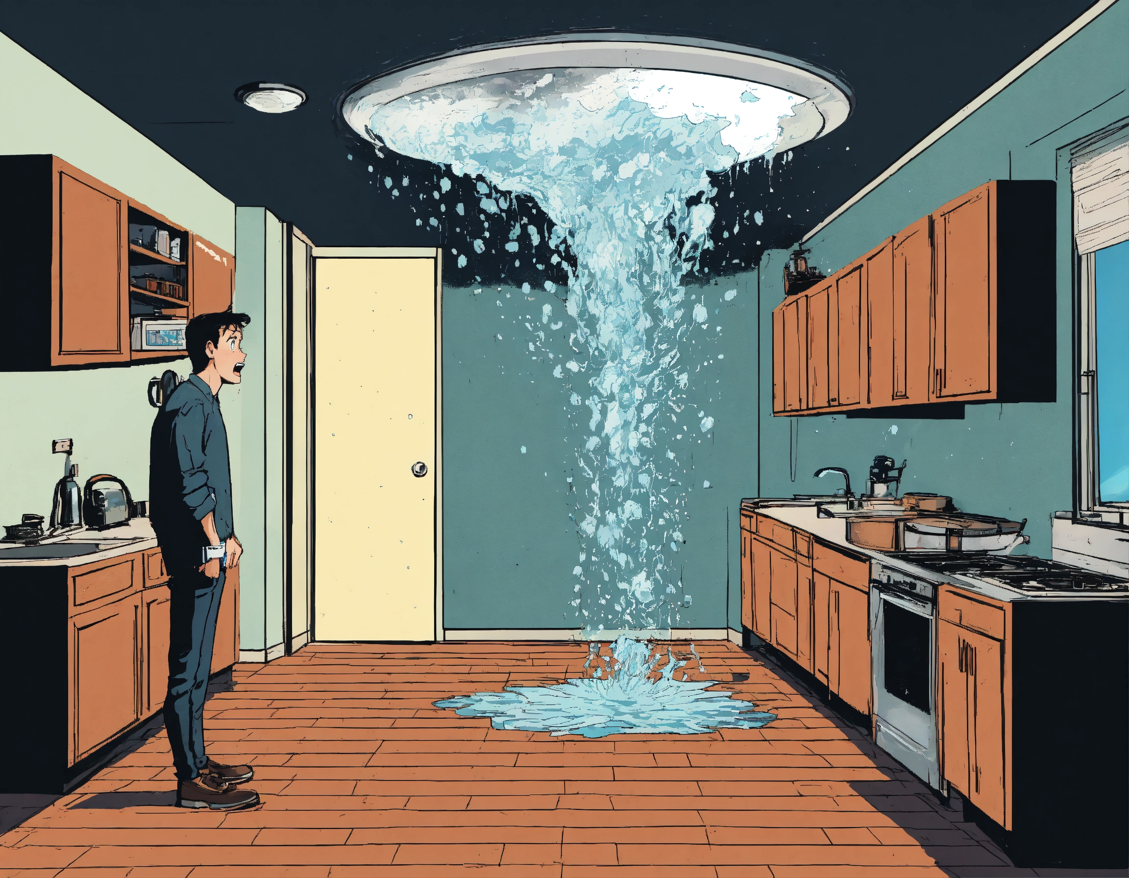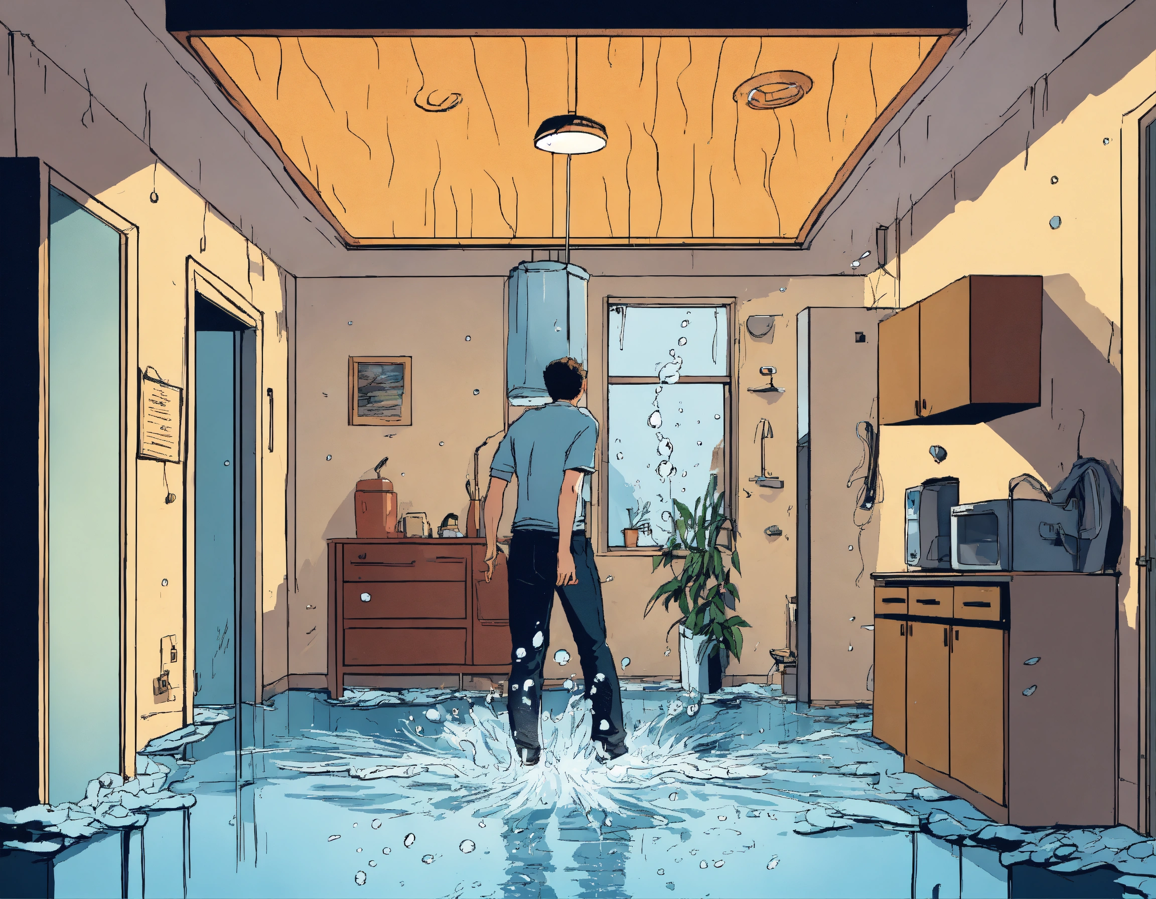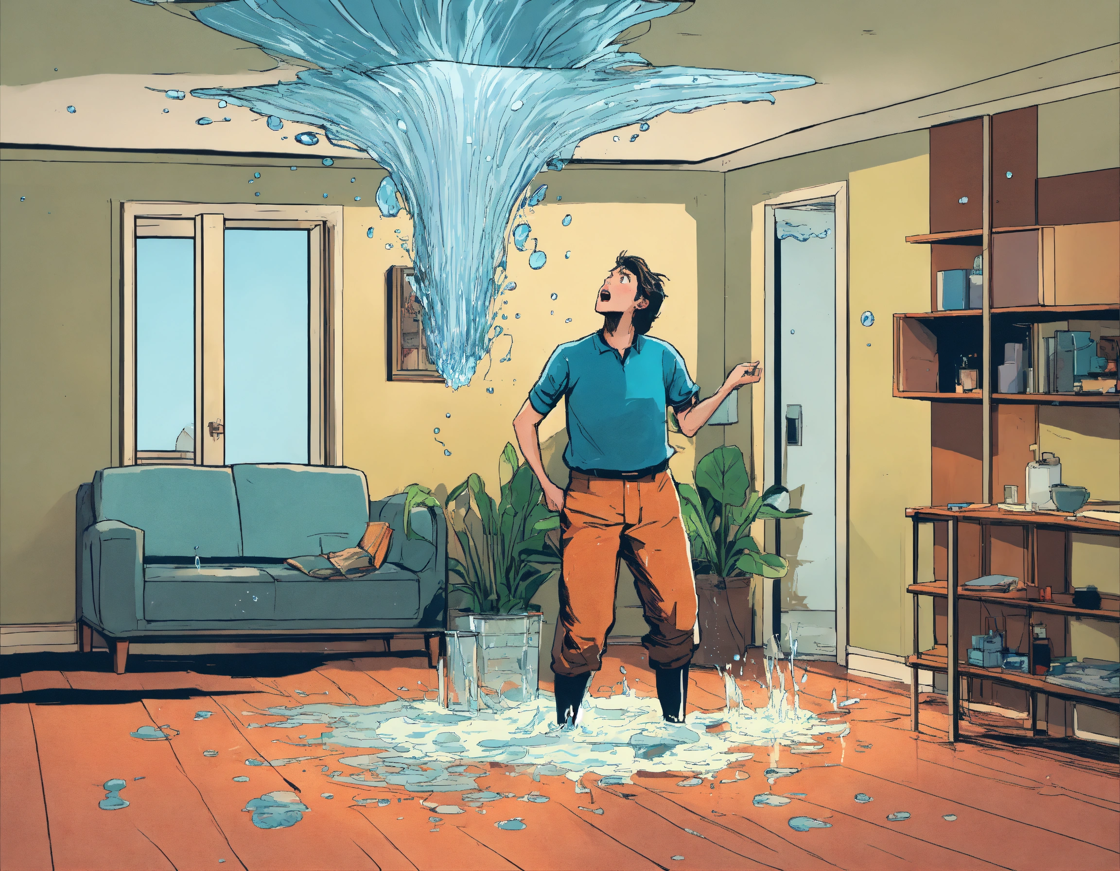 Water is coming from a ceiling inside an apartment, a person is standing inside the room in panic and looking shocked at the ceiling, comic style