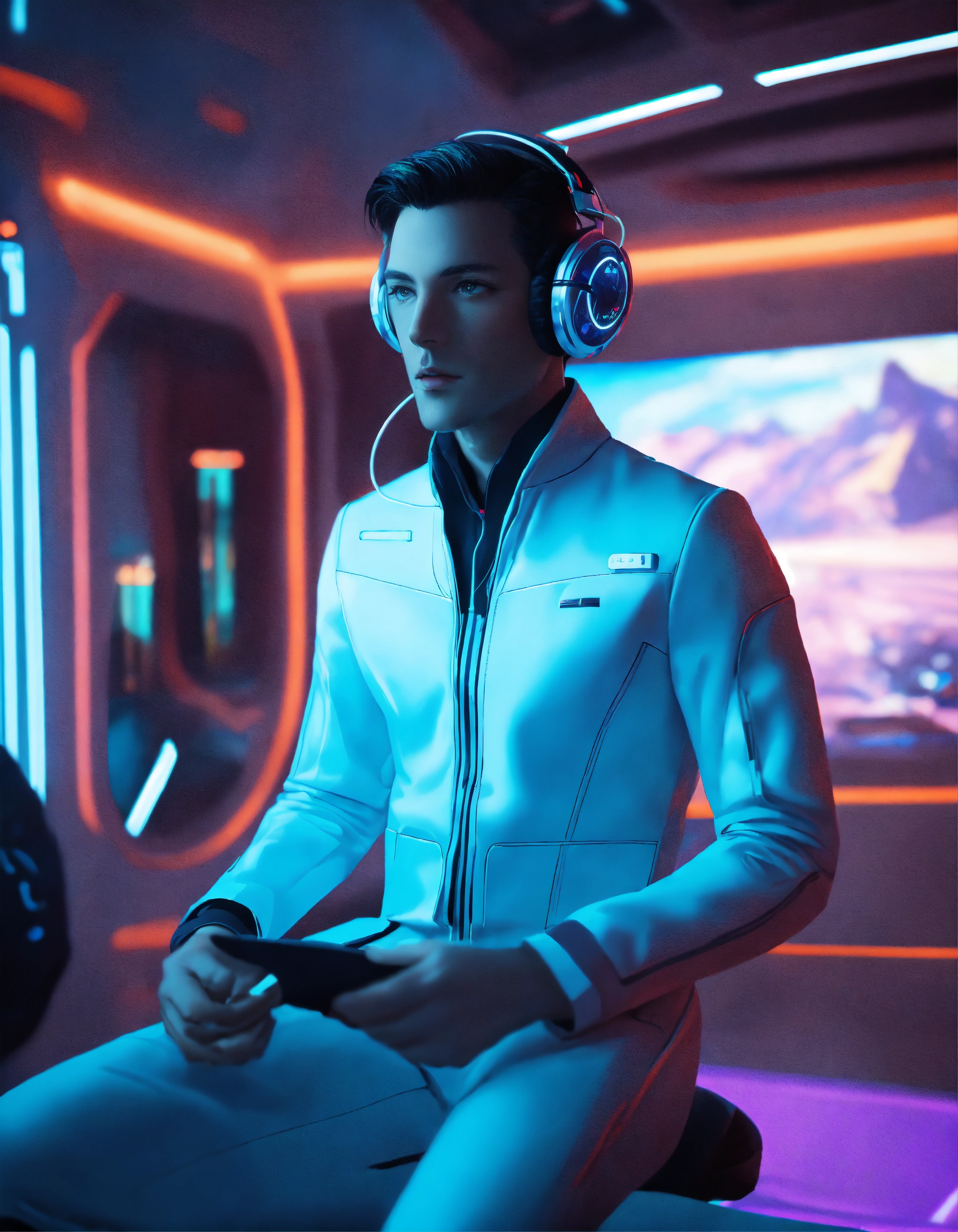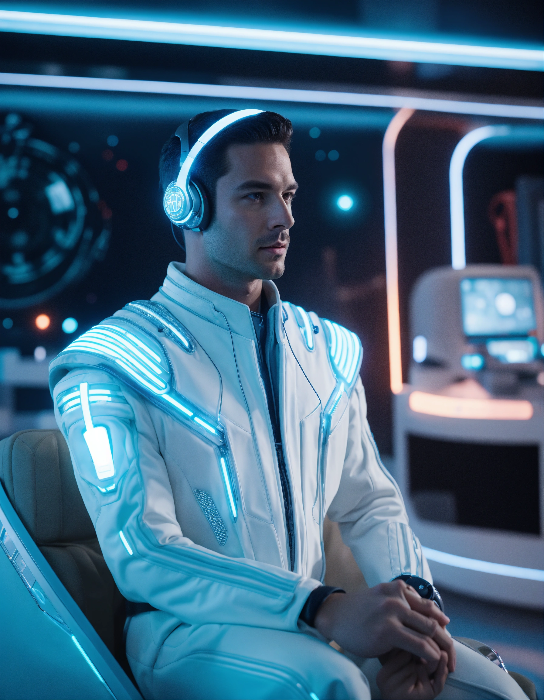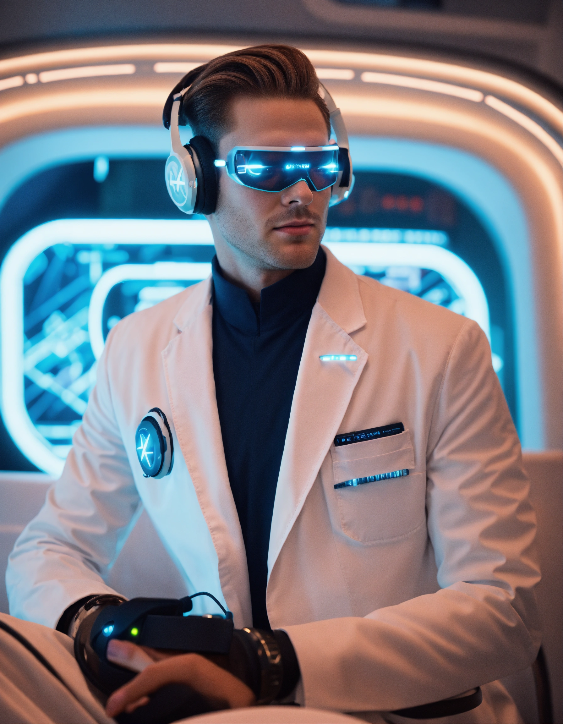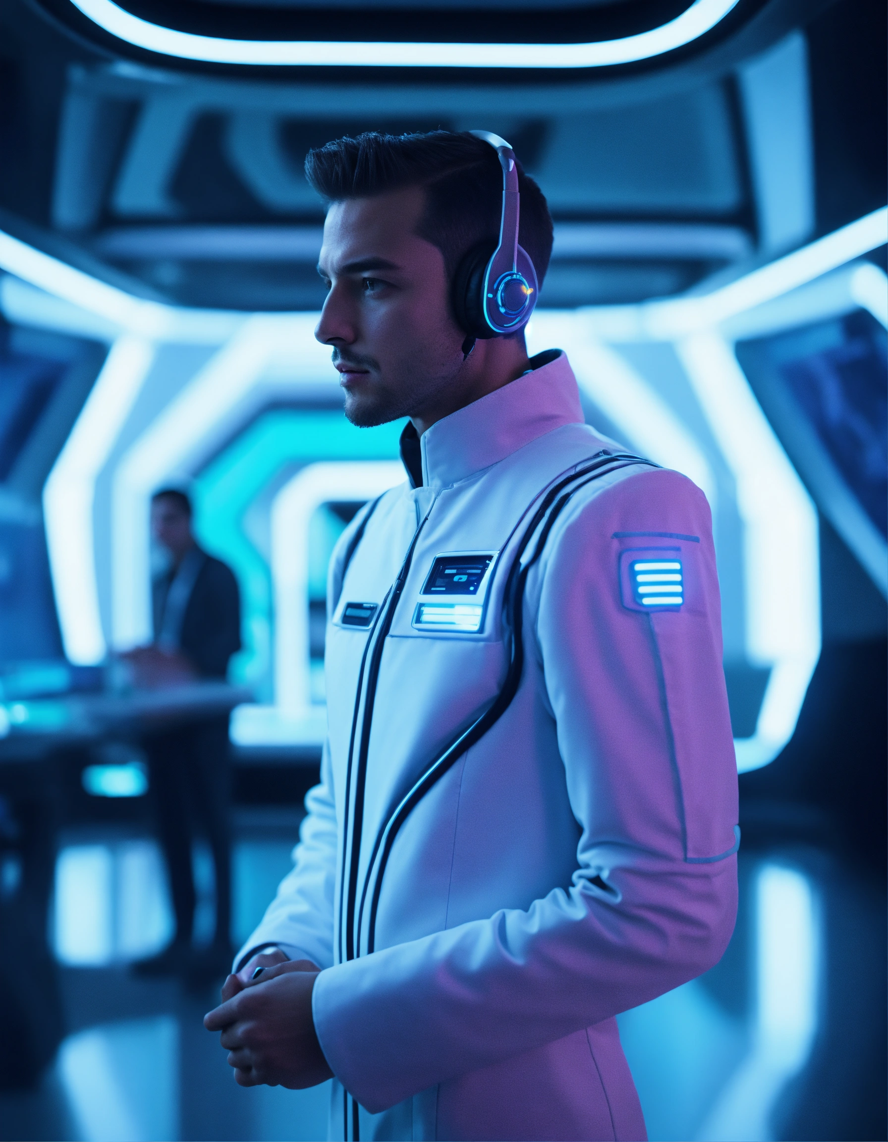 Zoom out on white male star command doctor wearing hi tech earphones and a sleek futuristic uniform is in a bright white lab in a lounge area of a beautiful alien spaceyacht, 8k, tron, realistic