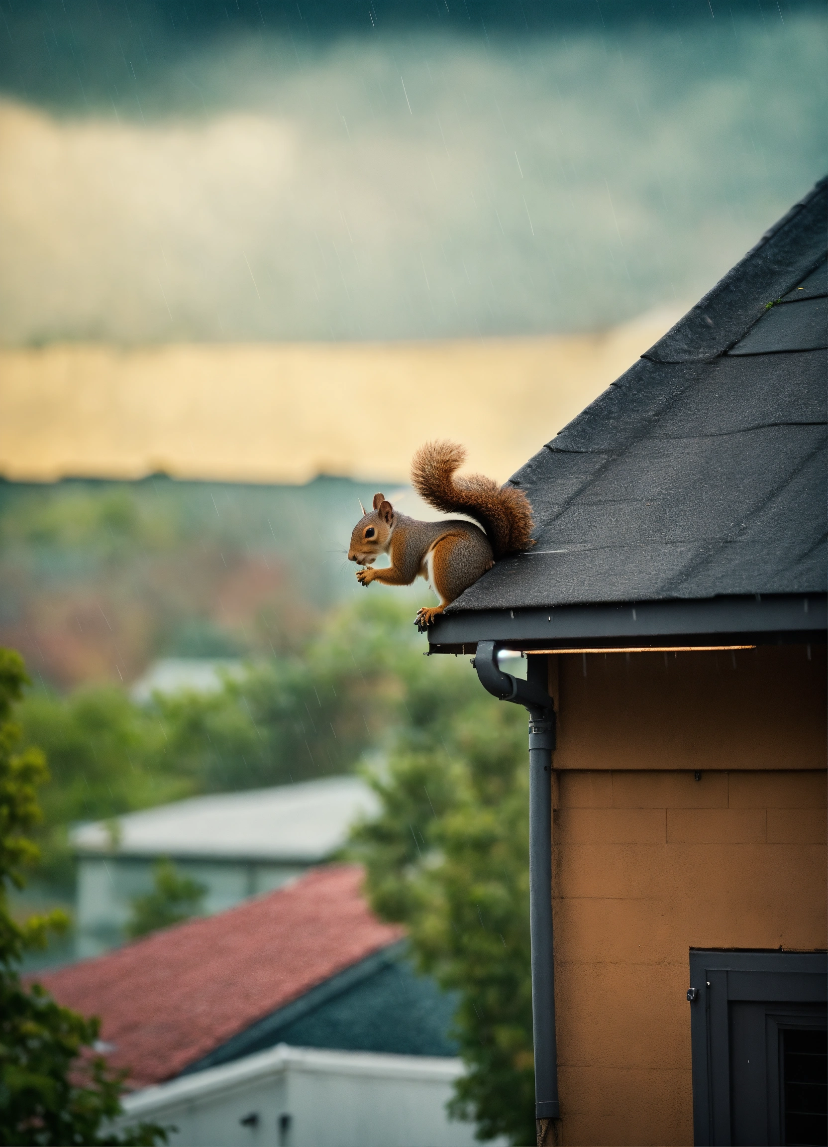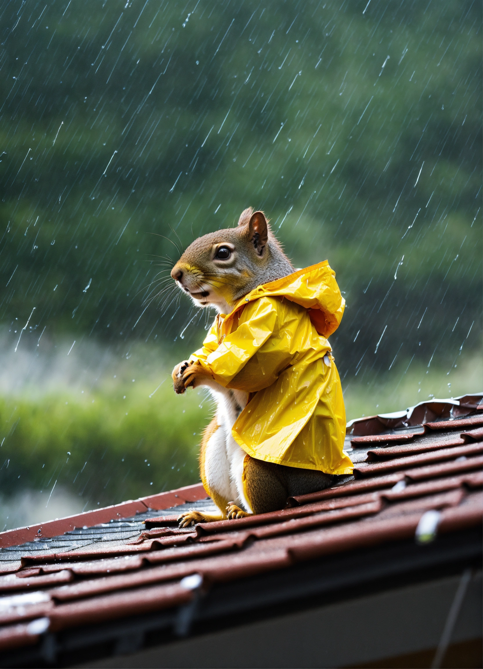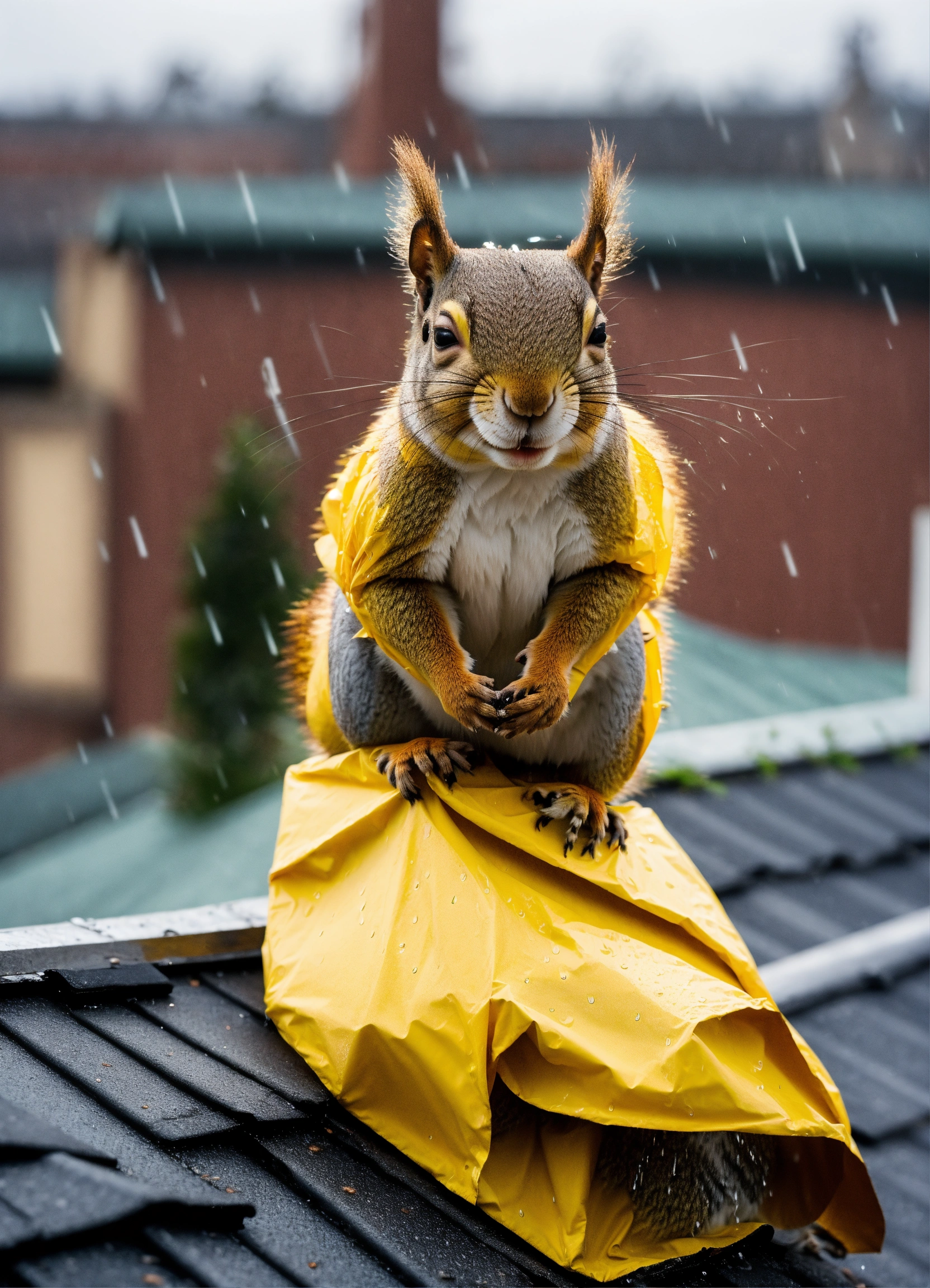 A squirrel standing on a roof in the rain wearing a rainjacket