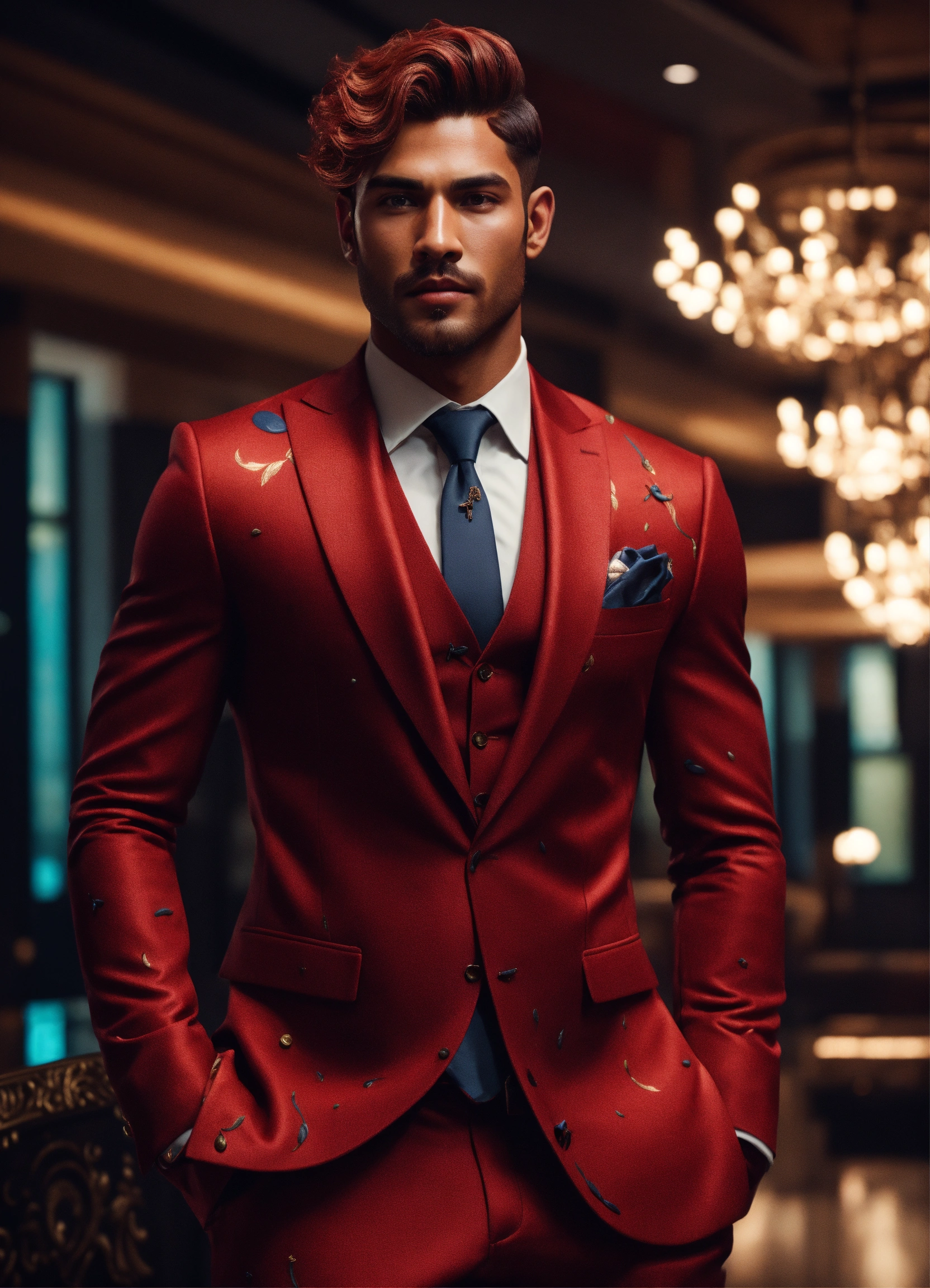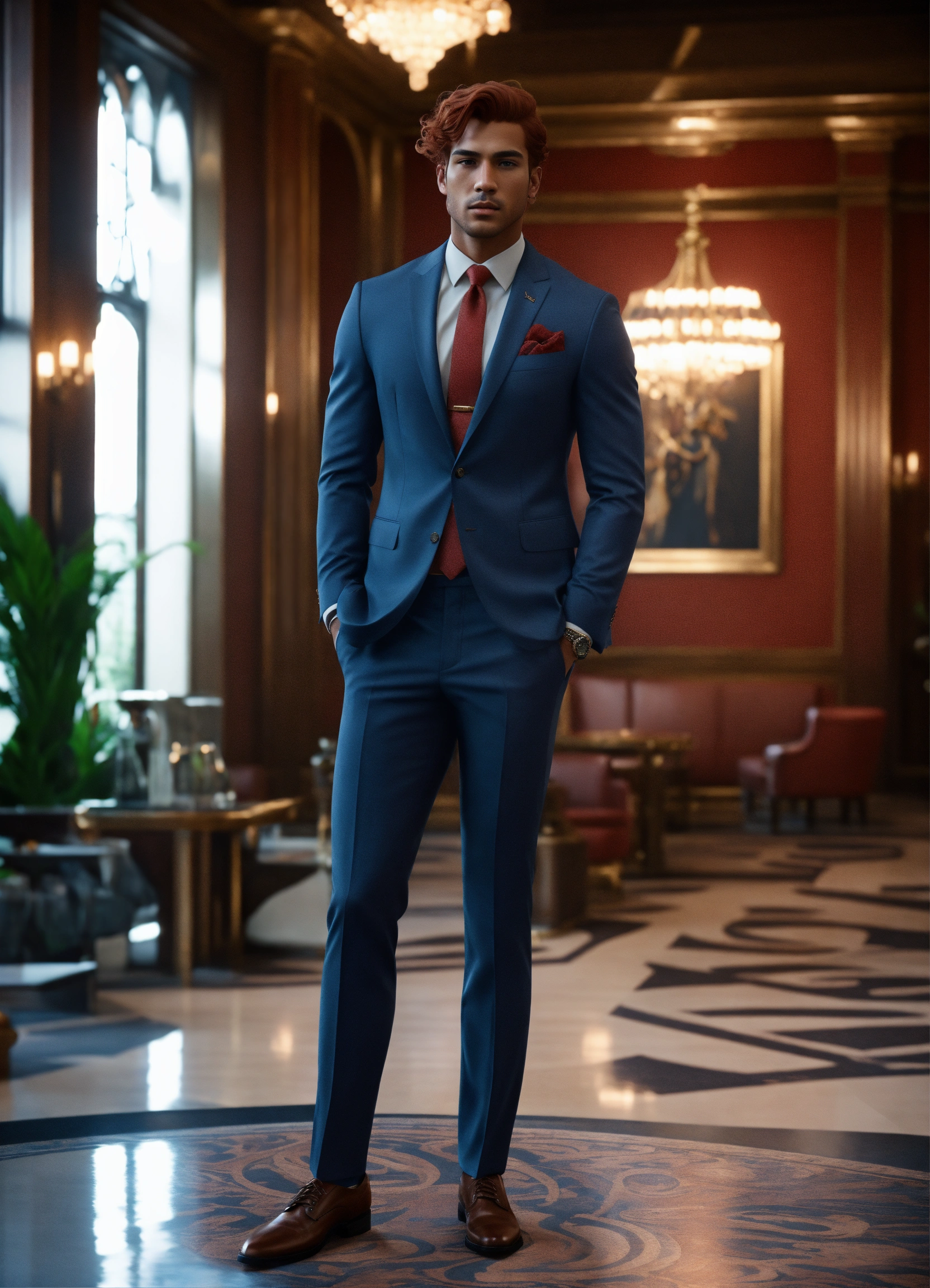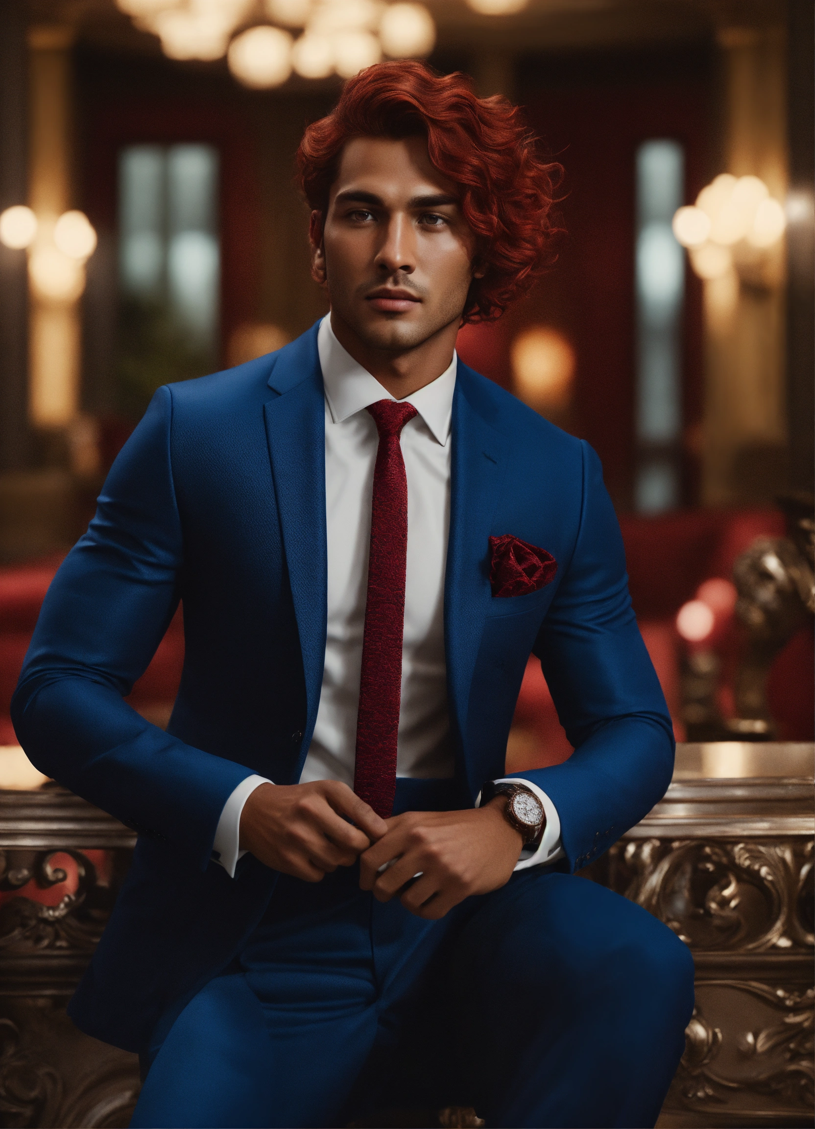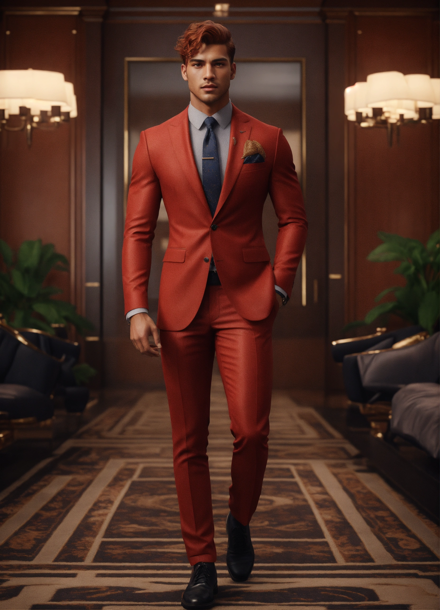 Handsome, college male, red skin, indian features, red wavy hair, athletic build, in haute couture suit, in upscale lobby, cocky demeanor, 8k, unreal engine.