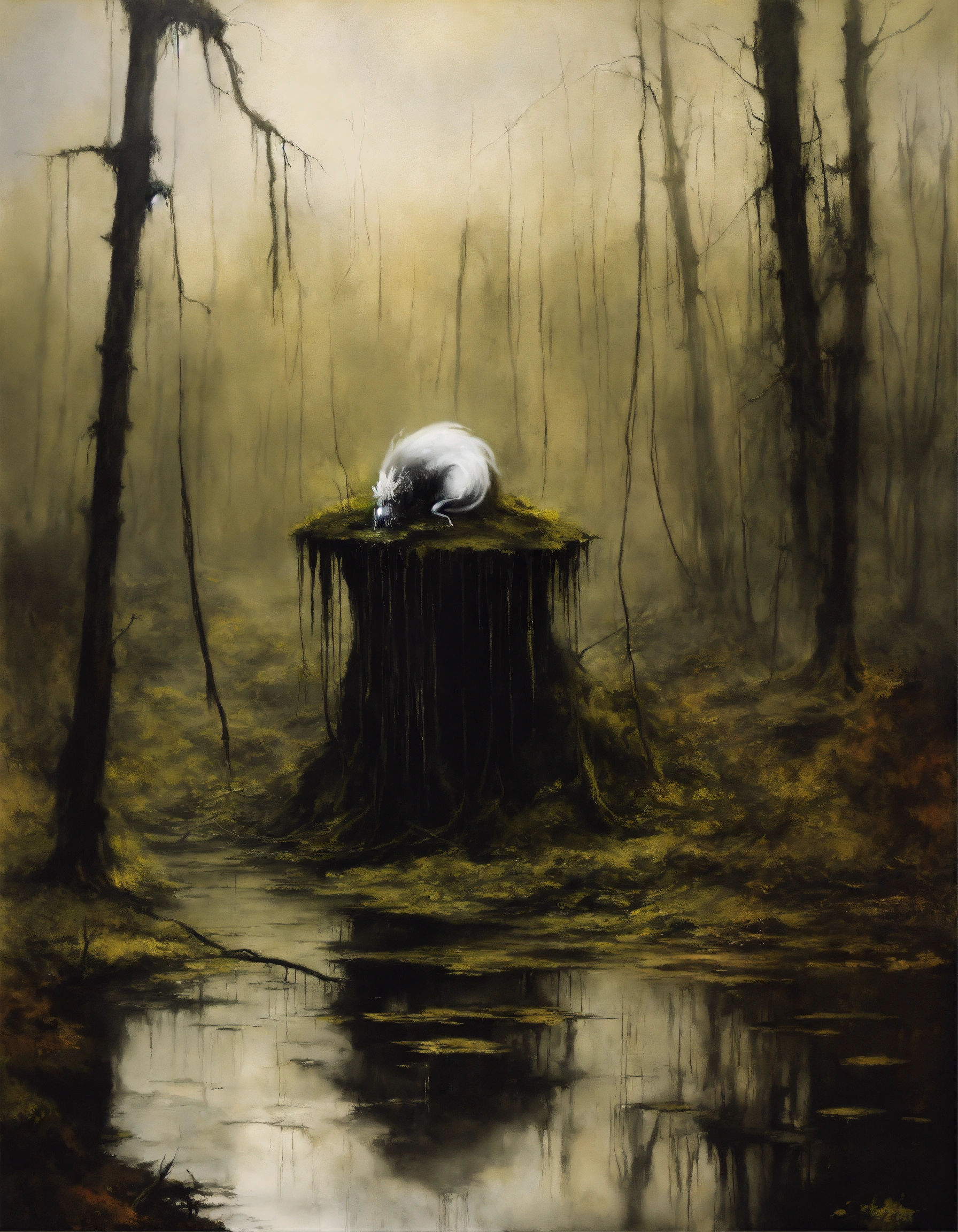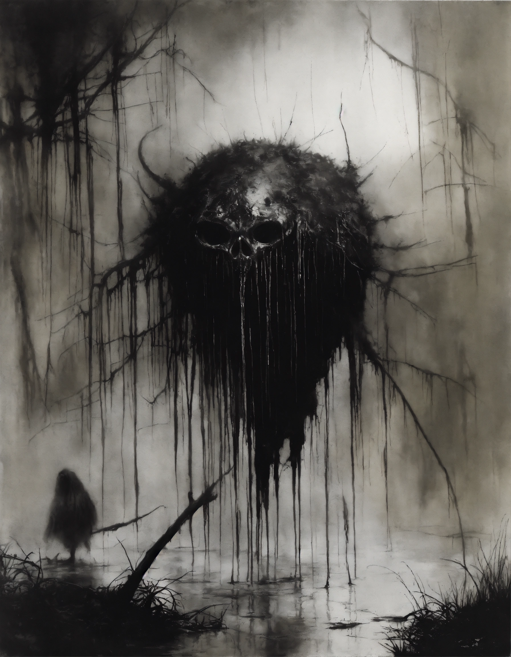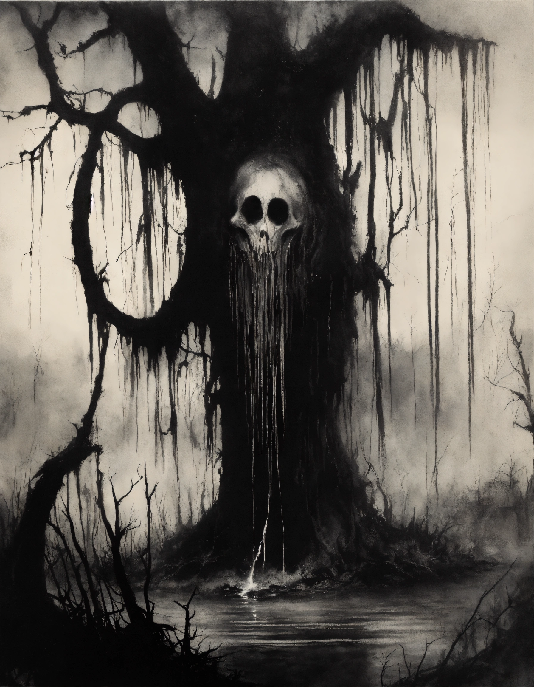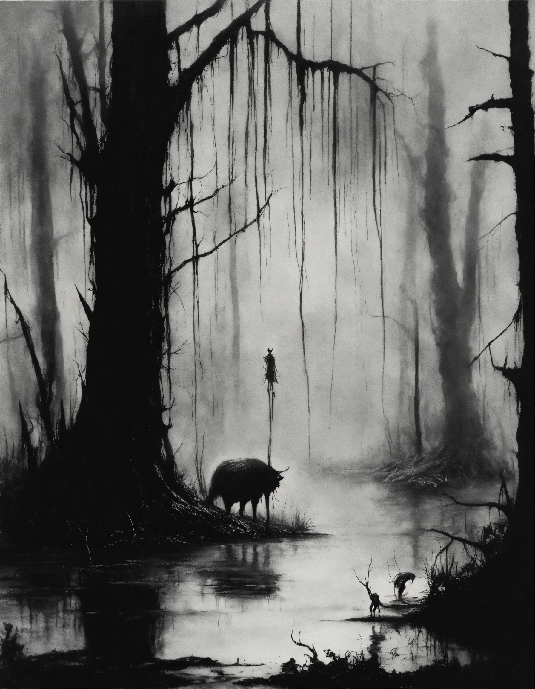 Style of stephen gammell, oil paints, black and white, swamp, shadowy creatures, dripping, infected, evil, wooden tail