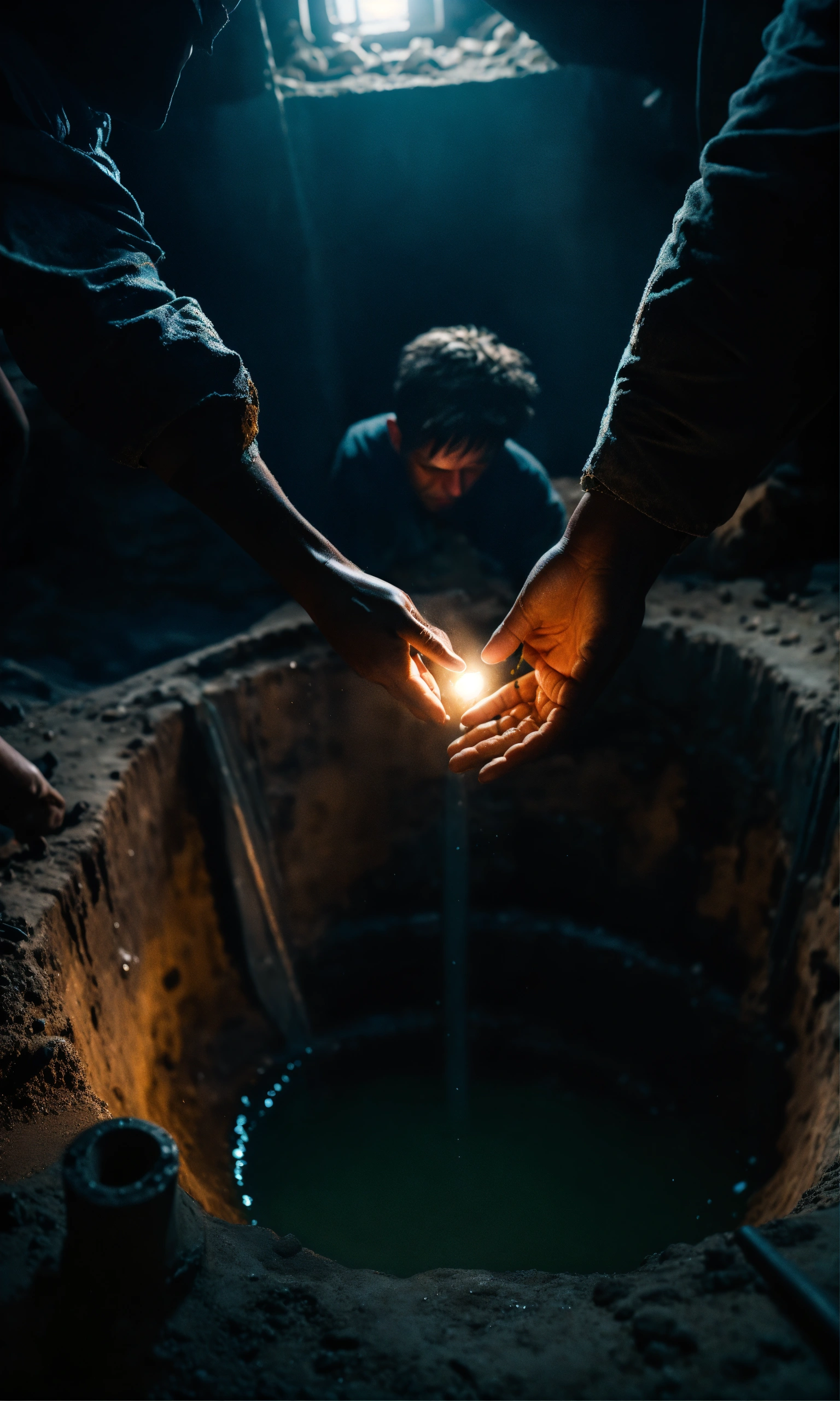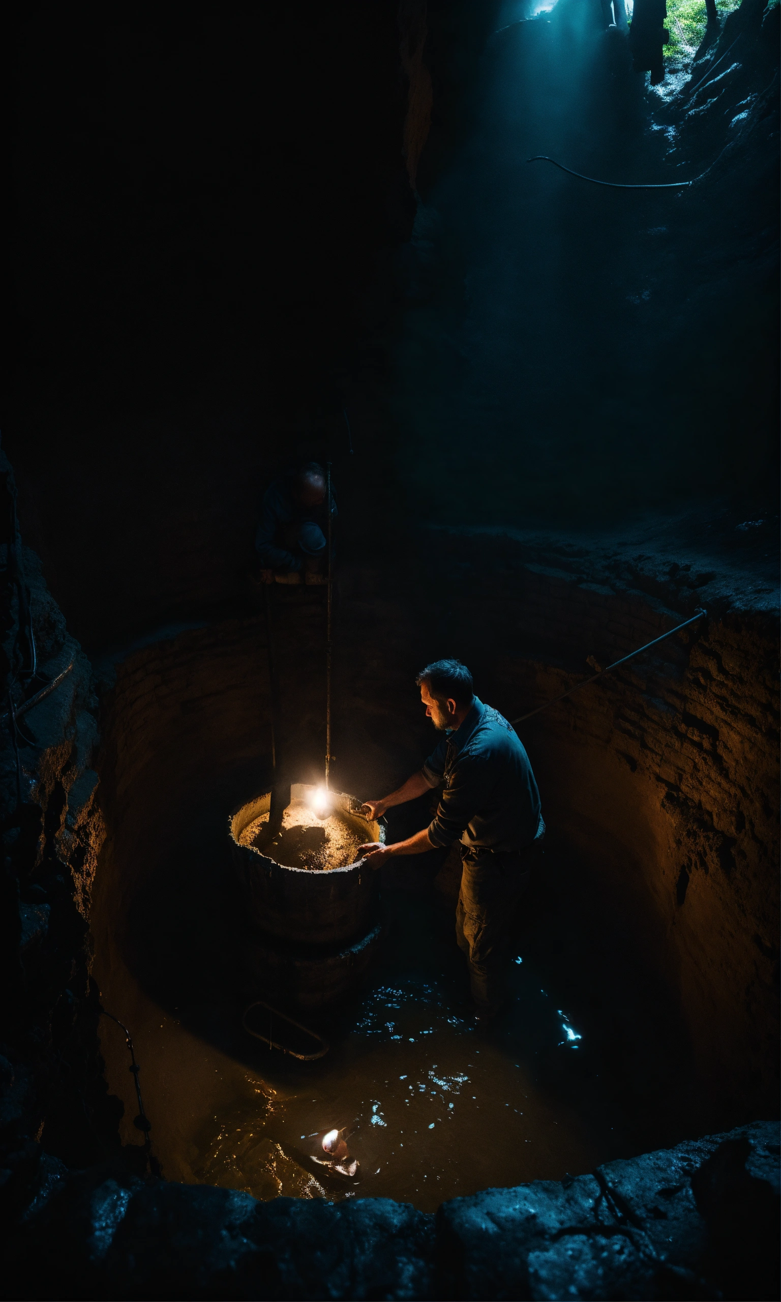 Extended hand in a deep well trying to help a despaired man at the bottom of the pit, light from the top, surreal photo, fujifilm xt3, dark lighting, raw photo, 8k uhd, unreal engine 5, ray trace