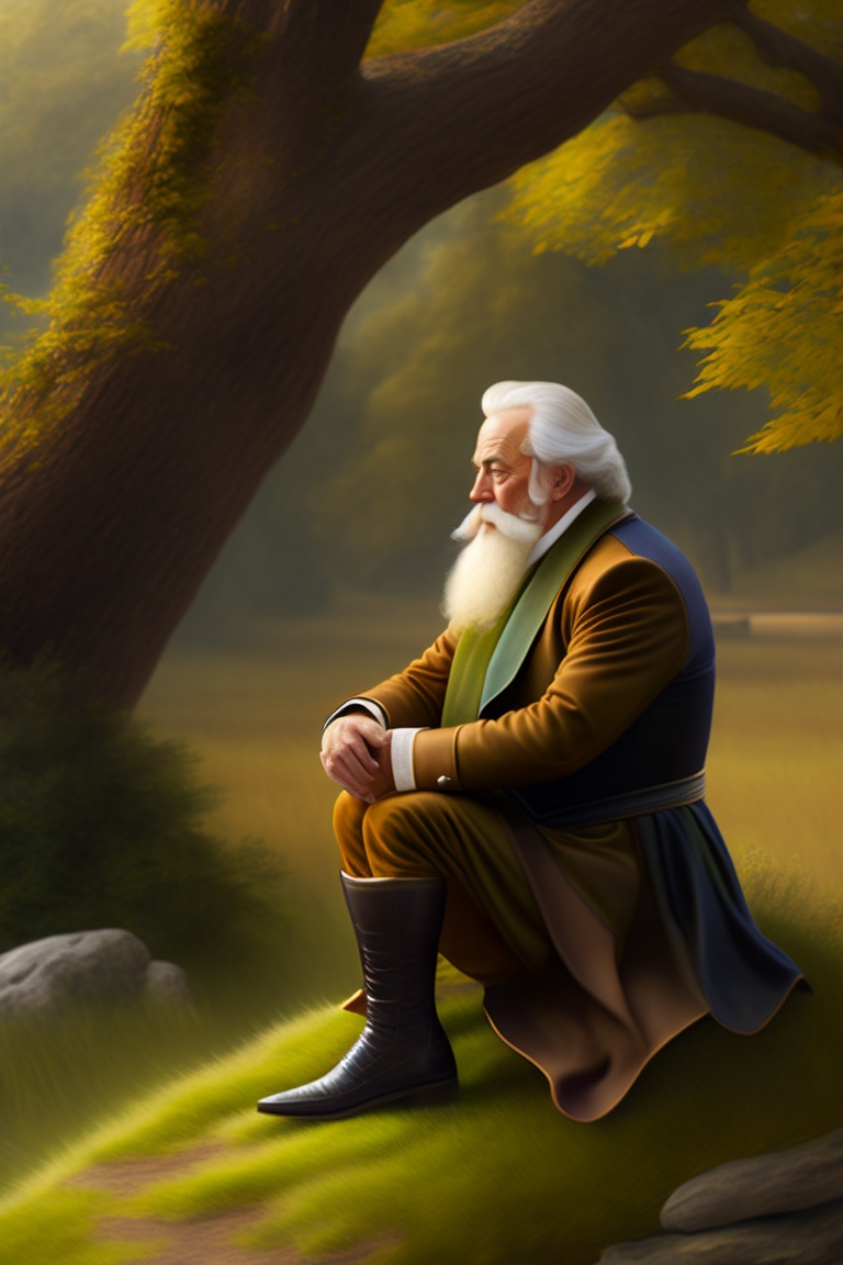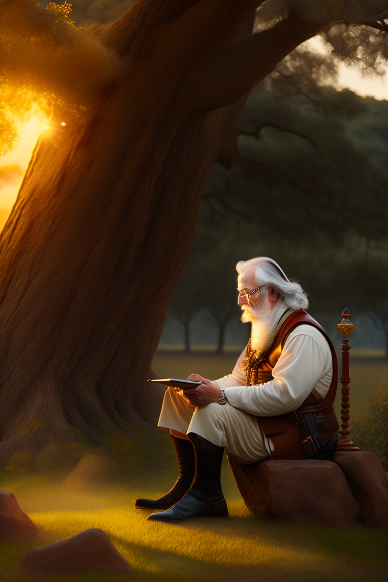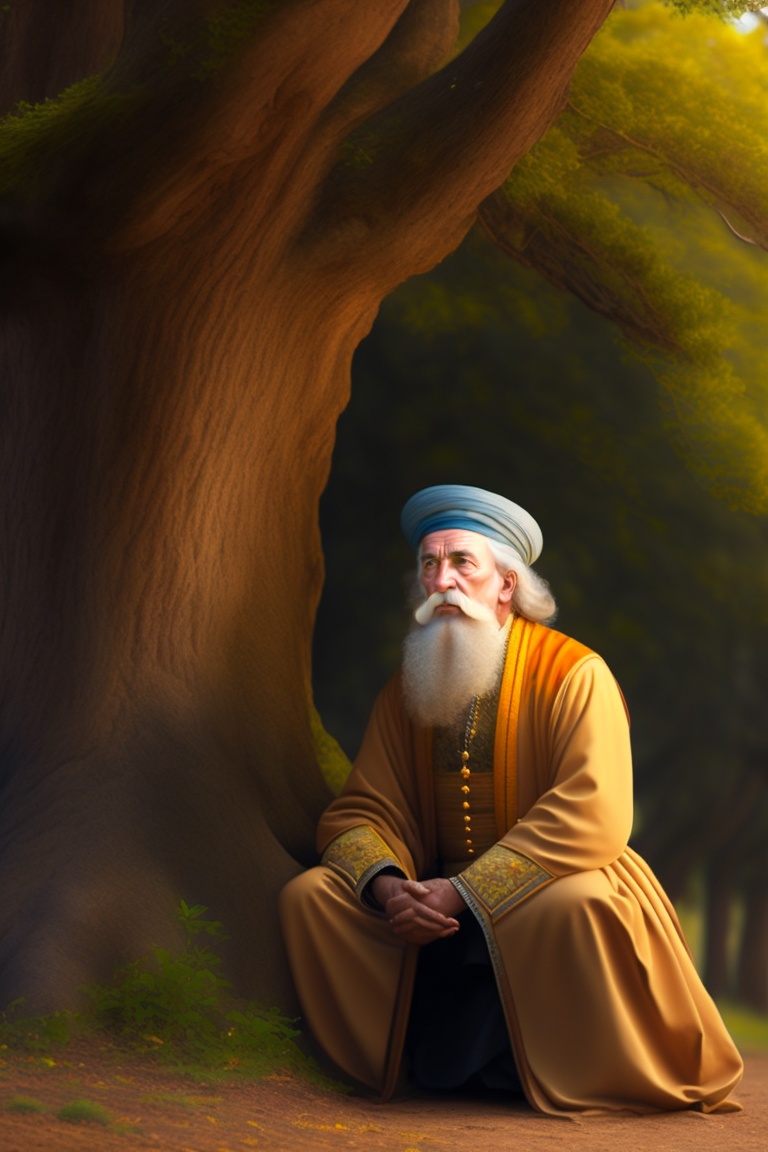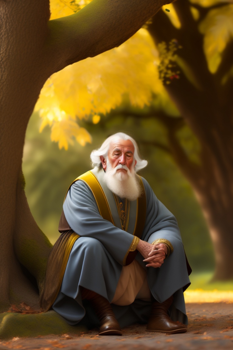 The old sage, with a serene expression on his face, sat cross-legged under a towering oak tree as he began to share his wisdom with the young man.