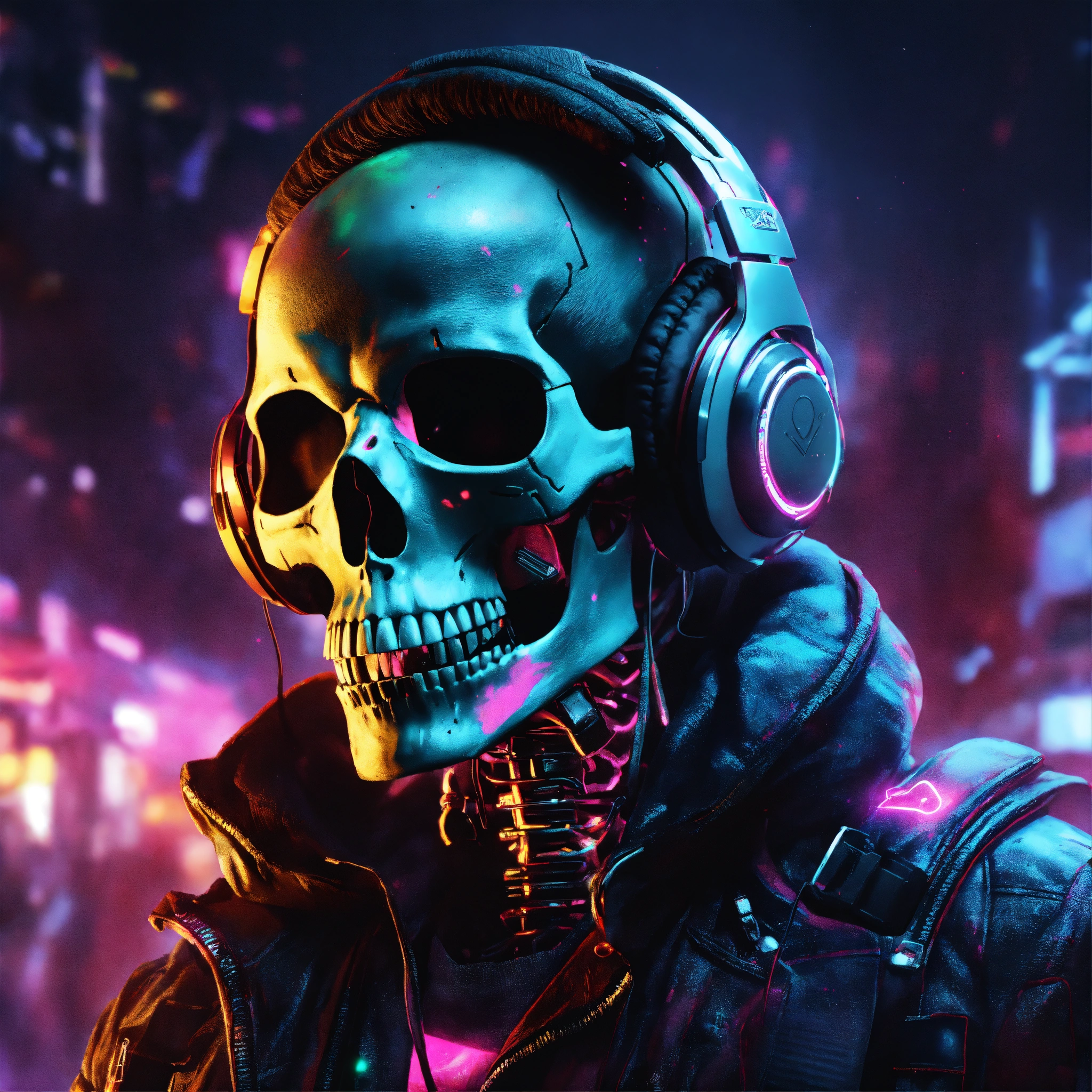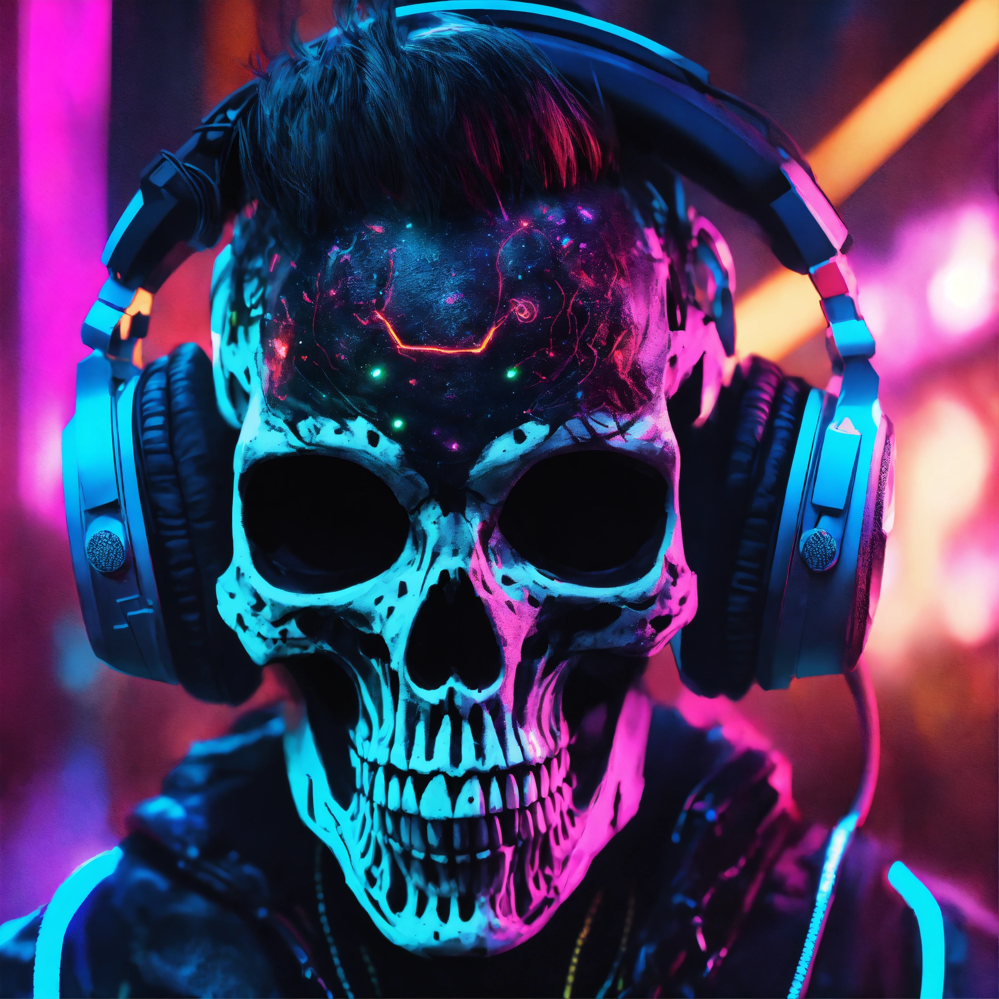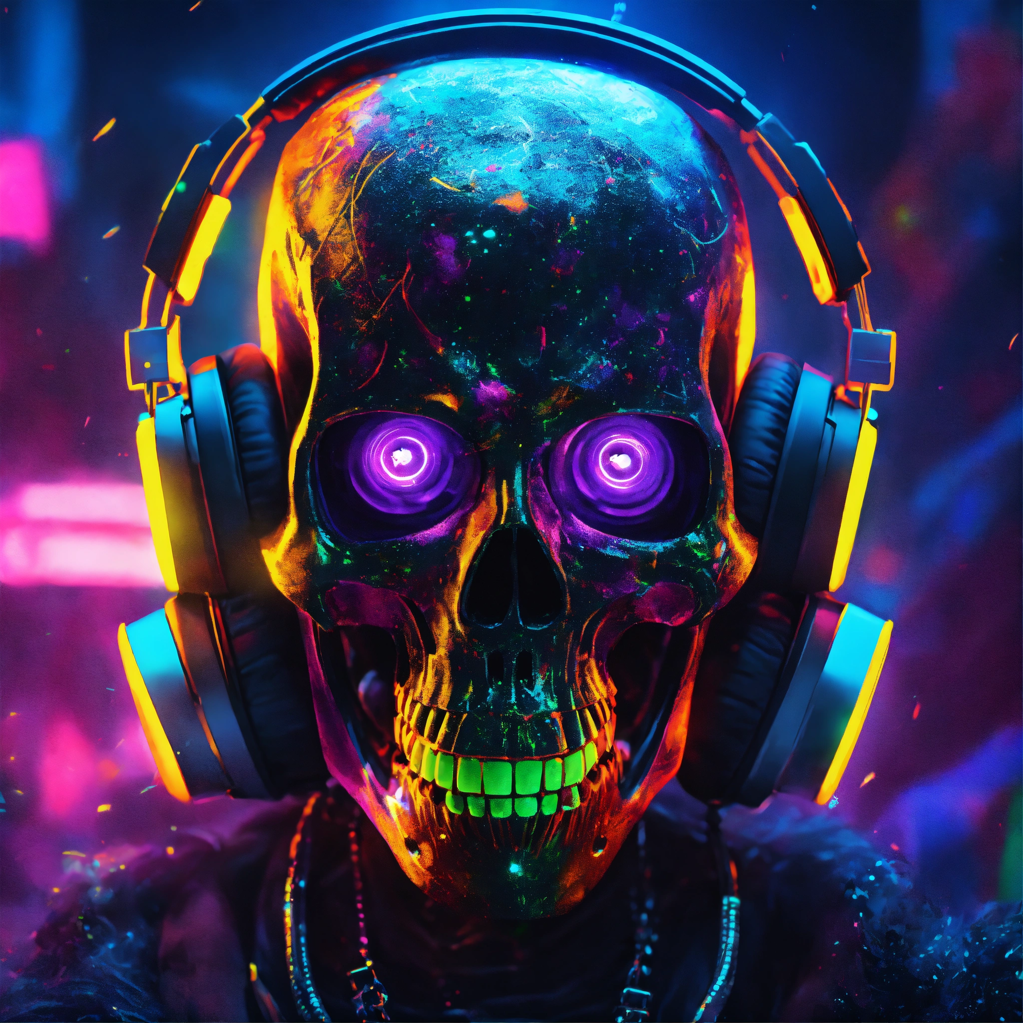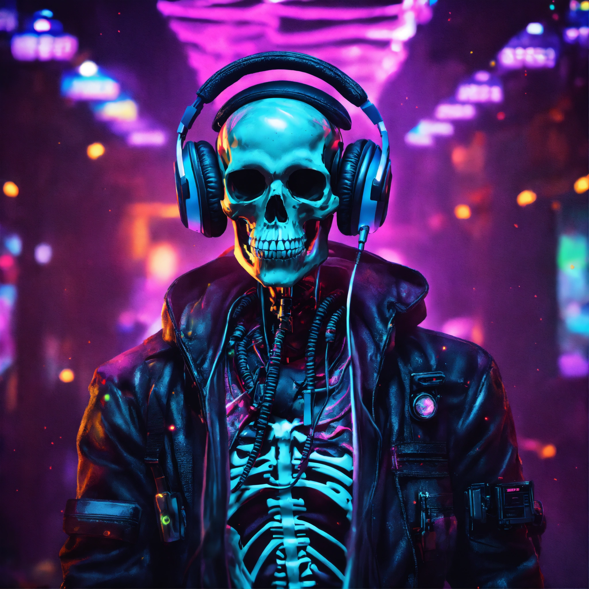 Action shot portrait neo punk skeleton with headphones on galaxy in eyes, smoke, neon colors, dark atmosphere, cyberpunk, artstation, hyper-detailed, 4k, hd, volumetric lighting