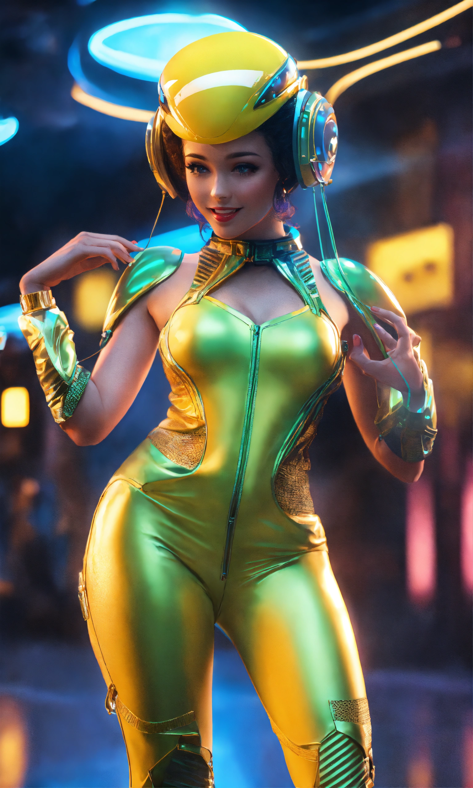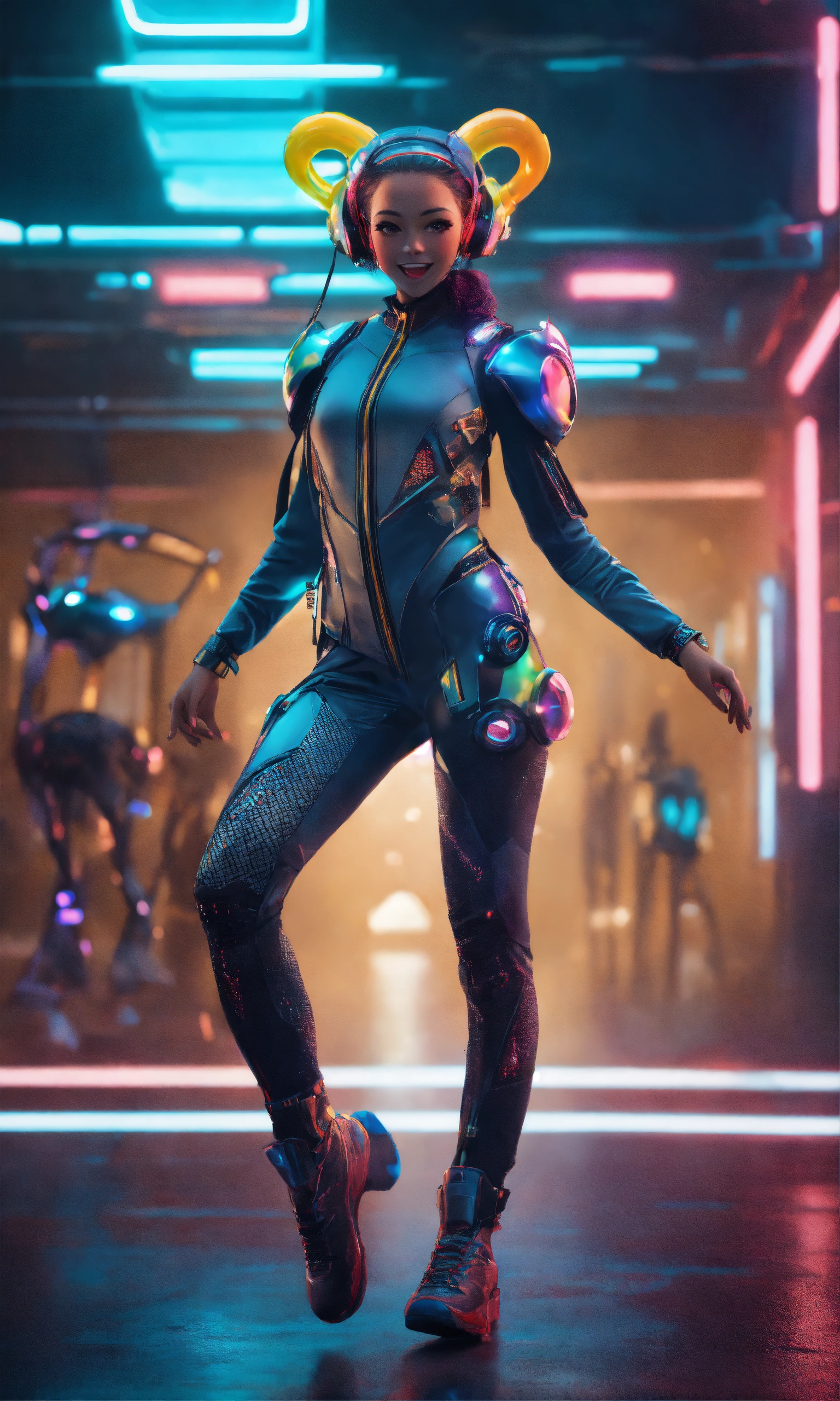 Full body of a beautiful happy girl dancing wearing detailed alien ear antennas with futuristic clothing, futuristic, sci-fi, realistic, 8k