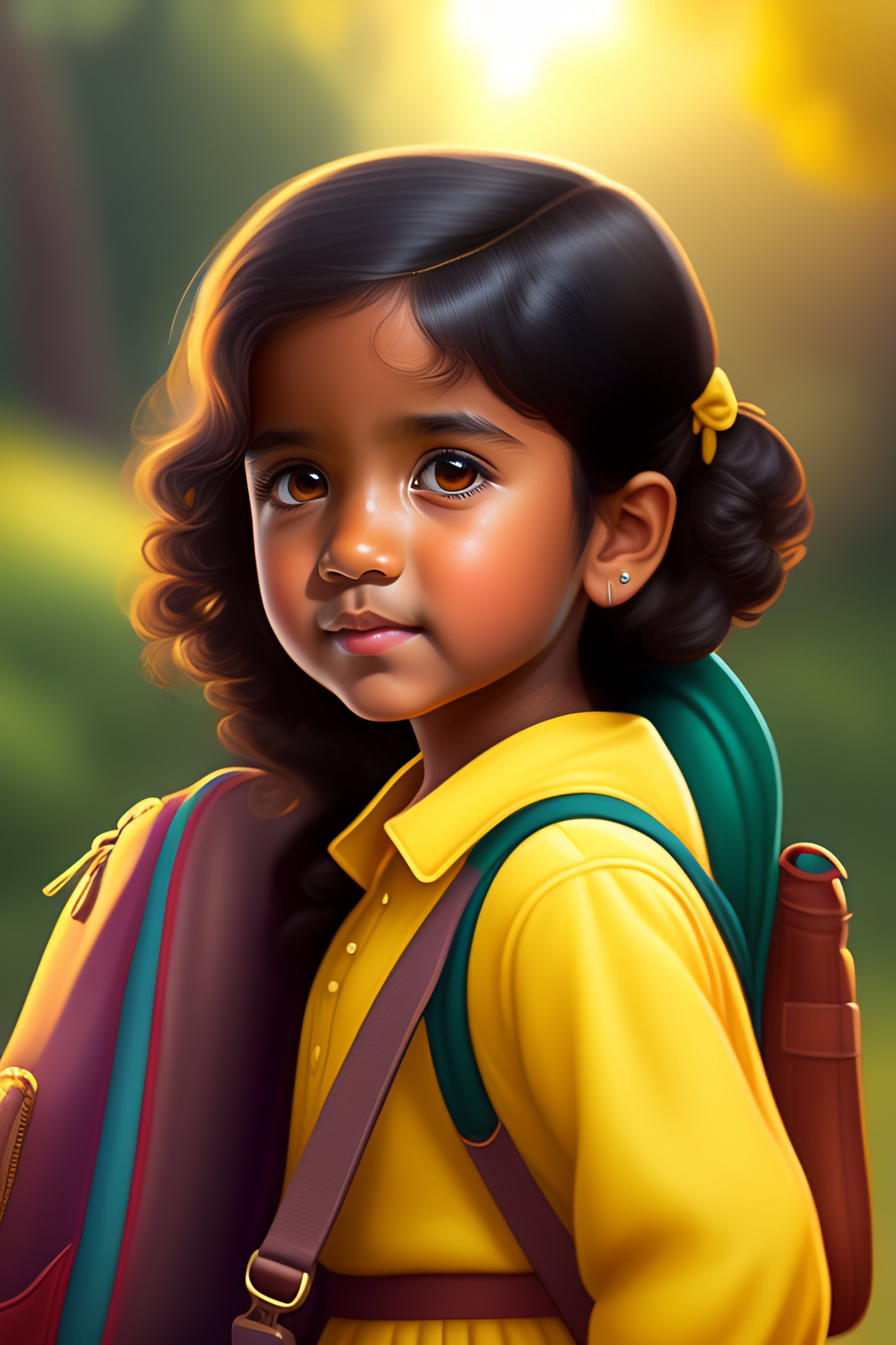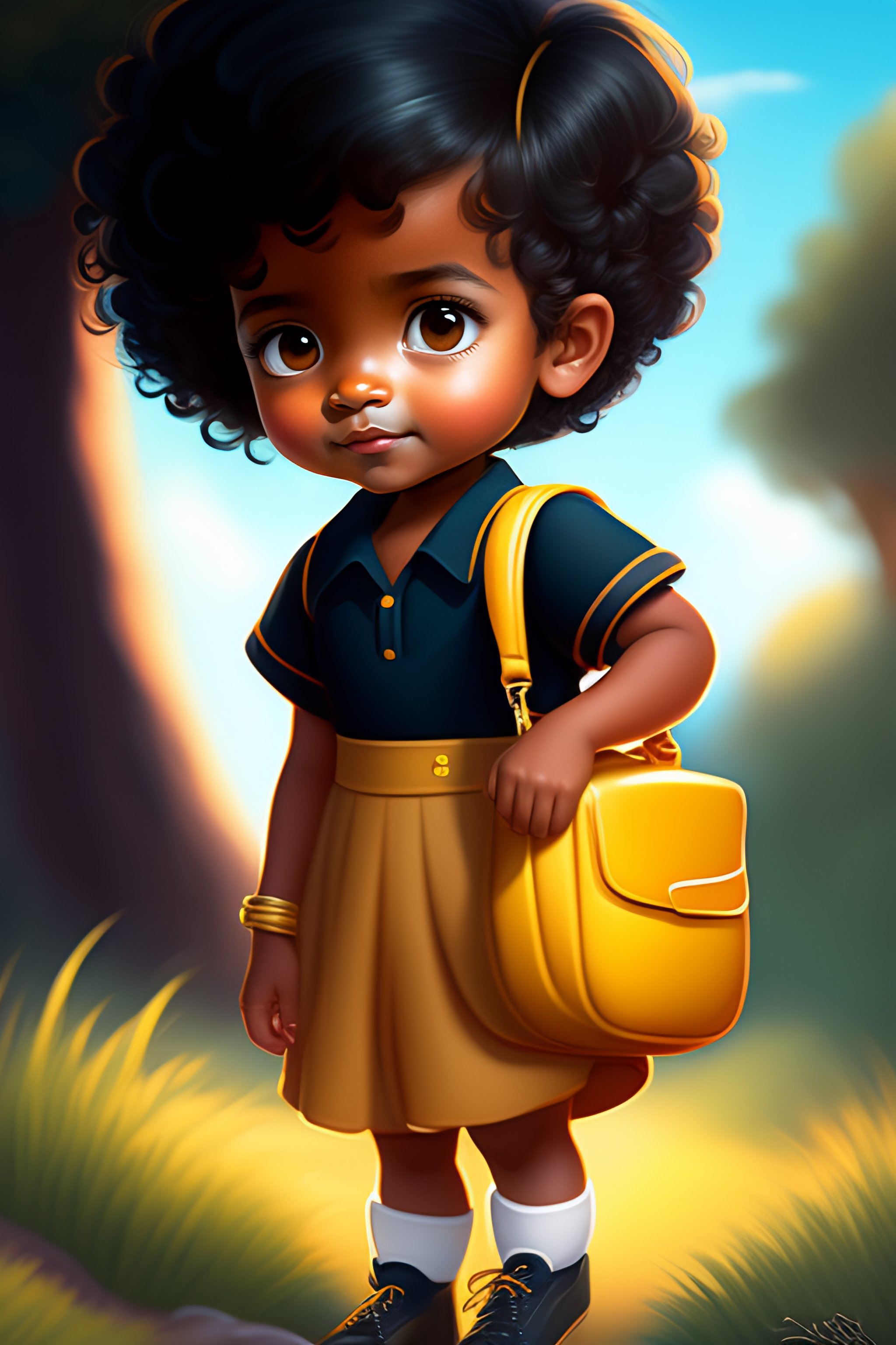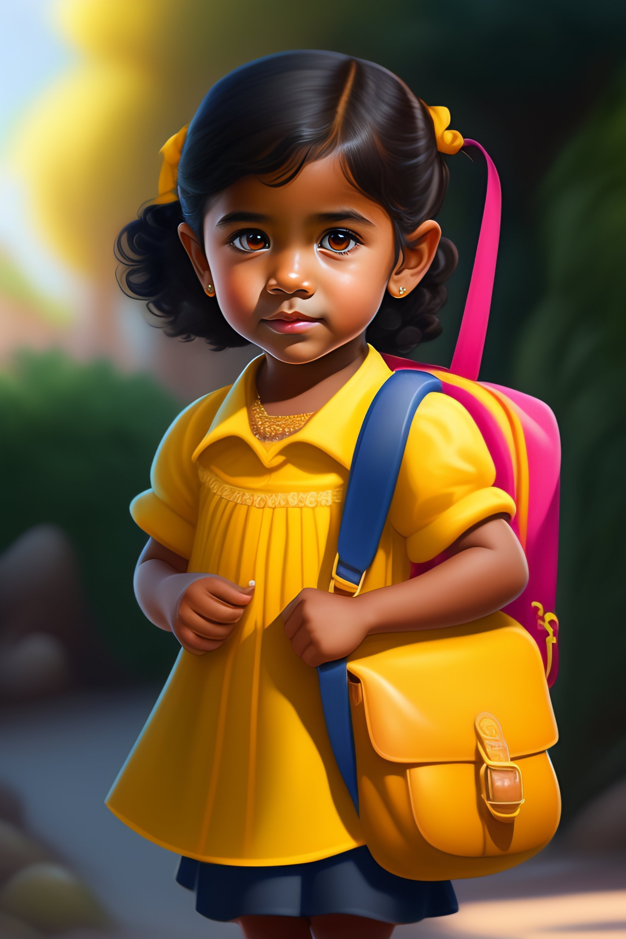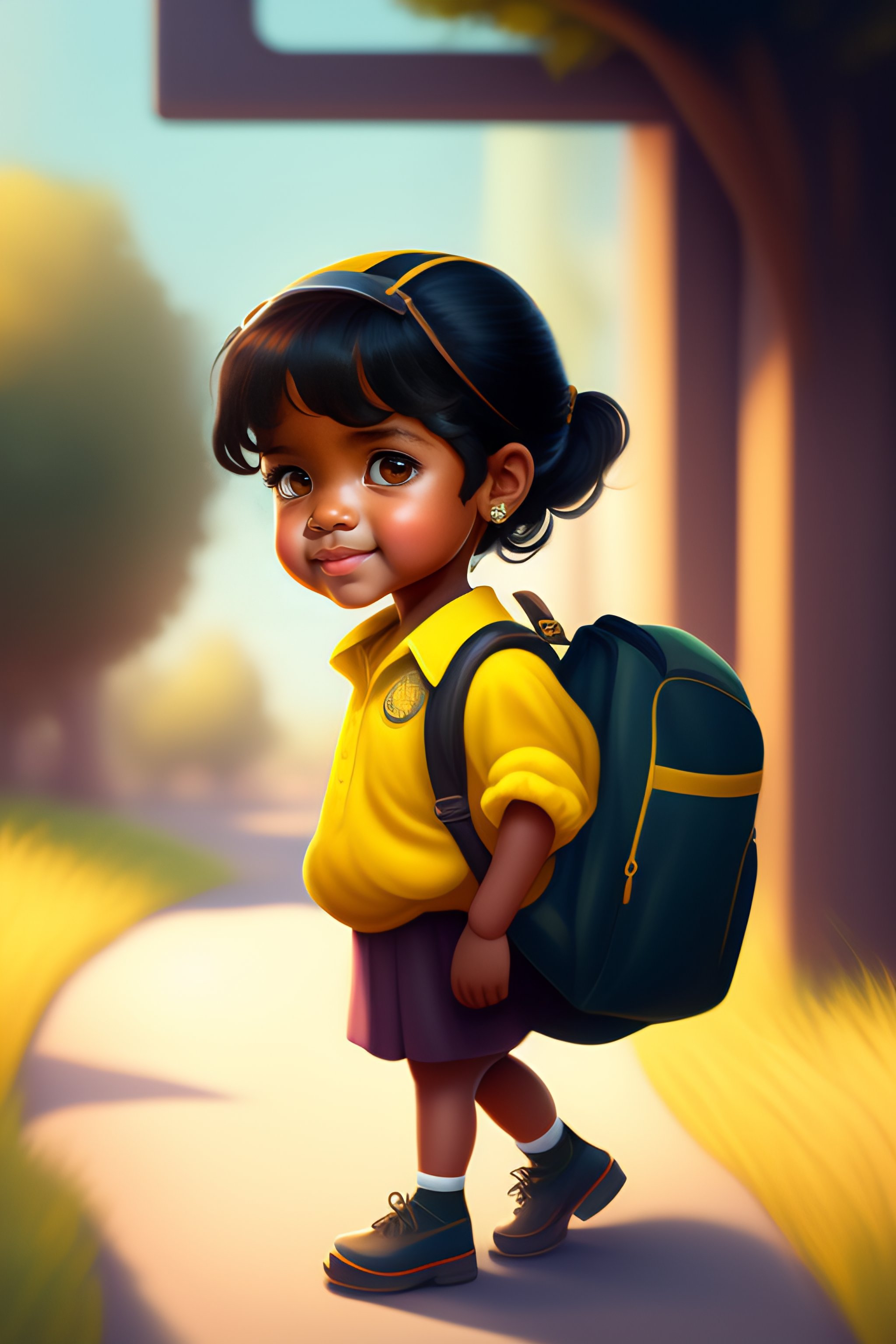 3 year old brown girl with short black hair and yellow dress and school bag going to school, children's storybook art, art drawn by disney concept artists, high quality, highly detailed, elegant, sharp focus, concept art, character concepts, digital painting, mystery, adventure