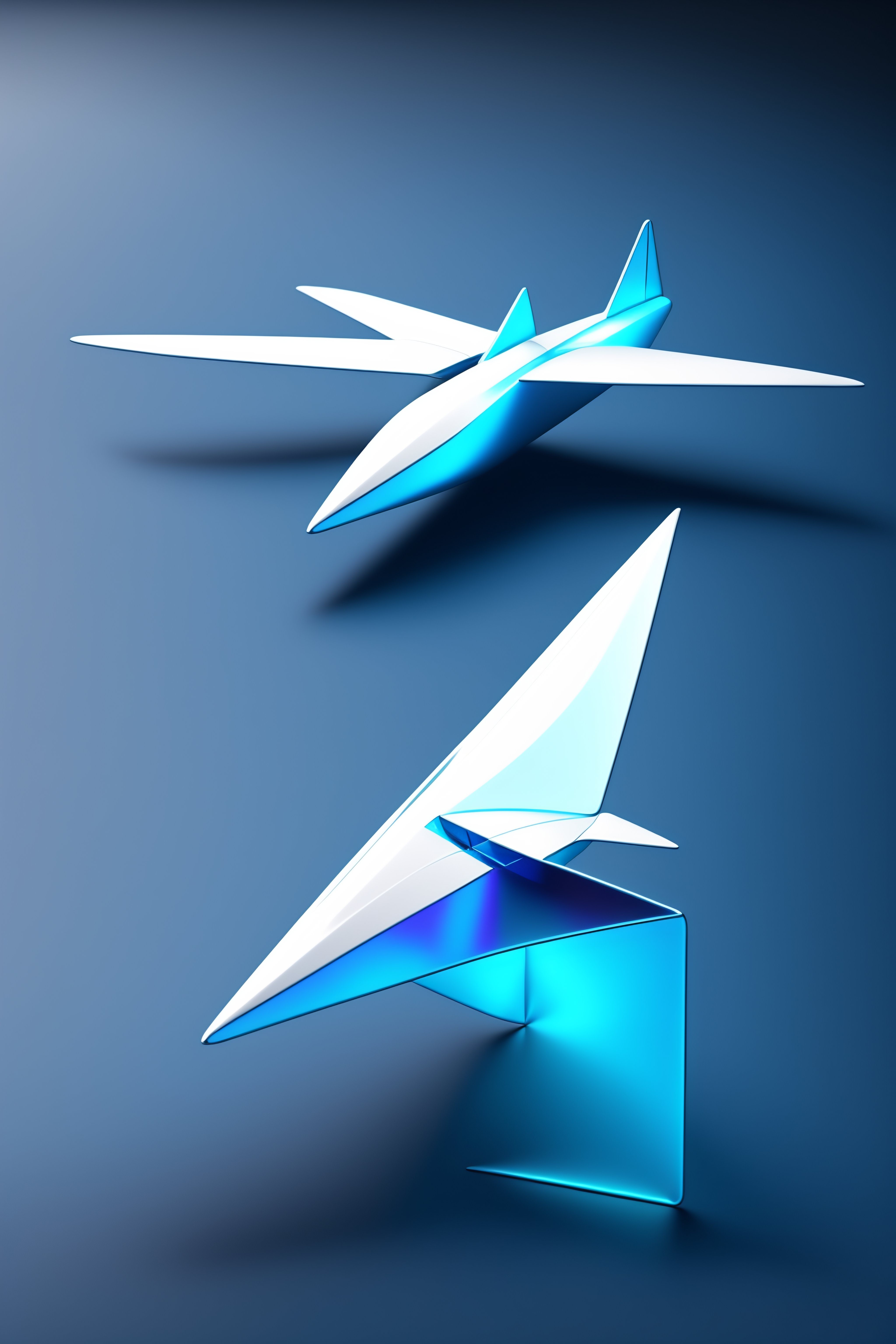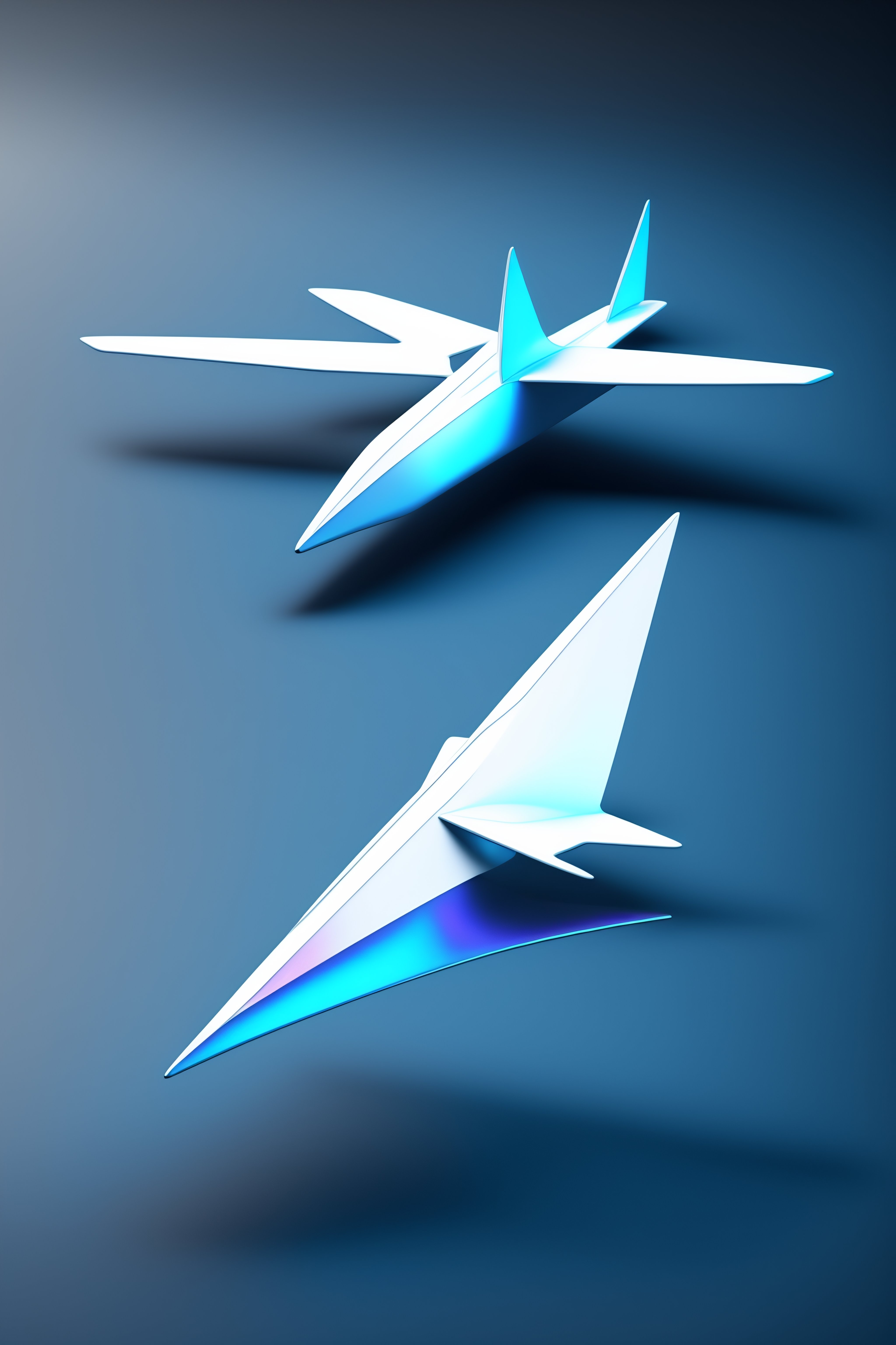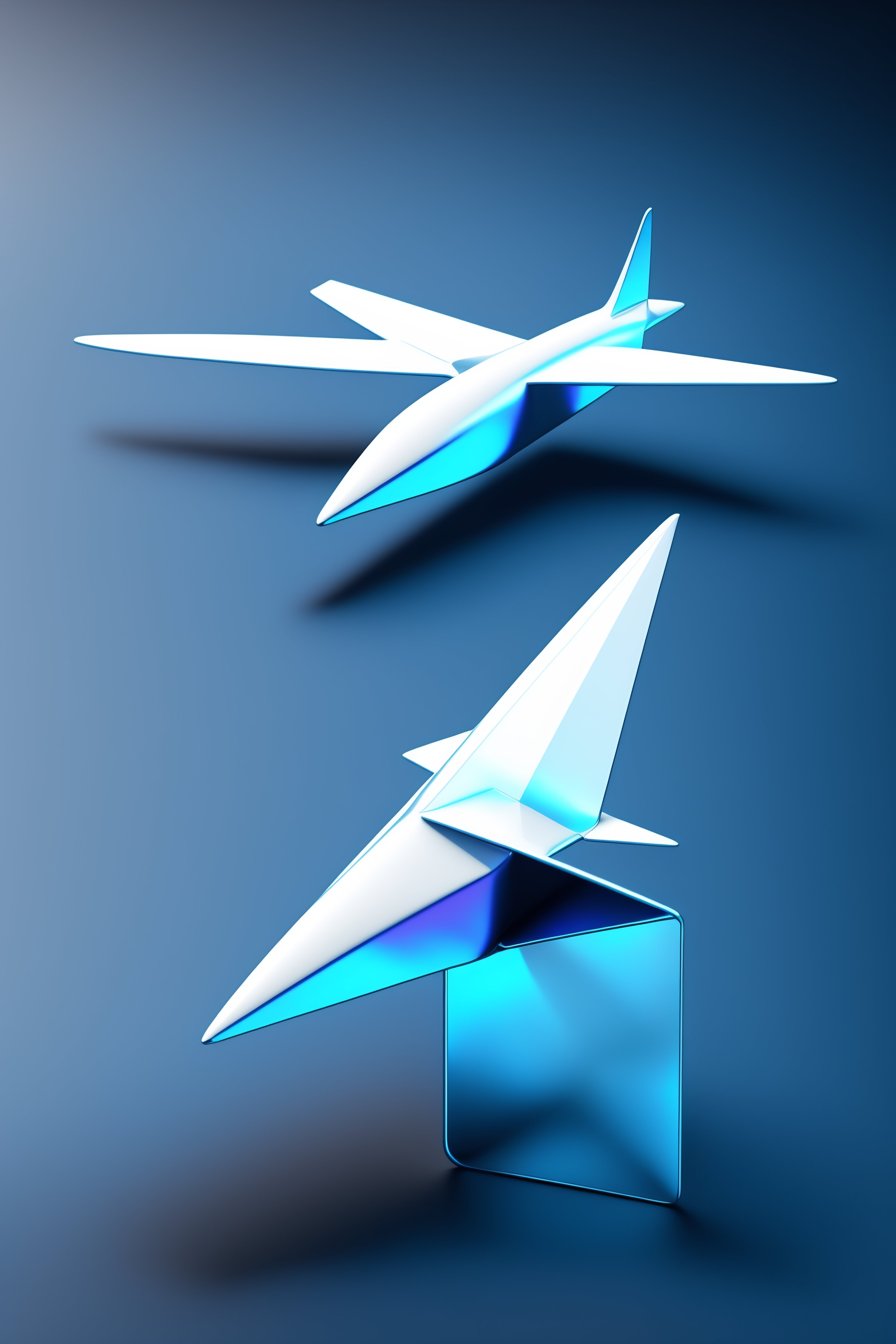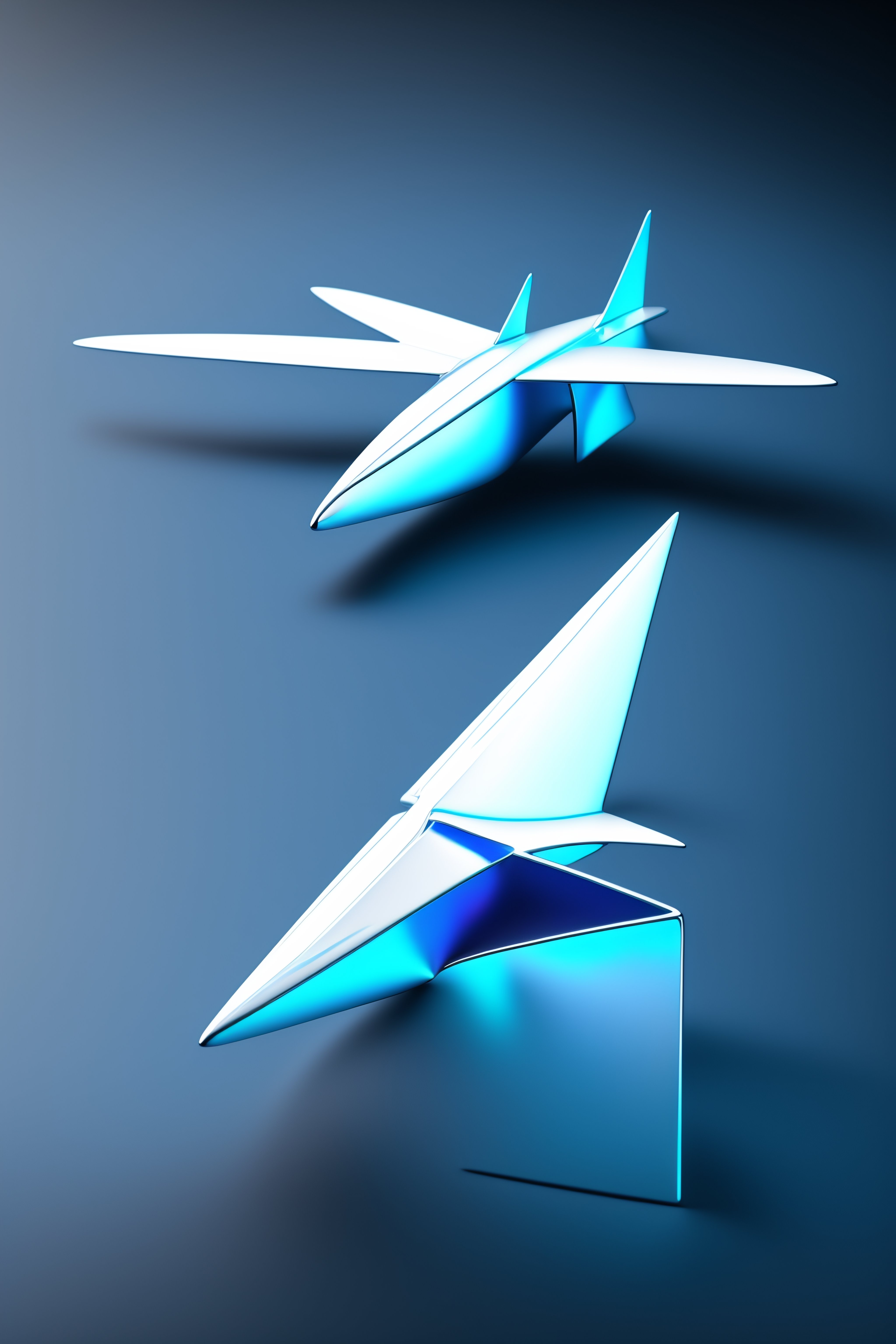 Model of paper plane in light blue metallic iridescent material, 3d render isometric perspective on dark background