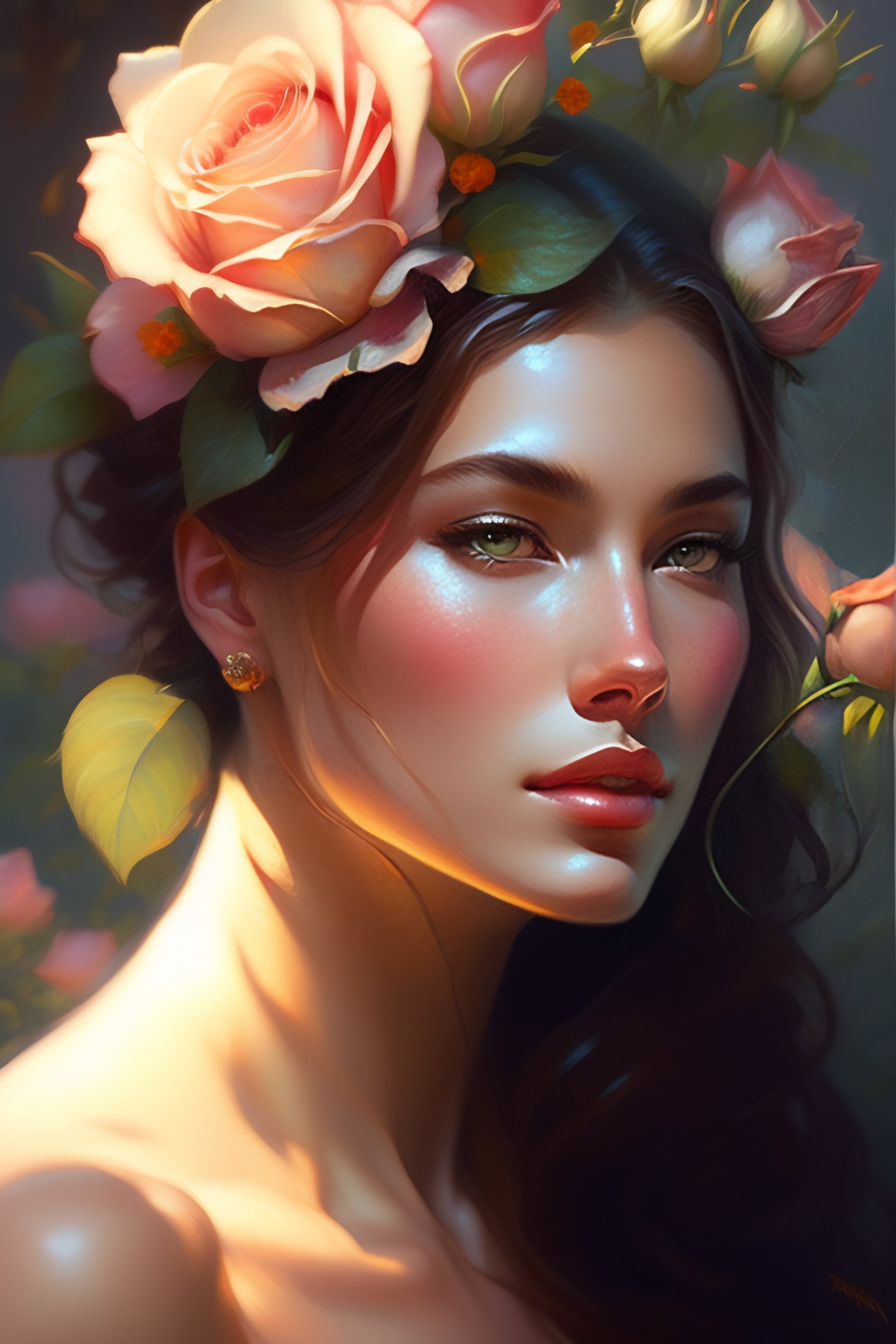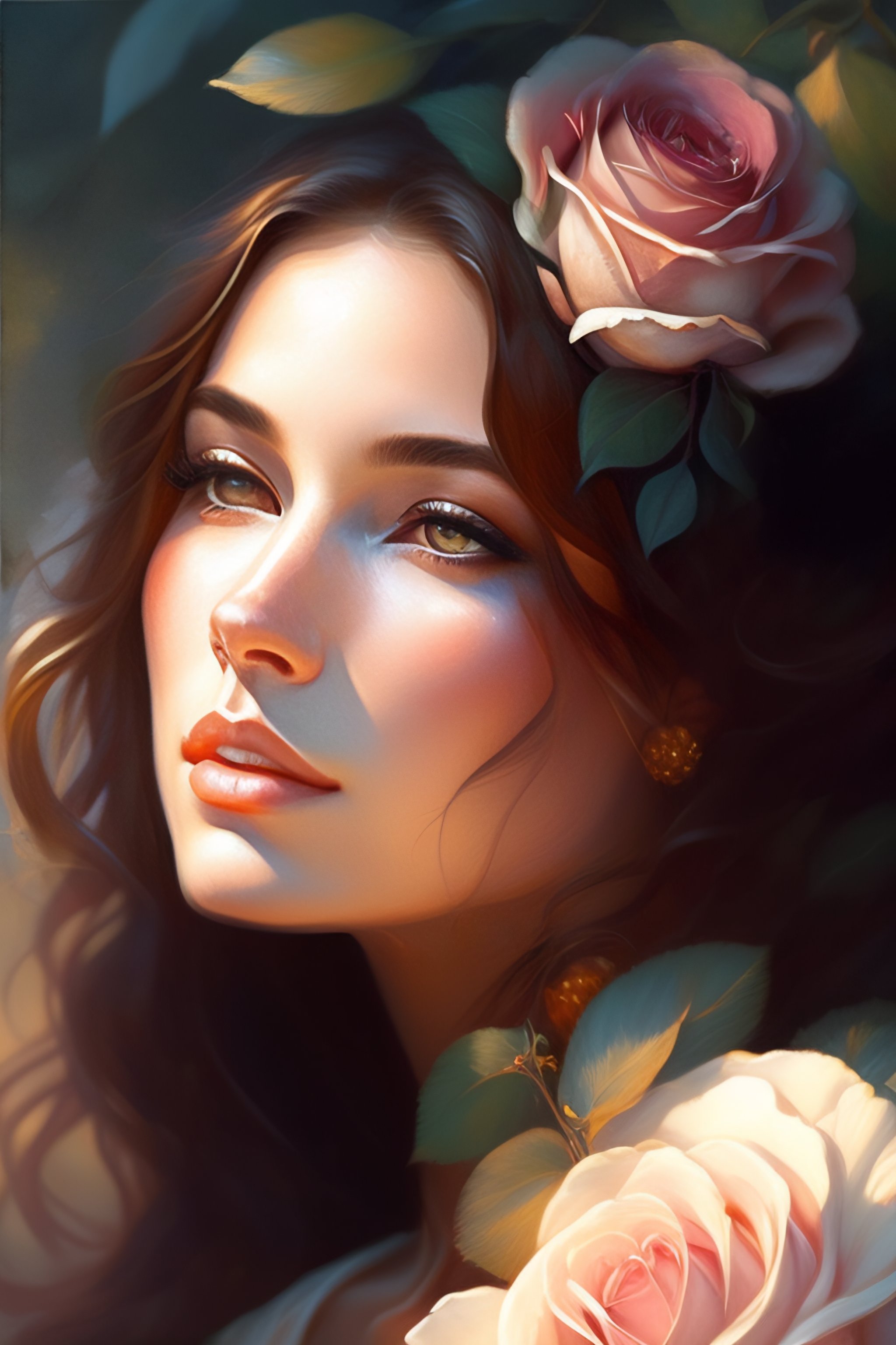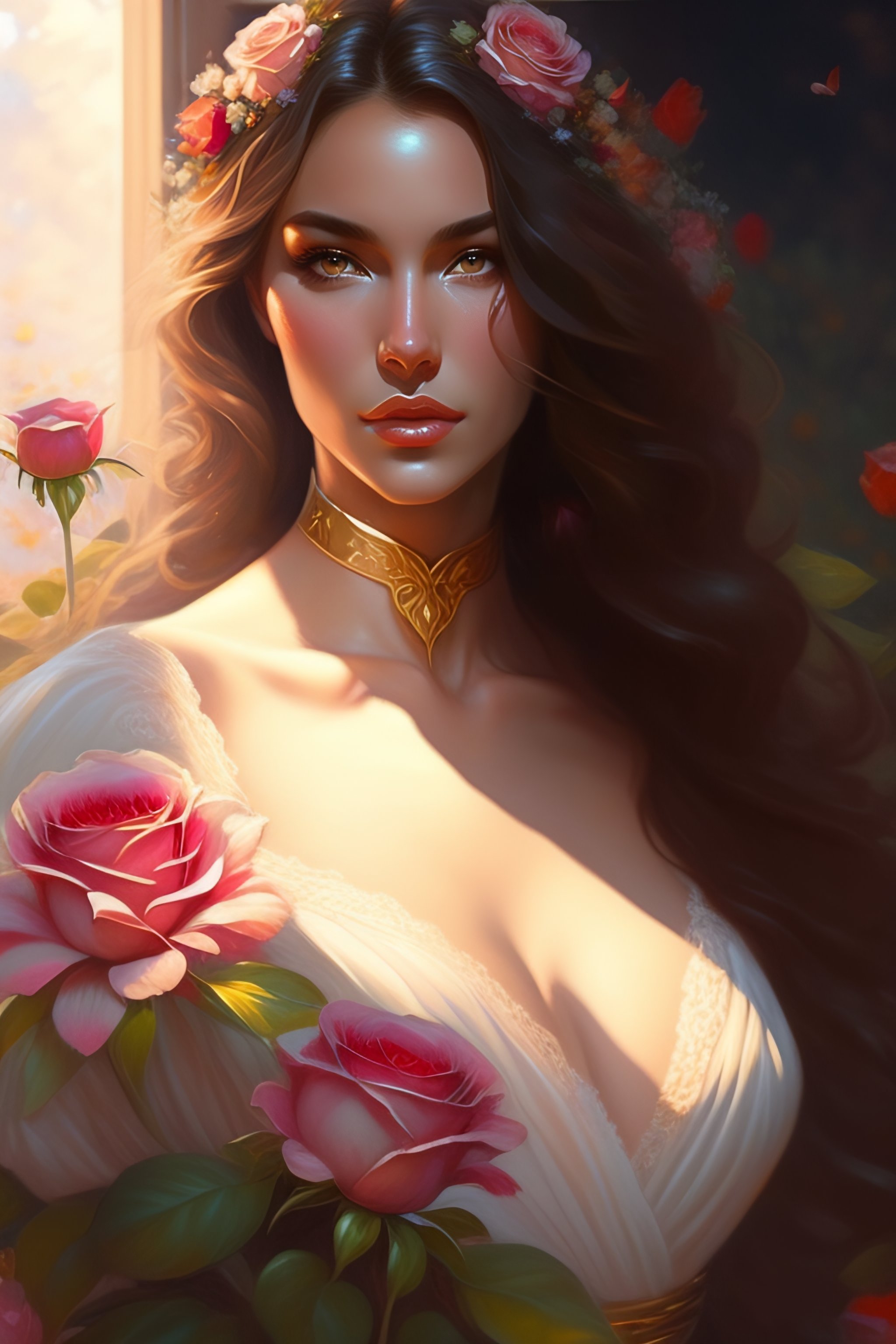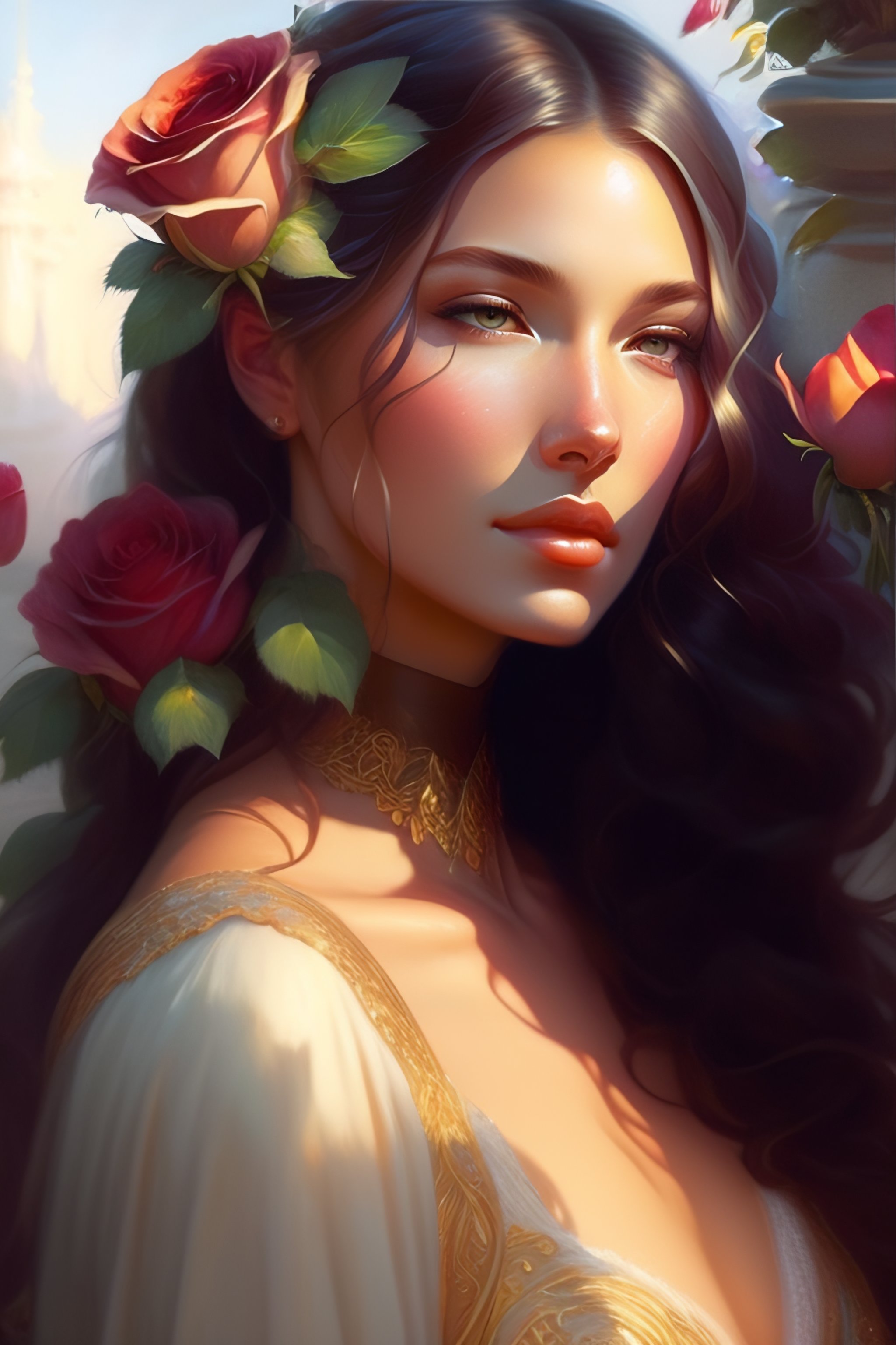 Beatiful woman smelling a flower, roses everywhere, highly detailed, digital painting, artstation, concept art, smooth, sharp focus, illustration, art by artgerm and greg rutkowski and alphonse mucha
