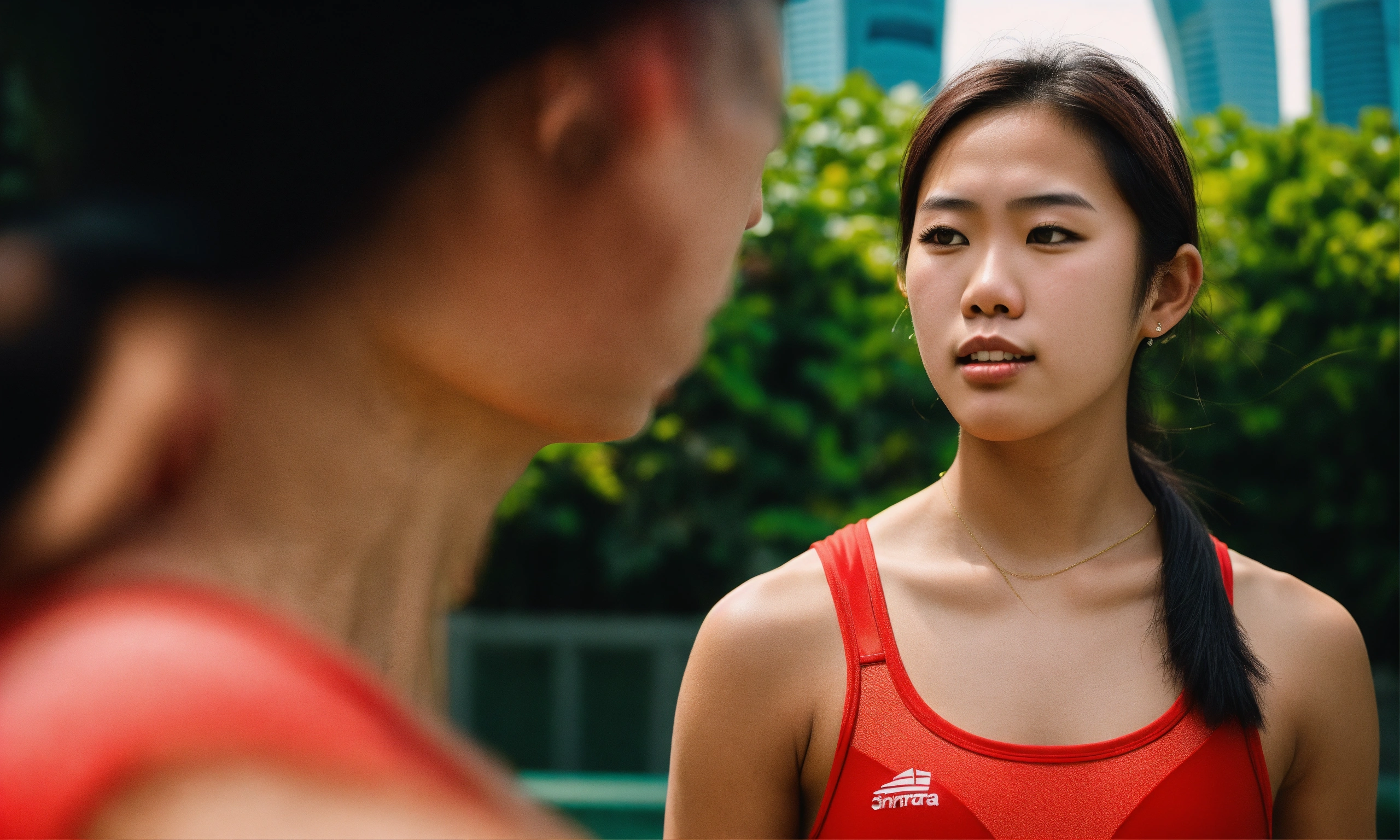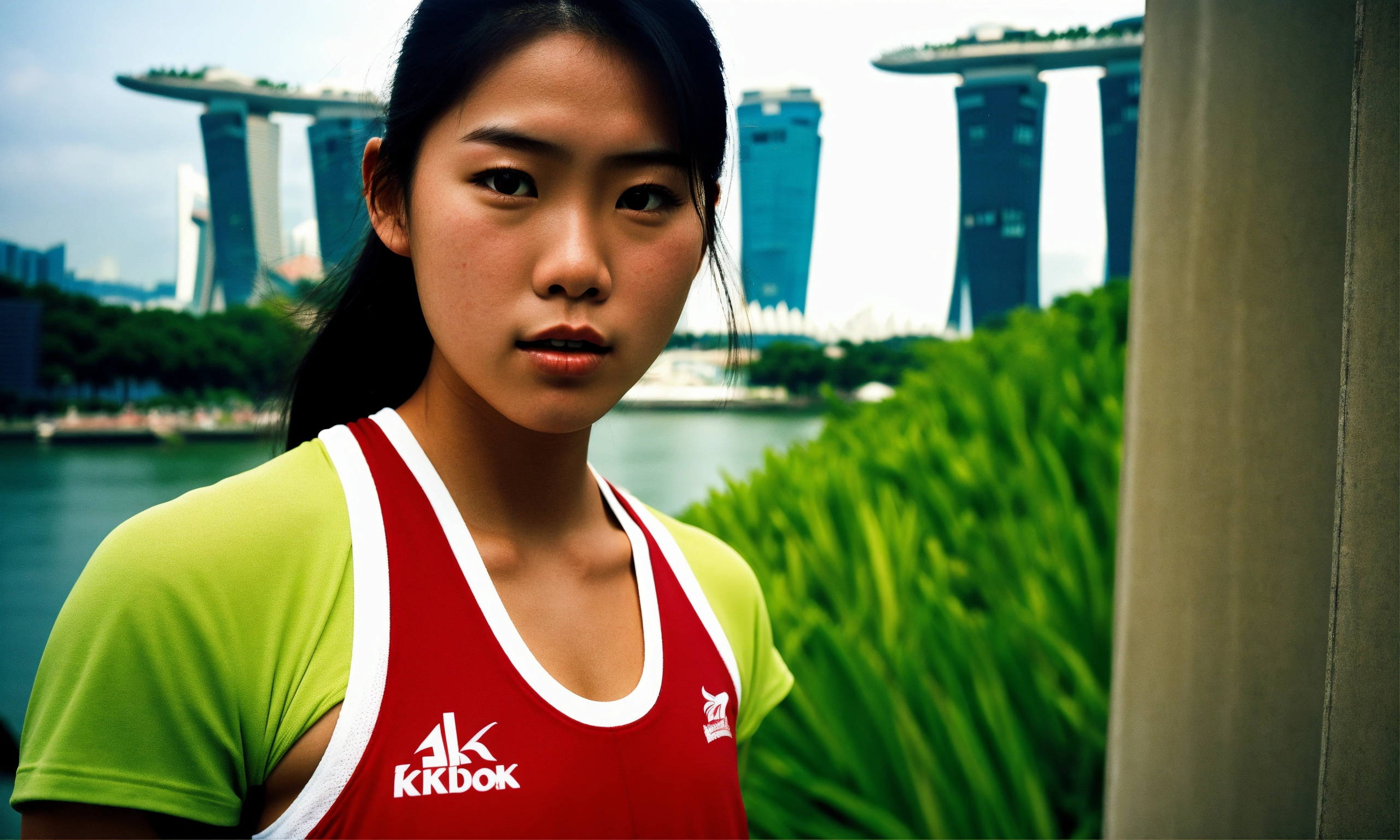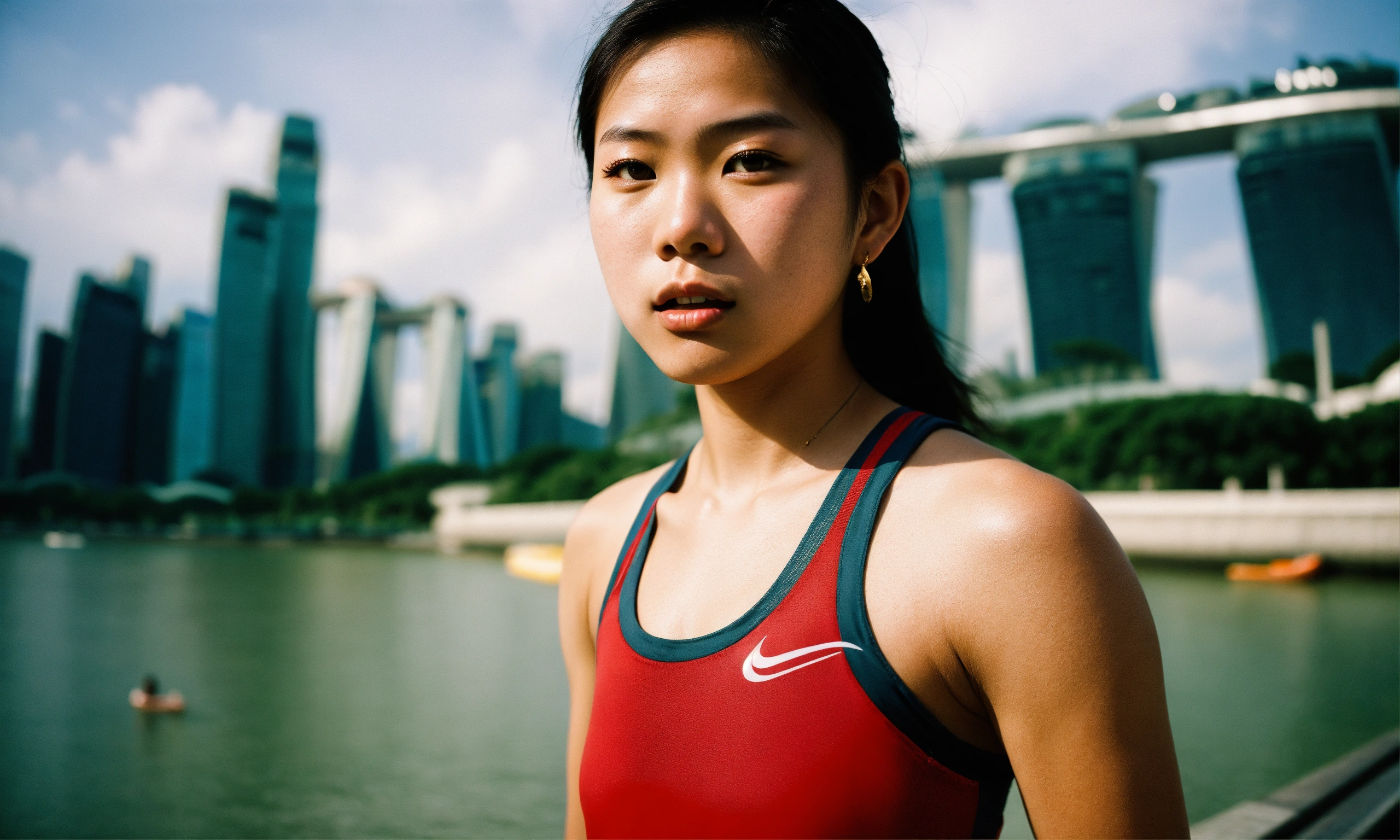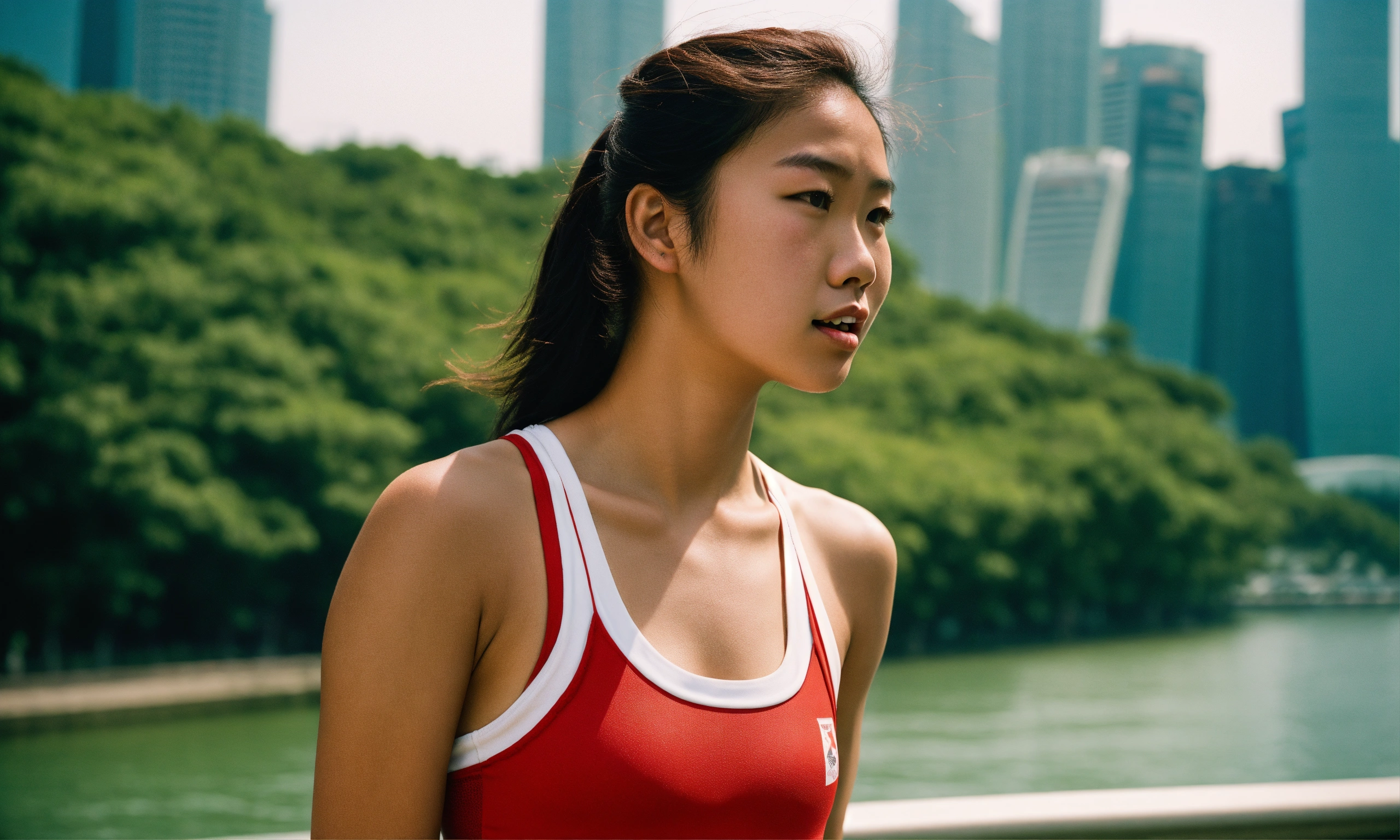 Sunny day, close up side shot, tanned athletic 18-year-old asian girl, national athlete, a plain red singlet, surprised, amazed, mouth closed, backdrop is singapore's marina bay sands, greenery, shot using a leica summicron 35mm f2.0 lens. kodak portra 400 film, cinematic richness