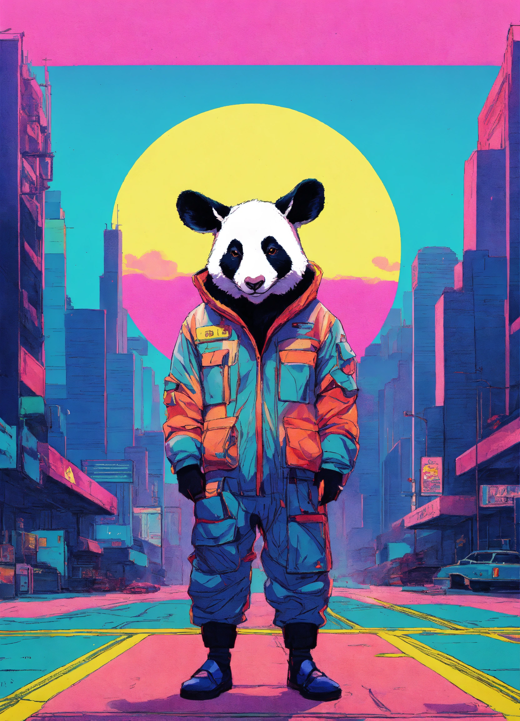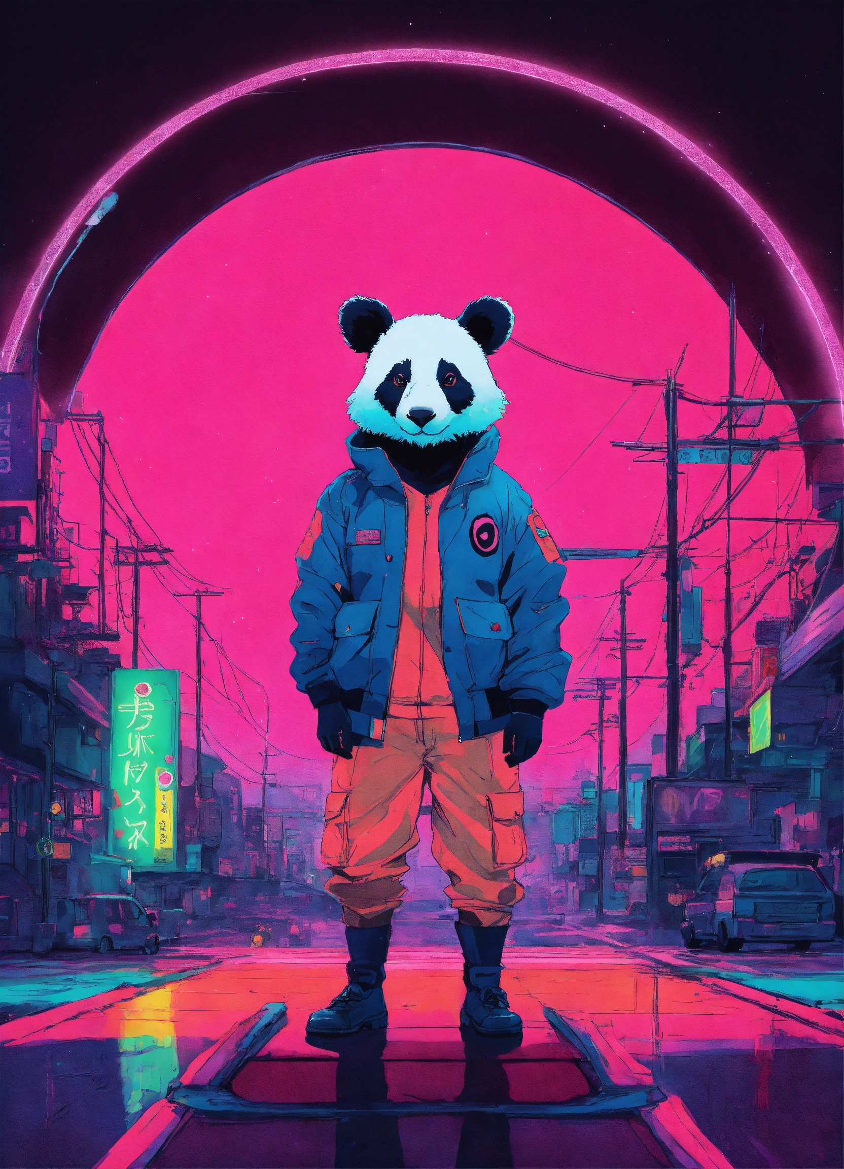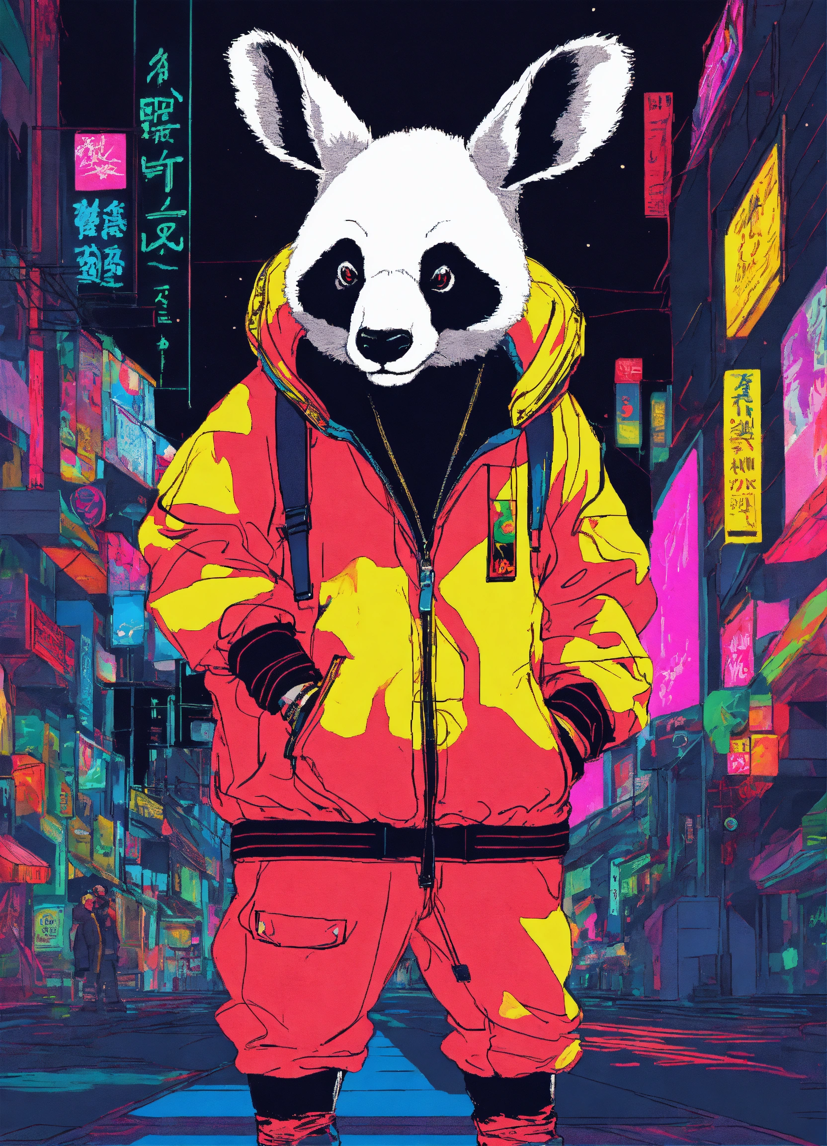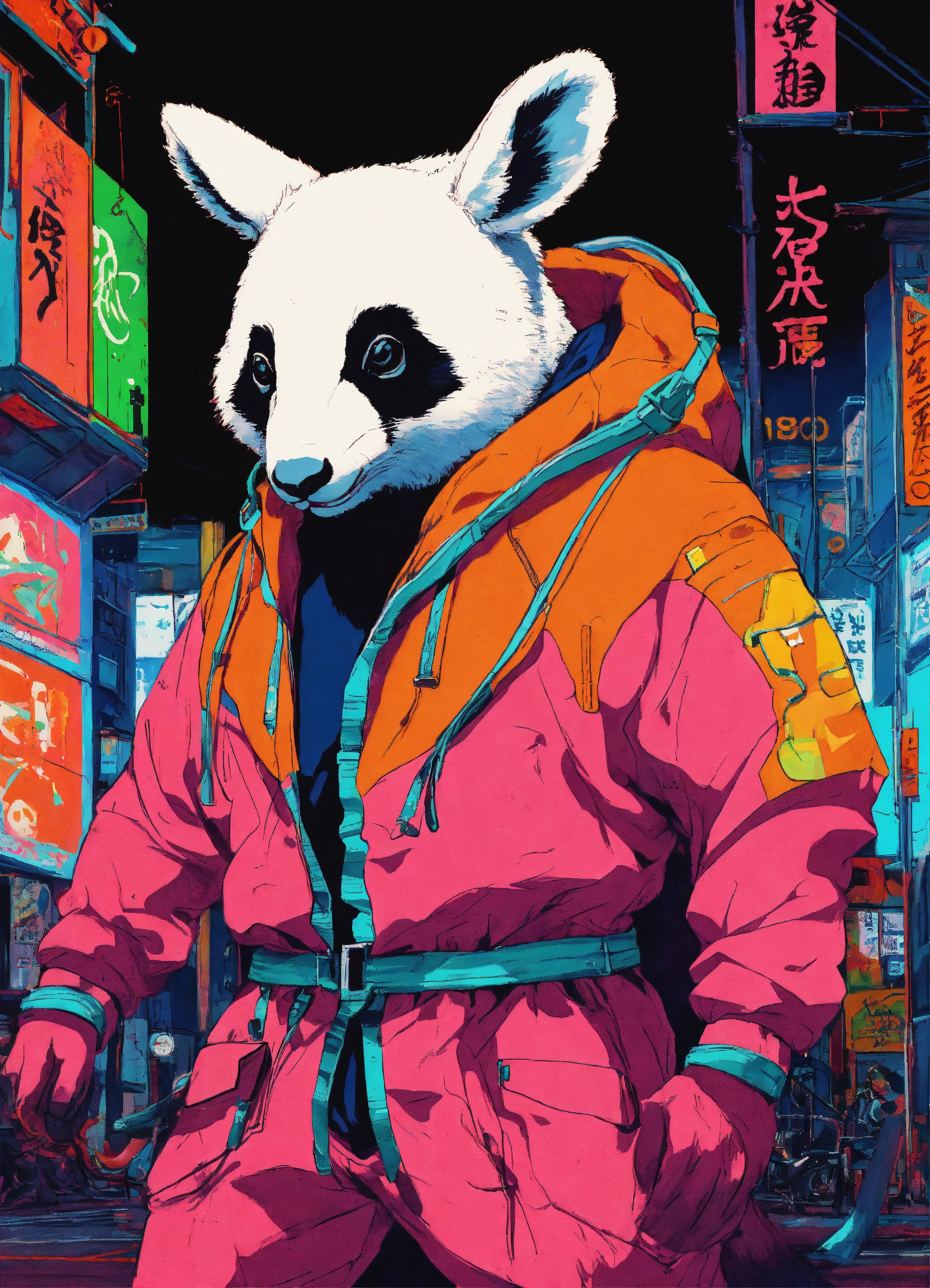 In the style of 90's vintage anime, surrealism, akira style. fine details. a kangaroo dressed like a panda. neon