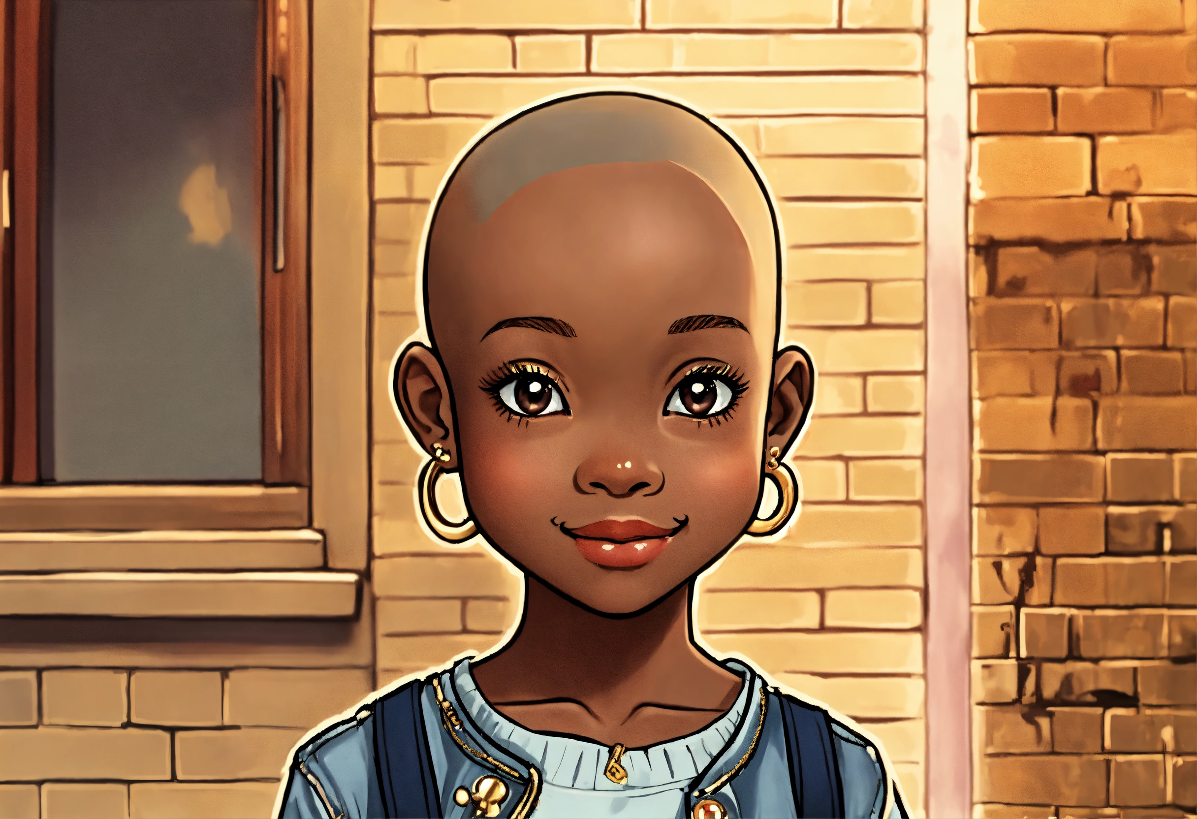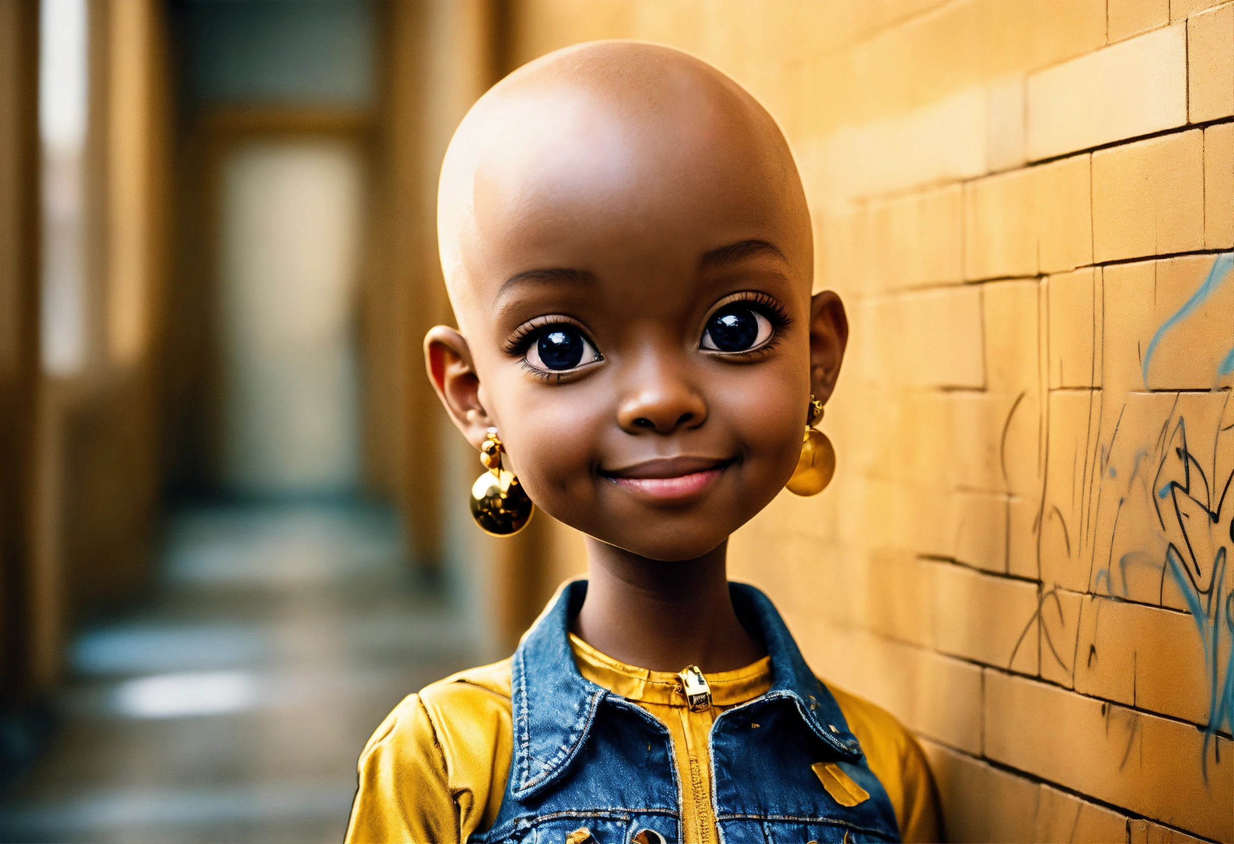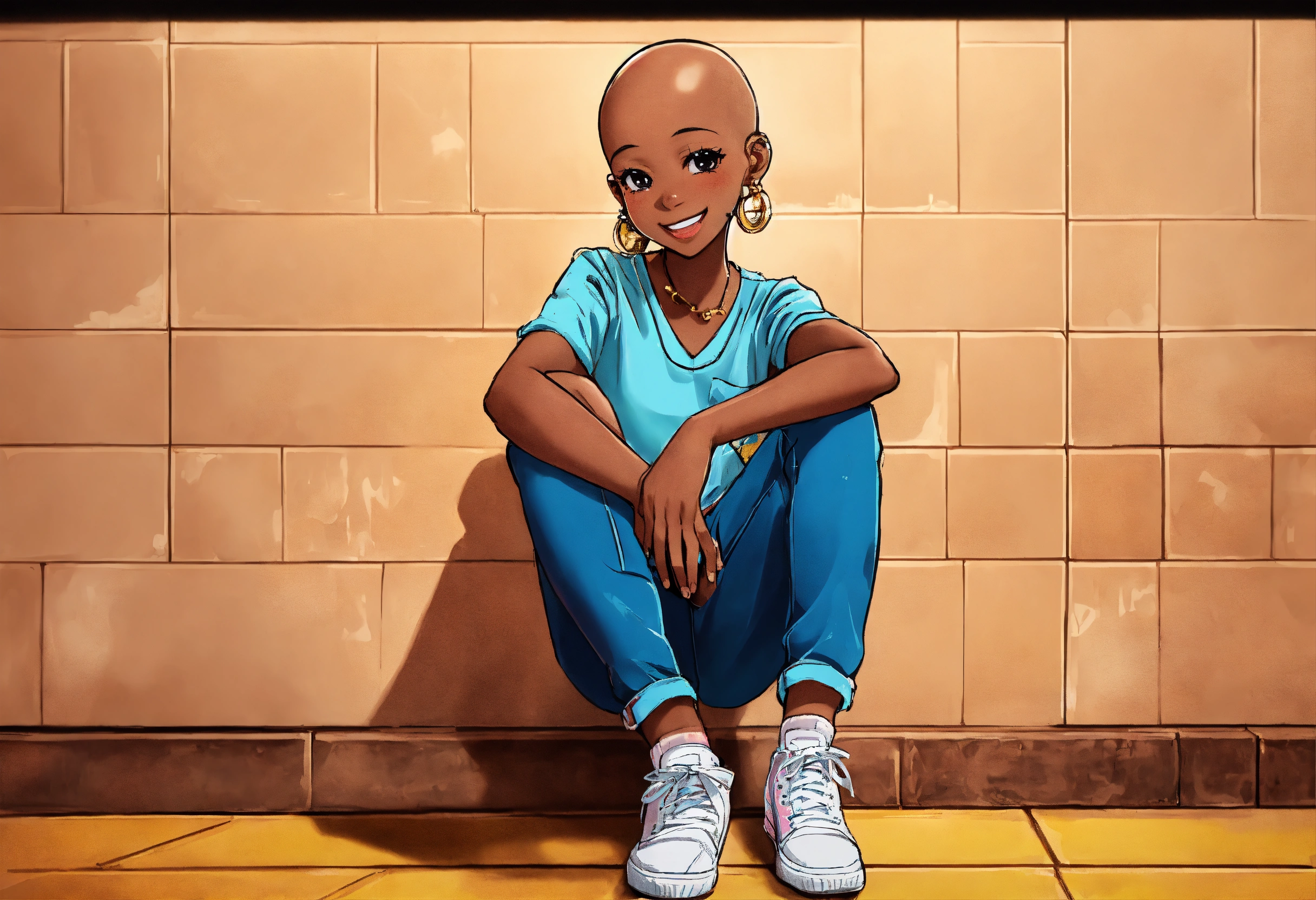 Hd manga kewpie anime mahogany dark complexion african american 12 year old smiling bald girl with full alopecia, small gold stud earrings, wearing denim street wear style standing and leaning her leg against a plaster wall in a school hallway, alopecia awareness, bald head and no eyebrows, airbrush graffiti art style