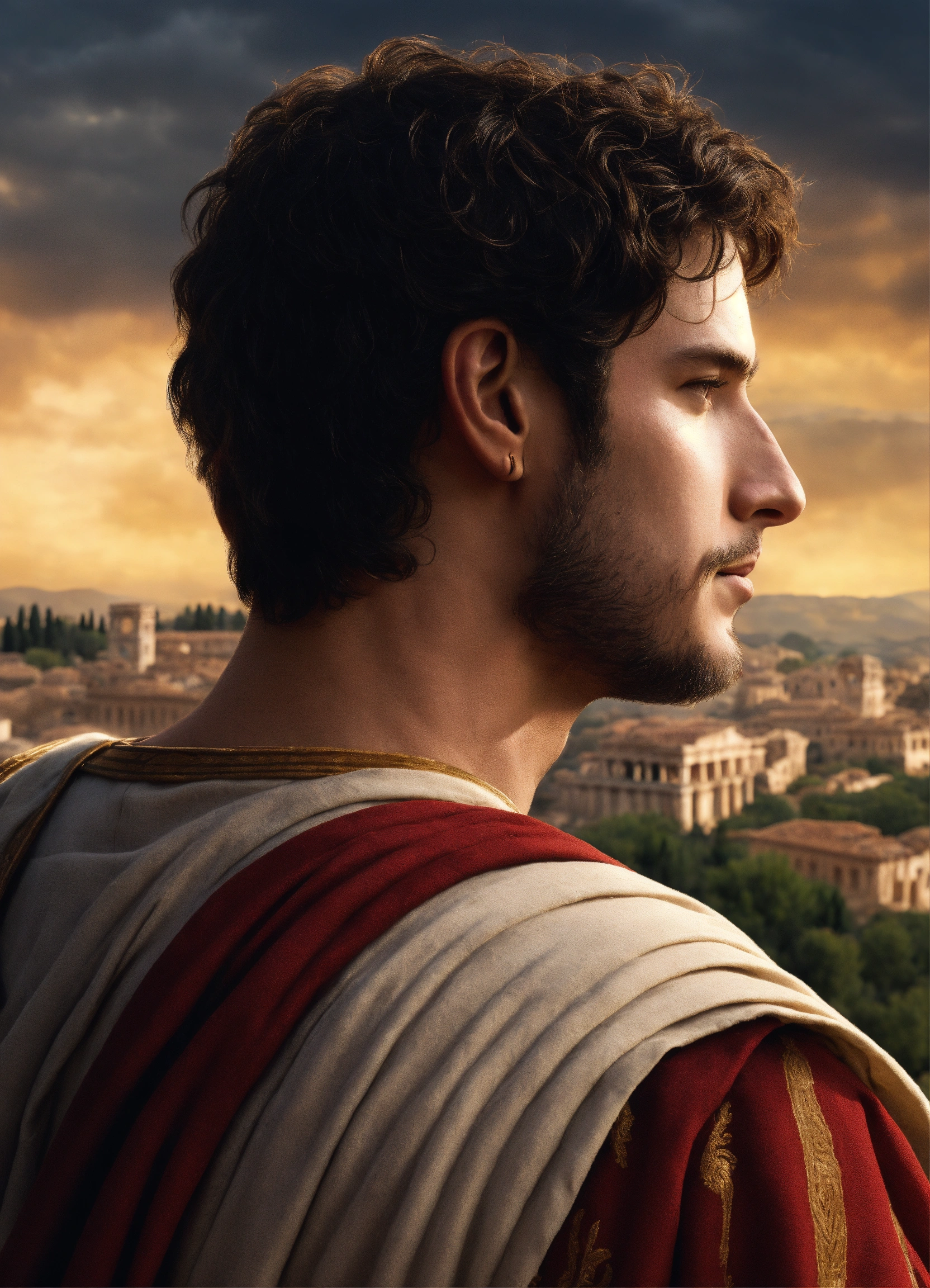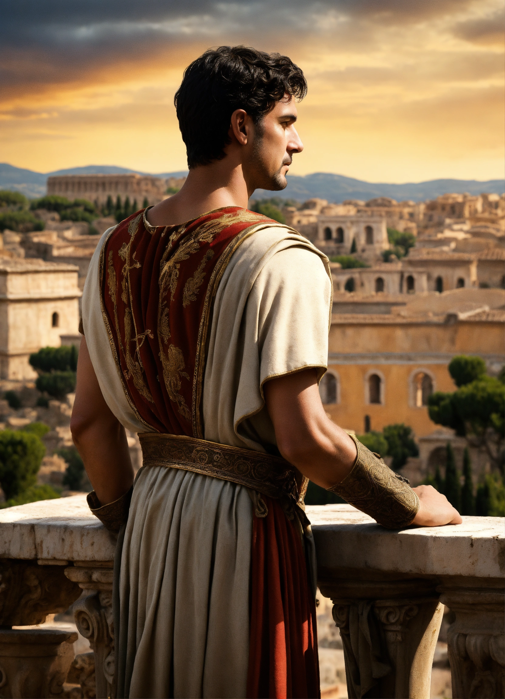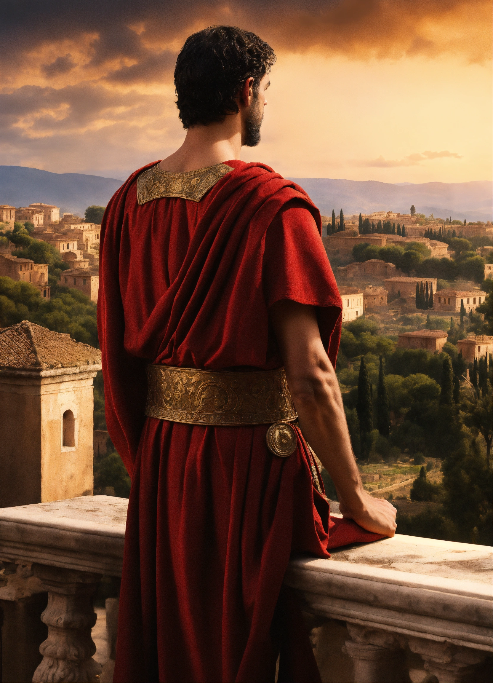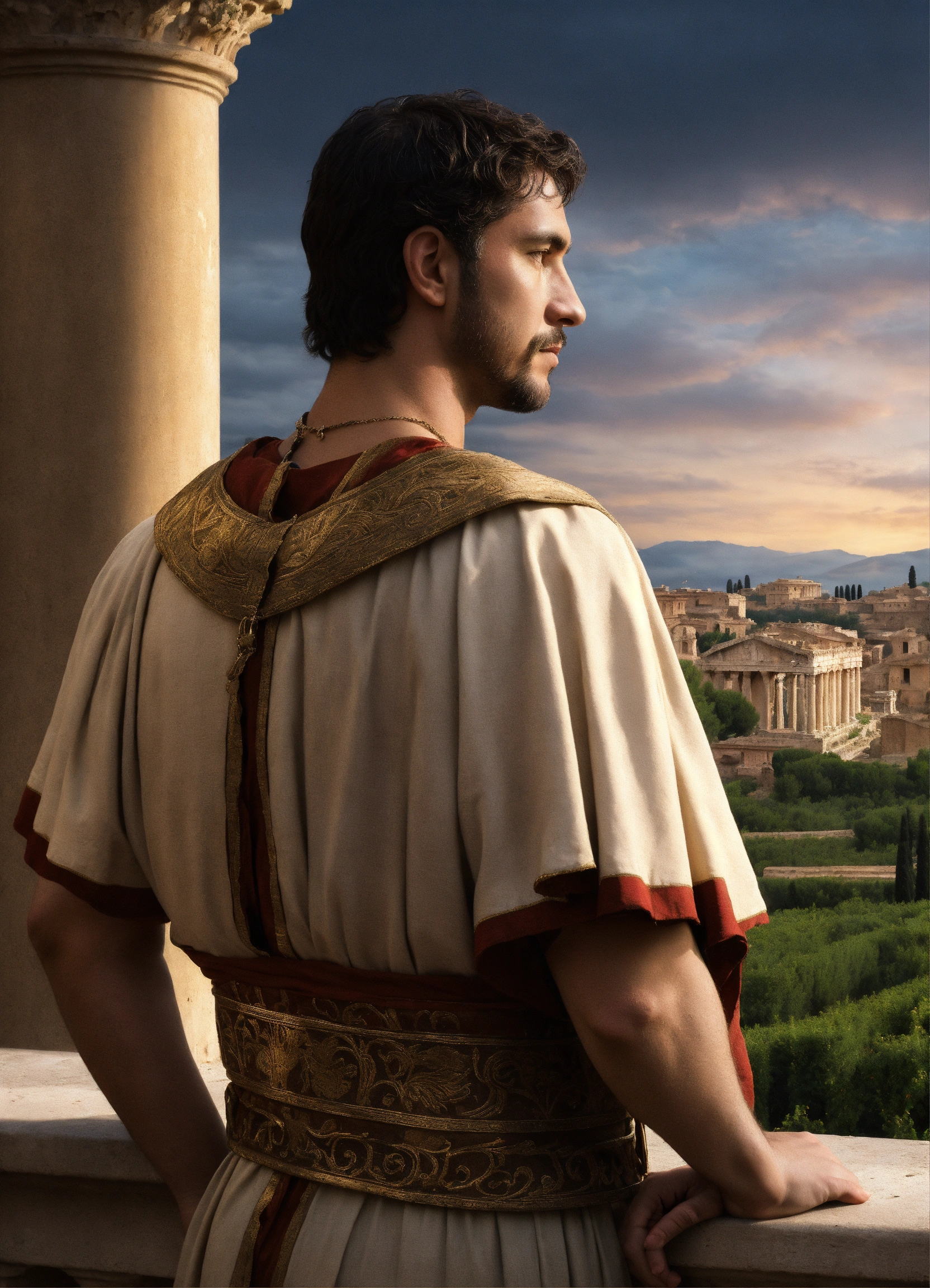 Close-up back view of a young, tall, noble, thin, slender, handsome, short hair, dark-haired roman tribune wearing simple historical roman clothes, light-colored light tunic, solemn, 50 years old, historically accurate, ancient rome, he is looking to the landscape of vineyards from the balcony of his rich and colored roman villa, detailed decor, photo realistic, hyper detailed, it is night. photo realistic, hyper detailed, and historically accurate to ancient rome. the sky is dark and cloudy. noble, calm, hedonist, amused. book cover.