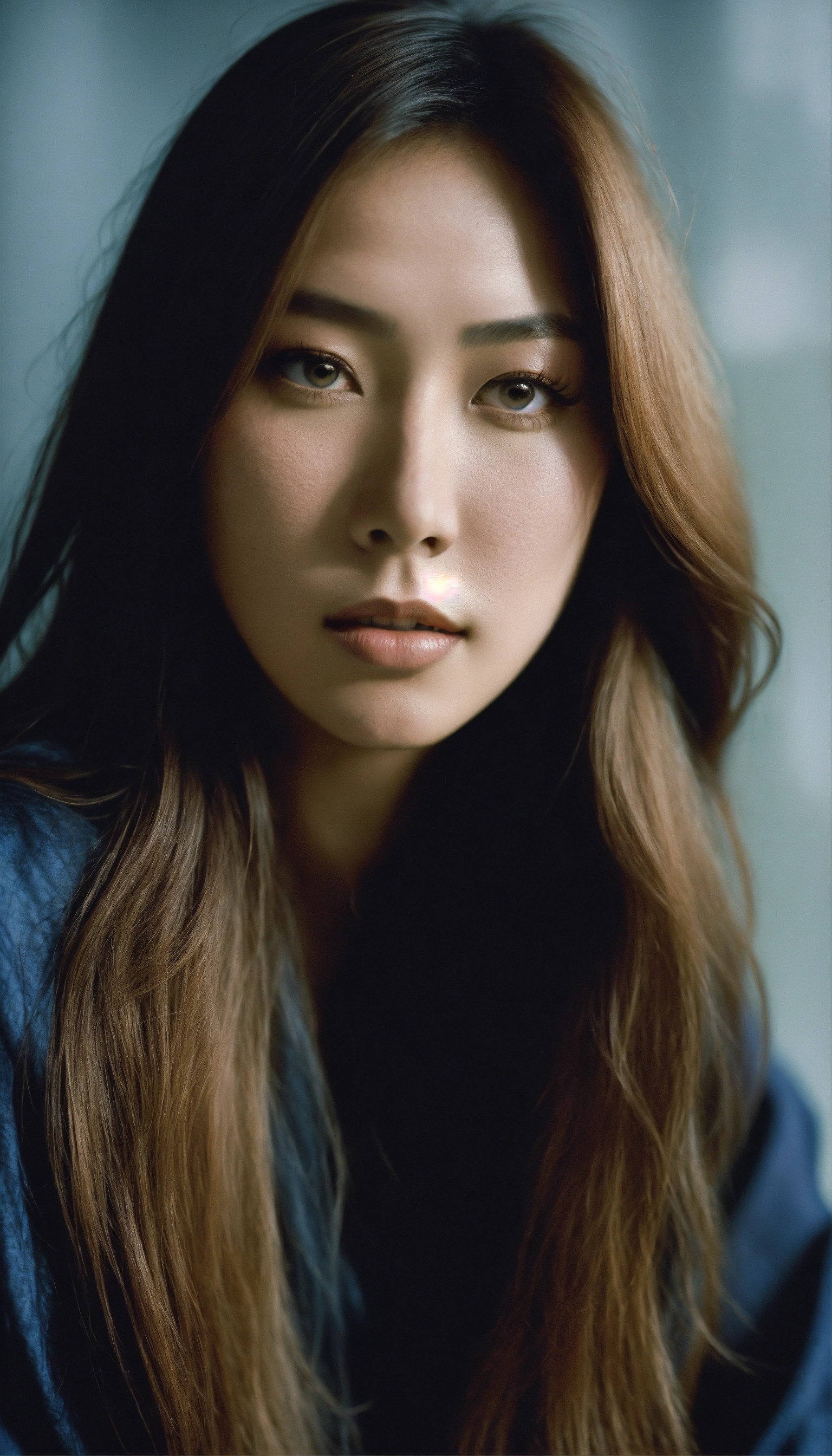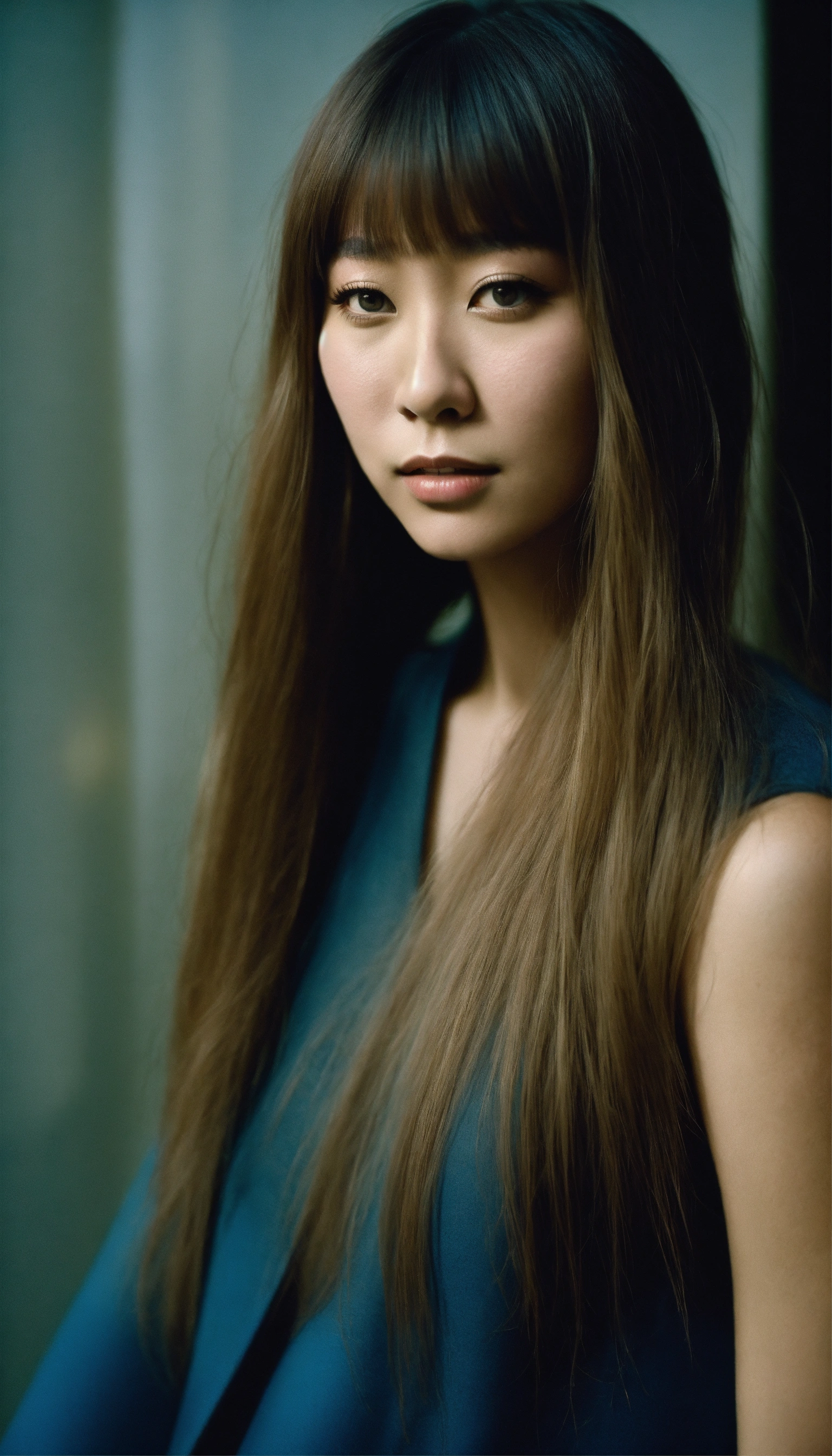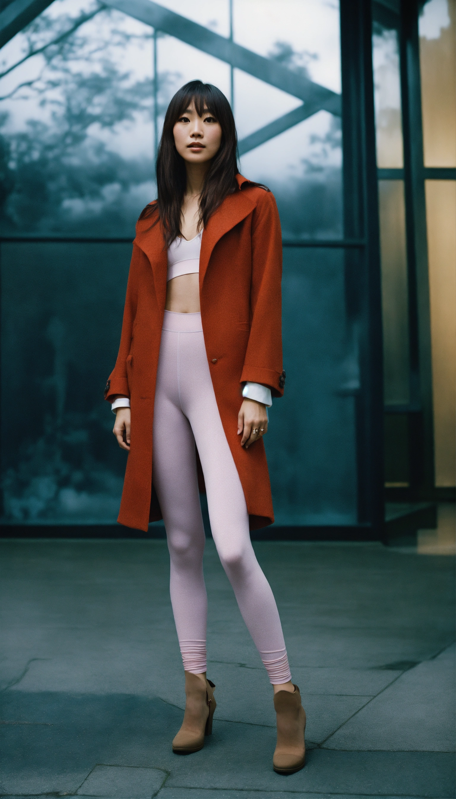 Portrait of an exquisite alluring japanese-swedish singer with long straight hair, wearing athletic leggings, ethereal dreamy foggy, photoshoot by cindy sherman, editorial fashion magazine photoshoot, fashion poses, in front of the modern art gallery. kinfolk magazine. film grain. a soft smile, low contrast, and cinematic lighting.