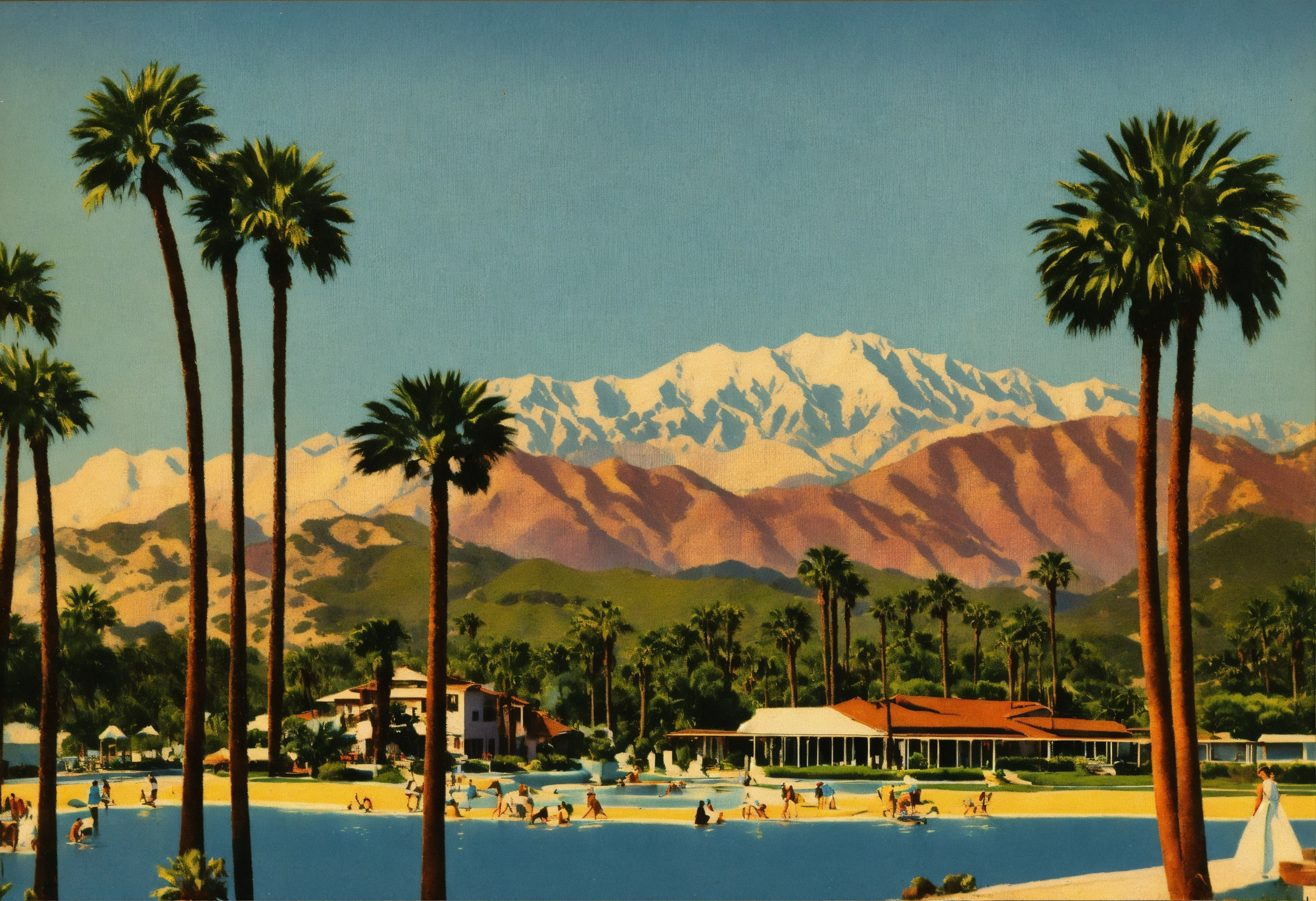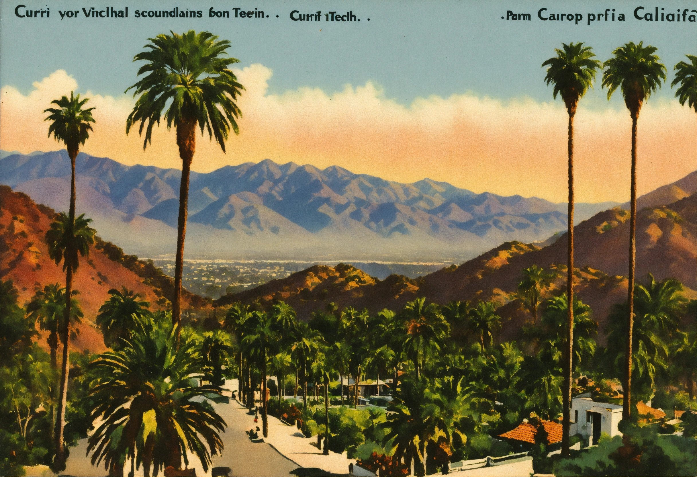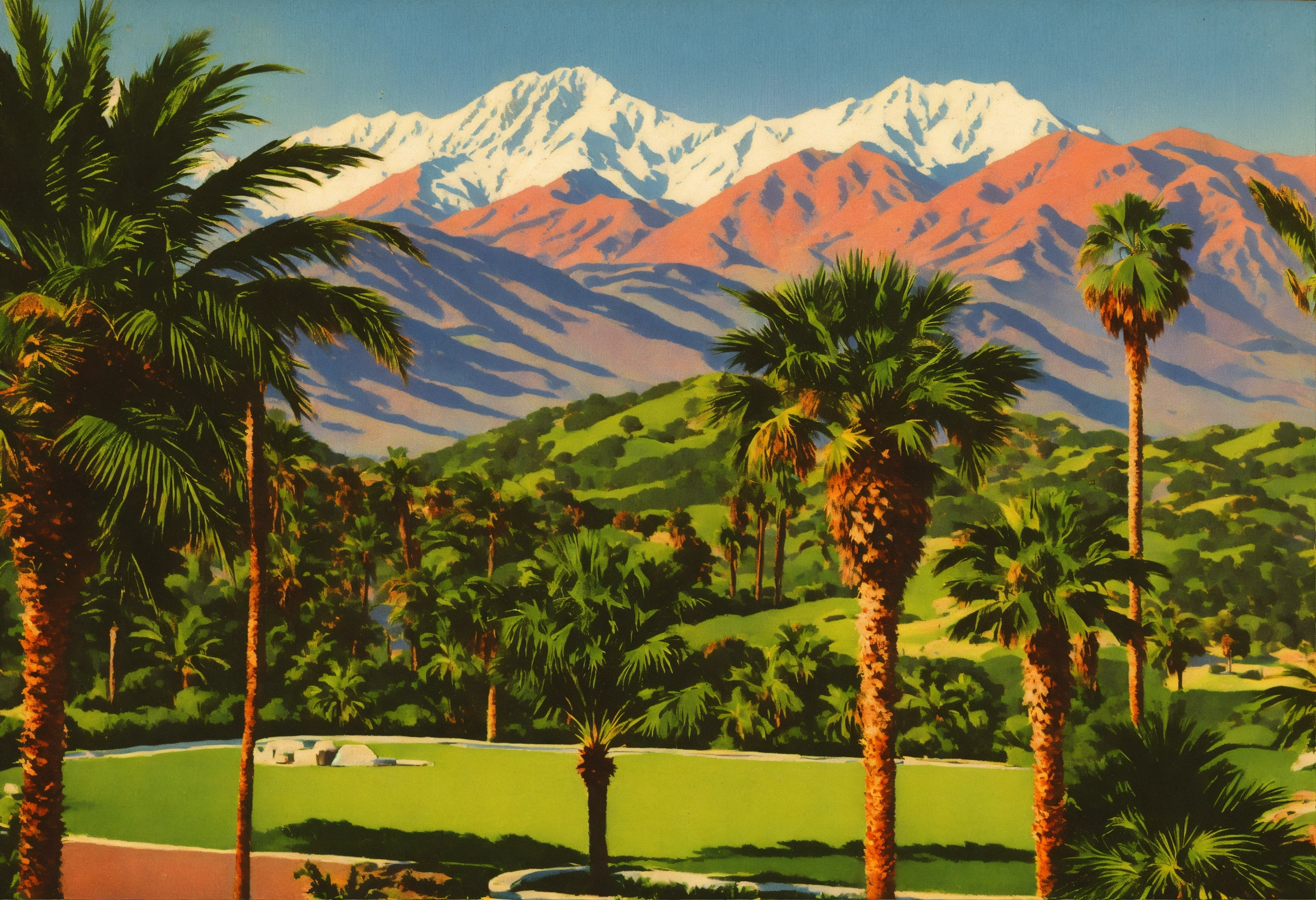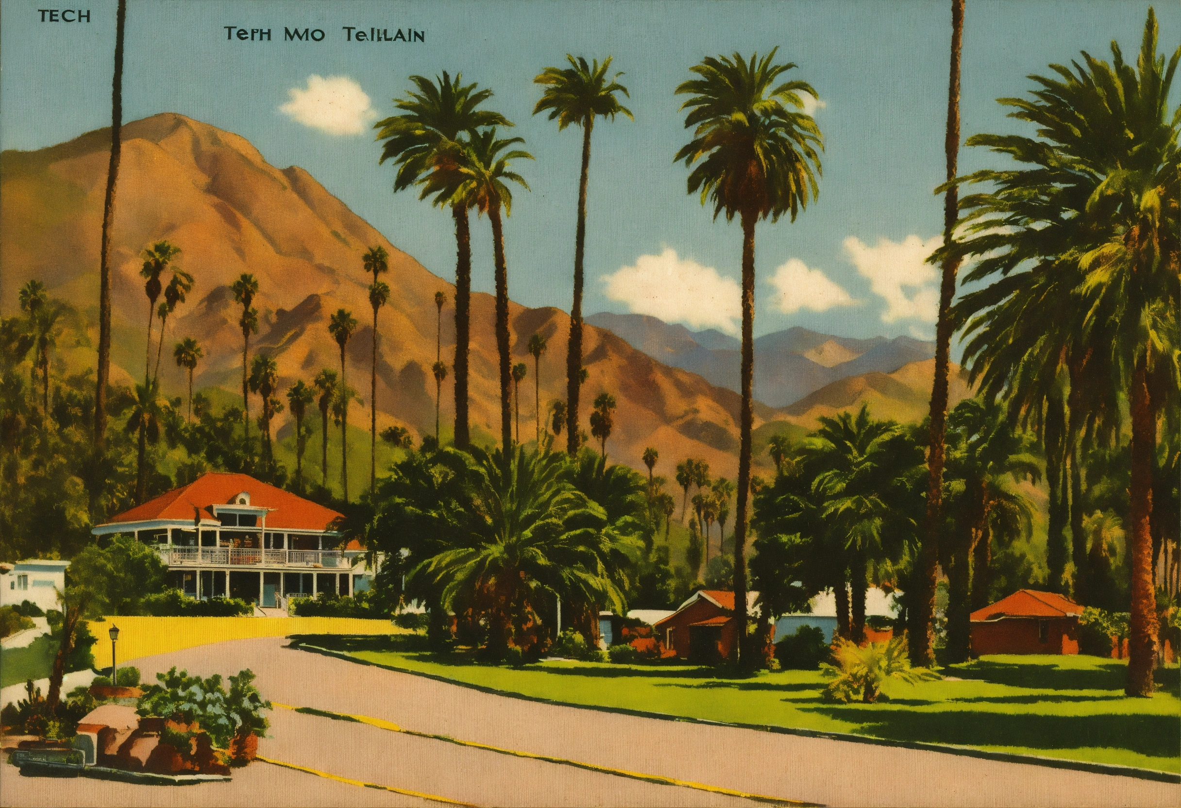 A curt teich vintage postcard of southern california mountains with palm trees in front