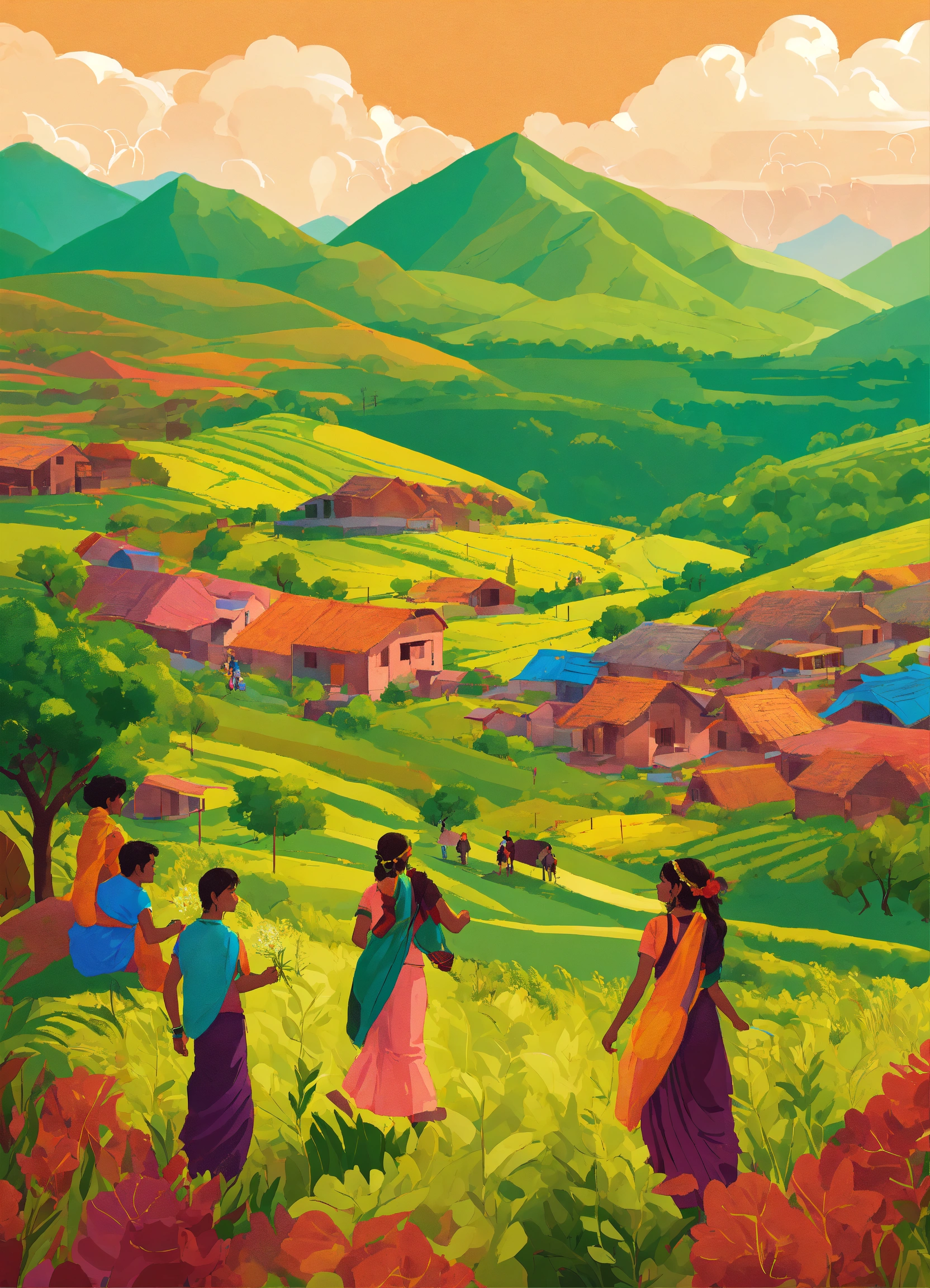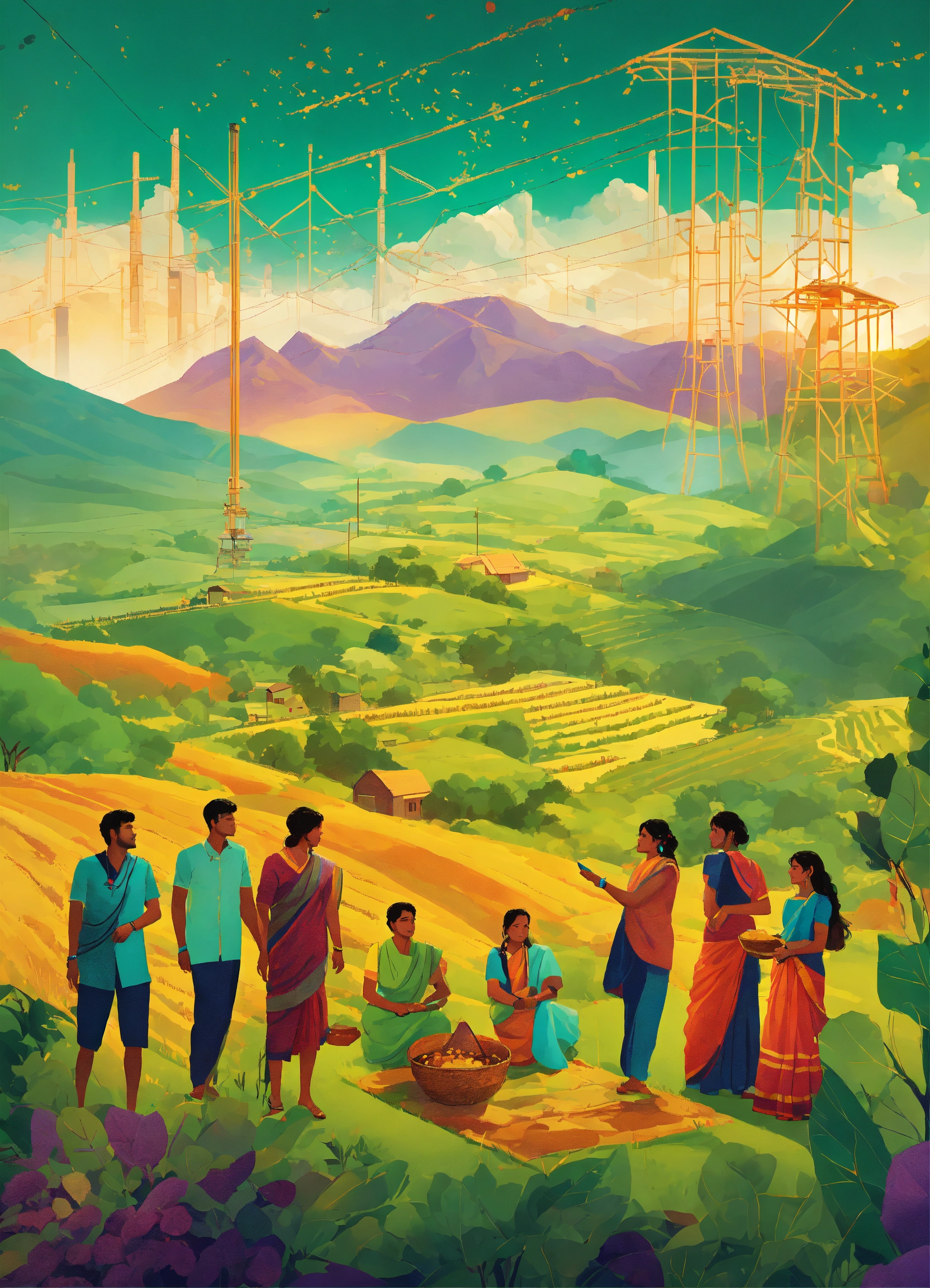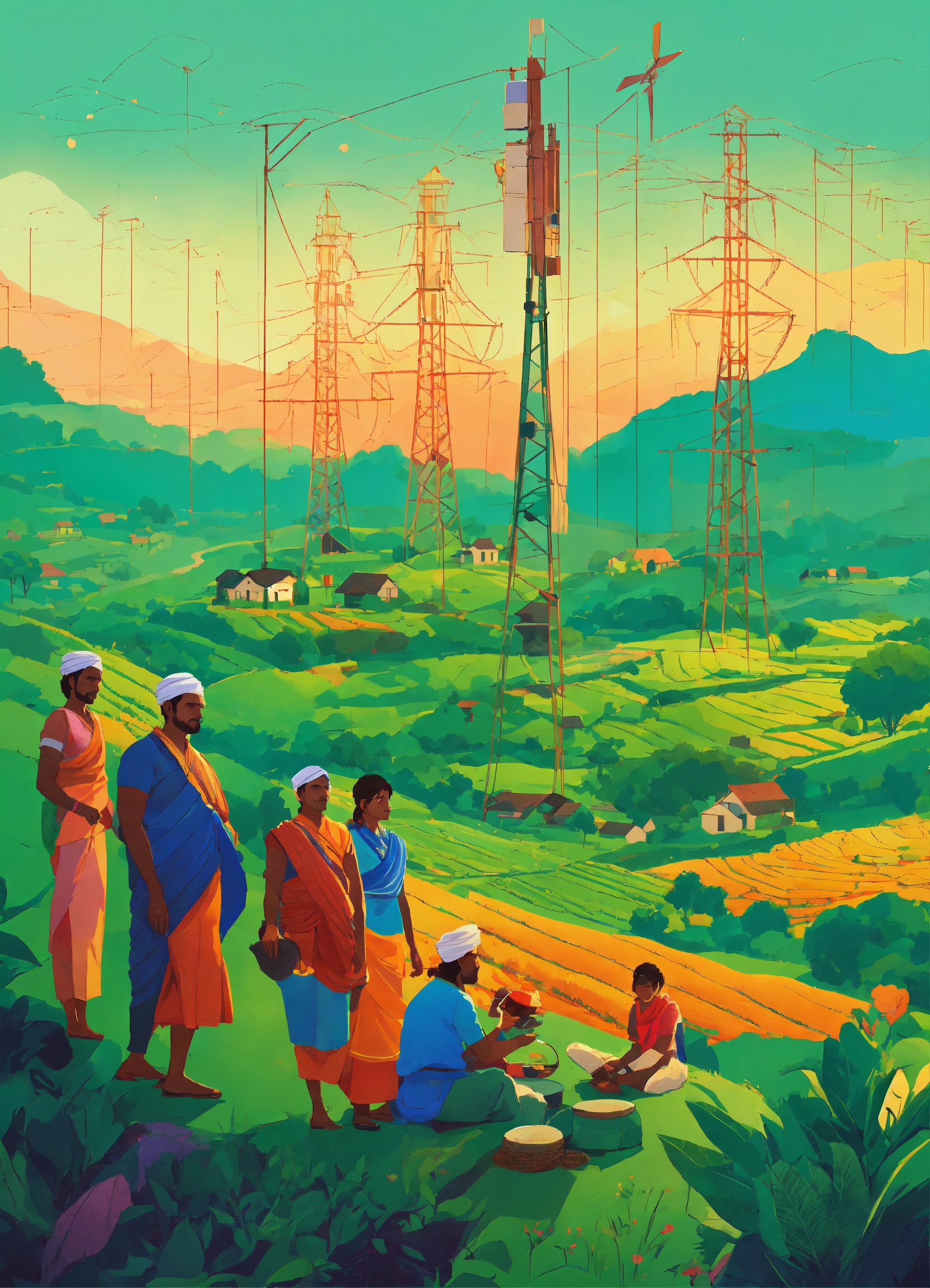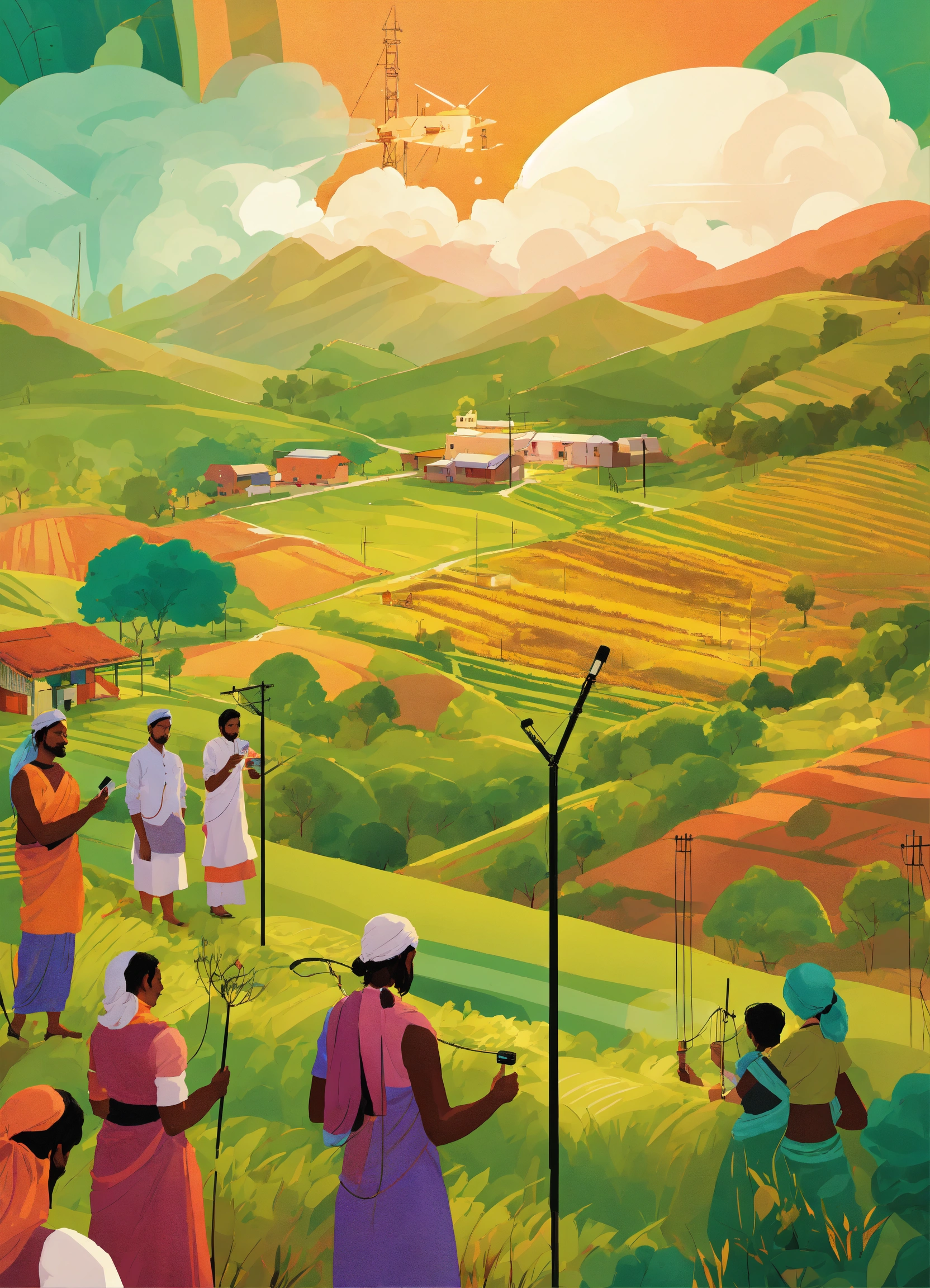 A vibrant digital illustration showcasing the power of air fiber technology in india. the artwork features a diverse group of people from rural communities, surrounded by lush green fields and mountains, all connected through wireless signals. the color palette includes warm tones, symbolizing progress and connectivity.