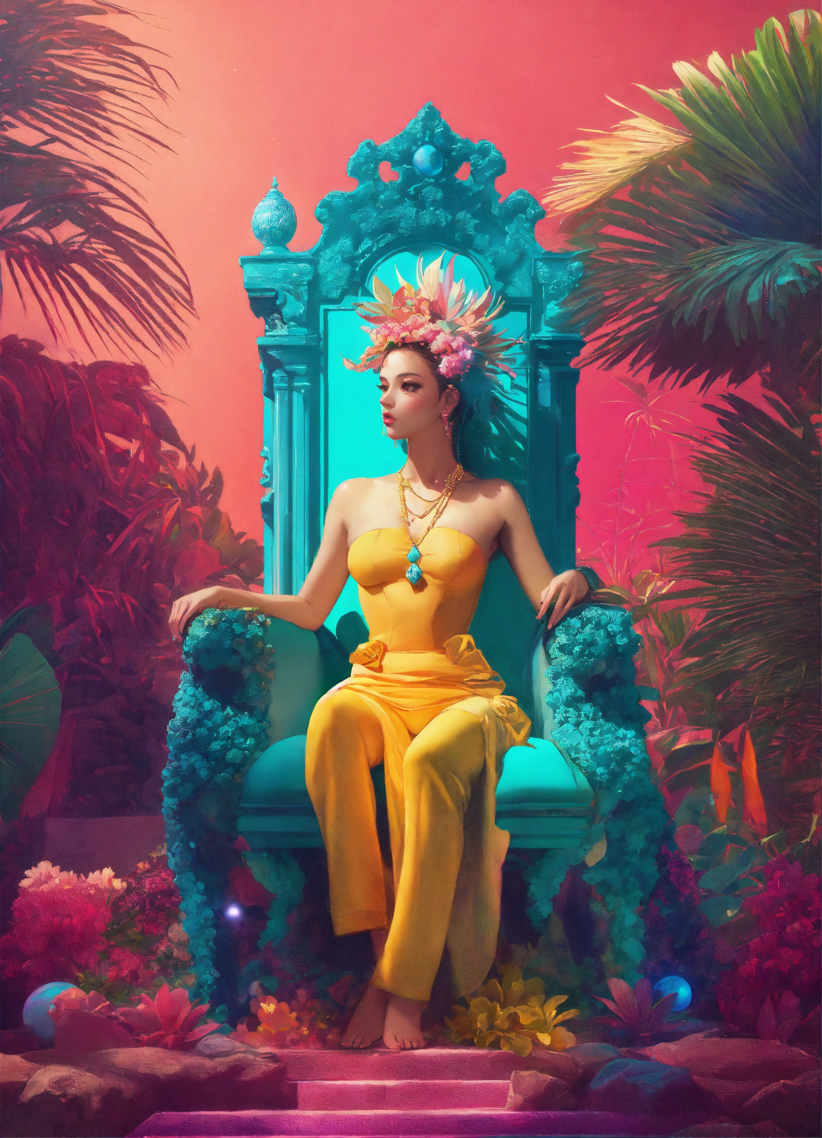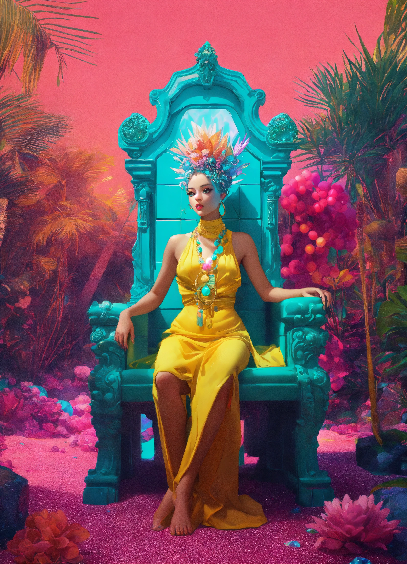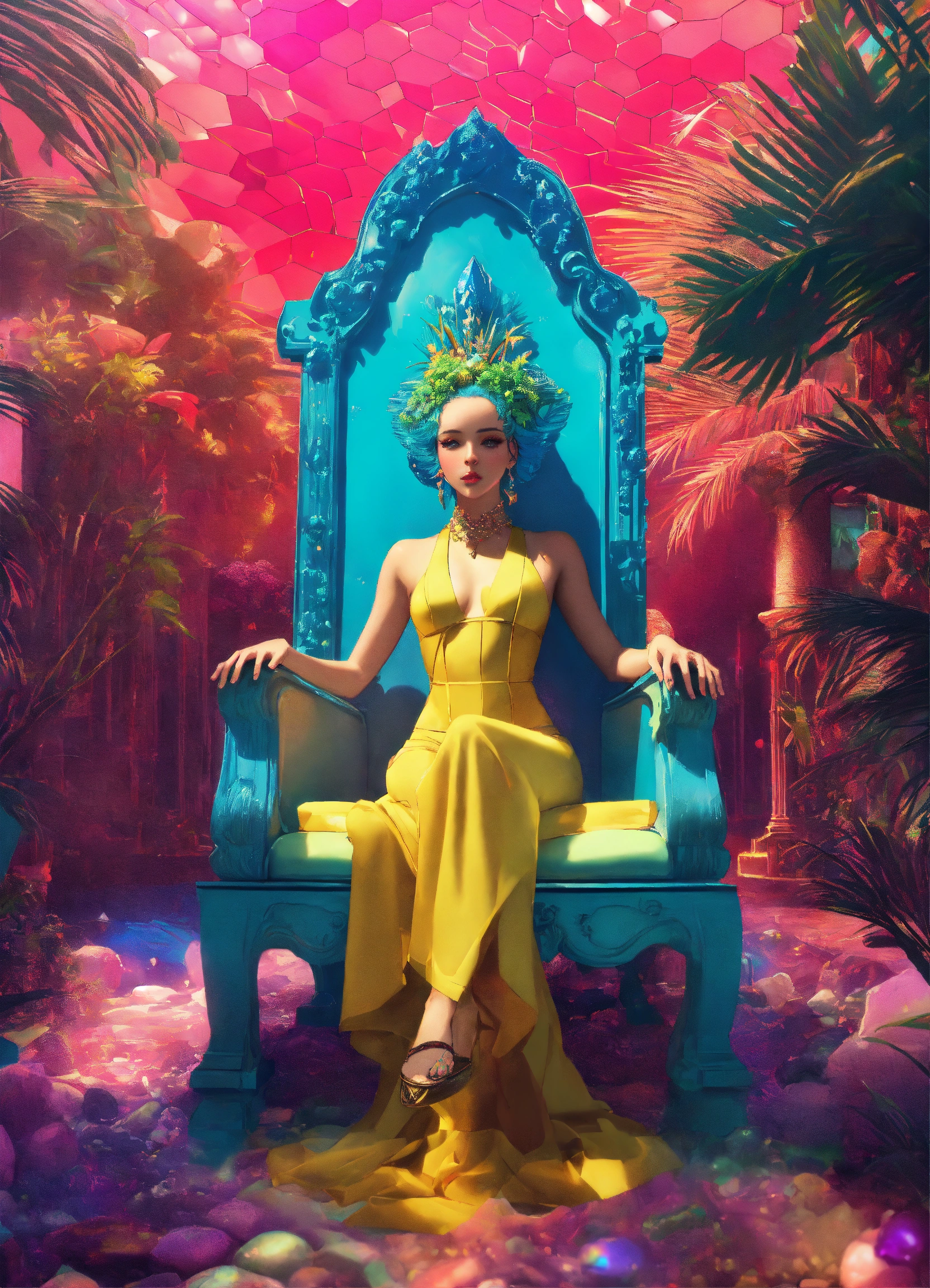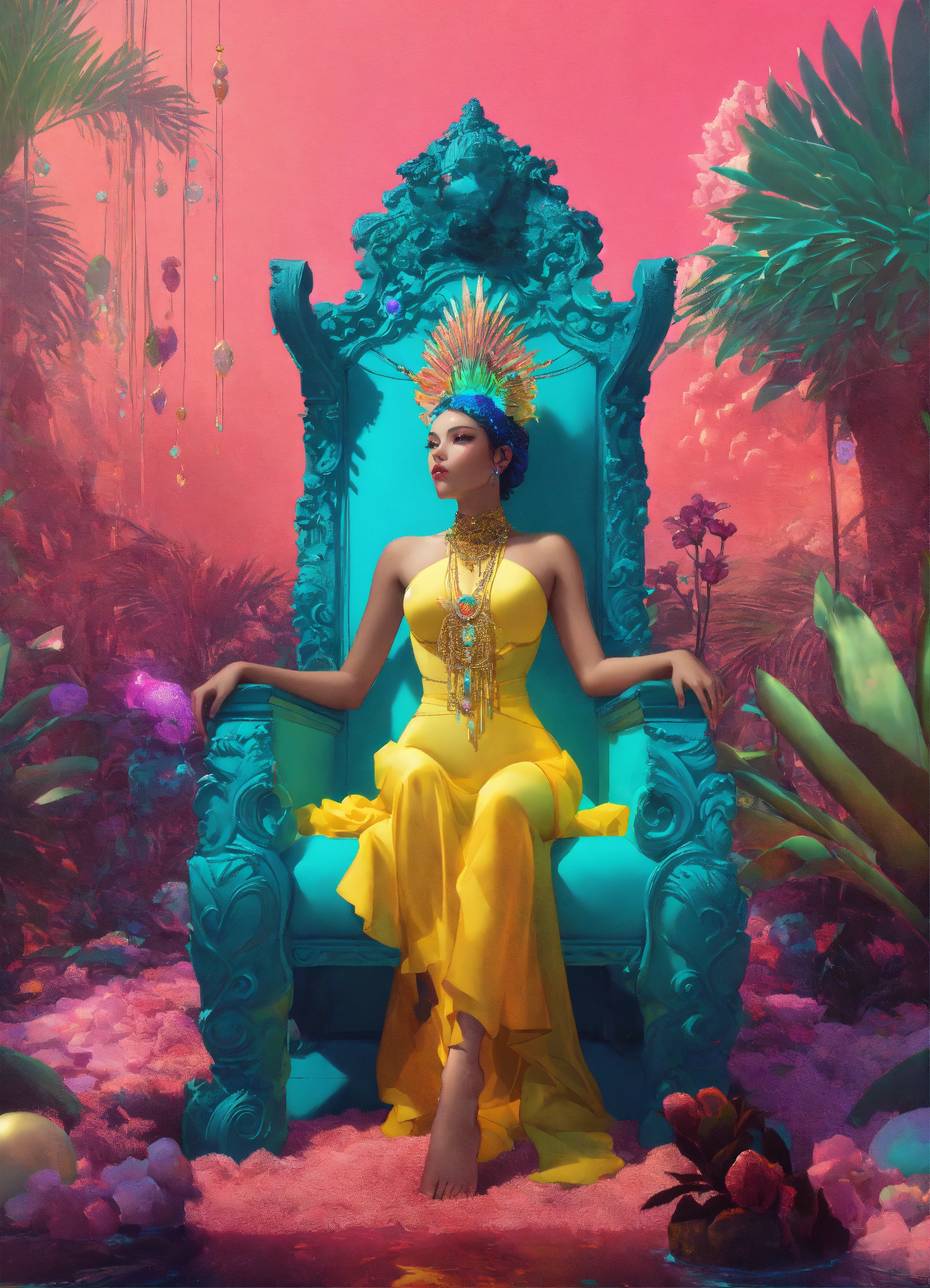 Beeple masterpiece, hyperrealistic surrealism, beautiful full body goddess sitting on an insanely detailed throne, perfect female anatomy, beautiful female face, covered in vaporwave gemstones, epic stunning, vaporwave baroque, iridescent materials, pool, palms, exotic plants