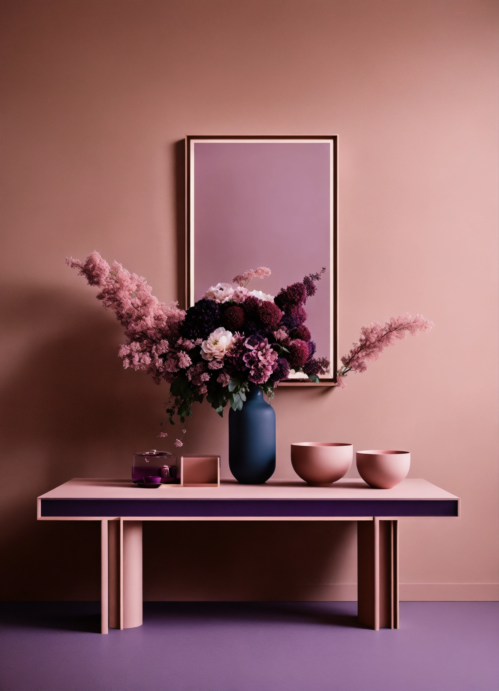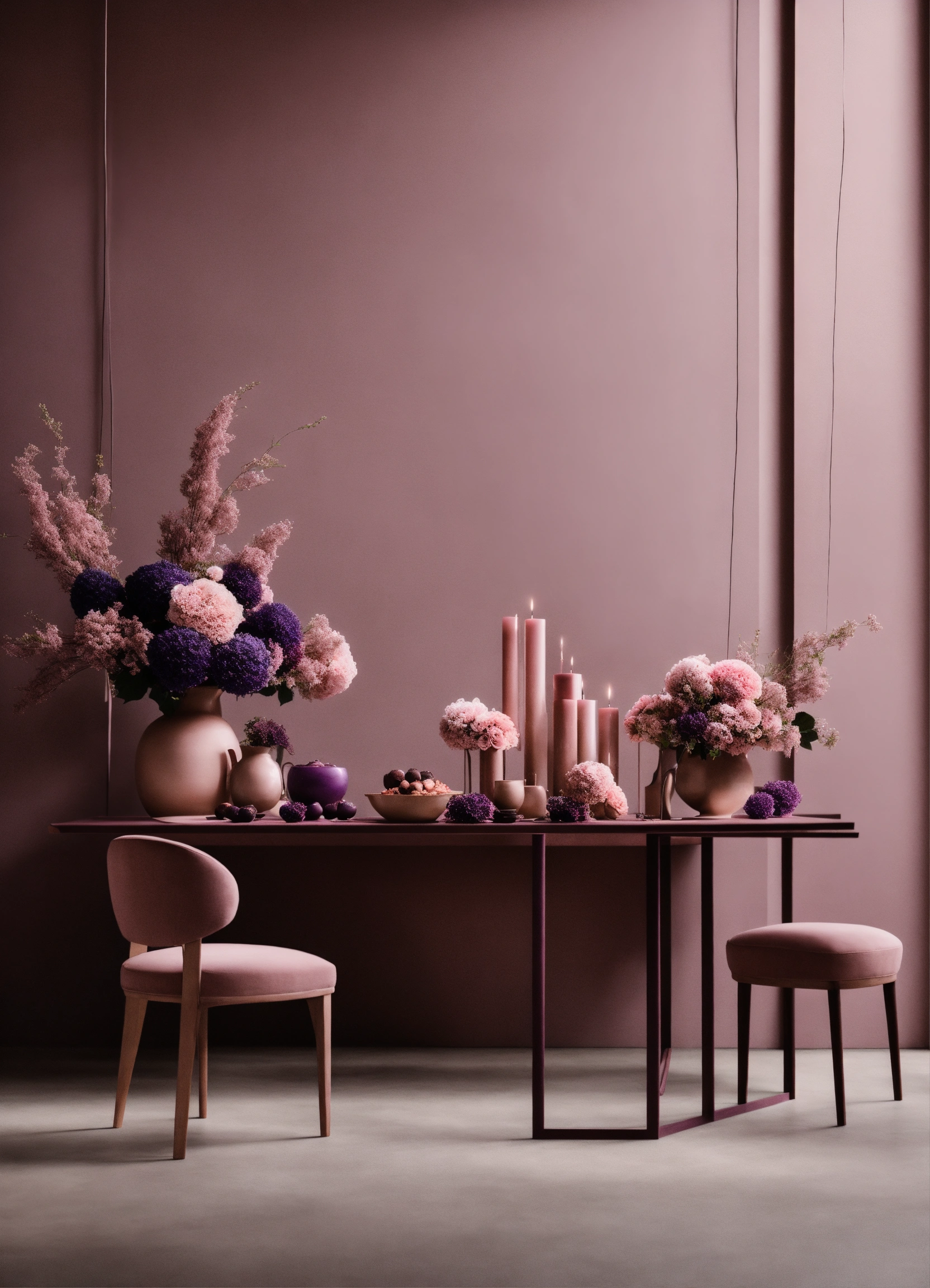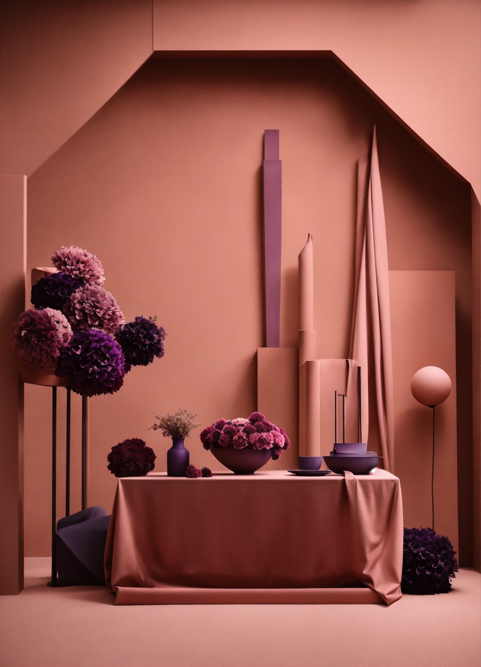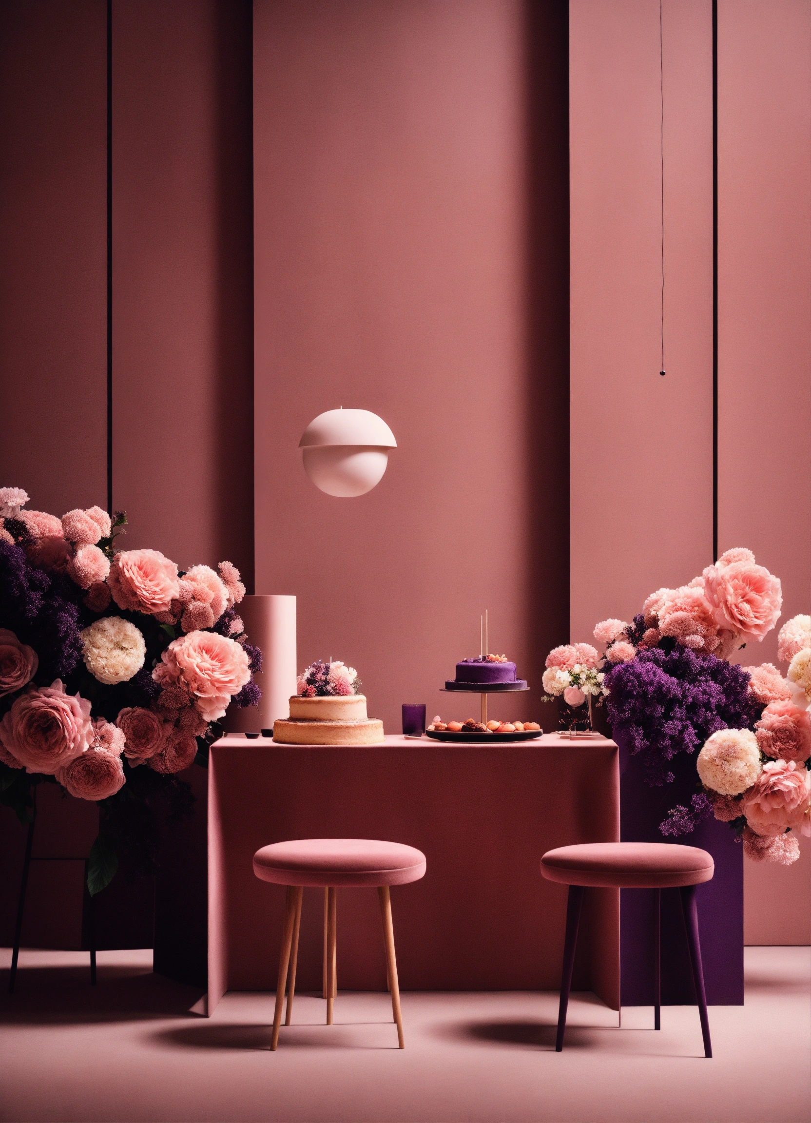 Muted tones of dusty pink and dark purple surreal combination with minimalist compositions, evoking a sense of calmness, artistic installations, simple bare minimalist style 3d compositions, empty background, wedding theme, add giant flowers and dining buffet